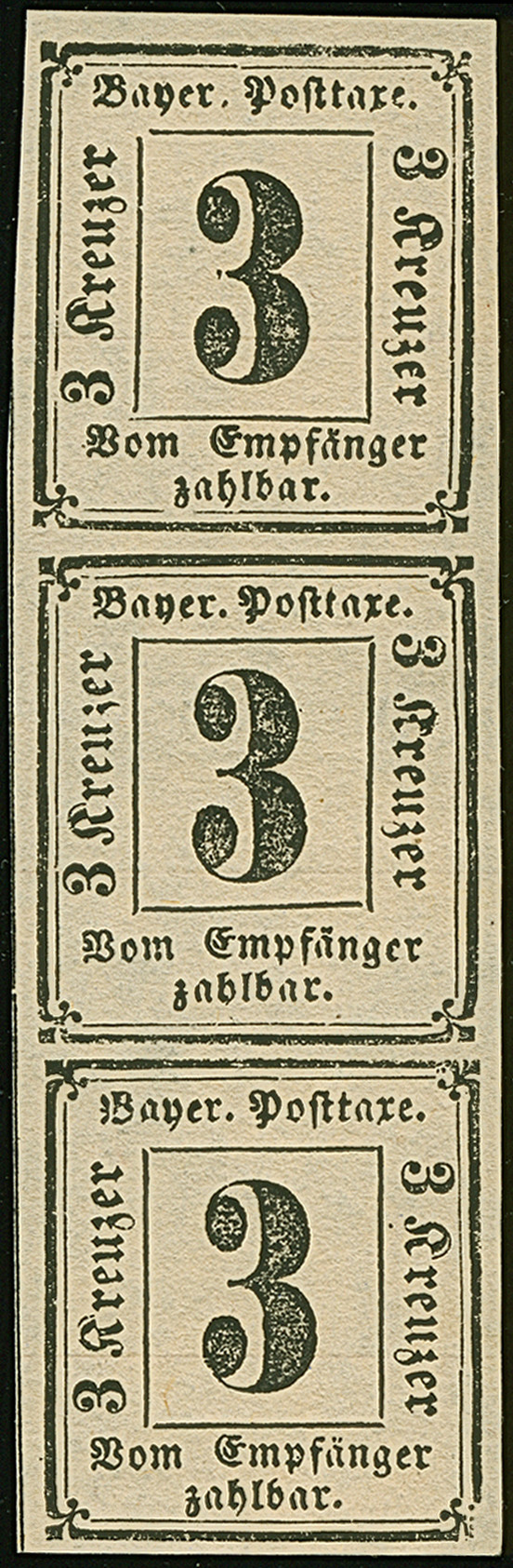 3 Kreuzer dunkelblau, voll- bis überrandig, oben mit vollständiger doppelter Trennungslinie (hier obligatorische leichte Faltspur), sauber entwertet durch gMR "249" OCHSENFURT. Tadellos. Eine große Seltenheit; PROFI hat nur ein weiteres Stück registriert. Fotoattest Sem BPP (2009)