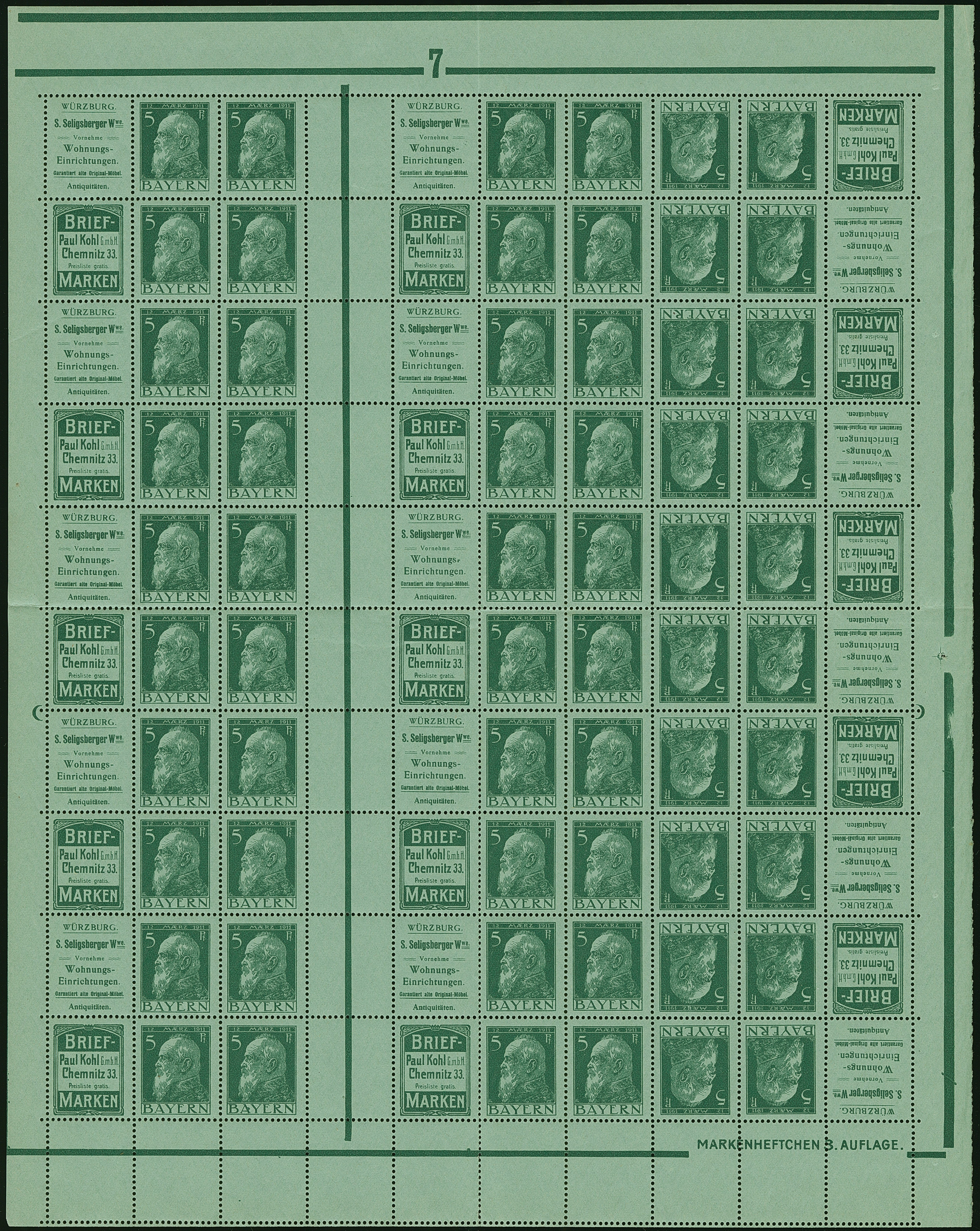 1911/12, „S. Seligsberger“ + „Briefmarken Kohl“ + 5 Pfg. Luitpold grün, kompletter Markenheftchenbogen, unten mit komplett gezähnten Leerfeldern, postfrisch, einmal senkrecht bzw. waagerecht gefaltet, waagerecht einige Zähnchen etwas bestoßen, ein Wert geknittert, sonst in guter Erhaltung