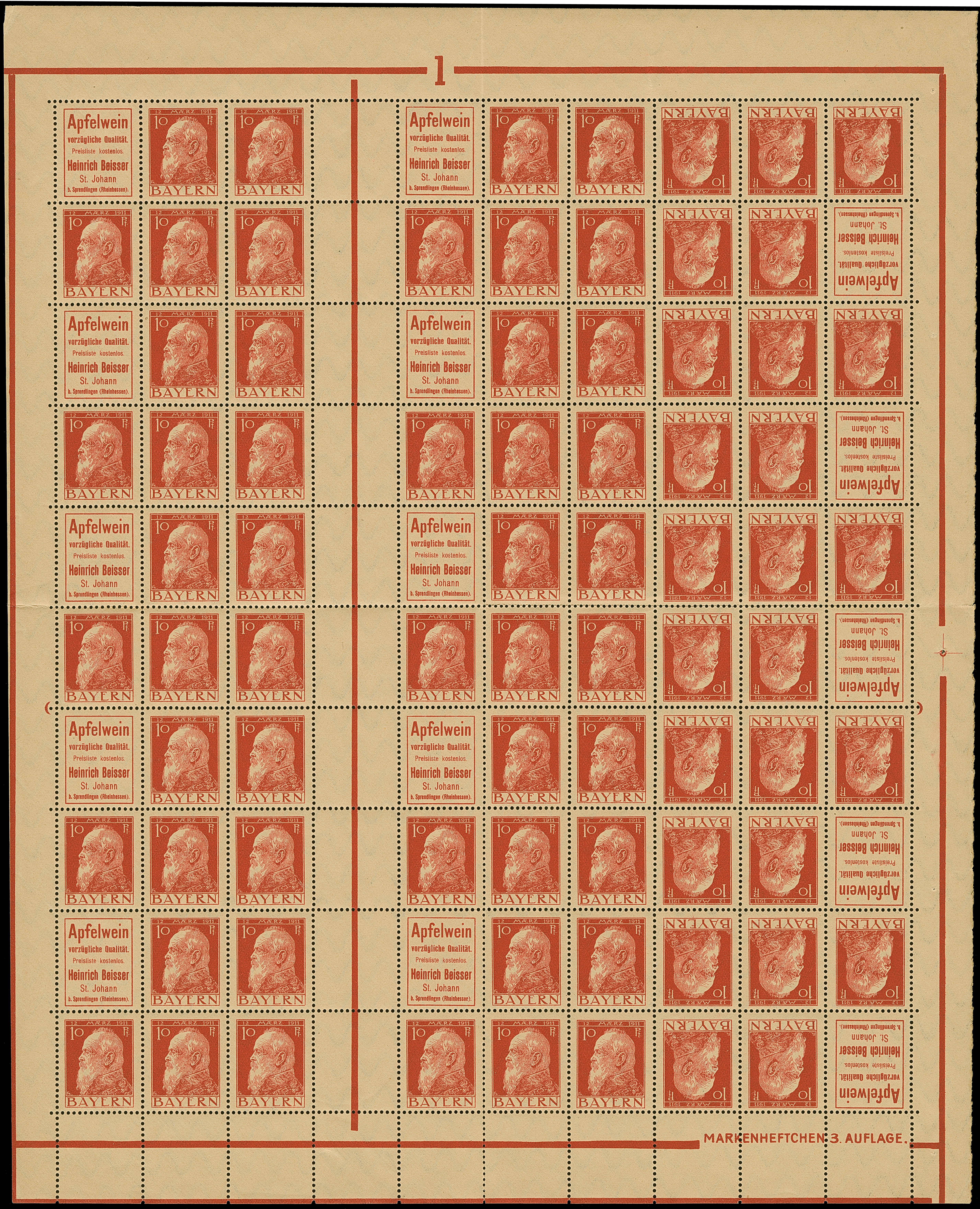 1911/12, „Apfelwein“ + 10 Pfg. Luitpold rot, kompletter Markenheftchenbogen, unten mit Druckvermerk “MARKENHEFTCHEN 3. AUFLAGE”, oben mit Plattennummer “1”, postfrisch, einmal senkrecht bzw. waagerecht gefaltet, waagerecht einige Zähnchen etwas bestoßen, ein Wert geknittert, im Rand teils leicht geknittert, sonst in guter Erhaltung