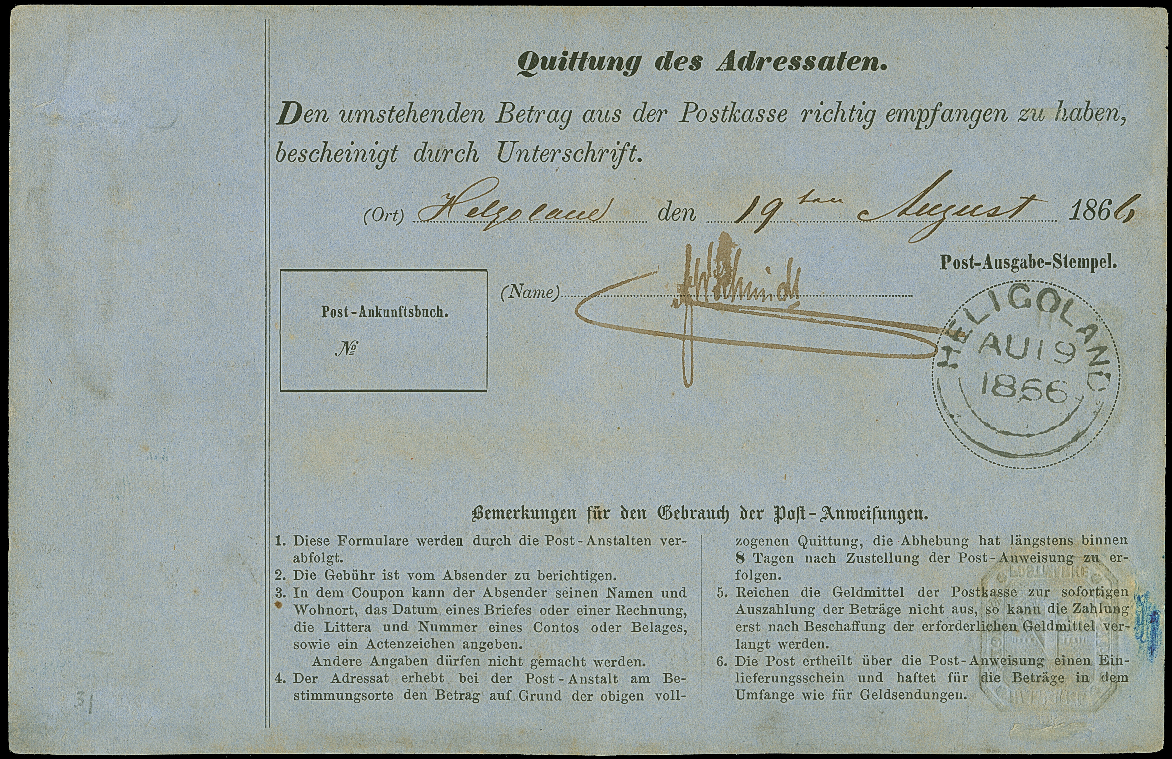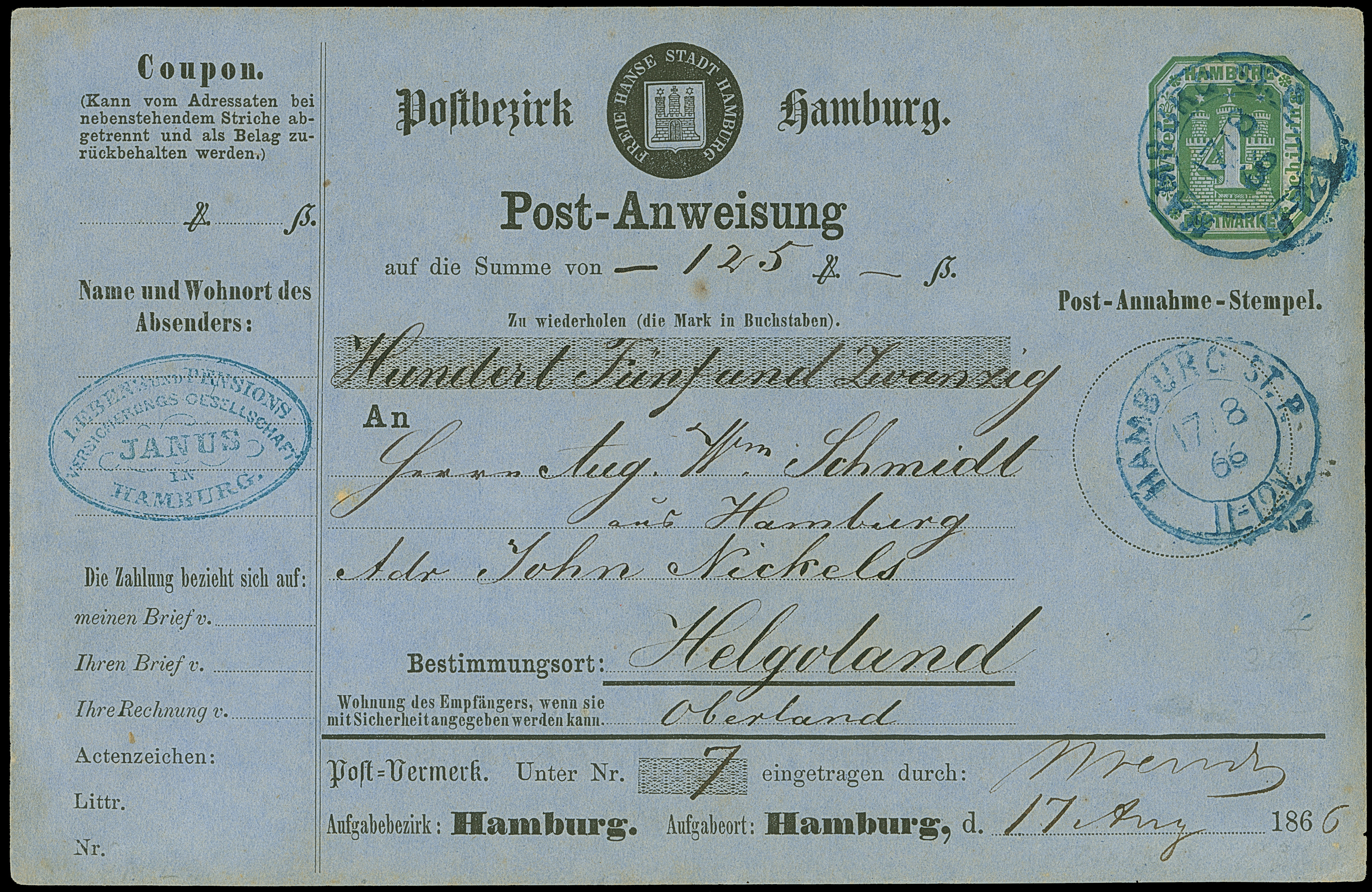 1866, Postanweisung 4 Schilling grün mit nebengesetztem blauen Aufgabestempel "HAMBURG ST.P. 21.8.66" nach Helgoland mit Auszahlungsvermerk und Ankunftsstempel vom 22.8. Minimal fleckig, sonst sehr schöne frische Erhaltung. Es sind nur wenige Postanweisungen nach Helgoland bekannt