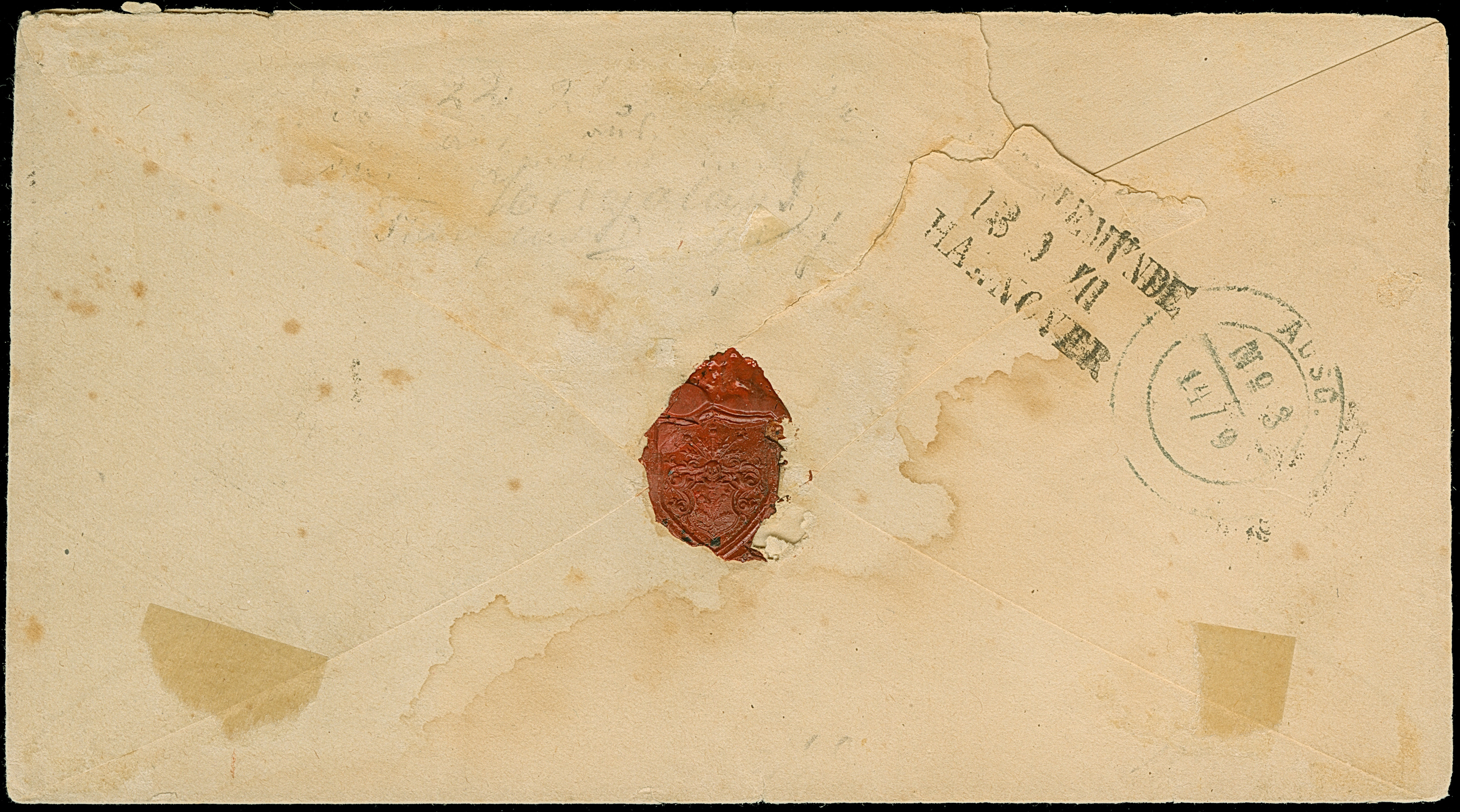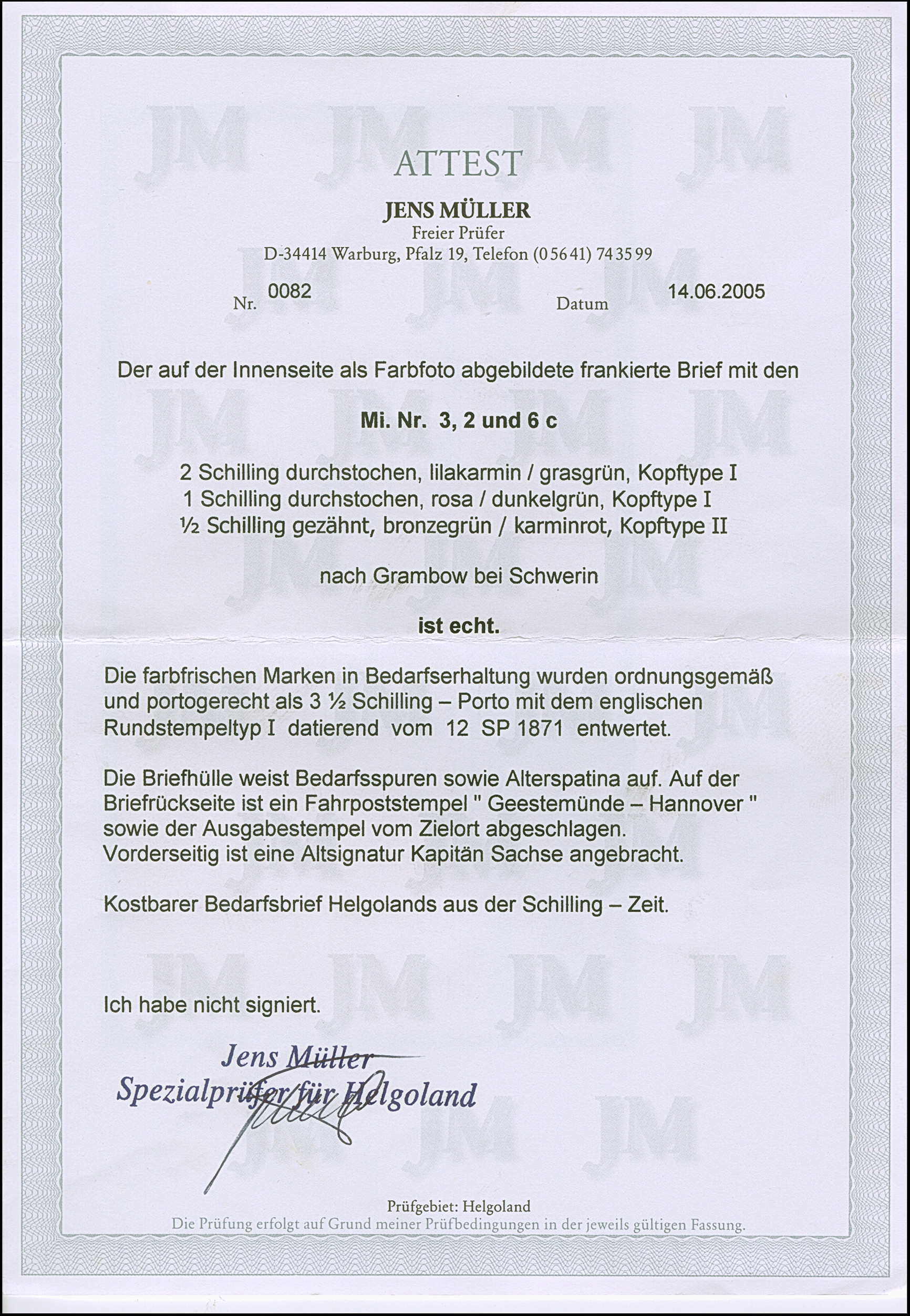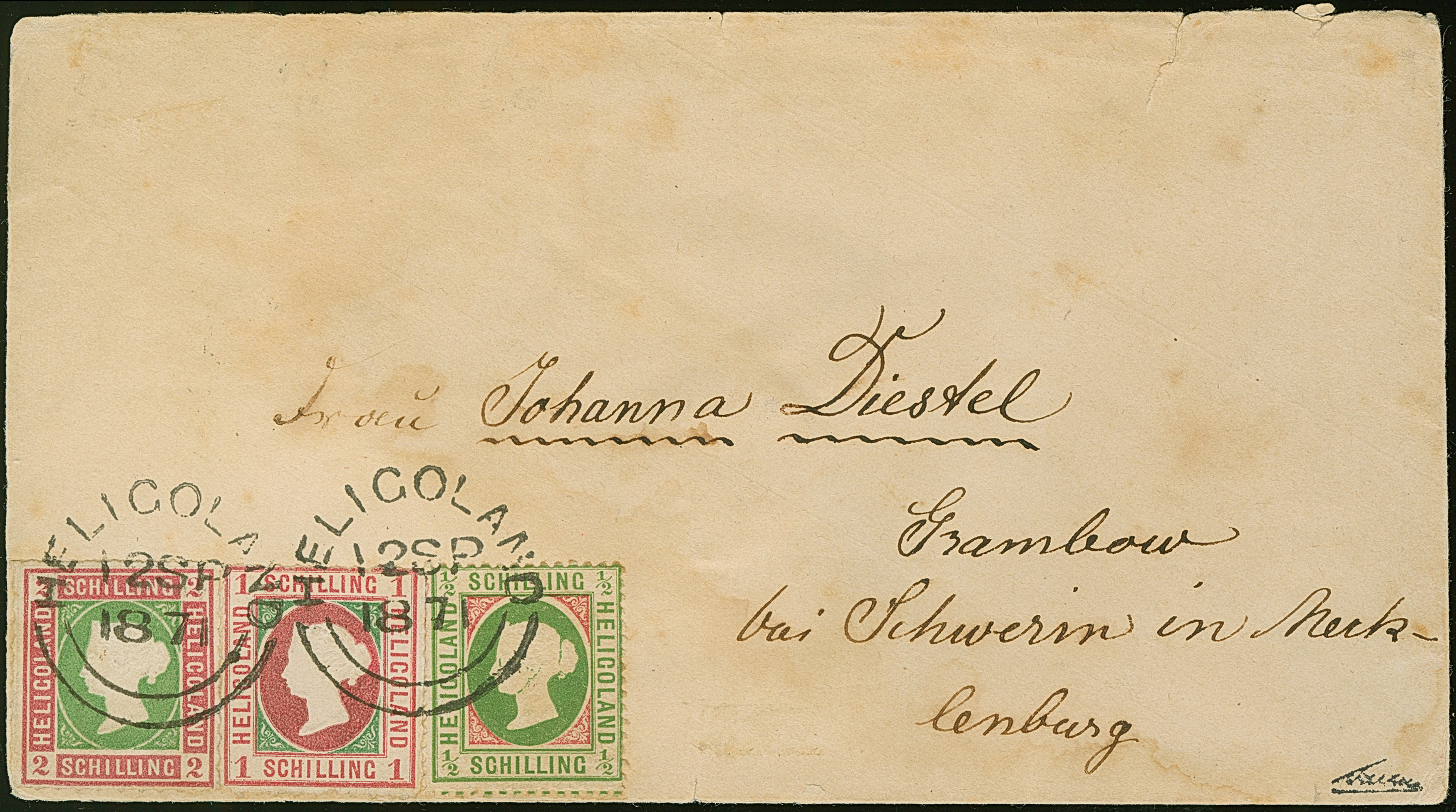 1867, 1 Schilling rosakarmin/dunkelgrün, 2 Schilling lilakarmin/dunkelgelblichgrün und 1869 ½ Schilling grünoliv/karminrot, farbfrisch und gut durchstochen bzw. gezähnt, sauber mit Kreisbogenstempel “HELIGOLAND 12 SP 1871” auf Briefkuvert nach Grambow bei Schwerin, rückseitig mit Bahnpoststempel “GEESTEMÜNDE/HANNOVER” sowie Ausgabestempel, ½ Schilling winziger Zahnspalt, Umschlag oben leicht eingerissen, kleiner Teil der Klappe fehlt, sowie etwas Alterspatina, eine dennoch attraktive und seltene Frankatur, sign. Kapitän Sachse sowie Fotoattest Müller (2005)