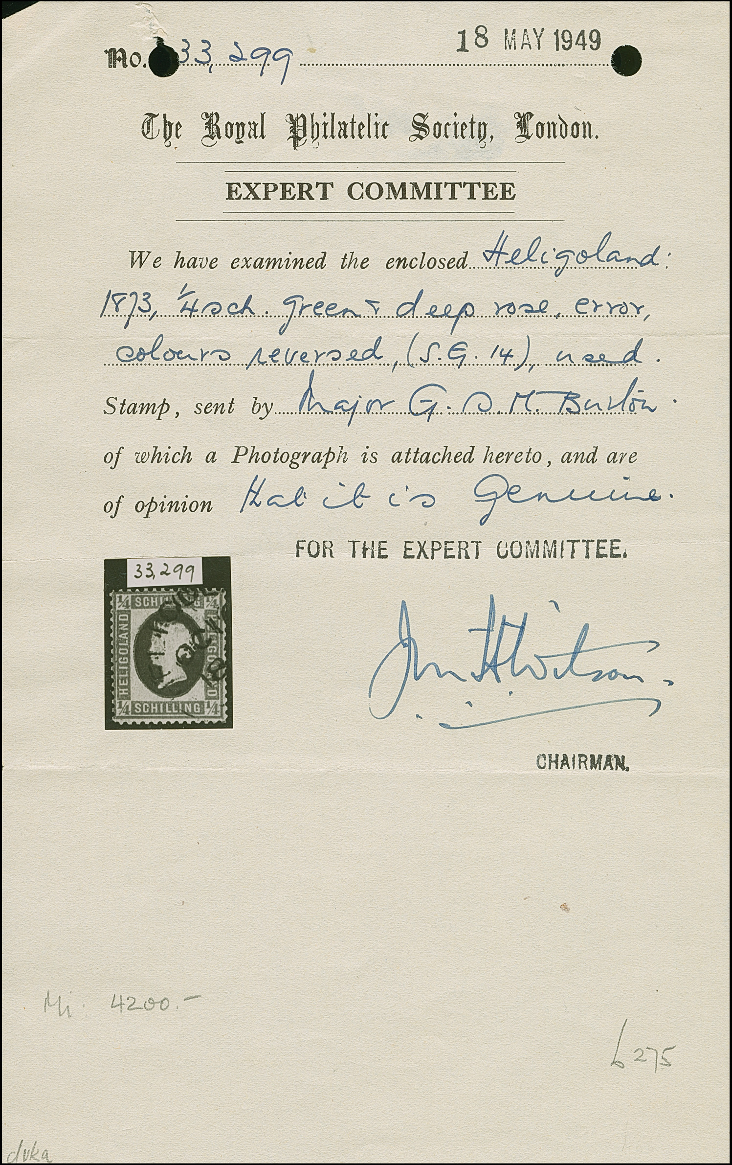 ¼ Sch. grün/karmin, der Fehldruck, farbfrisch und gut gezähnt, sauber mit Kreisbogenstempel "HELIGOLAND" entwertet, mit den üblichen, etwas stärkeren Reparaturen, ein optisch sehr ansprechendes Stück dieser seltenen Marke, Fotoattest RPSL (1949)