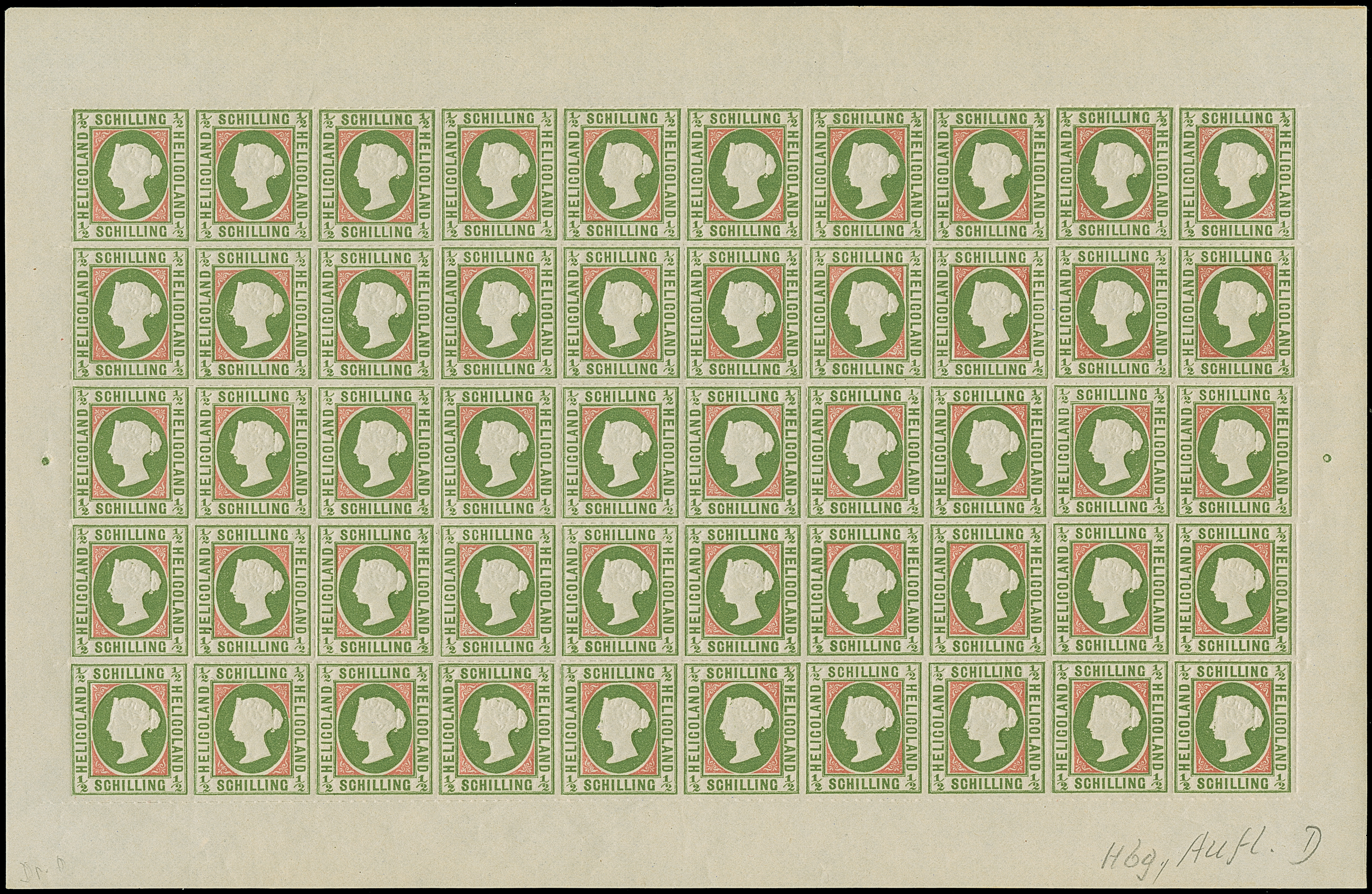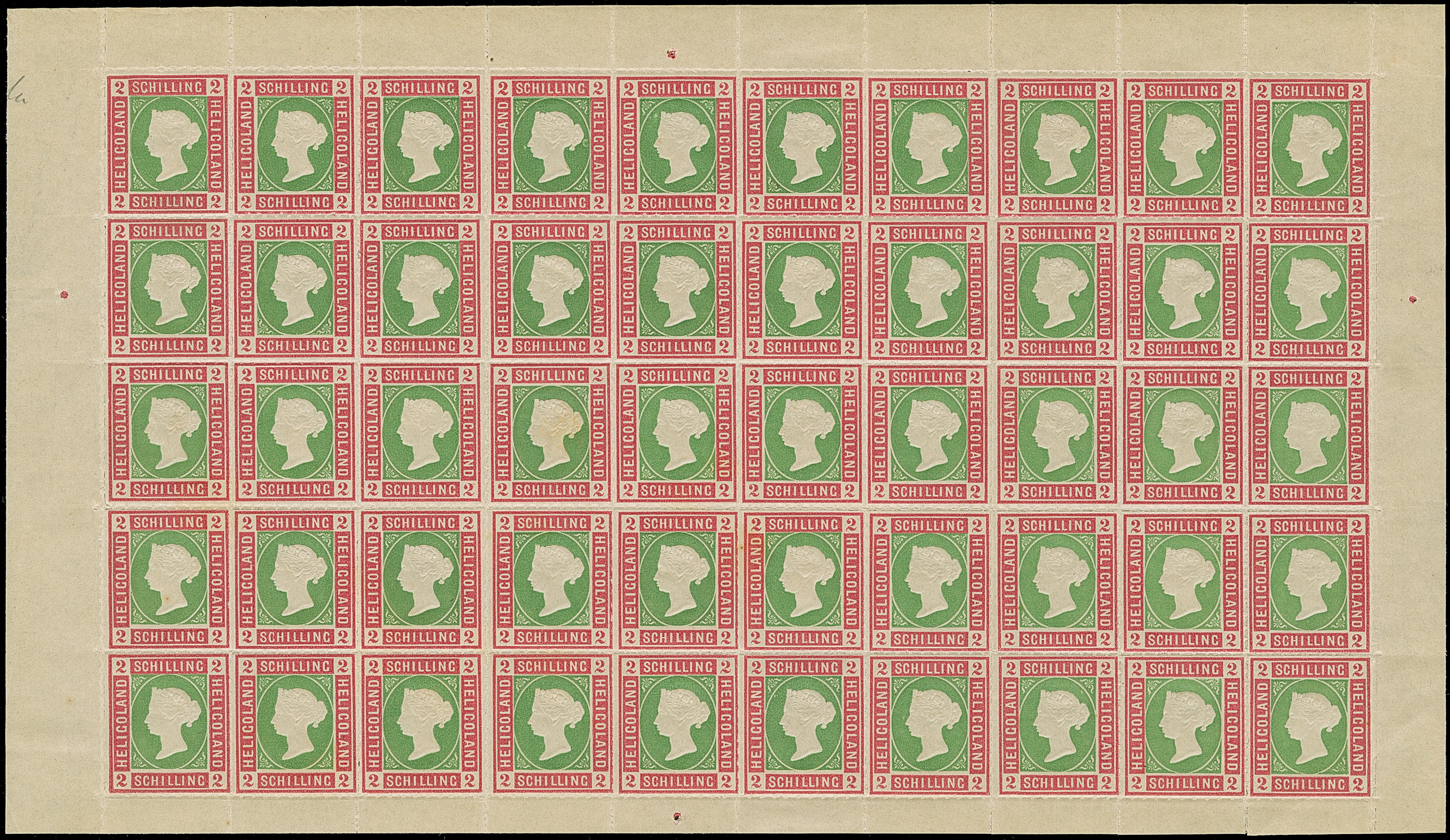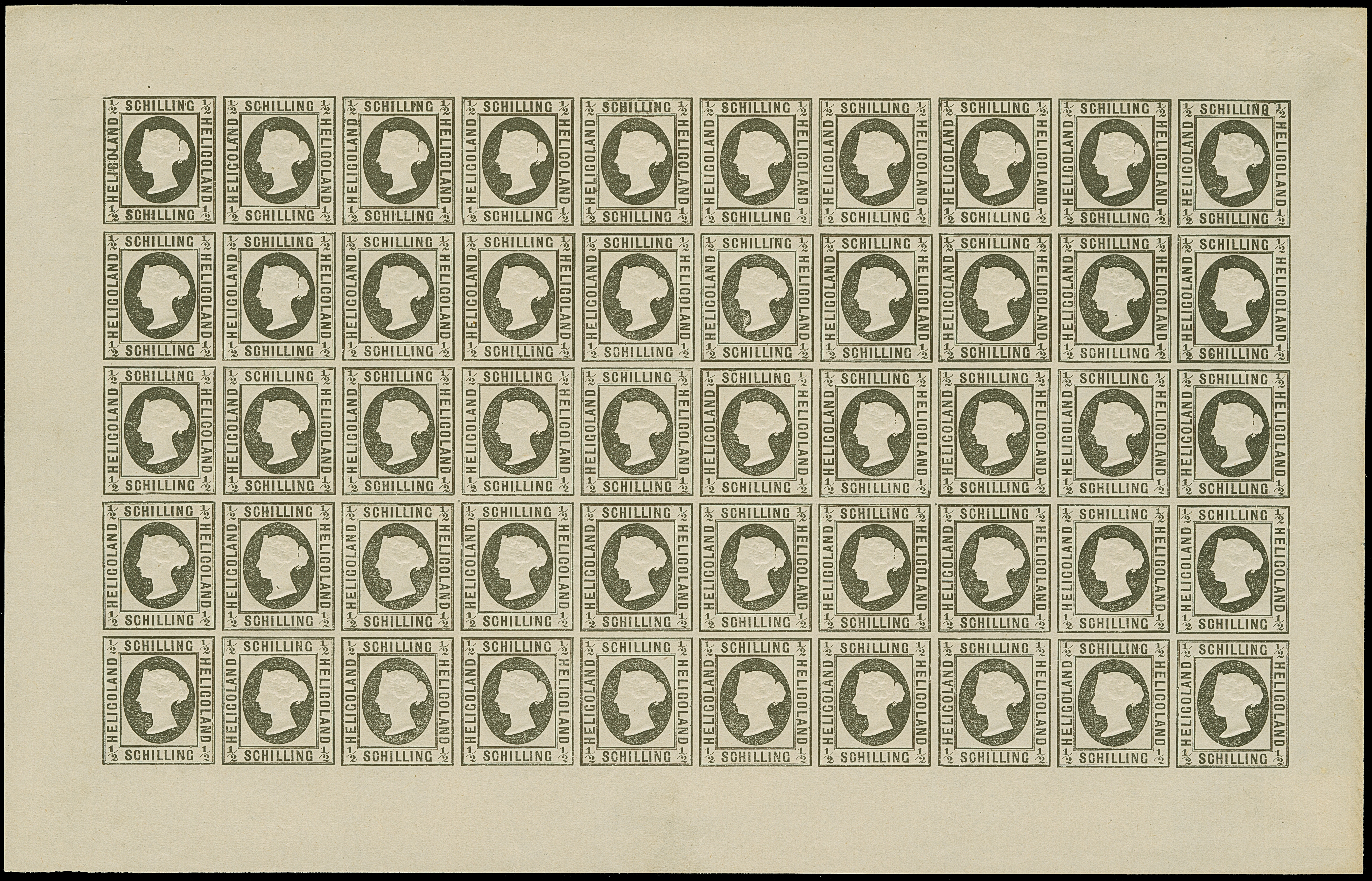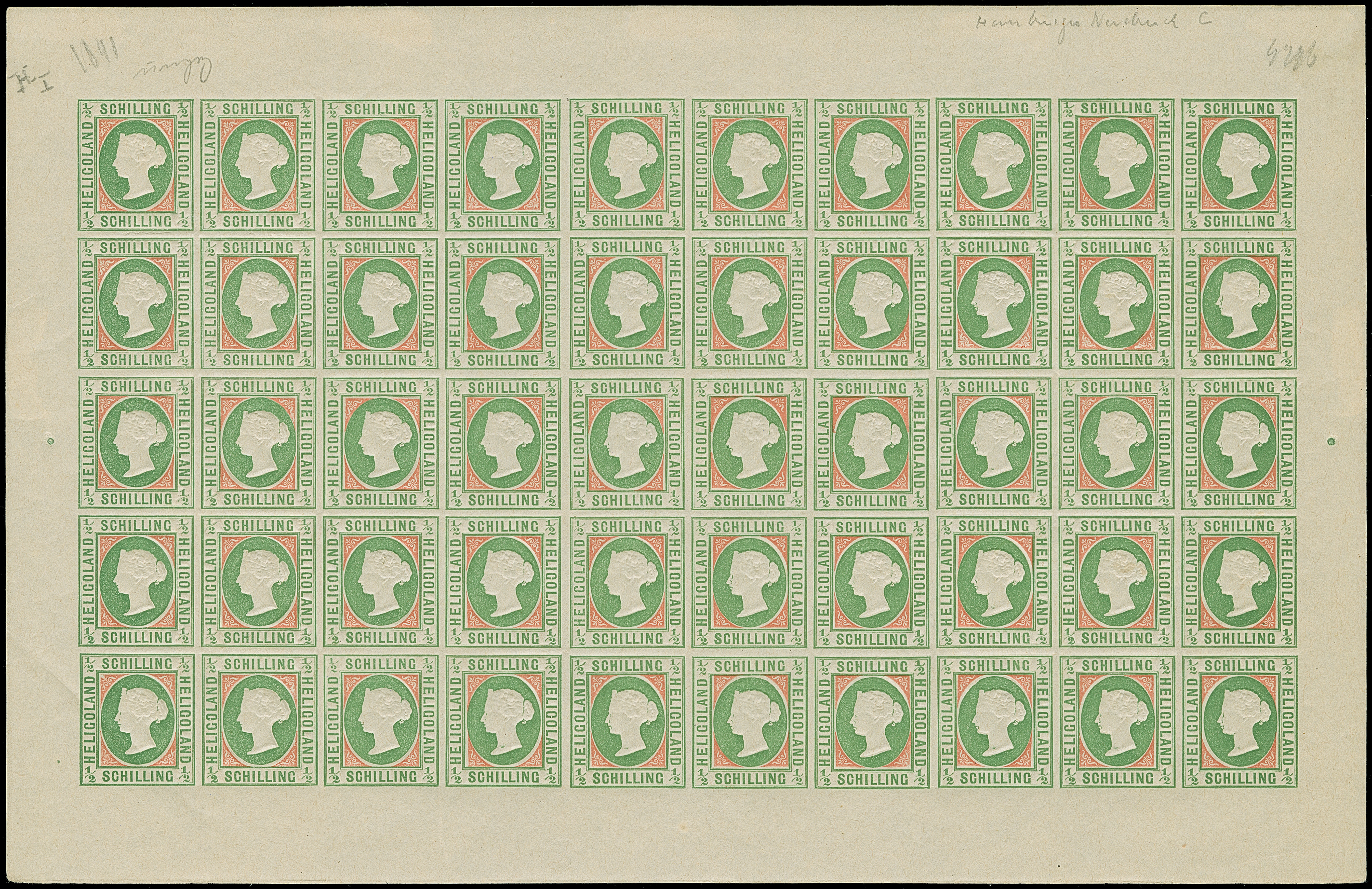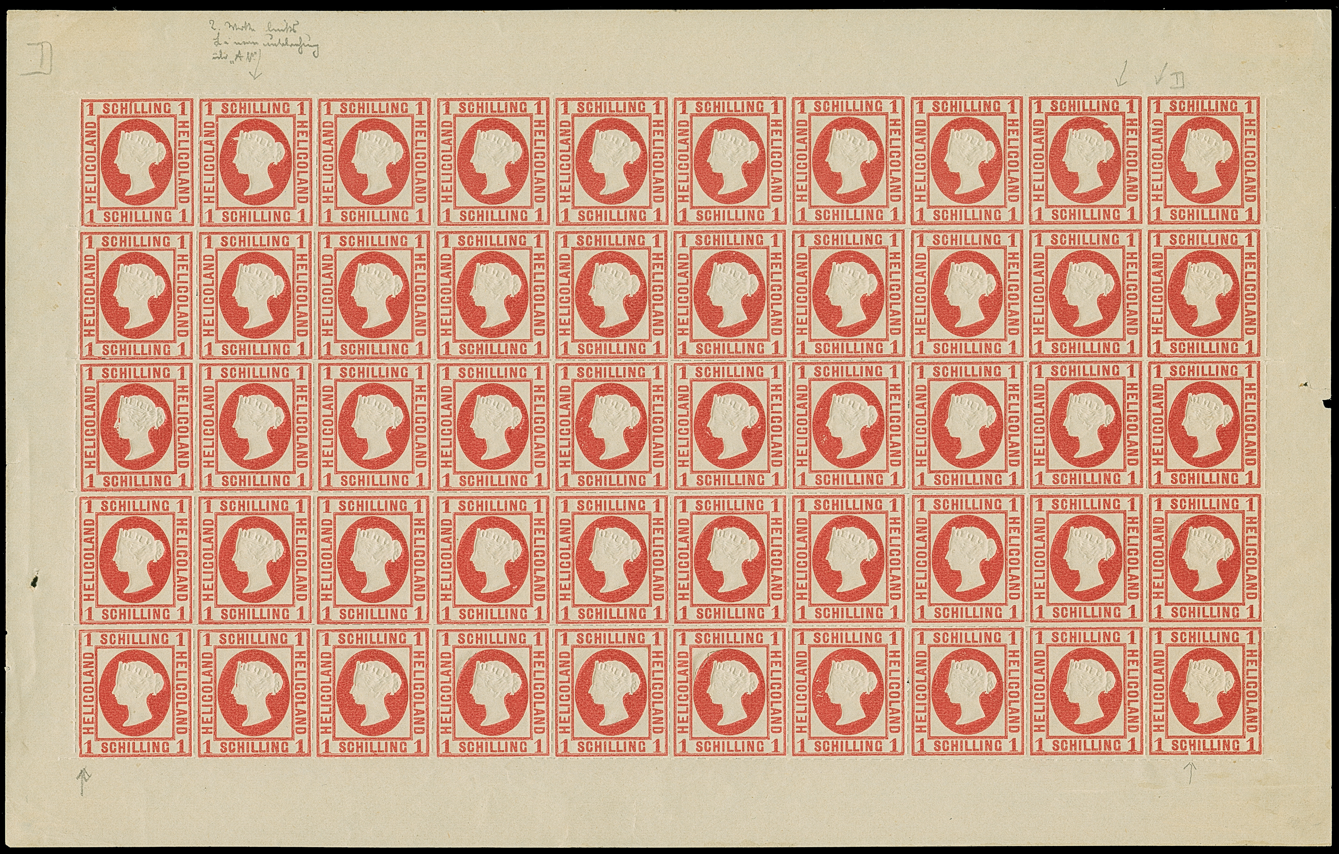 1890, Amtlicher Neudruck 20 Pfennig mittelkarmin/graugrün/dunkelgelb, kompletter Bogen mit allen Rändern, farbfrisch, postfrisch bzw. Falz im Bogenrand, auf Fleck 8 vorderseitig kleiner Fleck, sonst tadellos. Die Gesamtauflage betrug nur 200 Stück, davon sind 80 Exemplare aus dem Reichspostmuseum in den Handel gelangt. Handelt es sich schon bei Einzelmarken um Seltenheiten, so stellt ein kompletter Bogen eine der größten Helgoland-Raritäten dar, Unikat, Fotoattest Schulz BPP (1995)