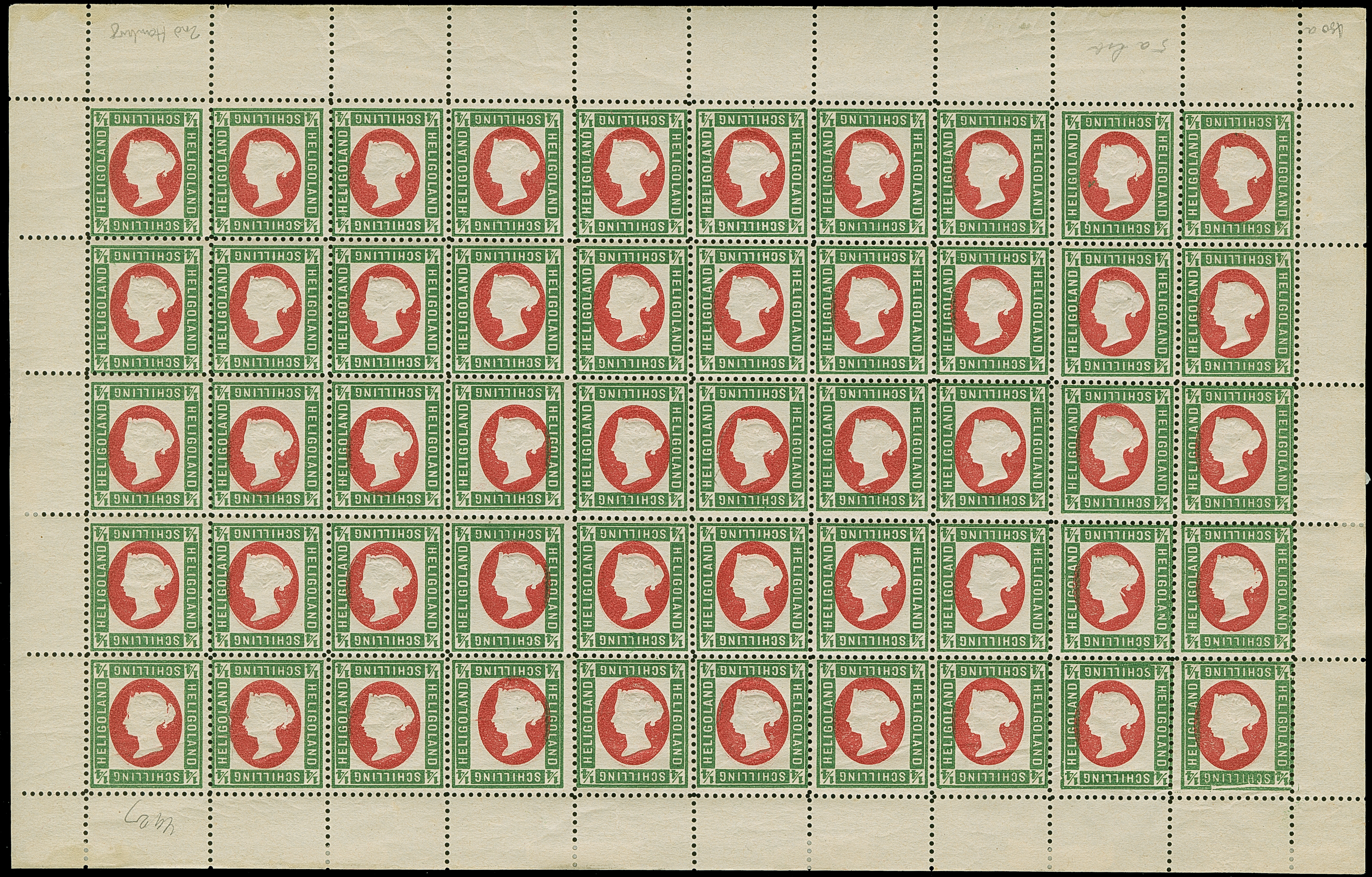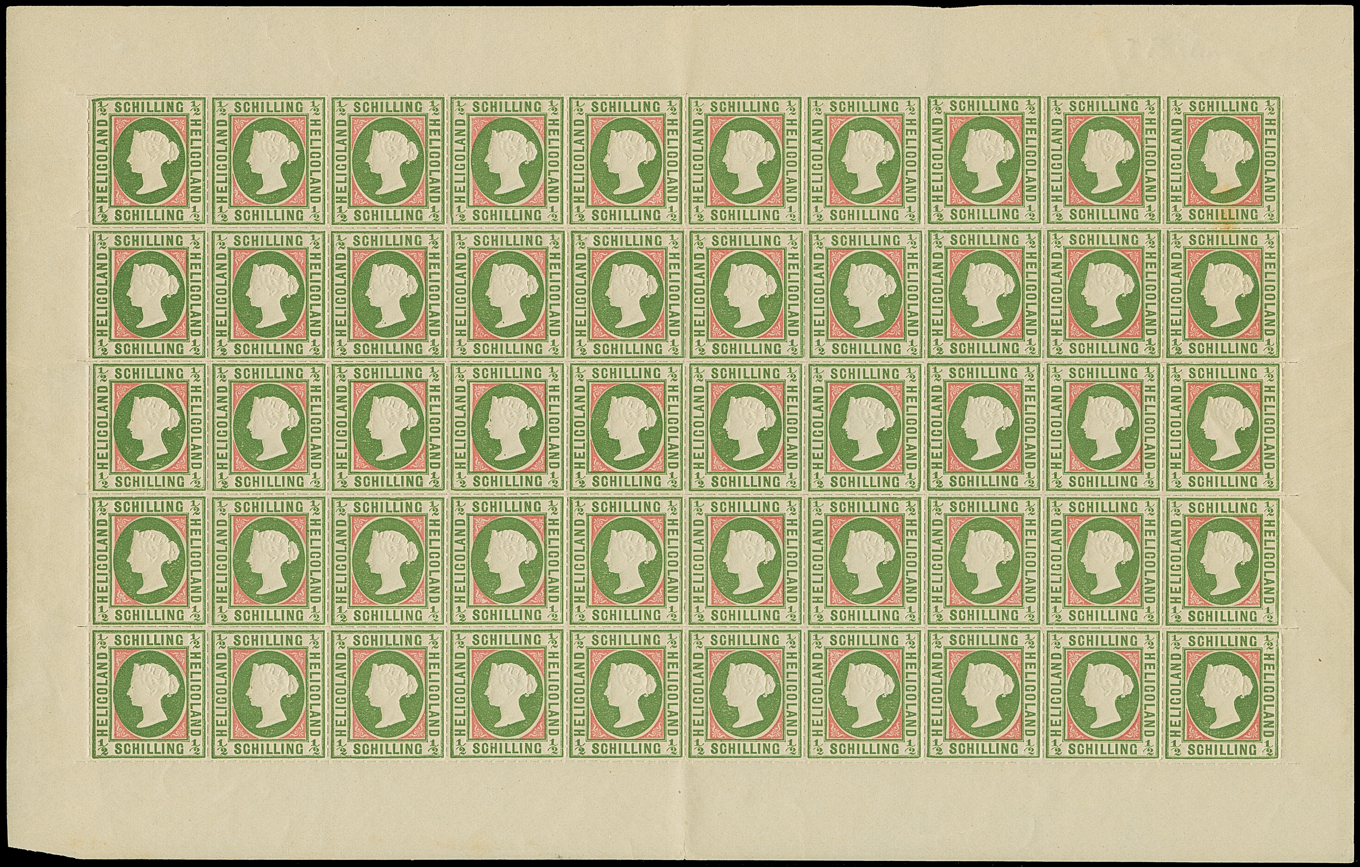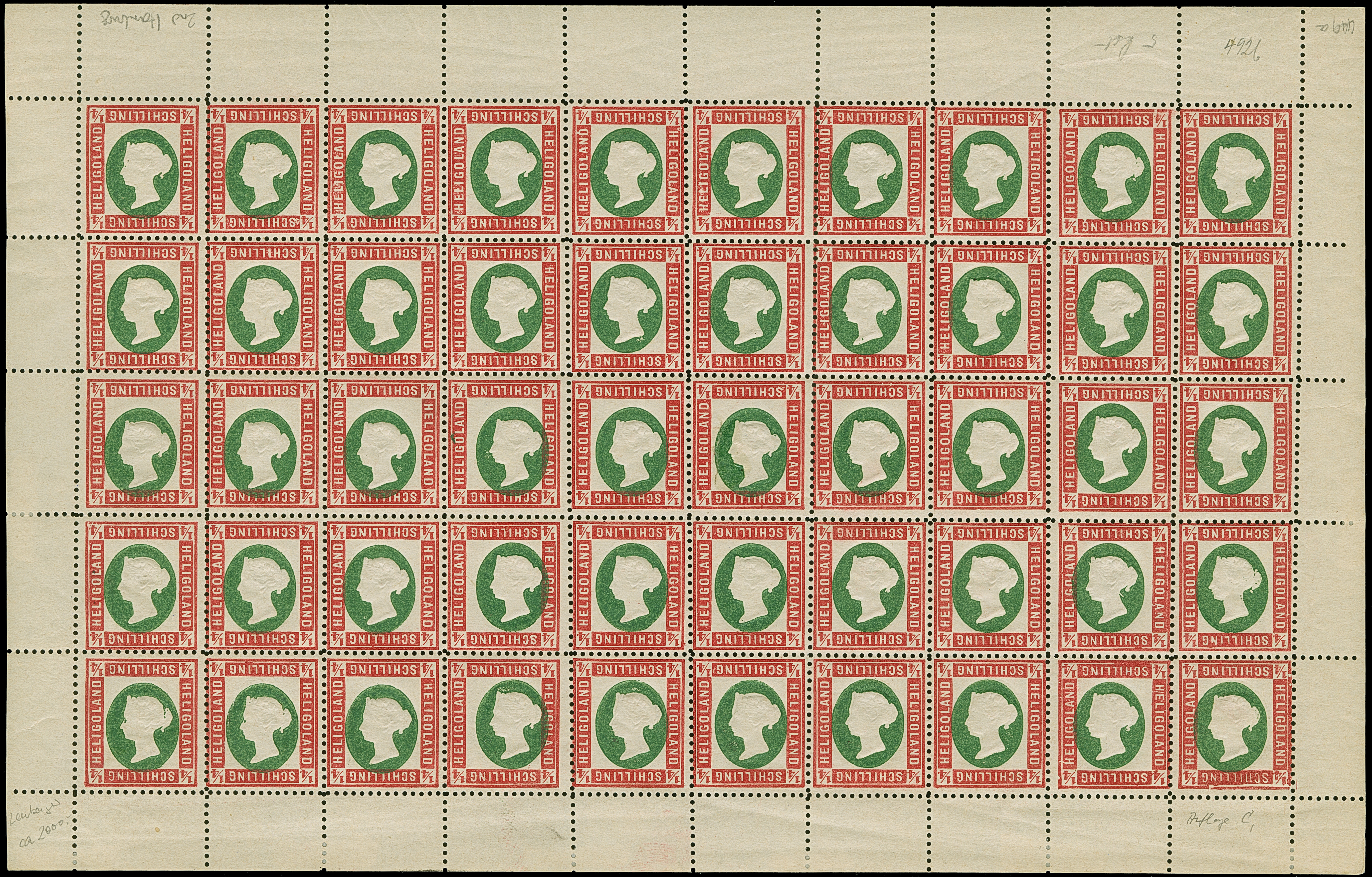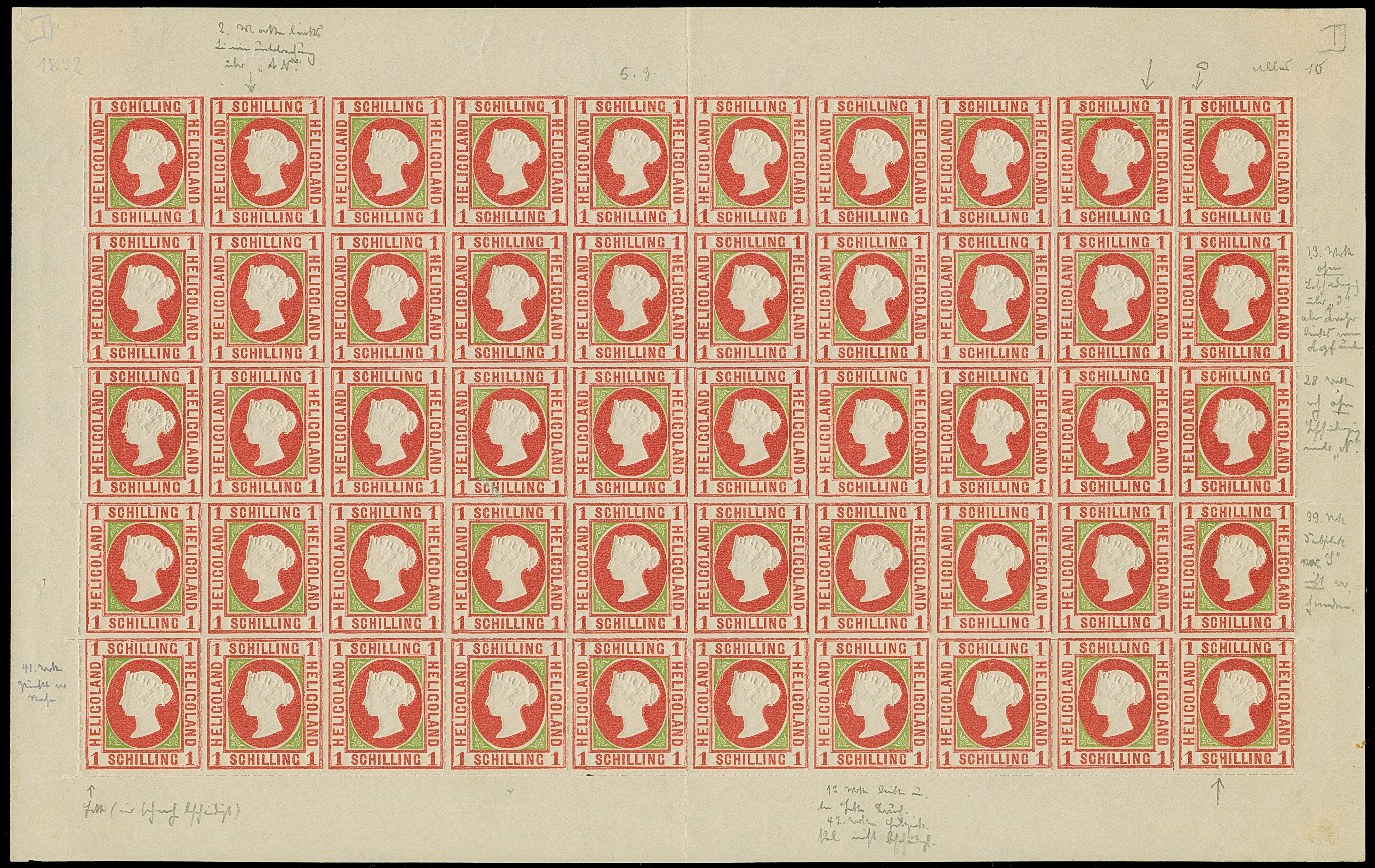1890, Amtlicher Neudruck 20 Pfennig mittelkarmin/graugrün/dunkelgelb, kompletter Bogen mit allen Rändern, farbfrisch, postfrisch bzw. Falz im Bogenrand, auf Fleck 8 vorderseitig kleiner Fleck, sonst tadellos. Die Gesamtauflage betrug nur 200 Stück, davon sind 80 Exemplare aus dem Reichspostmuseum in den Handel gelangt. Handelt es sich schon bei Einzelmarken um Seltenheiten, so stellt ein kompletter Bogen eine der größten Helgoland-Raritäten dar, Unikat, Fotoattest Schulz BPP (1995)