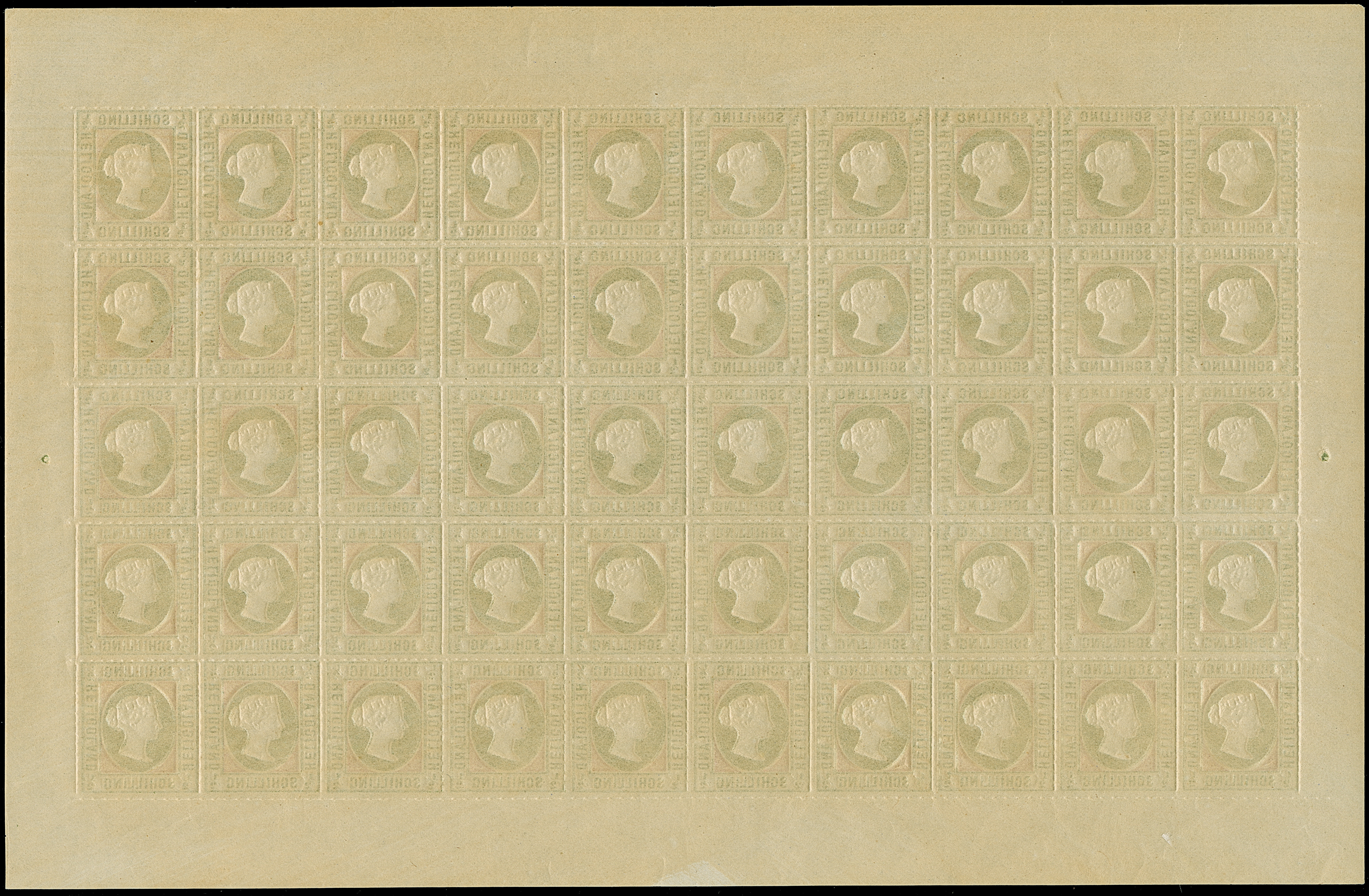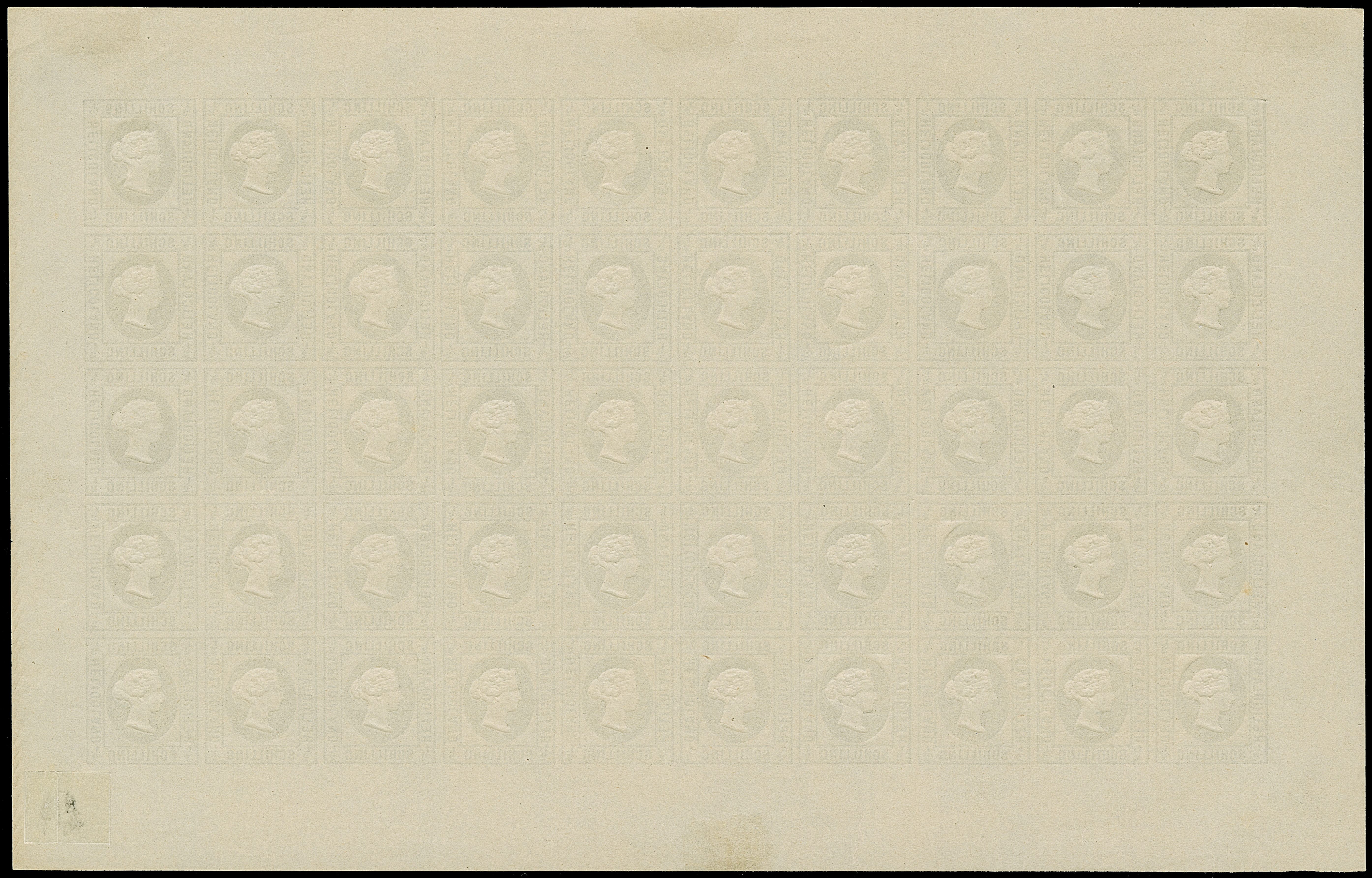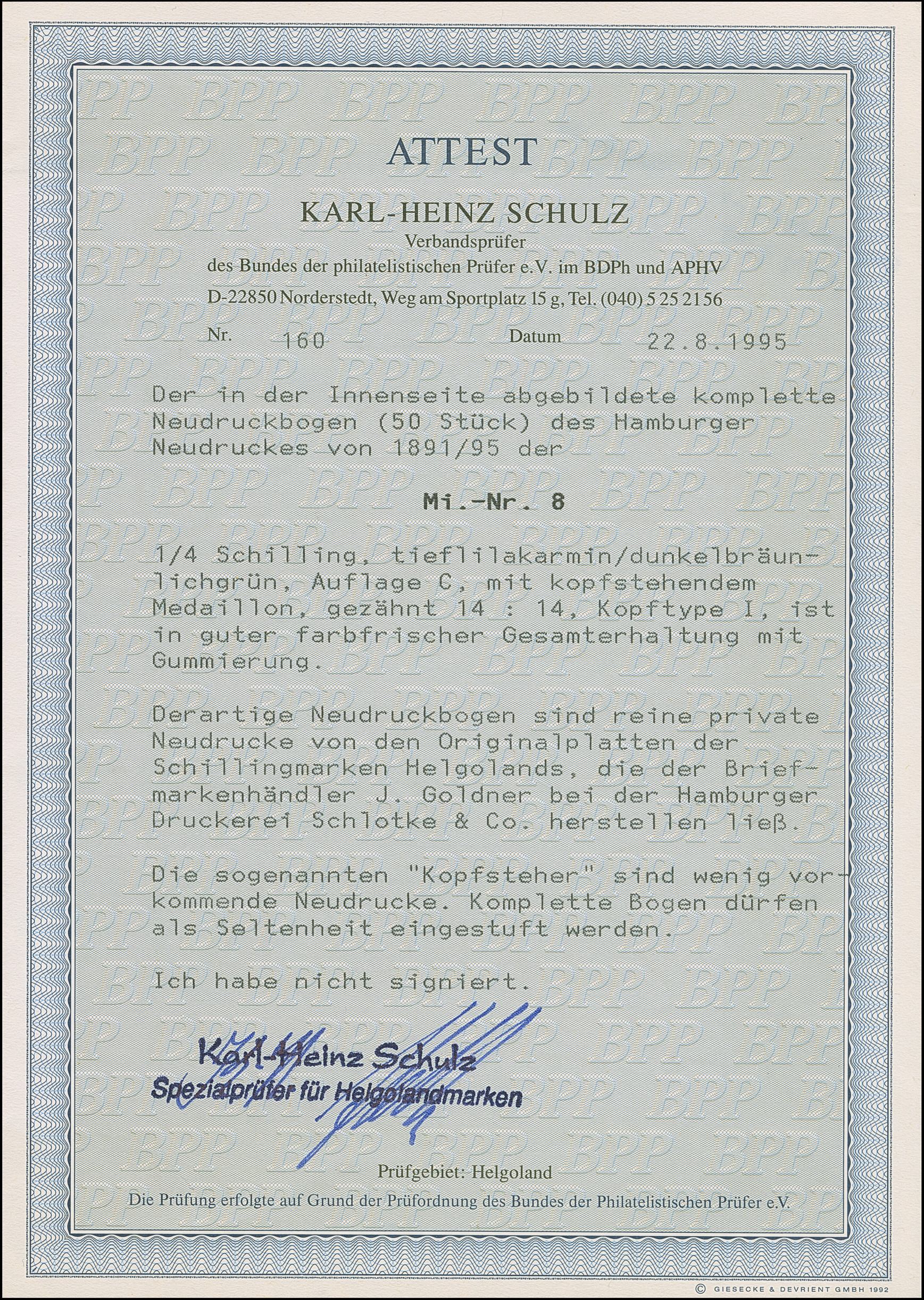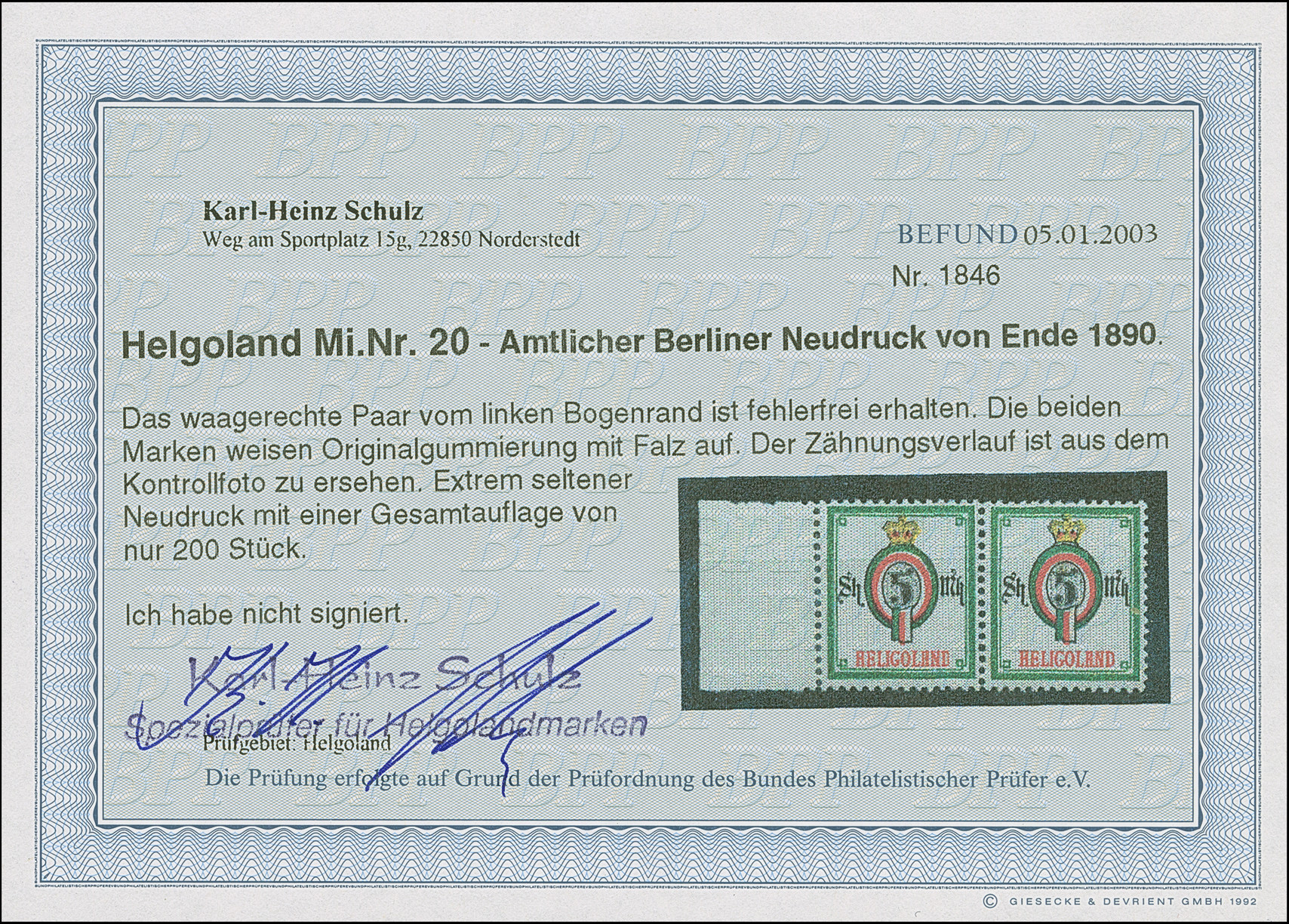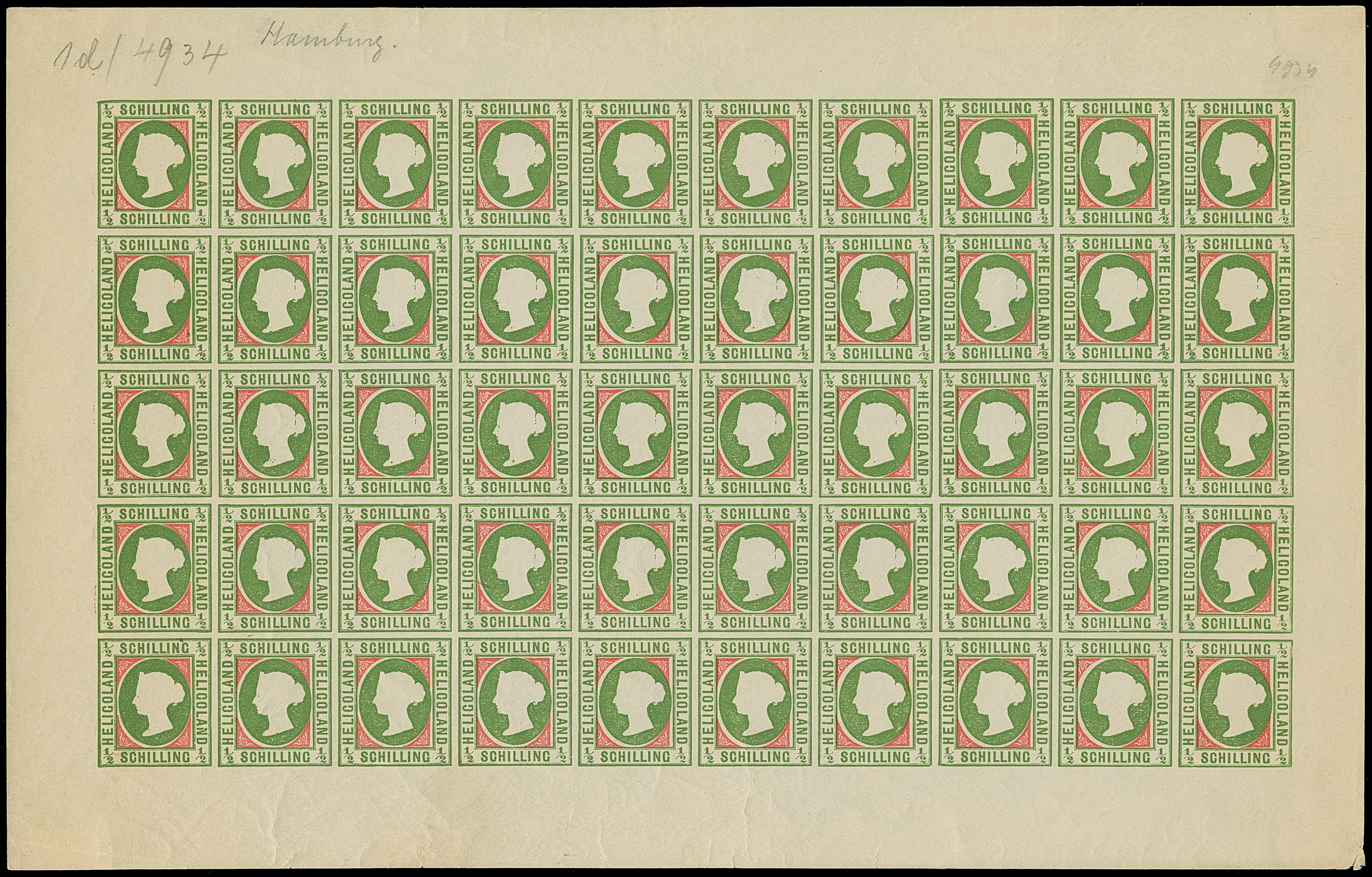 1890, Amtlicher Neudruck 20 Pfennig mittelkarmin/graugrün/dunkelgelb, kompletter Bogen mit allen Rändern, farbfrisch, postfrisch bzw. Falz im Bogenrand, auf Fleck 8 vorderseitig kleiner Fleck, sonst tadellos. Die Gesamtauflage betrug nur 200 Stück, davon sind 80 Exemplare aus dem Reichspostmuseum in den Handel gelangt. Handelt es sich schon bei Einzelmarken um Seltenheiten, so stellt ein kompletter Bogen eine der größten Helgoland-Raritäten dar, Unikat, Fotoattest Schulz BPP (1995)