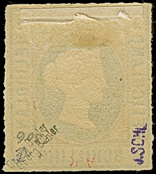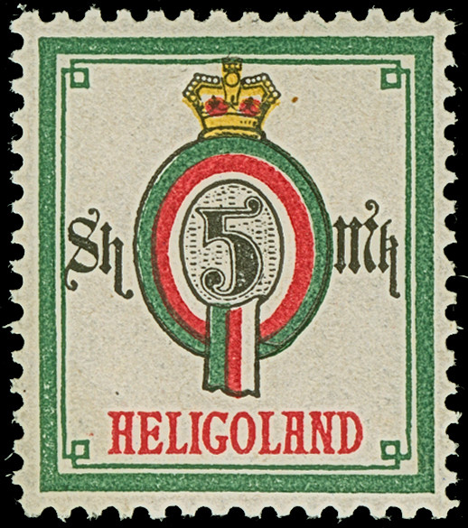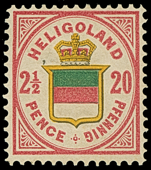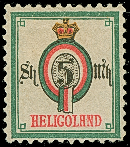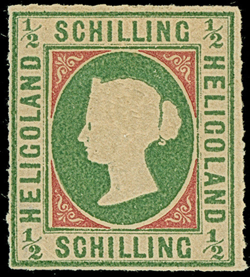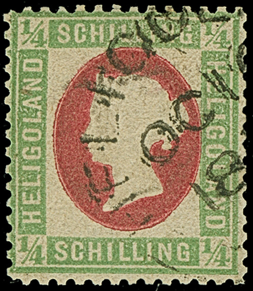 ¼ Sch. grün/karmin, der Fehldruck, farbfrisch und gut gezähnt, sauber mit Kreisbogenstempel "HELIGOLAND" entwertet, mit den üblichen, etwas stärkeren Reparaturen, ein optisch sehr ansprechendes Stück dieser seltenen Marke, u.a. sign. Lemberger