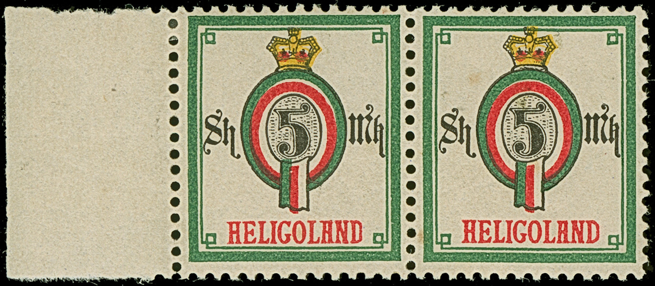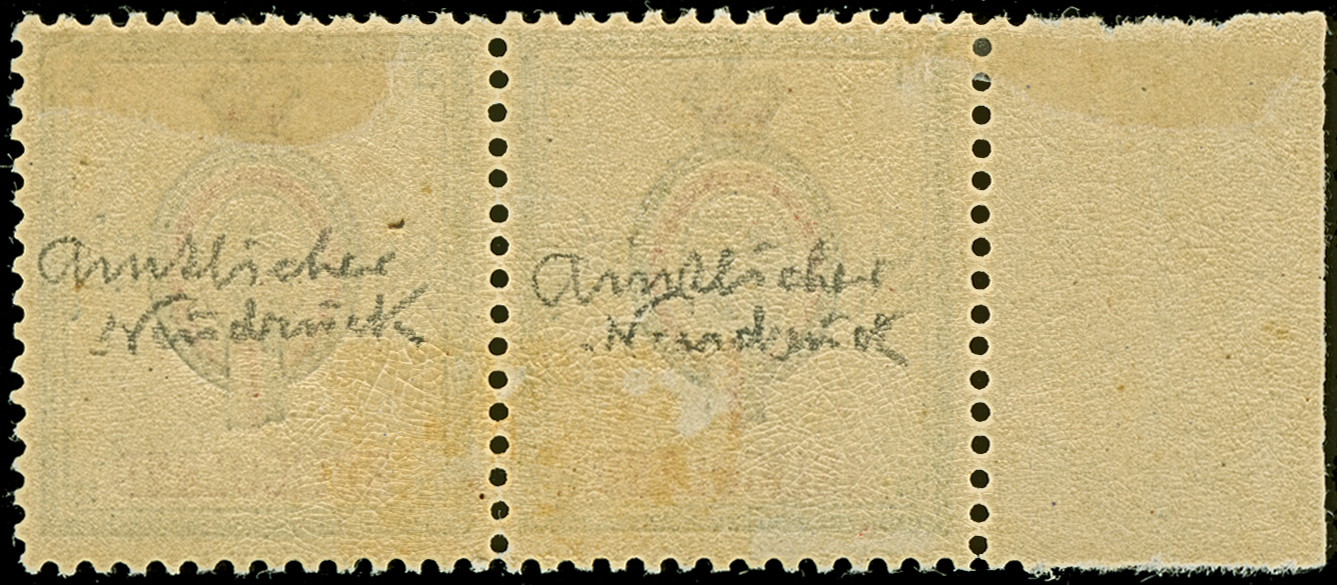 1890, Amtlicher Neudruck 5 M. dunkelgraugrün/karminrot/schwarz, waagerechtes Paar mit linkem Seitenrand, farbfrisch und gut gezähnt, sauber ungebraucht, tadellos, eine sehr seltene Marke. Die Auflage betrug lediglich 200 Stück, davon sind 75 Stück in den Handel gelangt, Bleistiftvermerk und Befund Schulz BPP (2003)