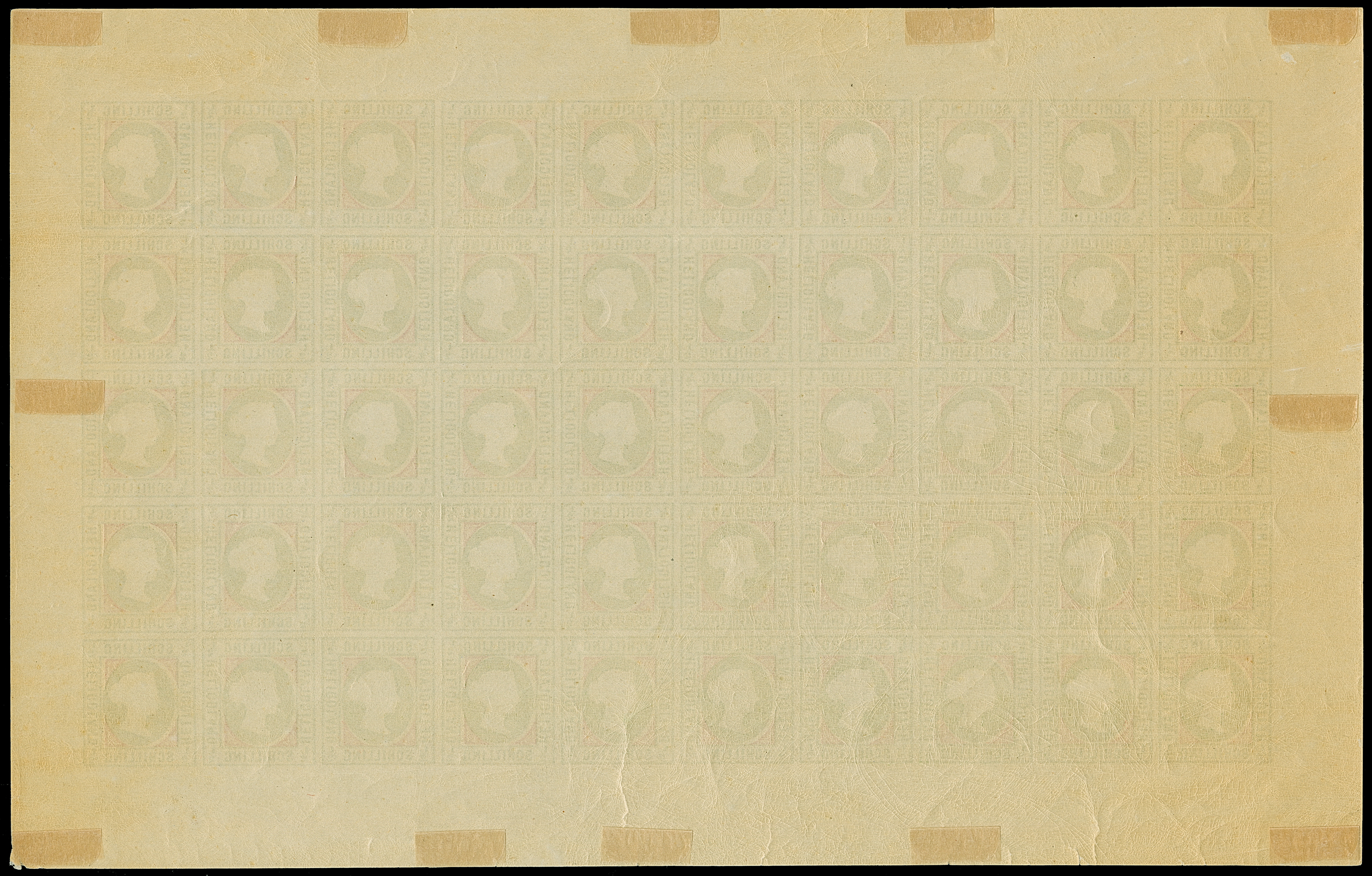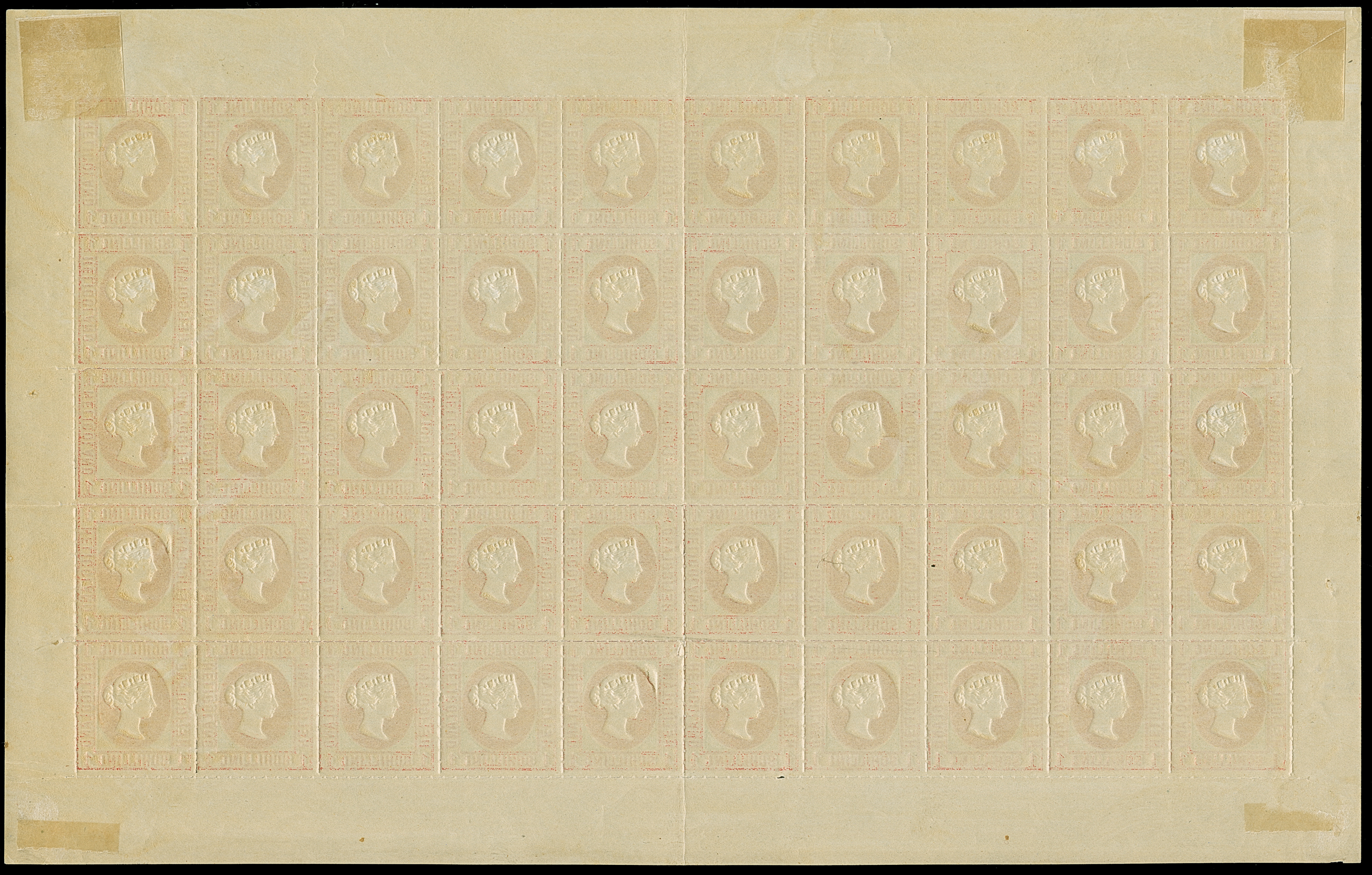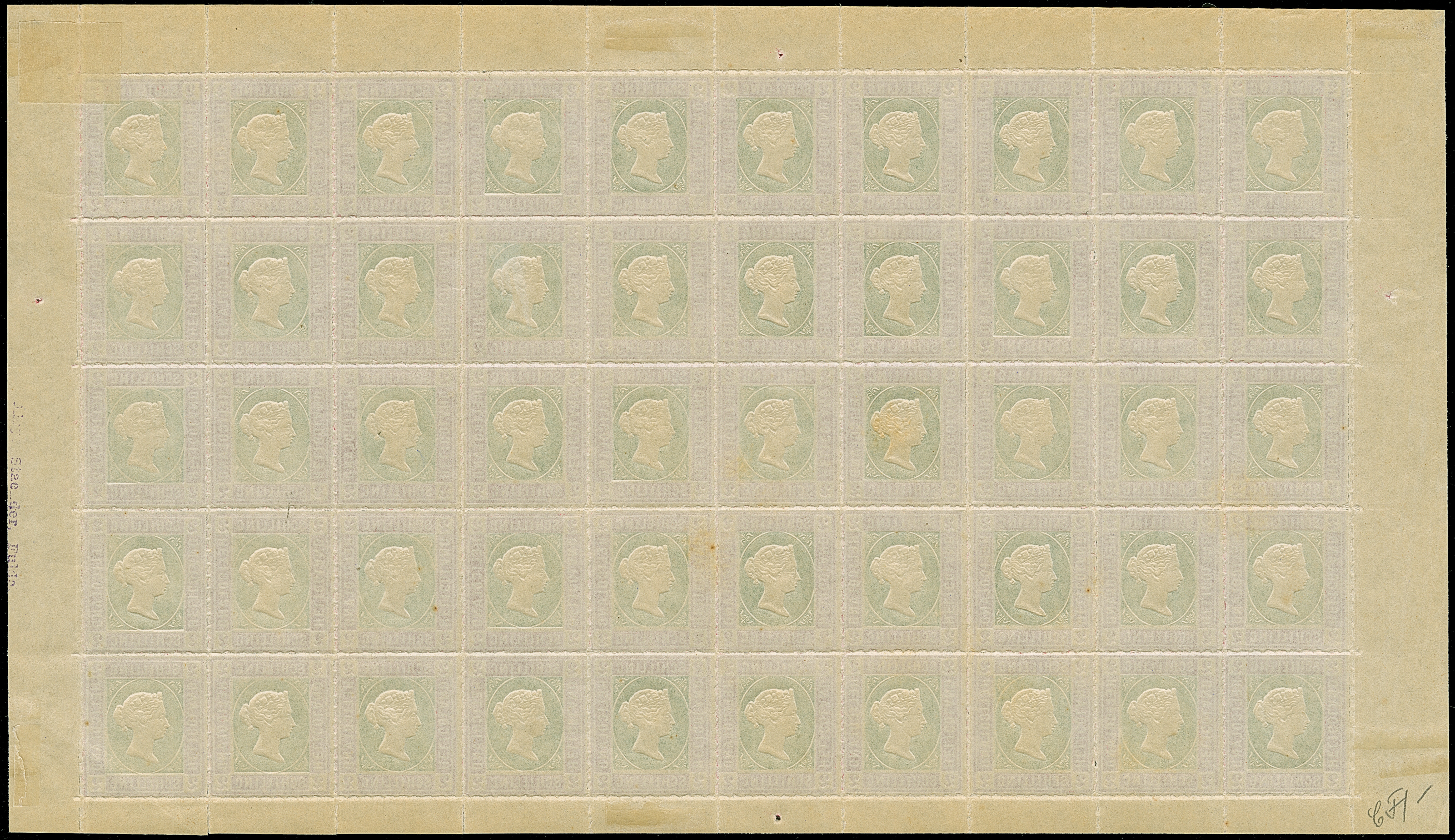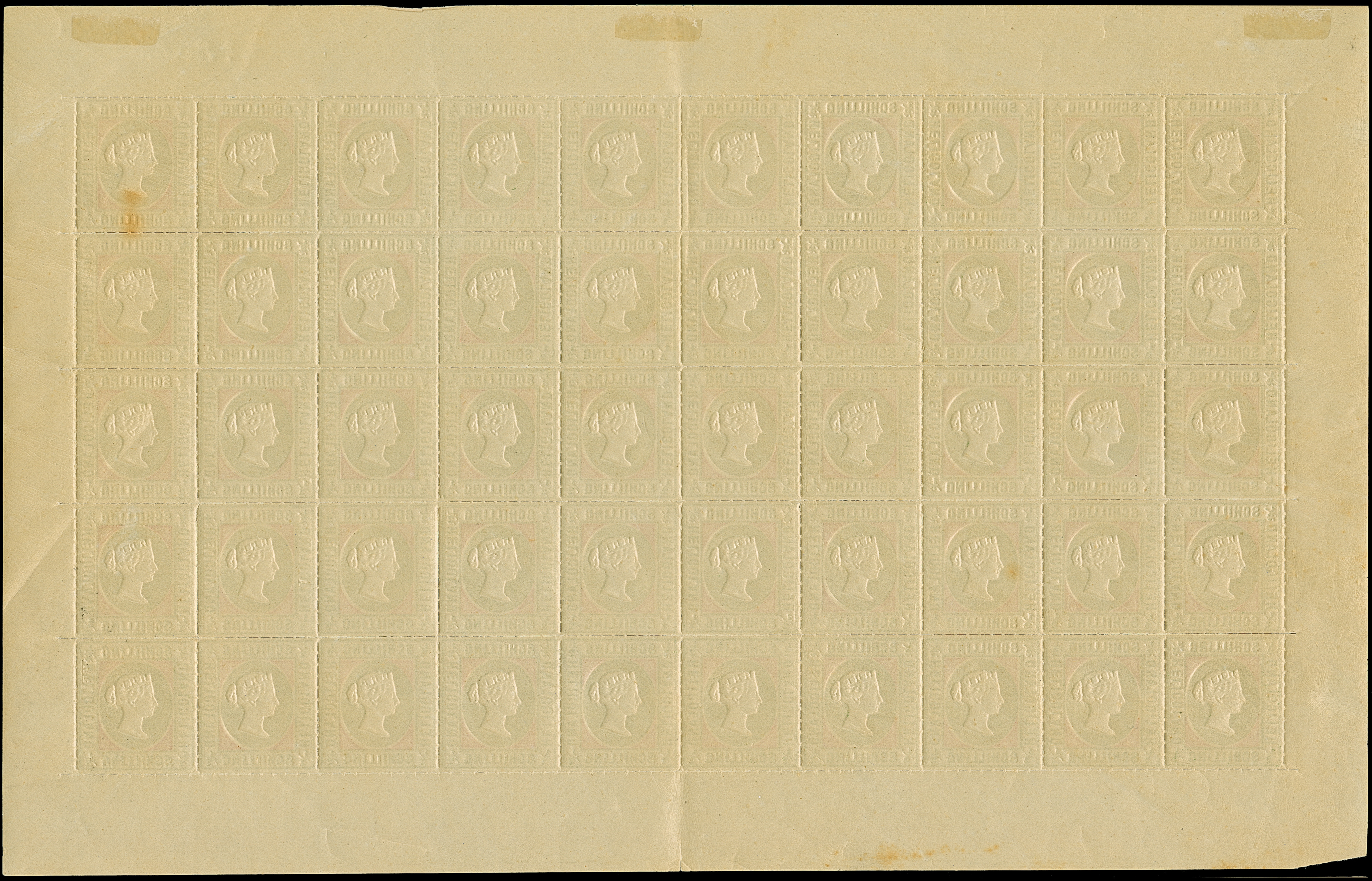 2 Sch. lilakarmin/dunkelgelblichgrün, kompletter Bogen zu 50 Marken mit allen Rändern, Feld 1 mit Plattenfehler "Linke obere Wertziffer verkürzt....", teils gering angetrennt, postfrisch bzw. kleine Falze im Rand, tadellos