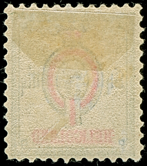 1876, Entwurf der Doppelkarte, rot gedrucktes, zweiteiliges Postkarten-Formular in englischer Sprache, bestehend aus Frage- und Antwortteil, dabei der Wertstempel mit Kopf der Königin Victoria und Nominale “5 FARTHINGS 10 PFENNIG” in Bleistift gezeichnet, rechts unten mit rotem L1 “2 AUG 86” (= vermutlich das Datum, an dem es Archiv entnommen worden ist). Ein einmaliges und beeindruckendes Essay