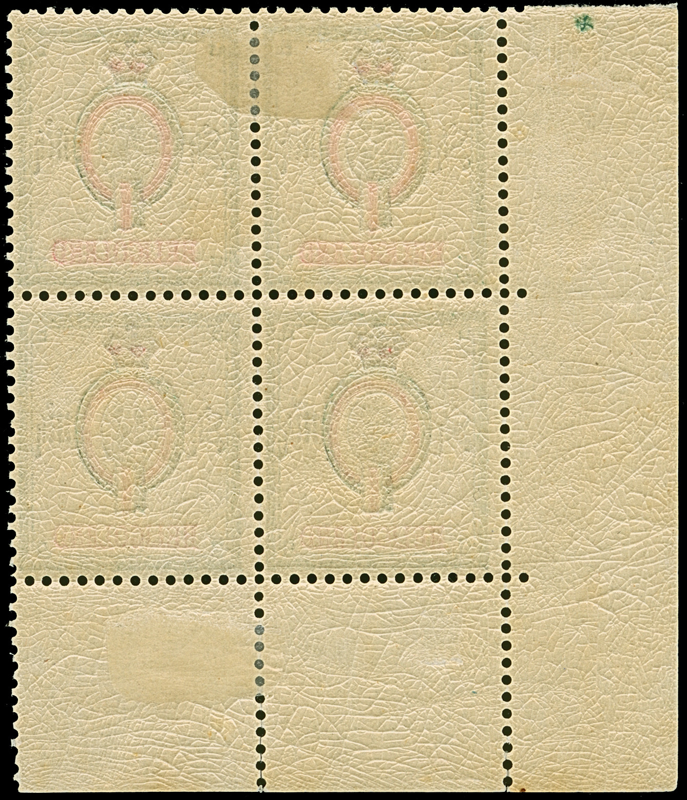 1879, 5 M. mehrfarbig, Viererblock aus der linken unteren Bogenecke, farbfrisch und gut gezähnt, die oberen Marken sowie im Rand Falzreste, das untere Paar postfrisch, unten im Rand winzig angetrennt, sonst tadellos