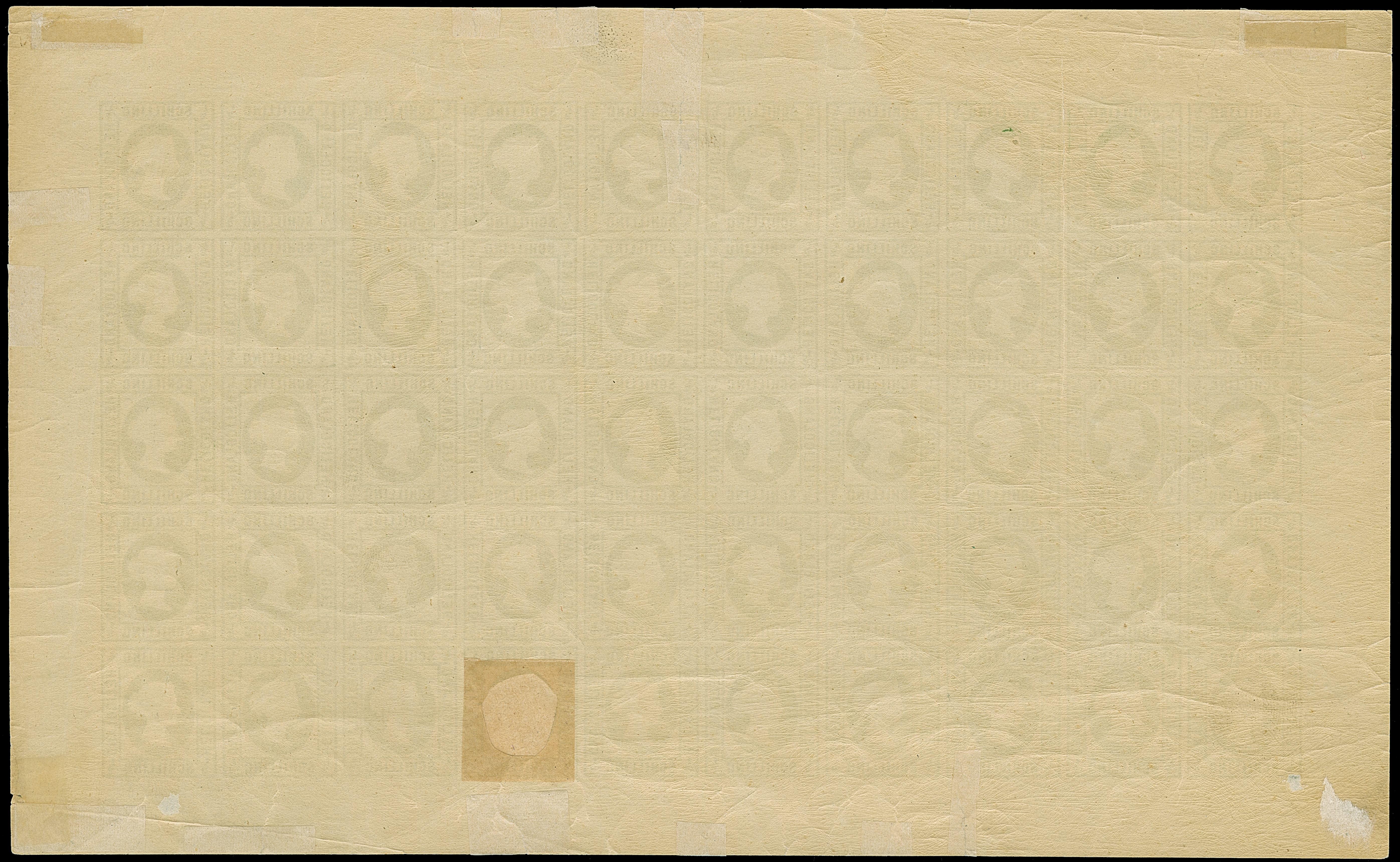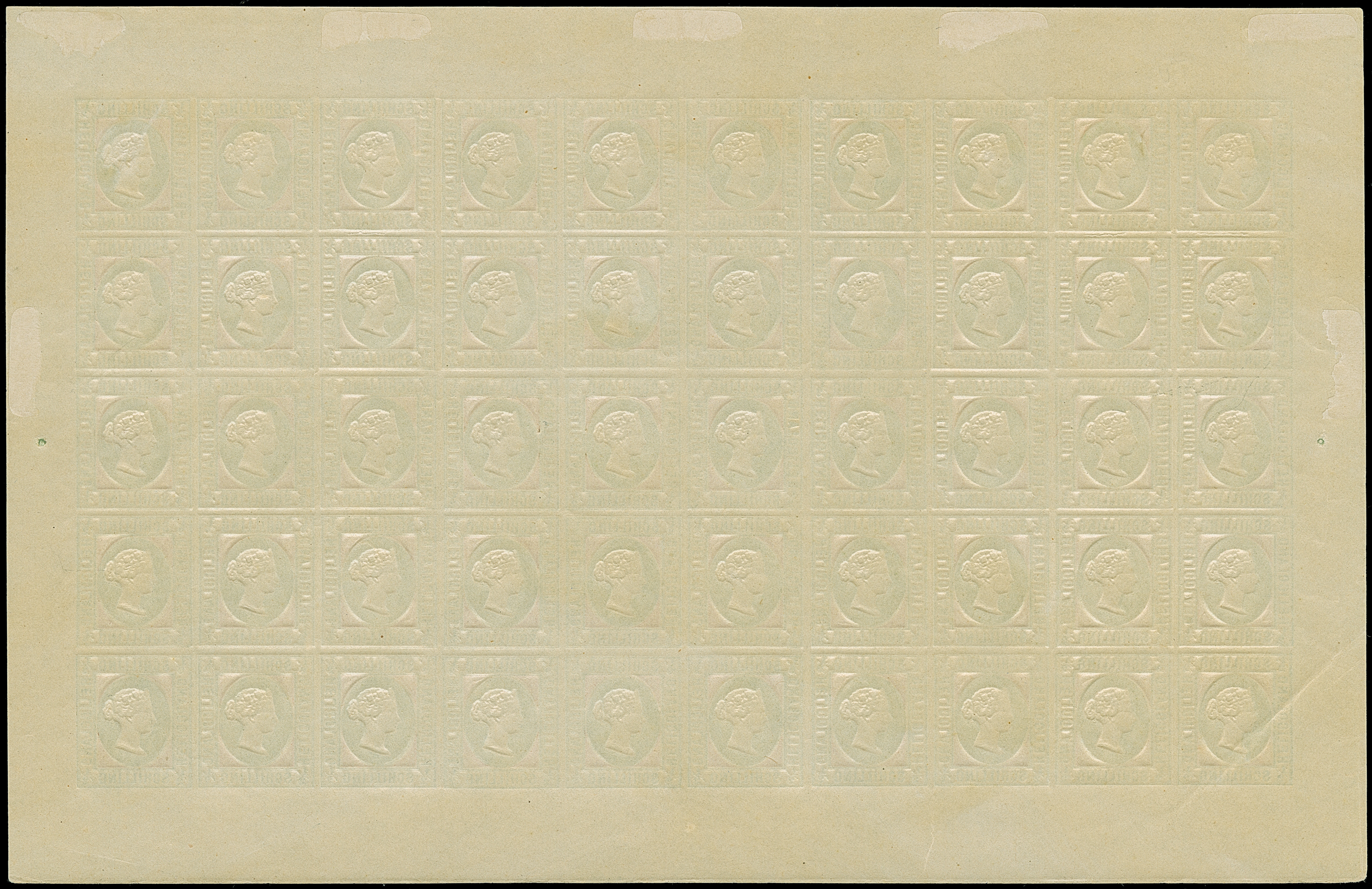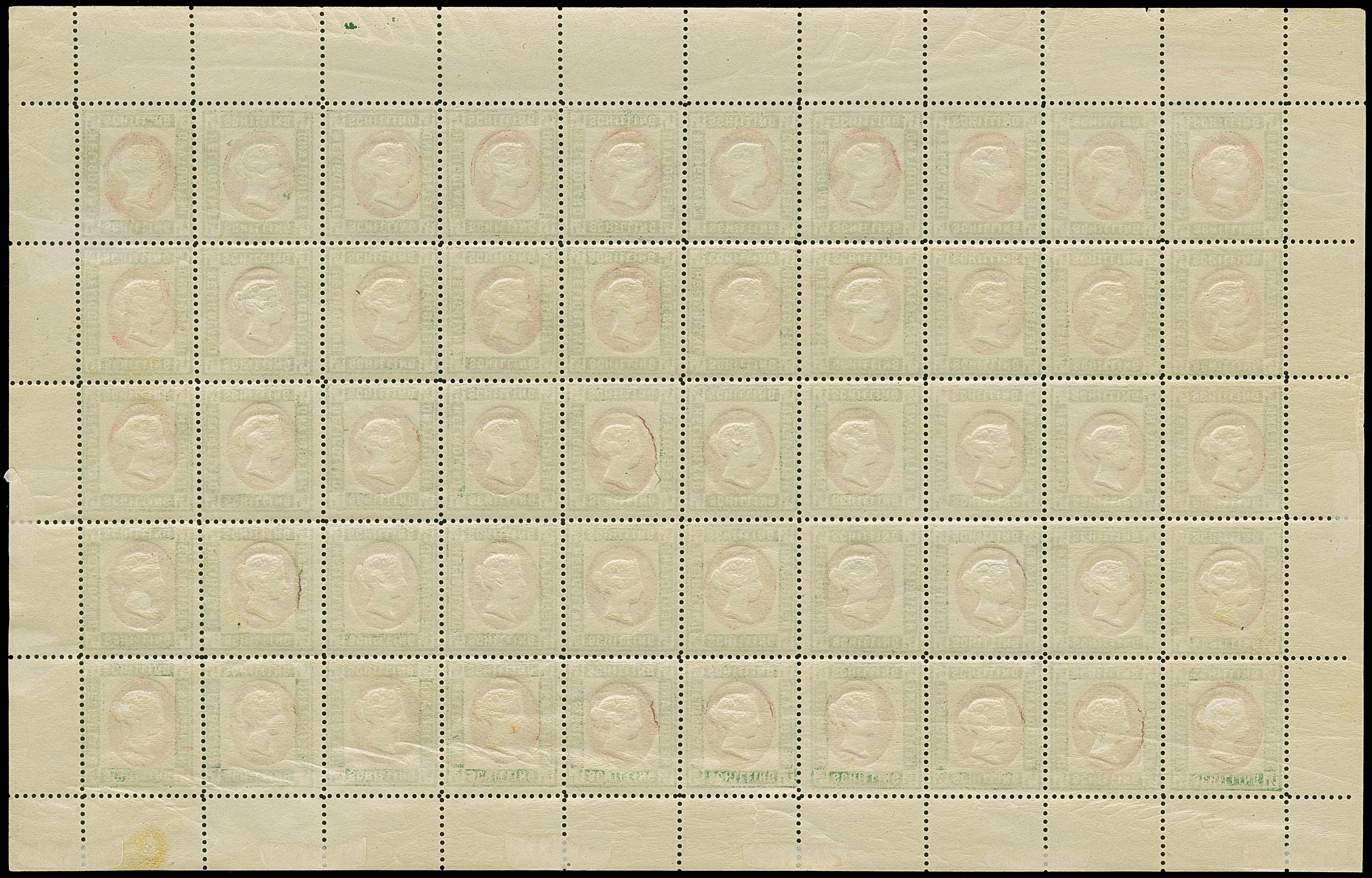 HAMBURGER: 1891/95, ½ Sch. dunkelgrün, ohne Präfung, ohne Zwickeldruck, geschnitten, Feld 47 mit ausgeschnittenem Medaillon, postfrisch, zwei Werte ungebraucht, im Rand geknittert, kleine Risse, zwischen der 2. und 3. senkrechten Reihe Faltung mit kleinem Bruch, sonst tadellos