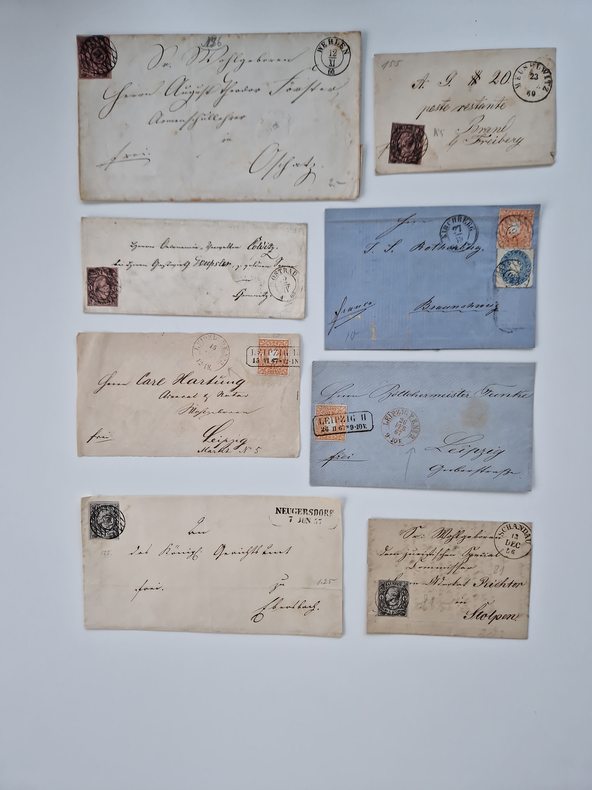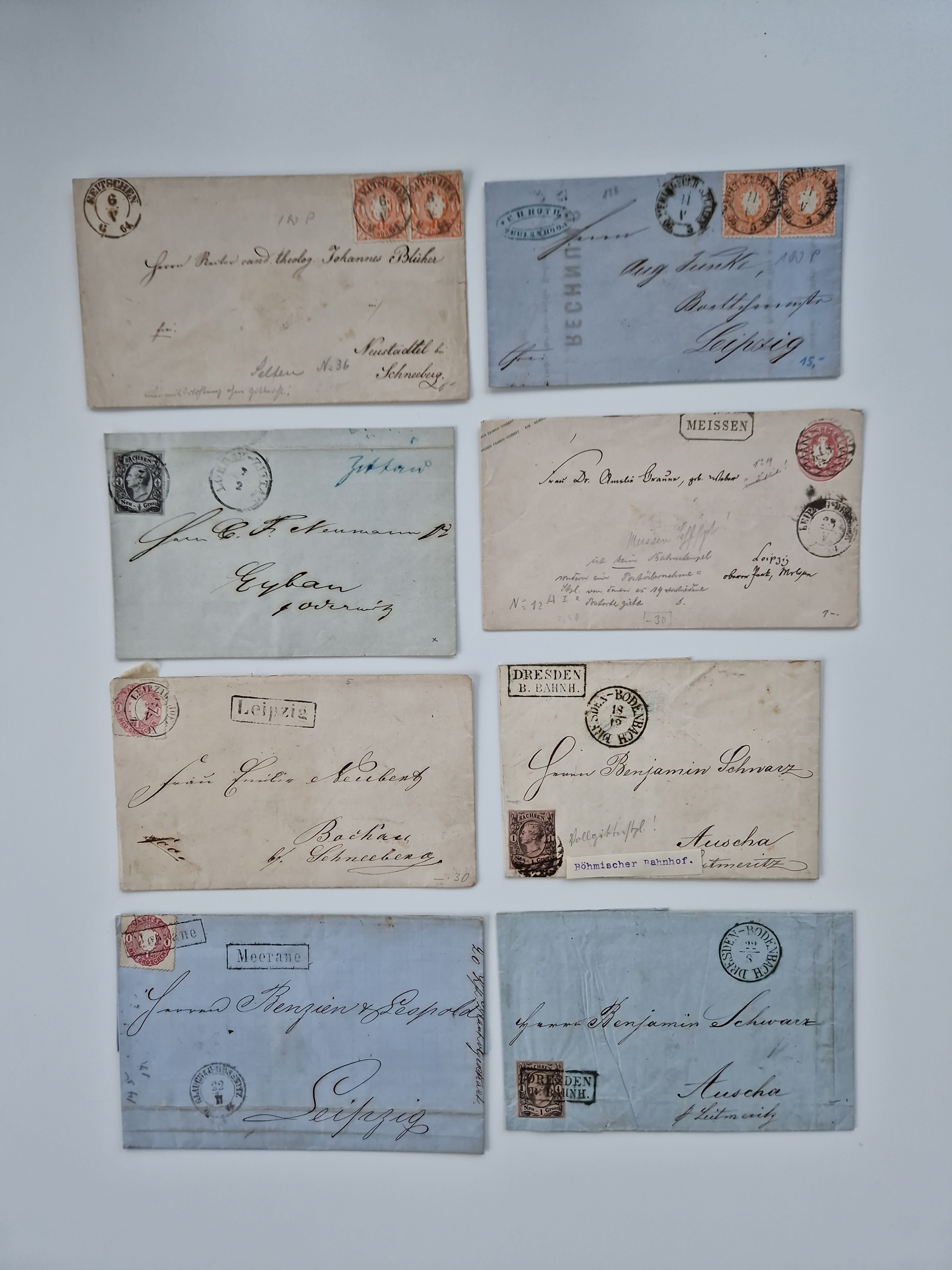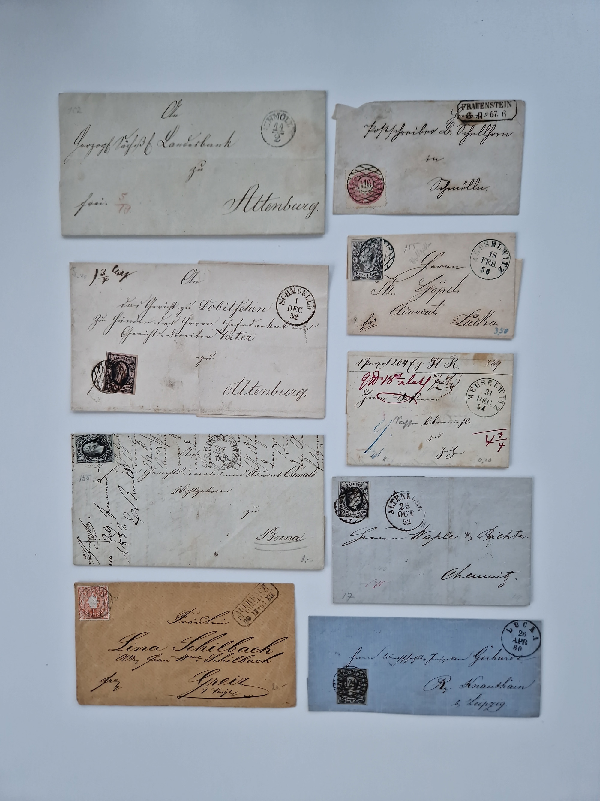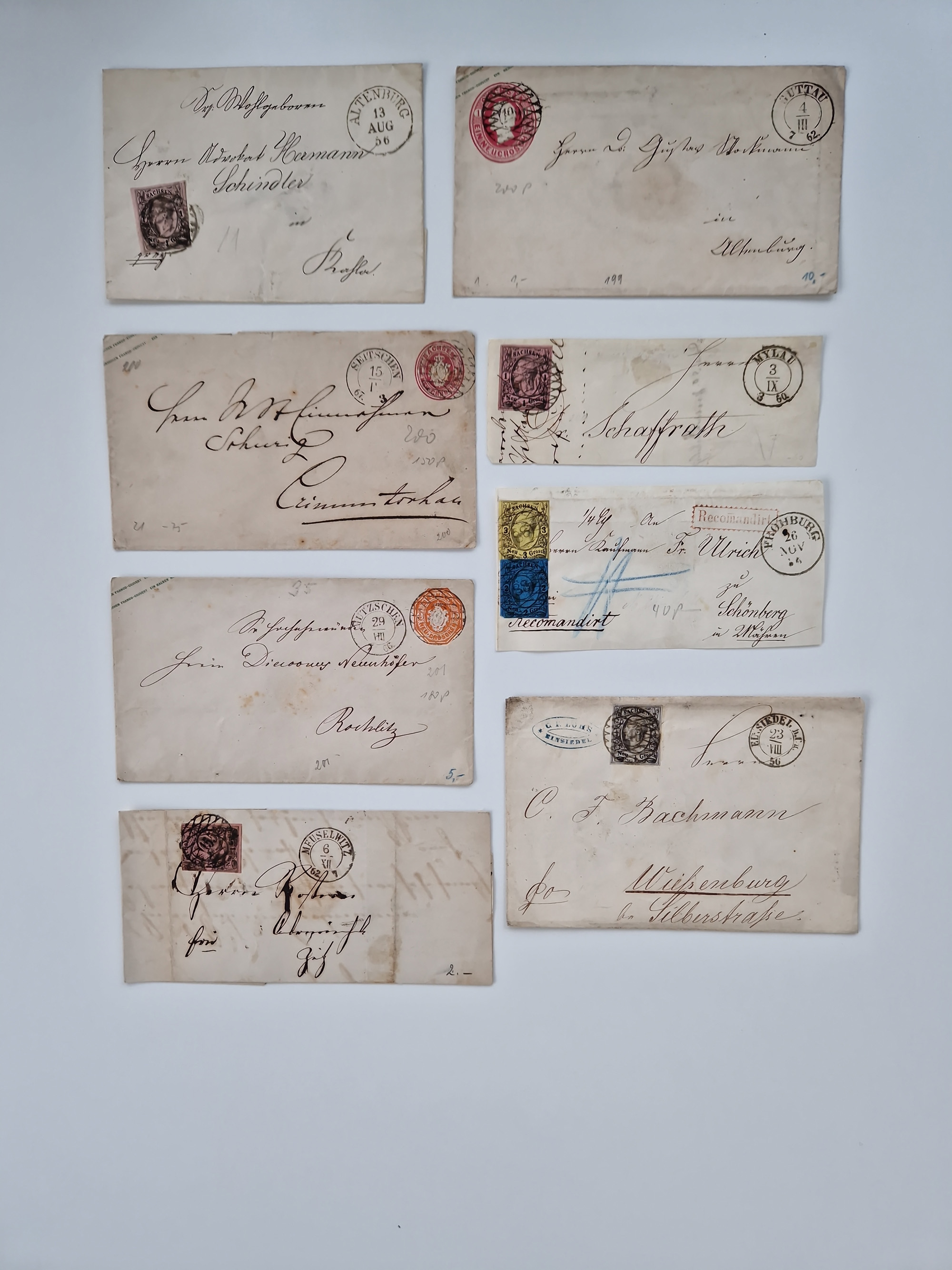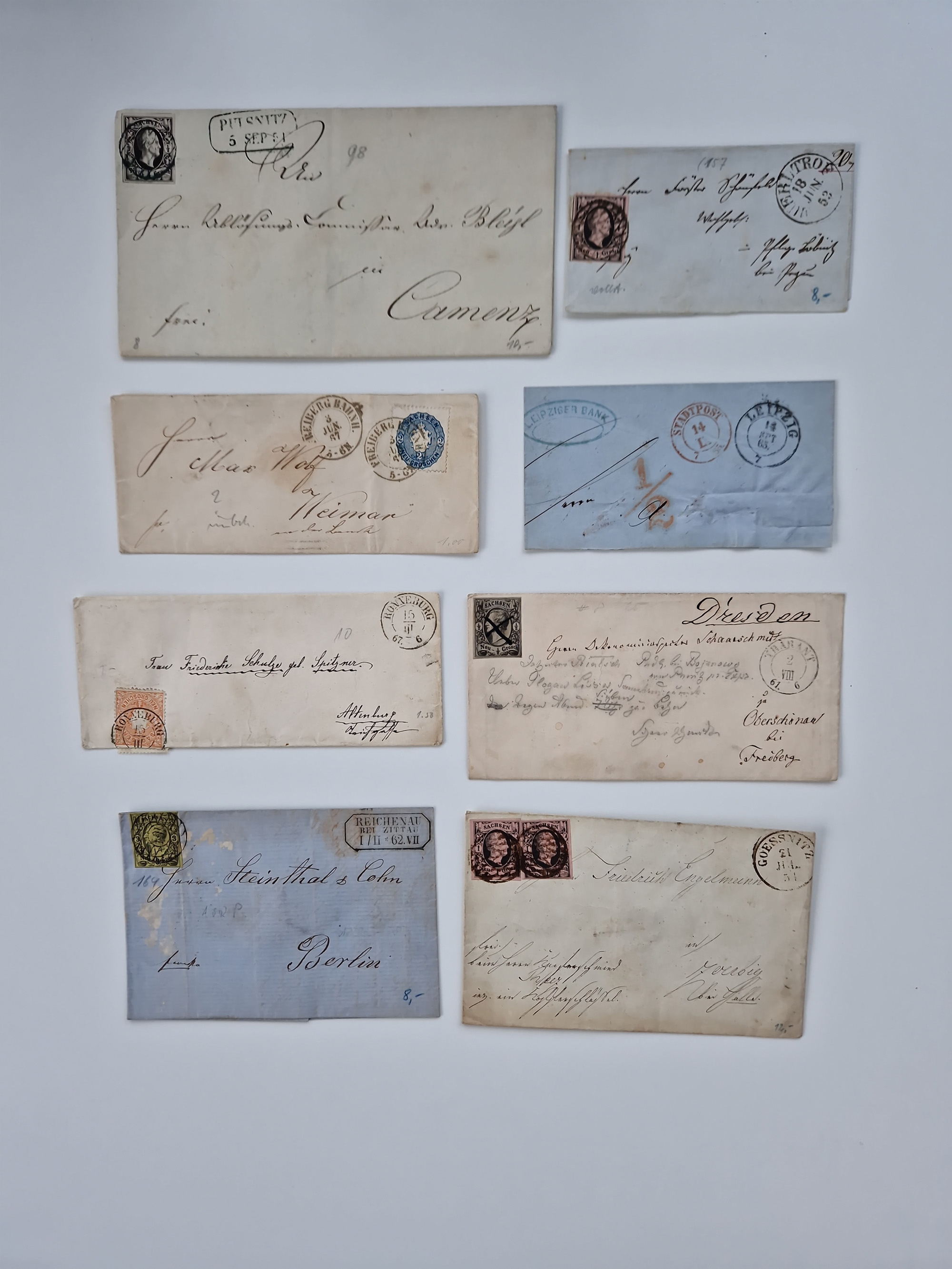 1859/70, 8 Briefe und eine Ganzsache mit rückseitigen Briefsammlung-Stempeln, einmal nachverwendet; dabei "GRÖTZSCH", "REUTH" und "LINDENAU".