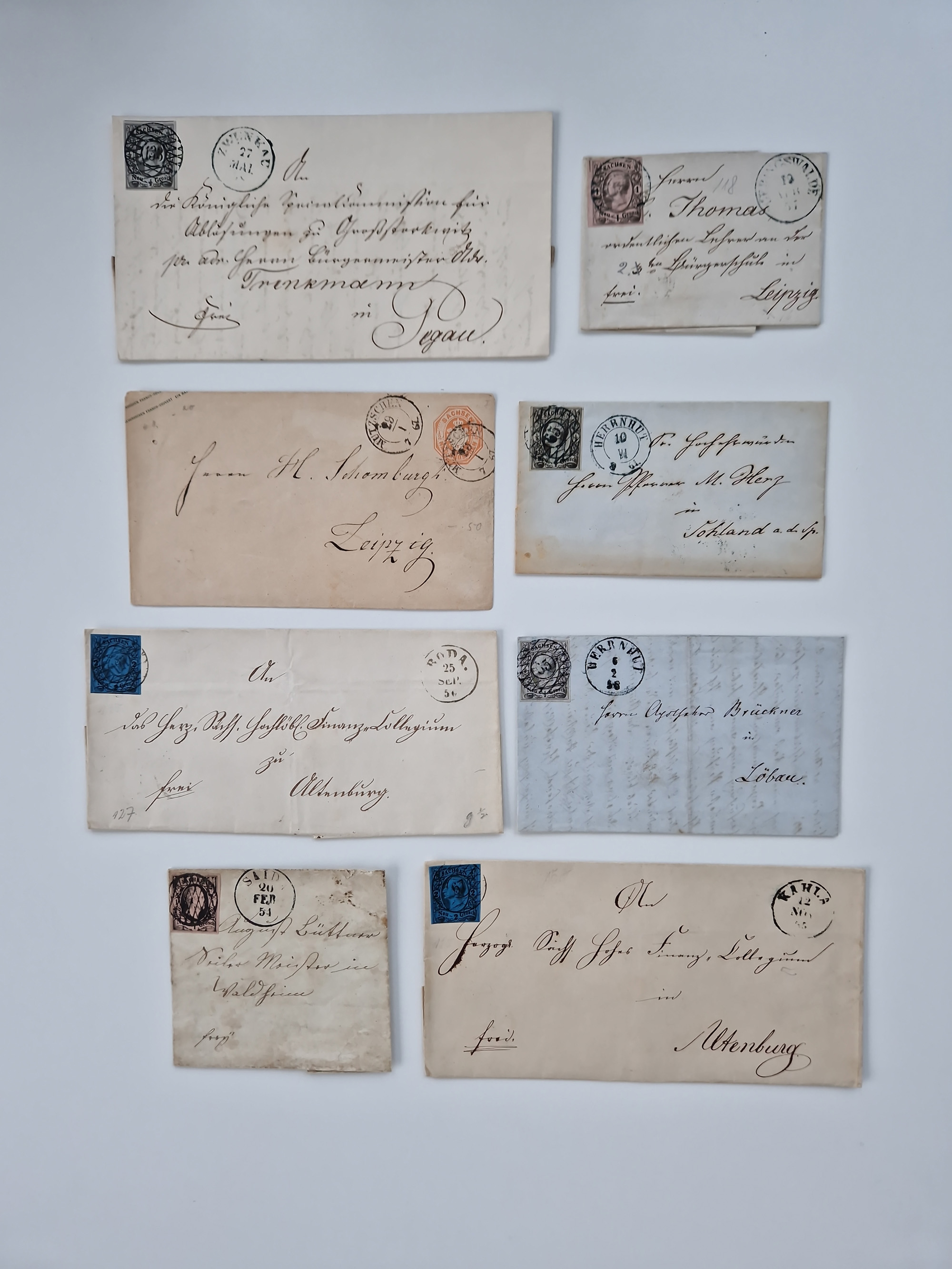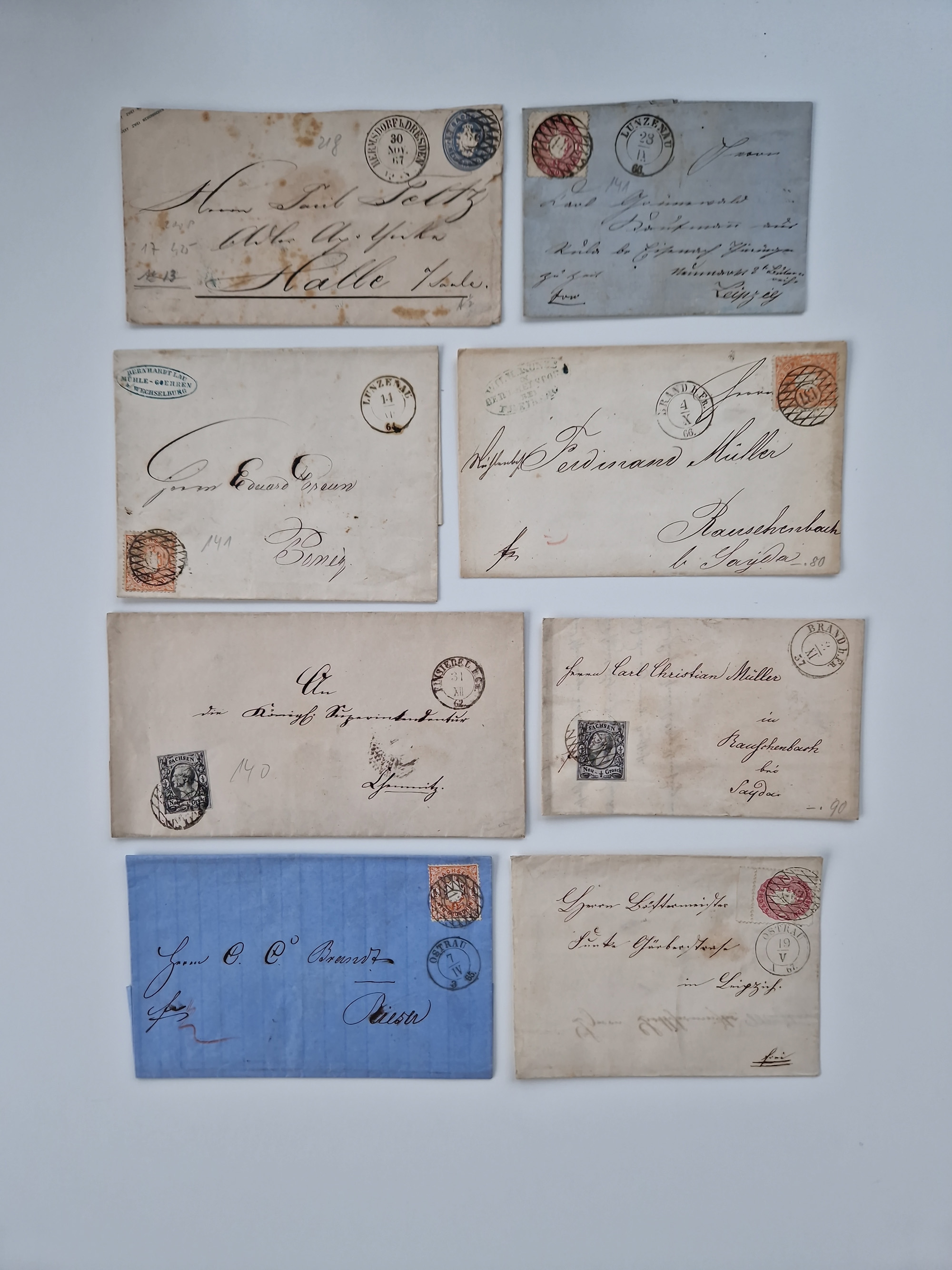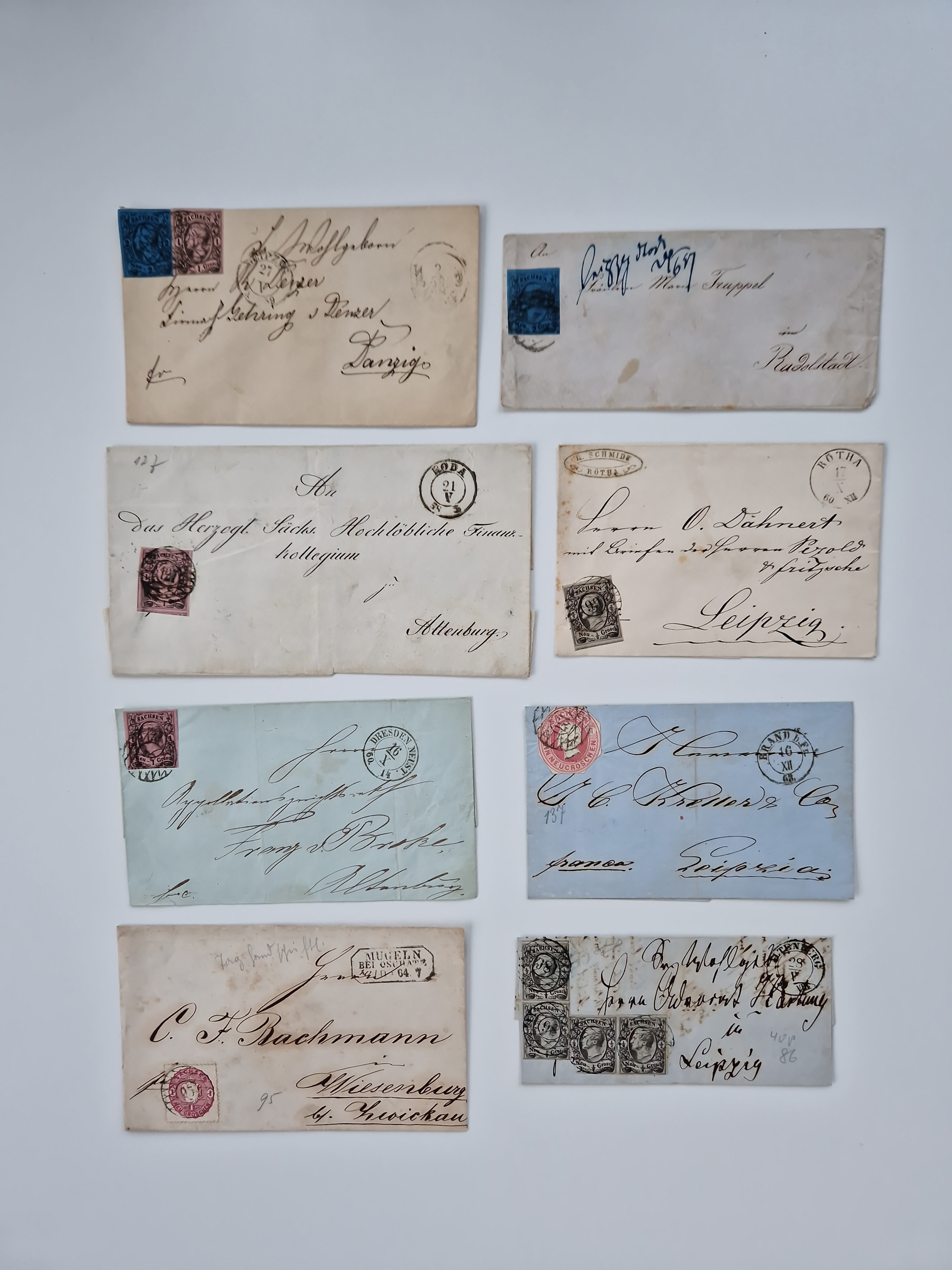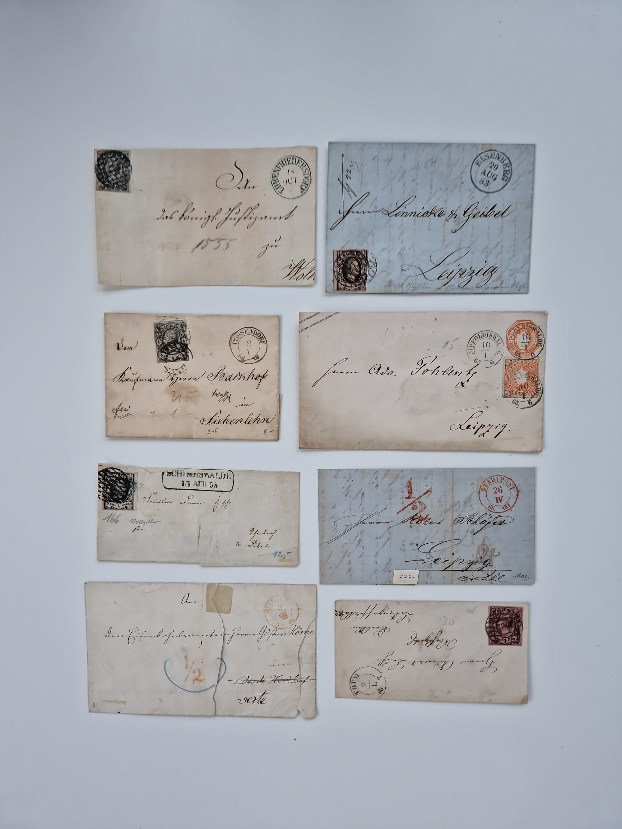 1859/70, 8 Briefe und eine Ganzsache mit rückseitigen Briefsammlung-Stempeln, einmal nachverwendet; dabei "GRÖTZSCH", "REUTH" und "LINDENAU".
