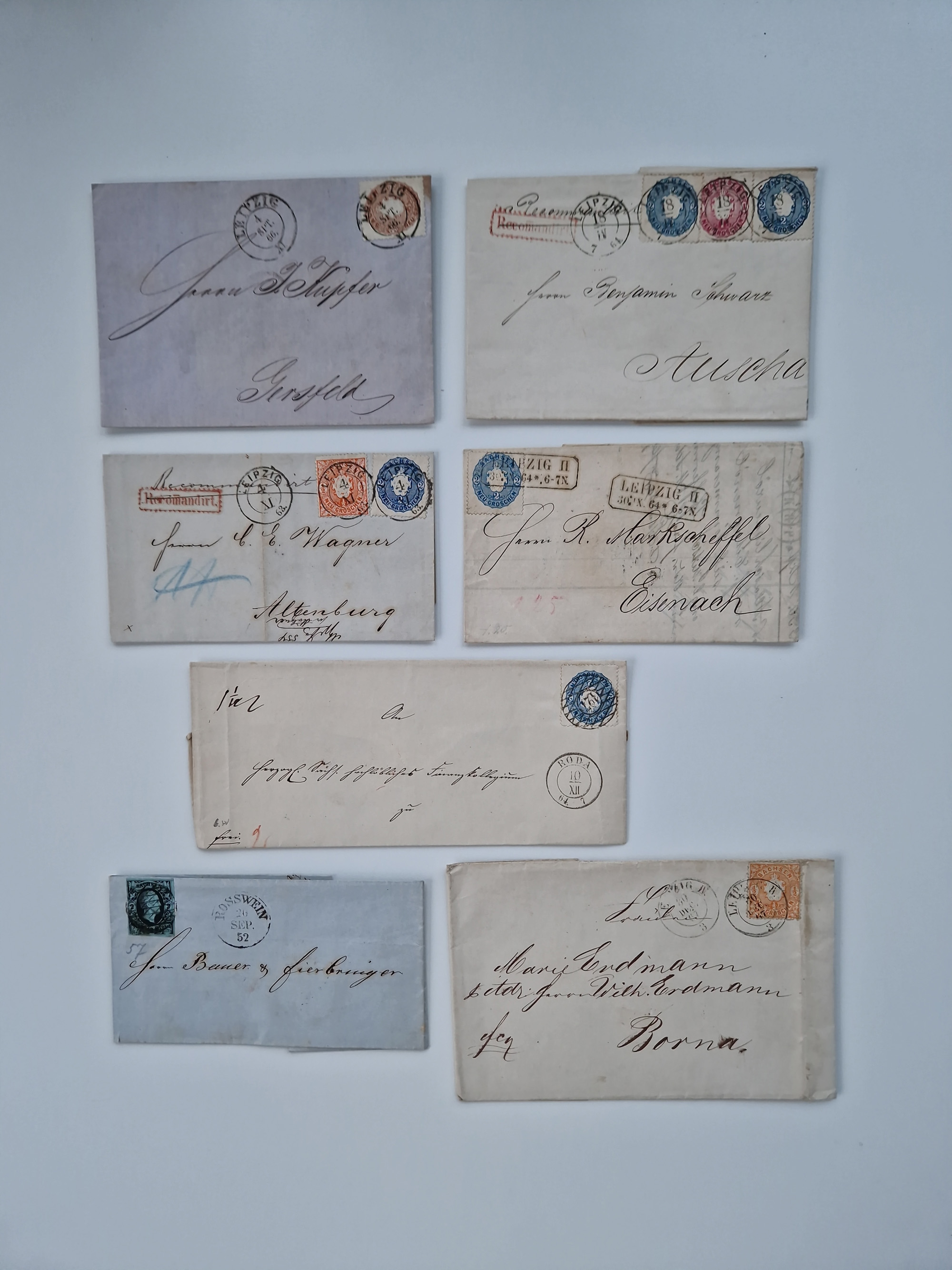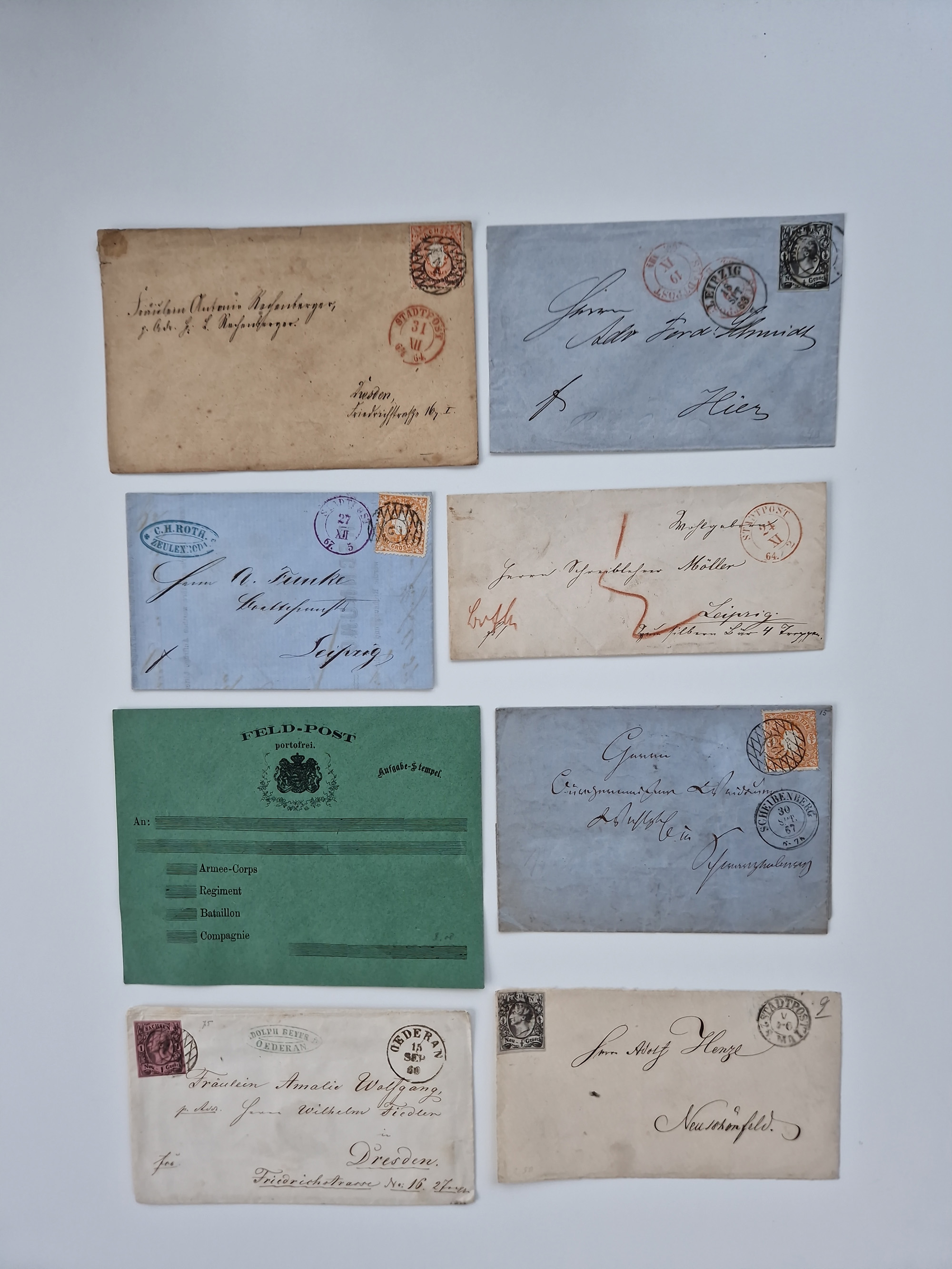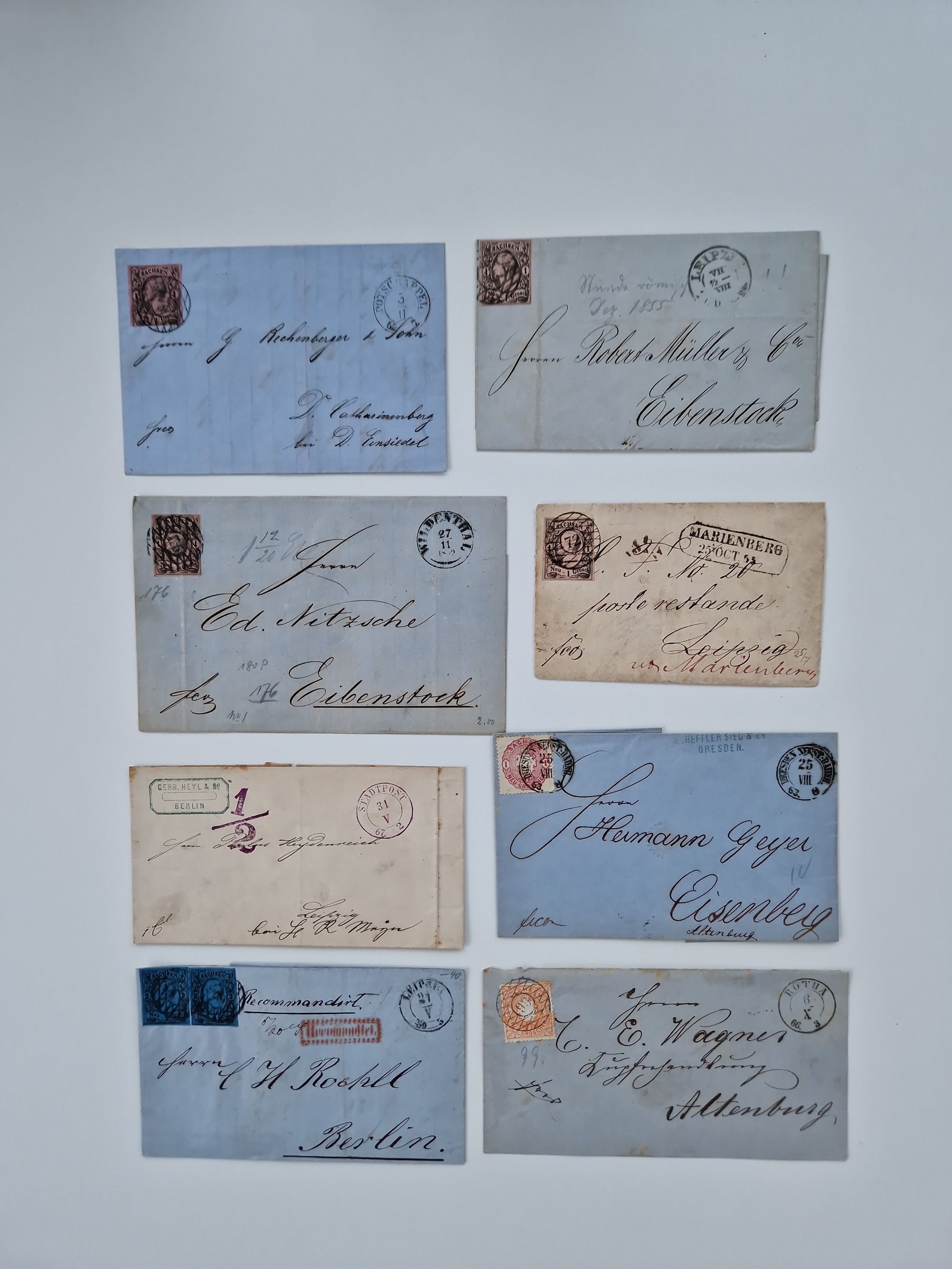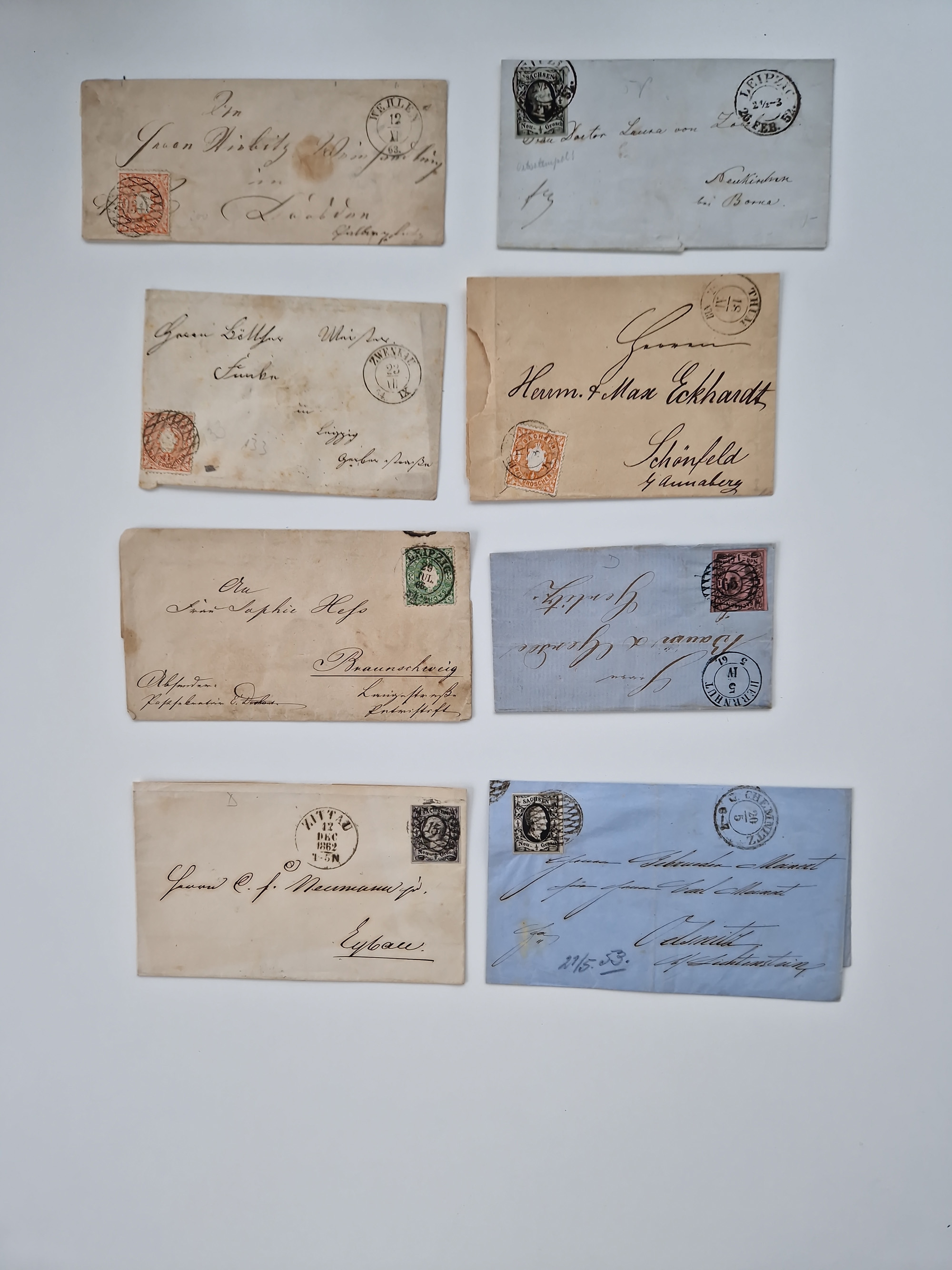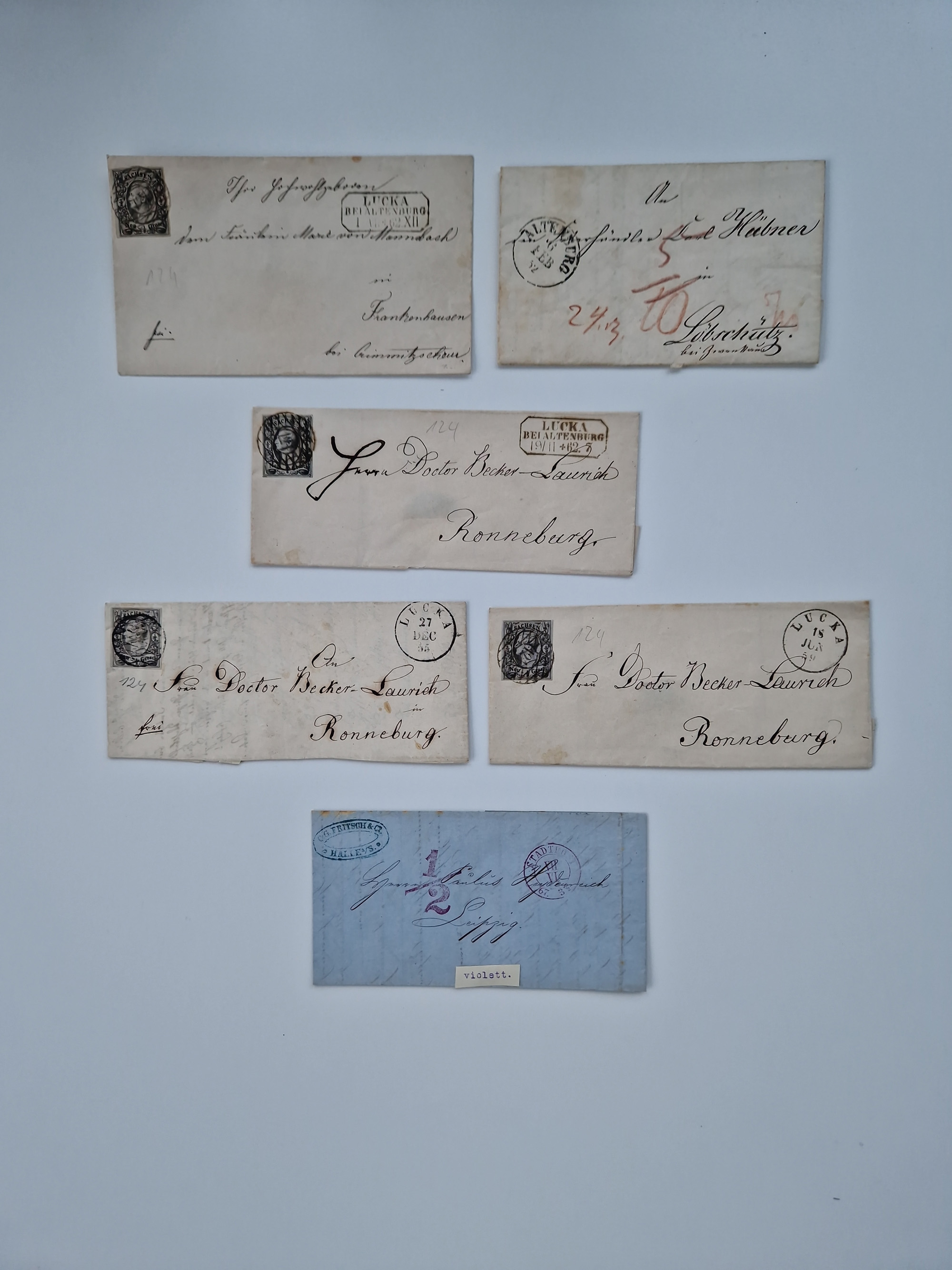 1859/70, 8 Briefe und eine Ganzsache mit rückseitigen Briefsammlung-Stempeln, einmal nachverwendet; dabei "GRÖTZSCH", "REUTH" und "LINDENAU".