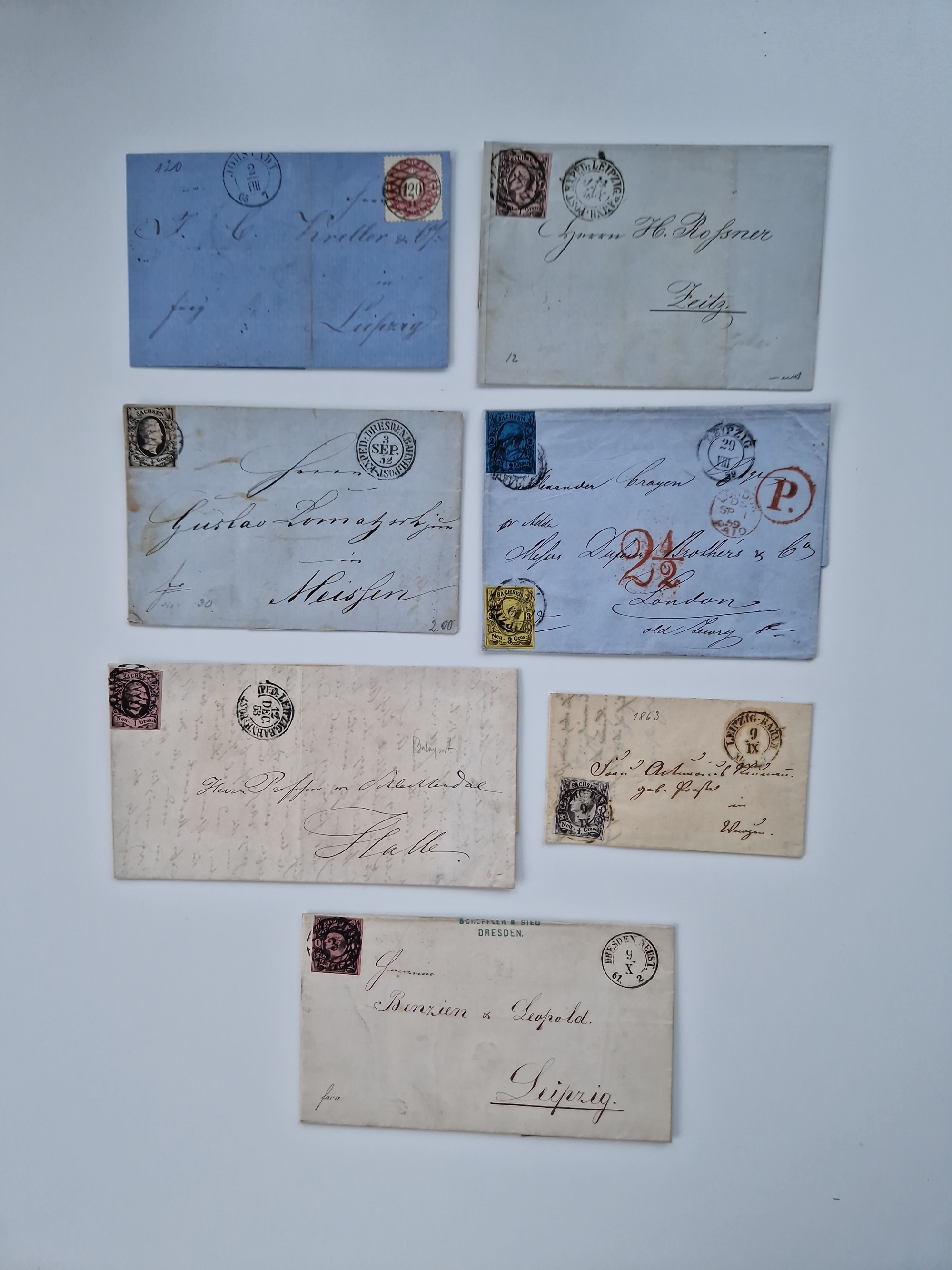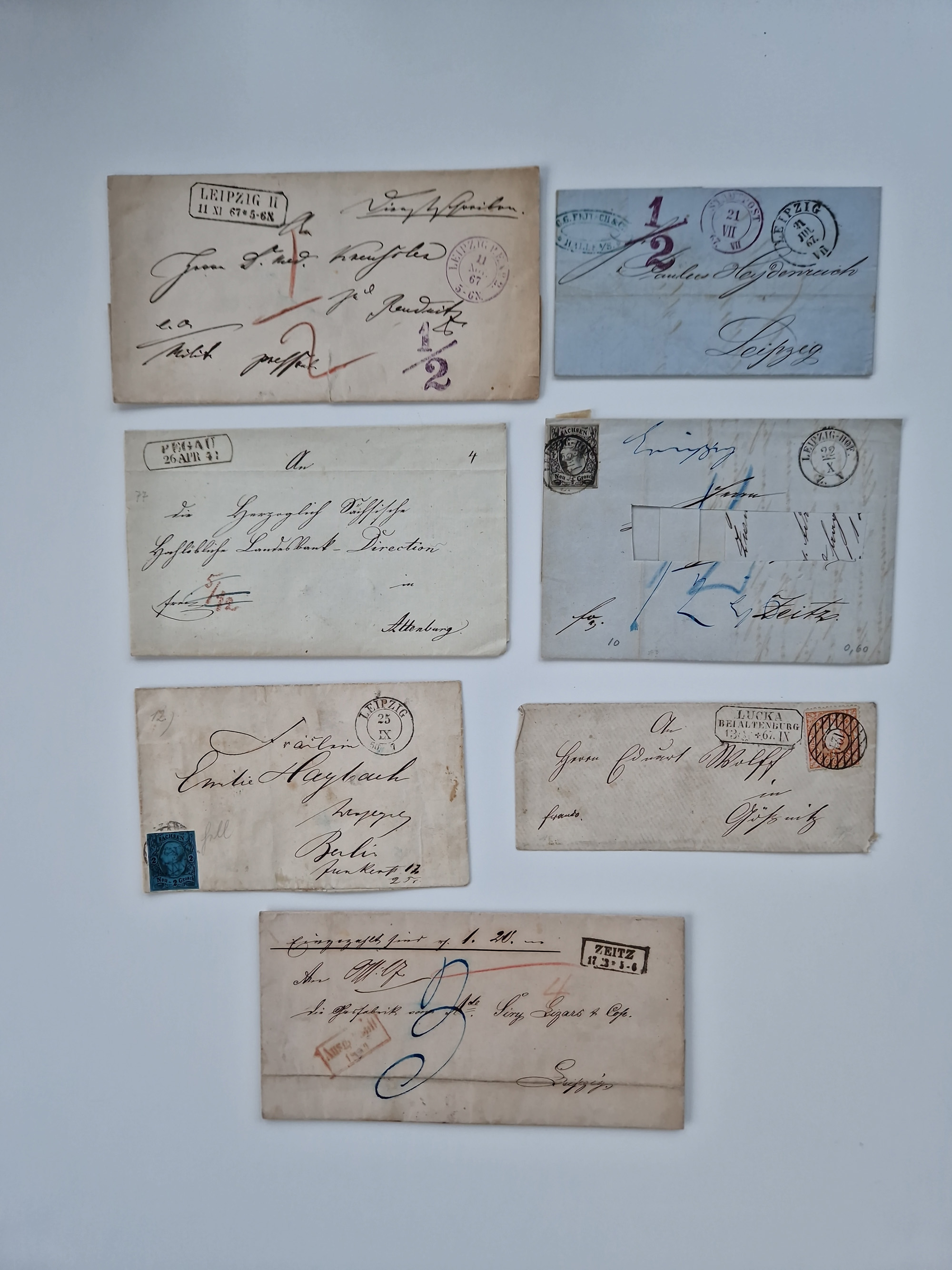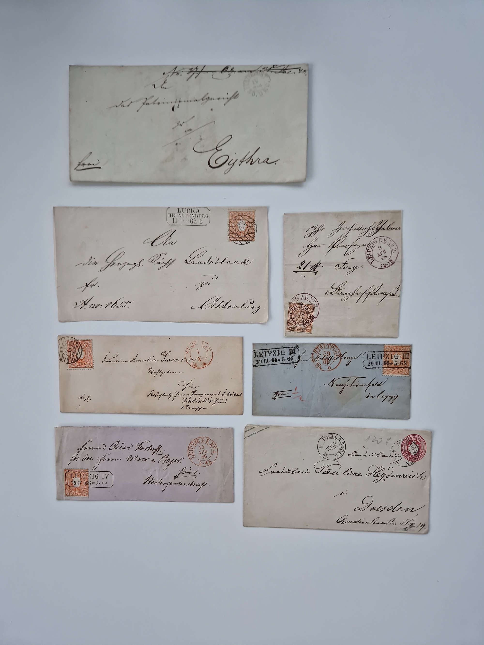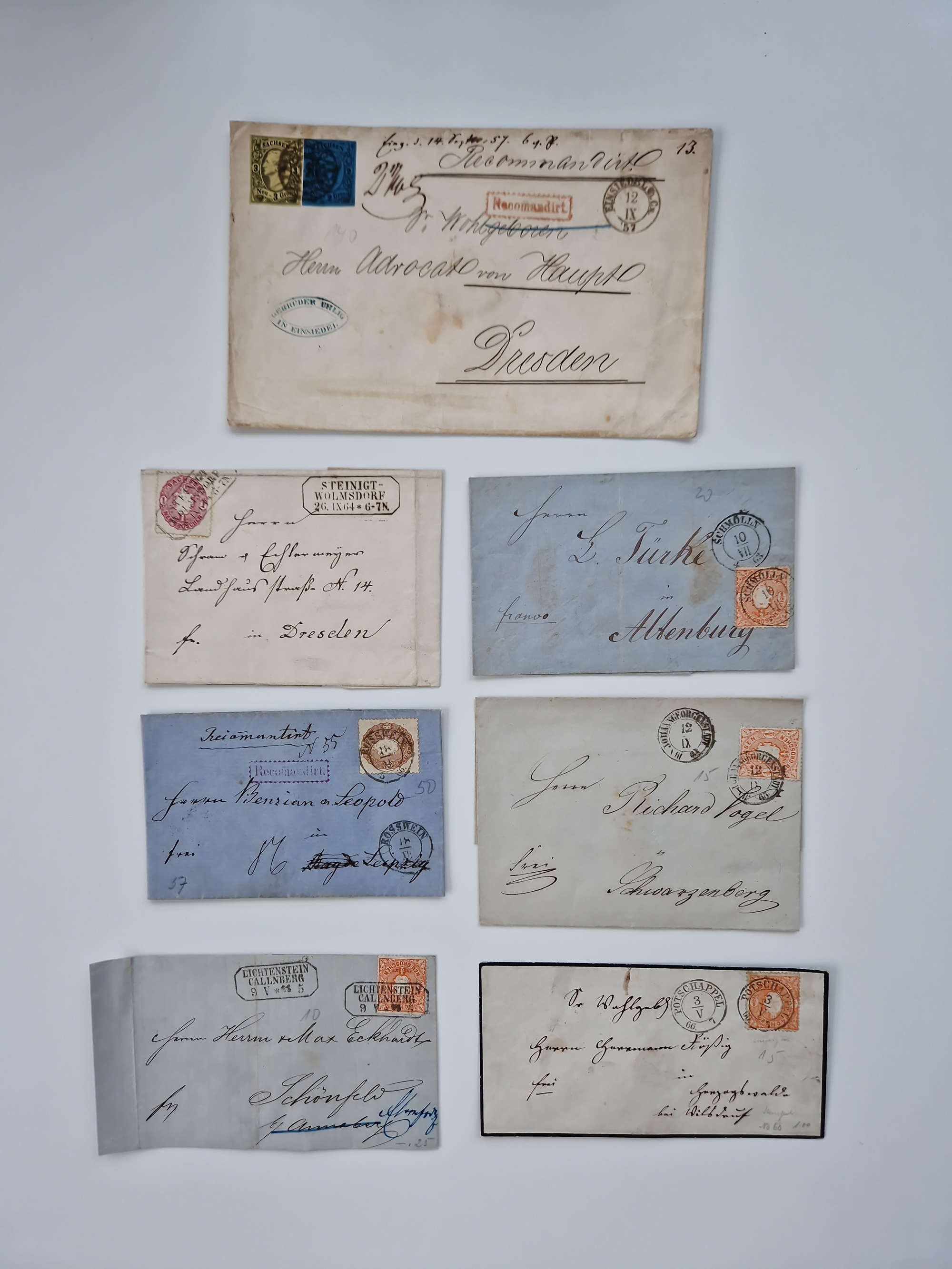1859/70, 8 Briefe und eine Ganzsache mit rückseitigen Briefsammlung-Stempeln, einmal nachverwendet; dabei "GRÖTZSCH", "REUTH" und "LINDENAU".