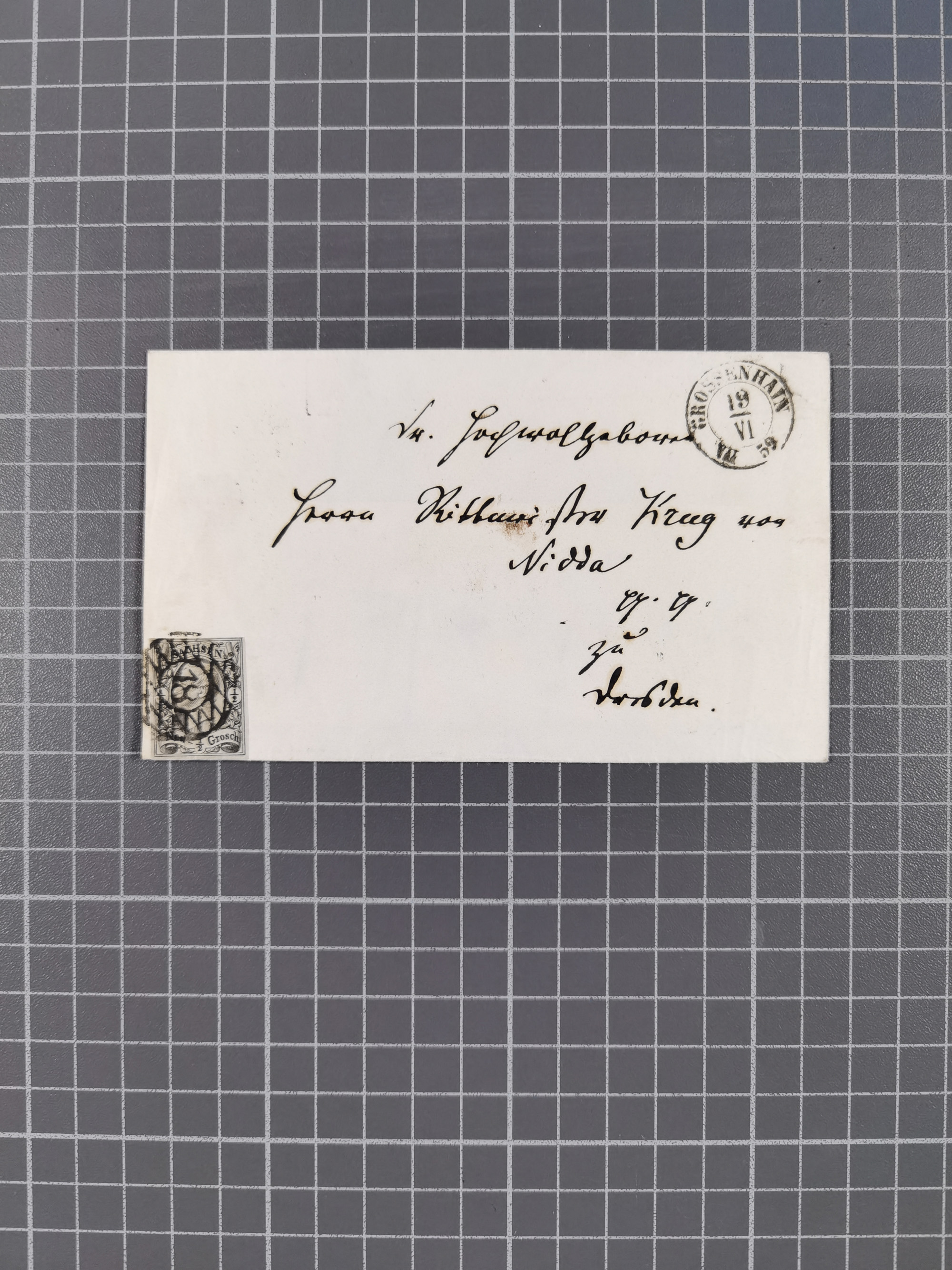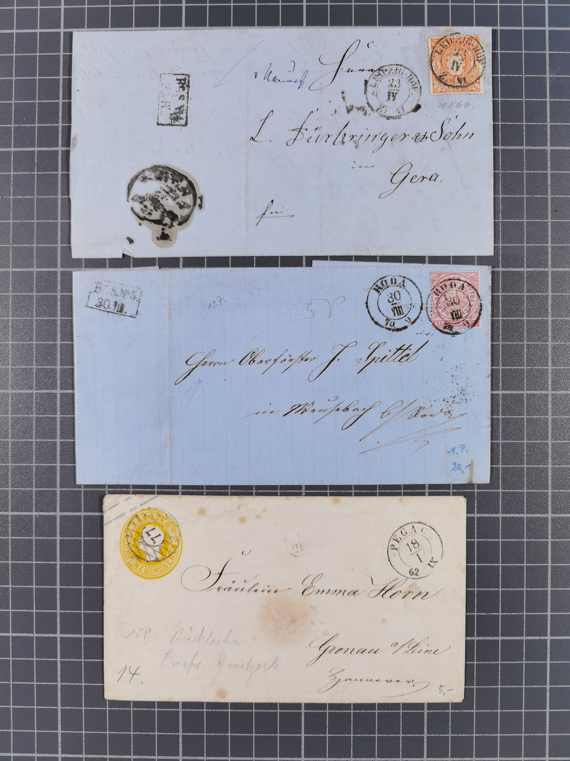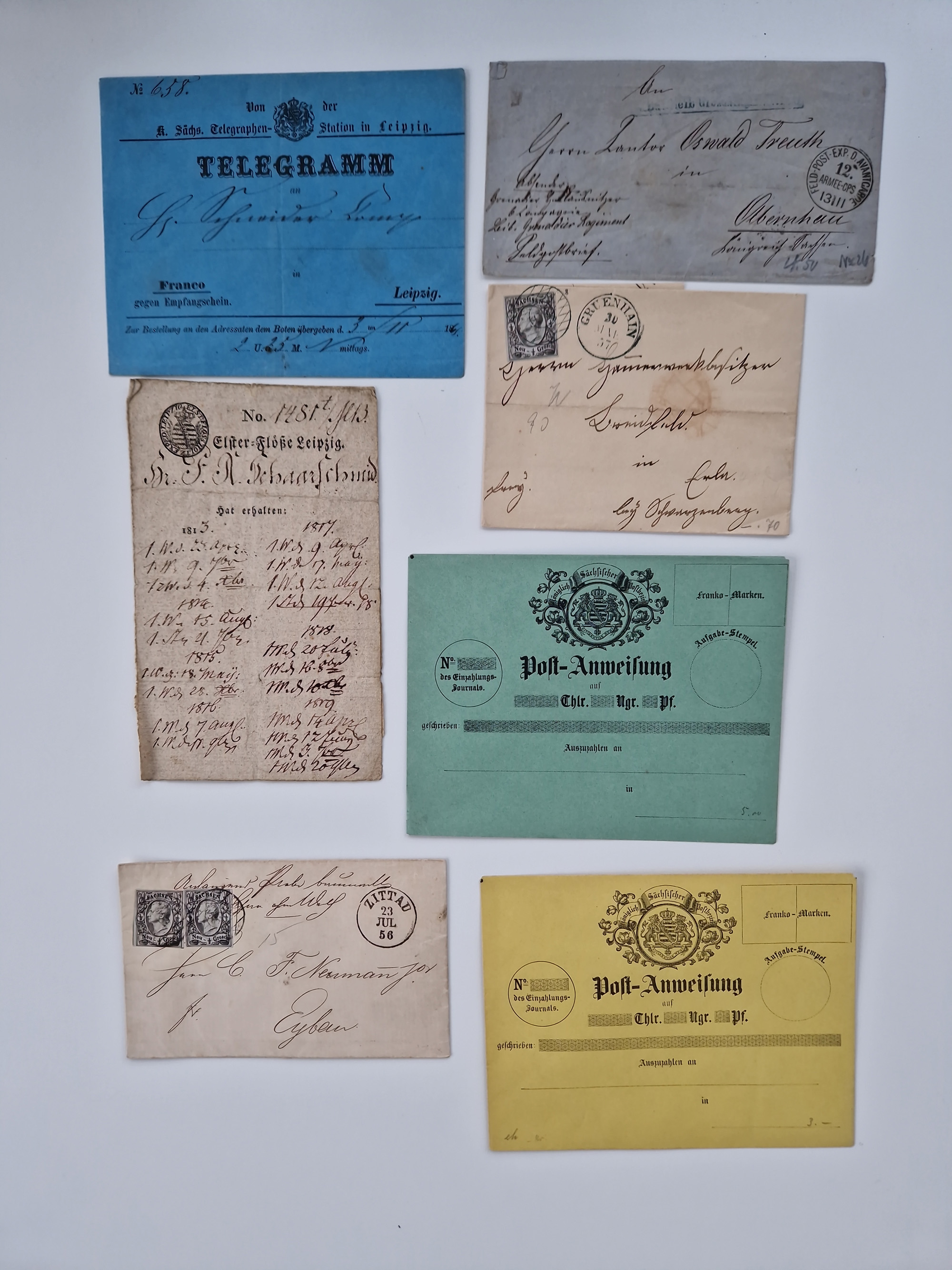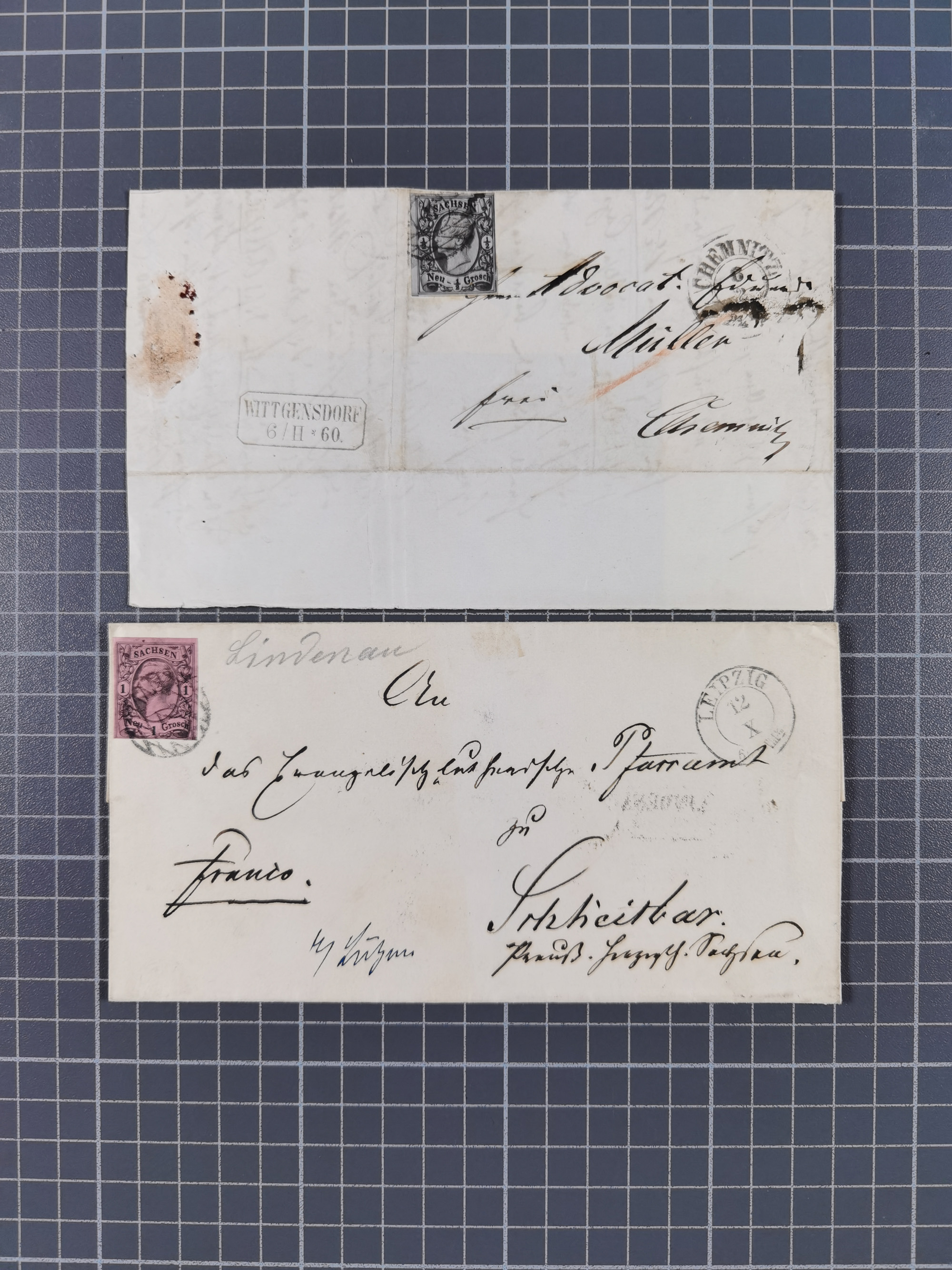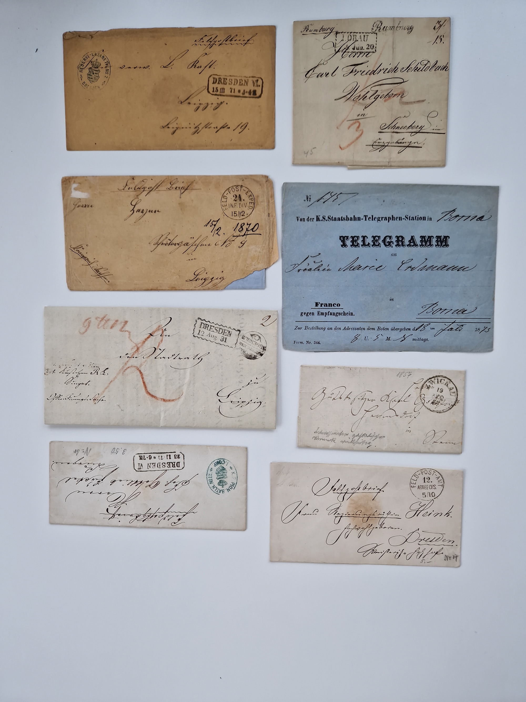 1859/70, 8 Briefe und eine Ganzsache mit rückseitigen Briefsammlung-Stempeln, einmal nachverwendet; dabei "GRÖTZSCH", "REUTH" und "LINDENAU".