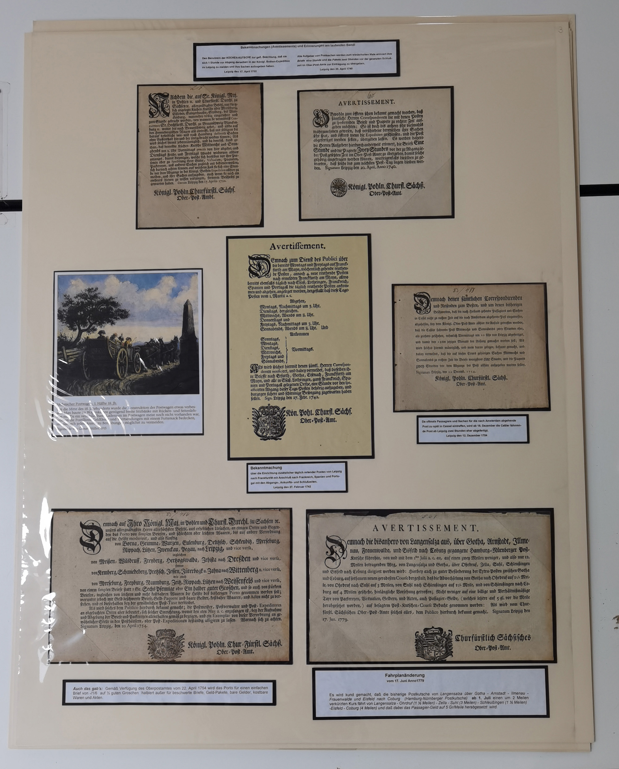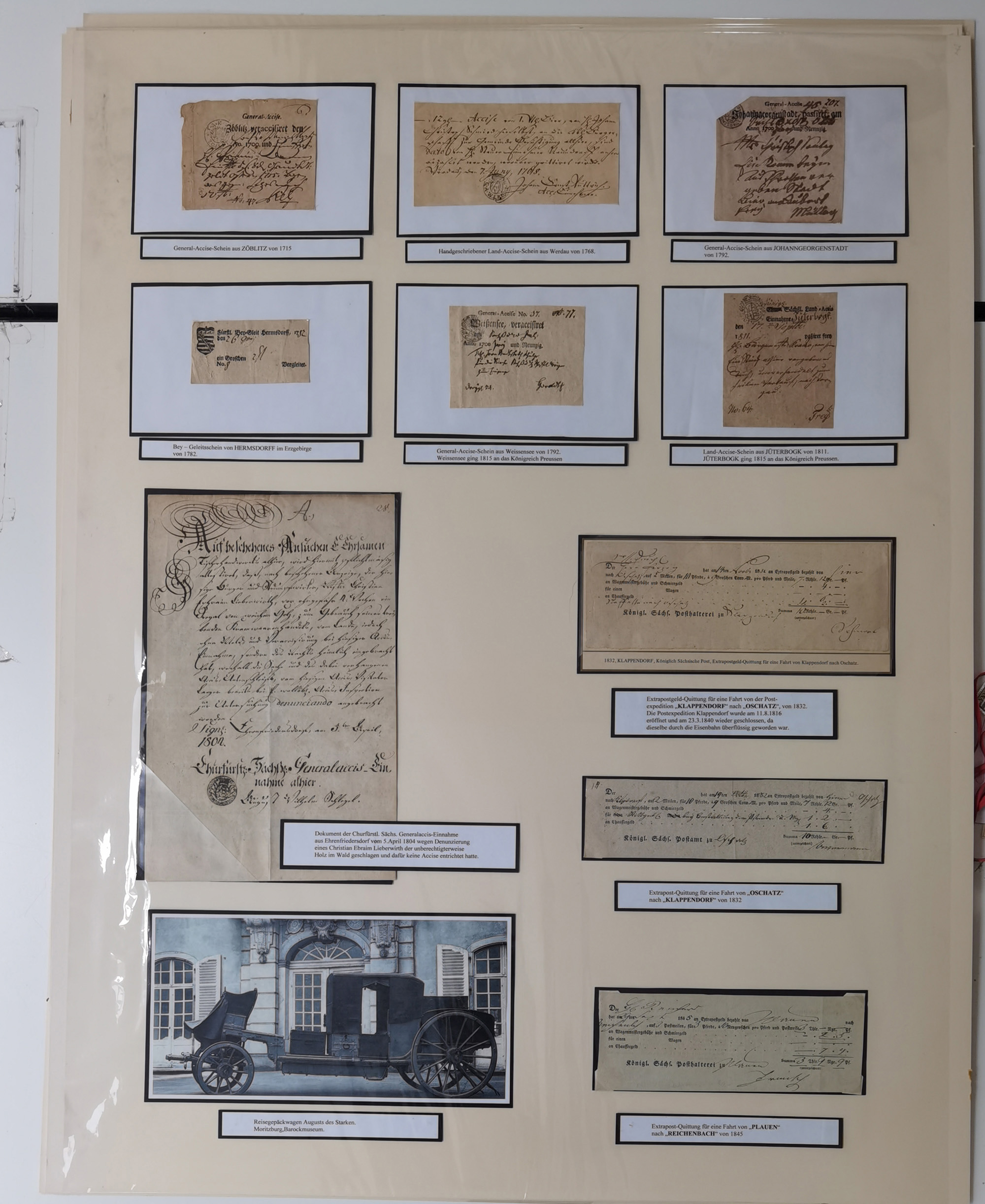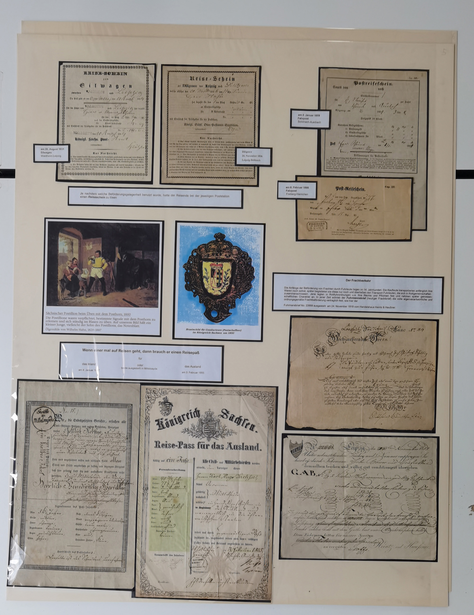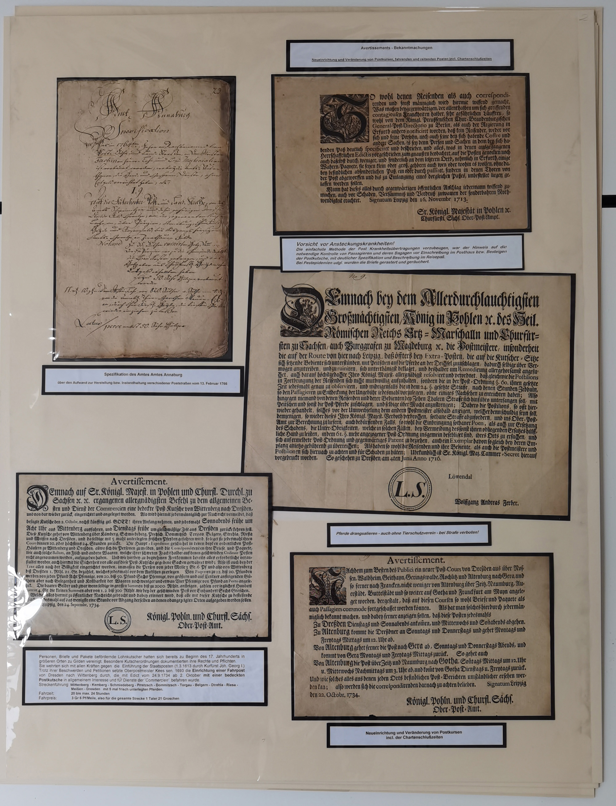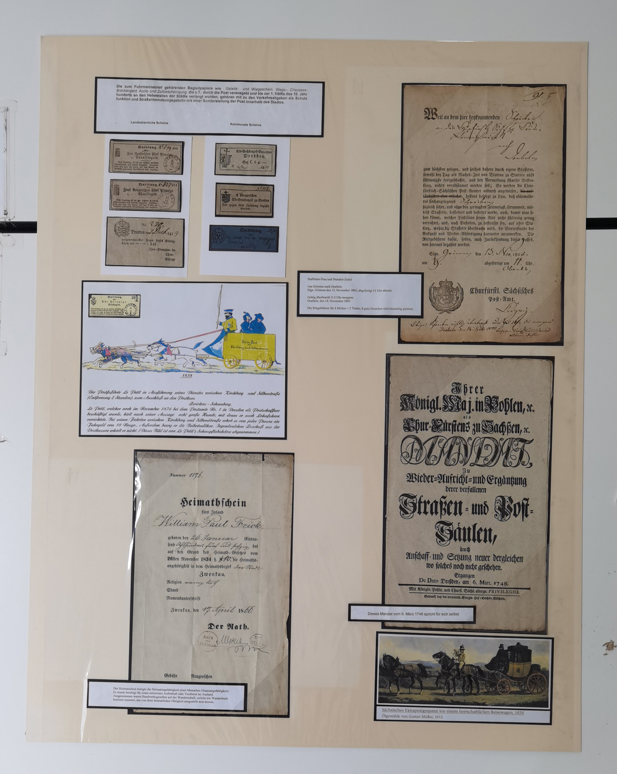1638/1868, Ausstellungssammlung 'Vom Geleitsweg zur Poststraße', zu historischen Poststraßen in Sachsen, aufgezogen auf 7 großen Tafeln (ca. 1x 1 m), dabei Mandate und Dekrete, Staffetten-Pass von 1805, Reise- und Eilwagenscheine, Reisepass, Accise-Scheine, Extrapost-Quittungen, etc. Ein postgeschichtlich hochinteressantes Objekt.