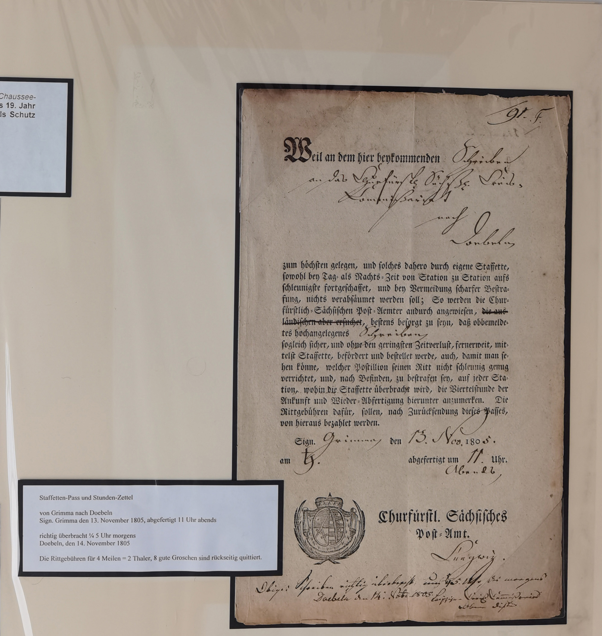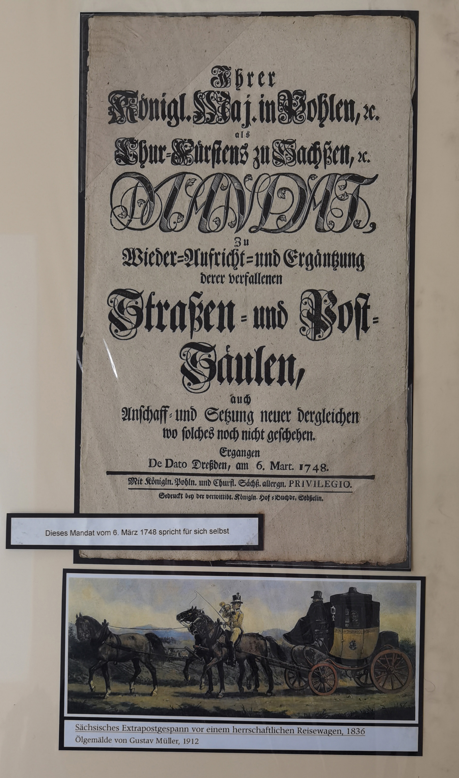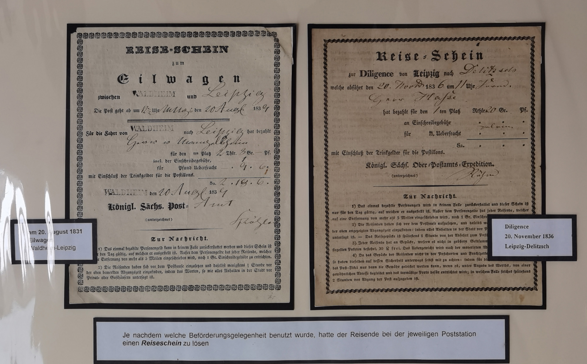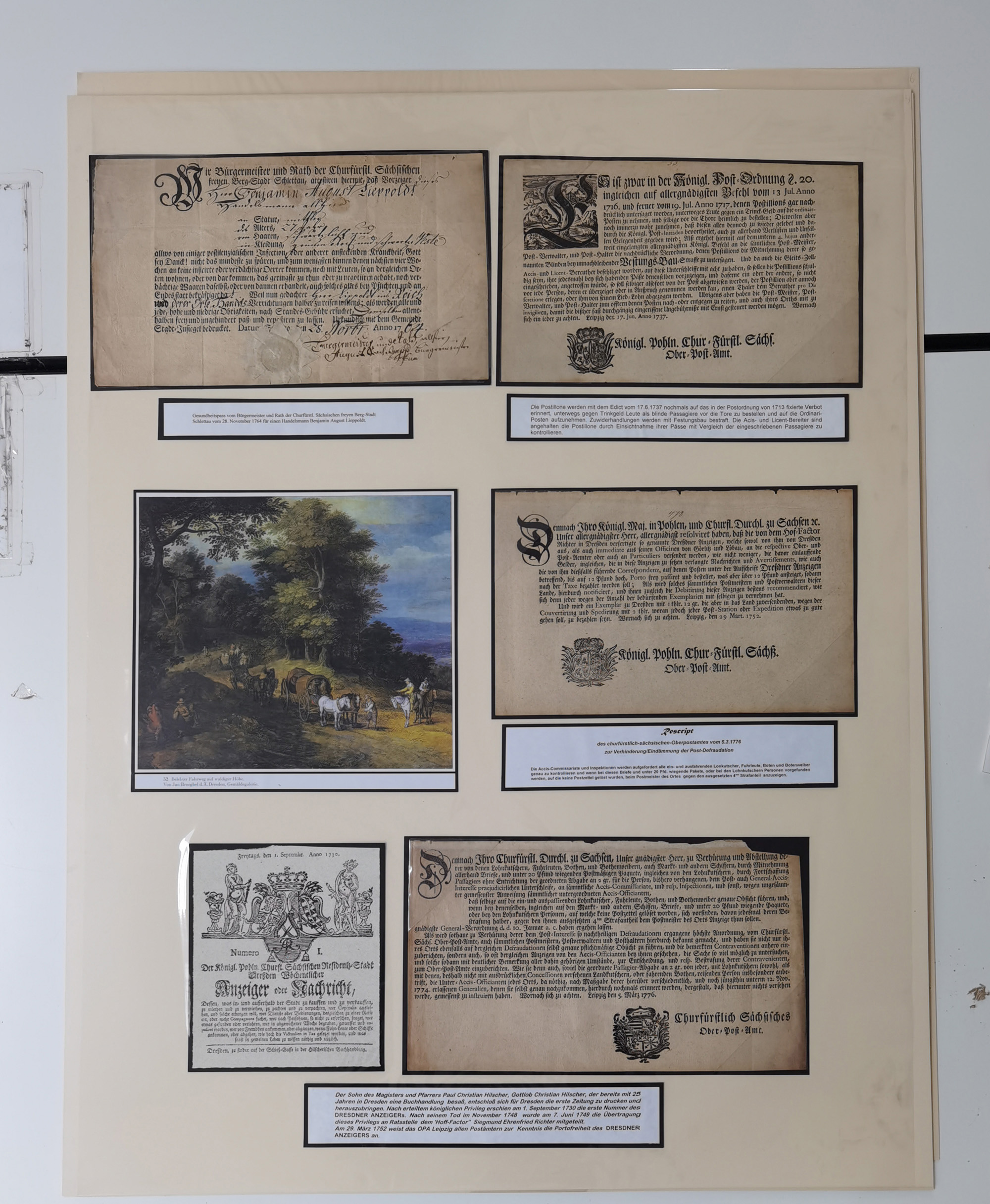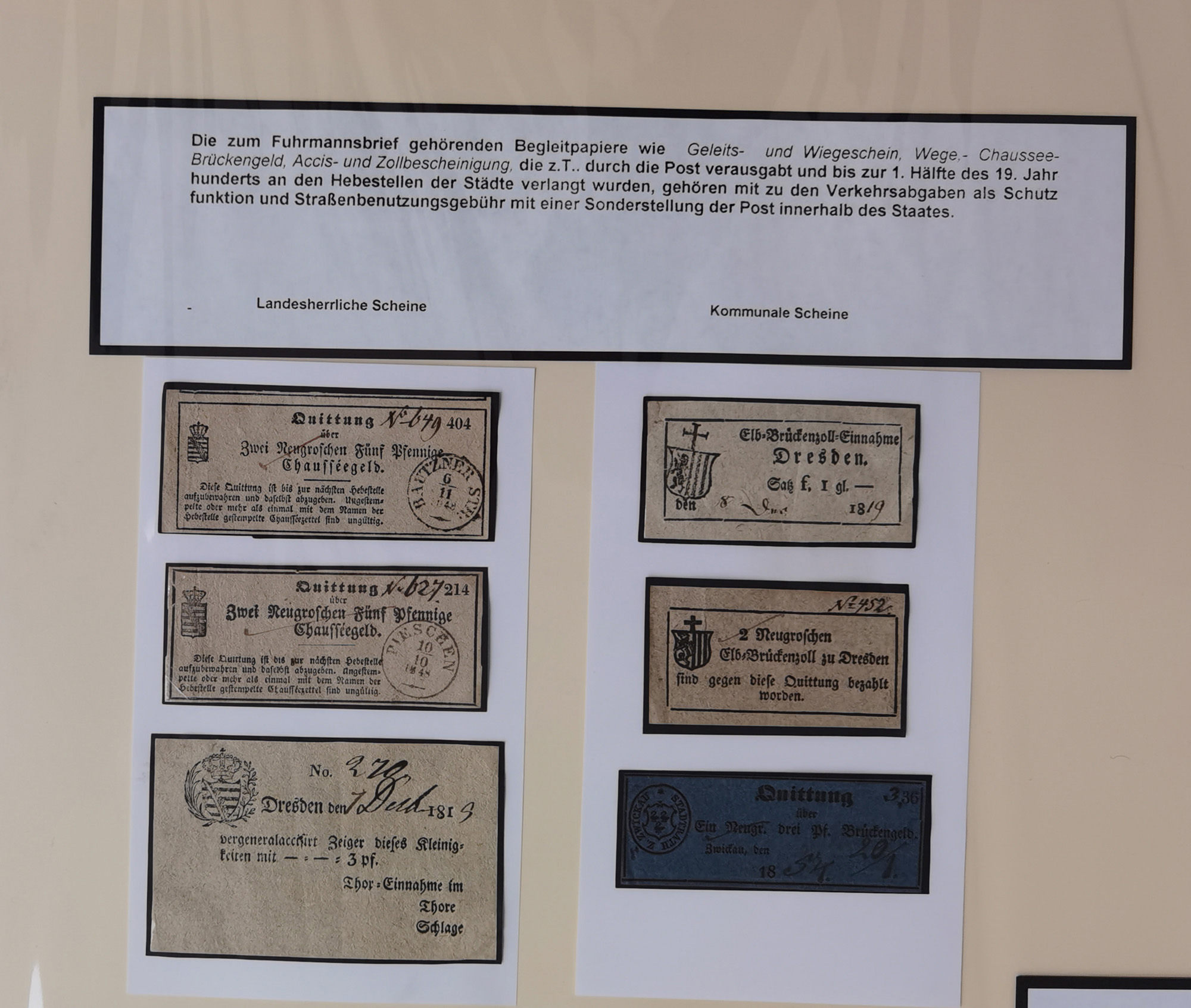 1638/1868, Ausstellungssammlung 'Vom Geleitsweg zur Poststraße', zu historischen Poststraßen in Sachsen, aufgezogen auf 7 großen Tafeln (ca. 1x 1 m), dabei Mandate und Dekrete, Staffetten-Pass von 1805, Reise- und Eilwagenscheine, Reisepass, Accise-Scheine, Extrapost-Quittungen, etc. Ein postgeschichtlich hochinteressantes Objekt.