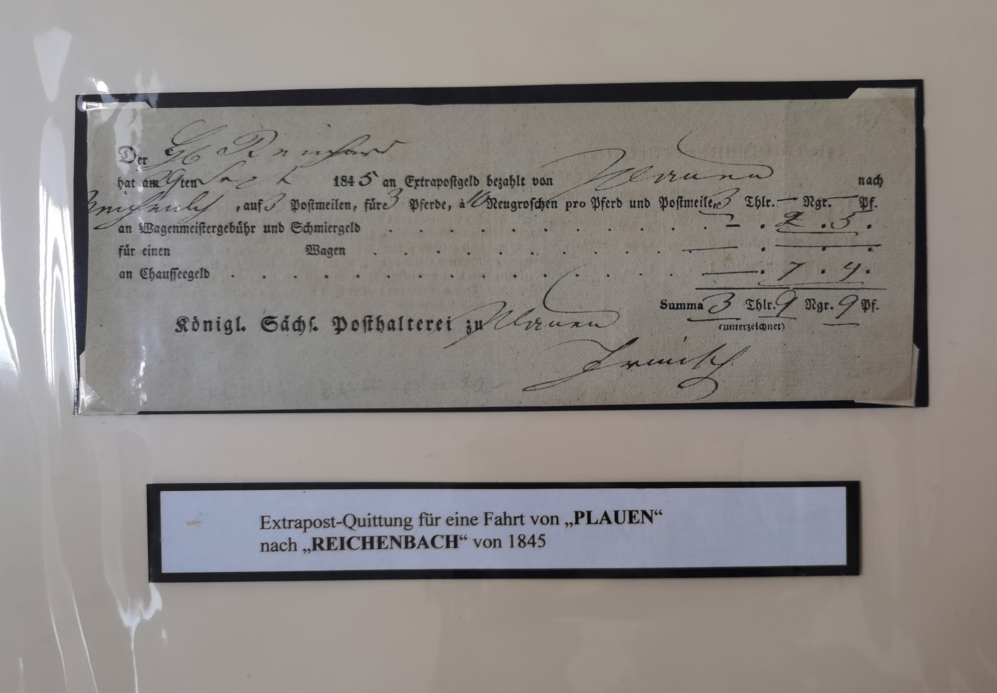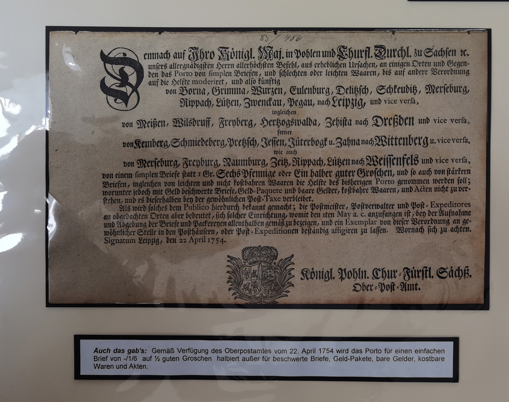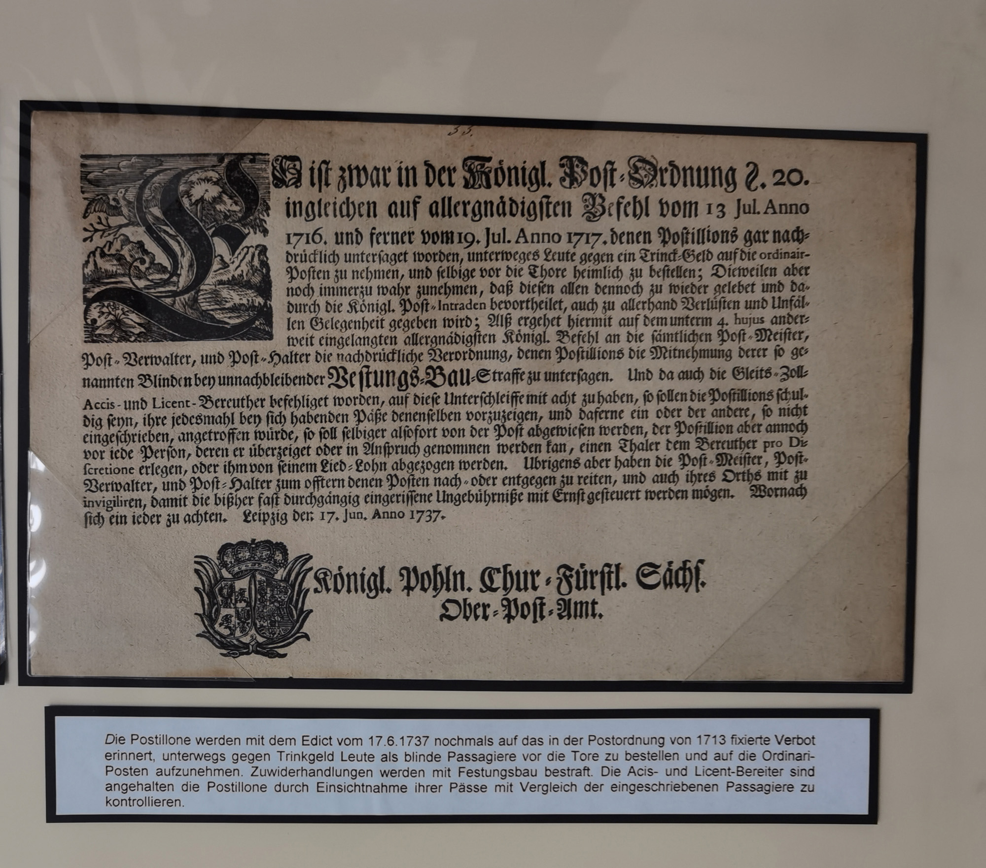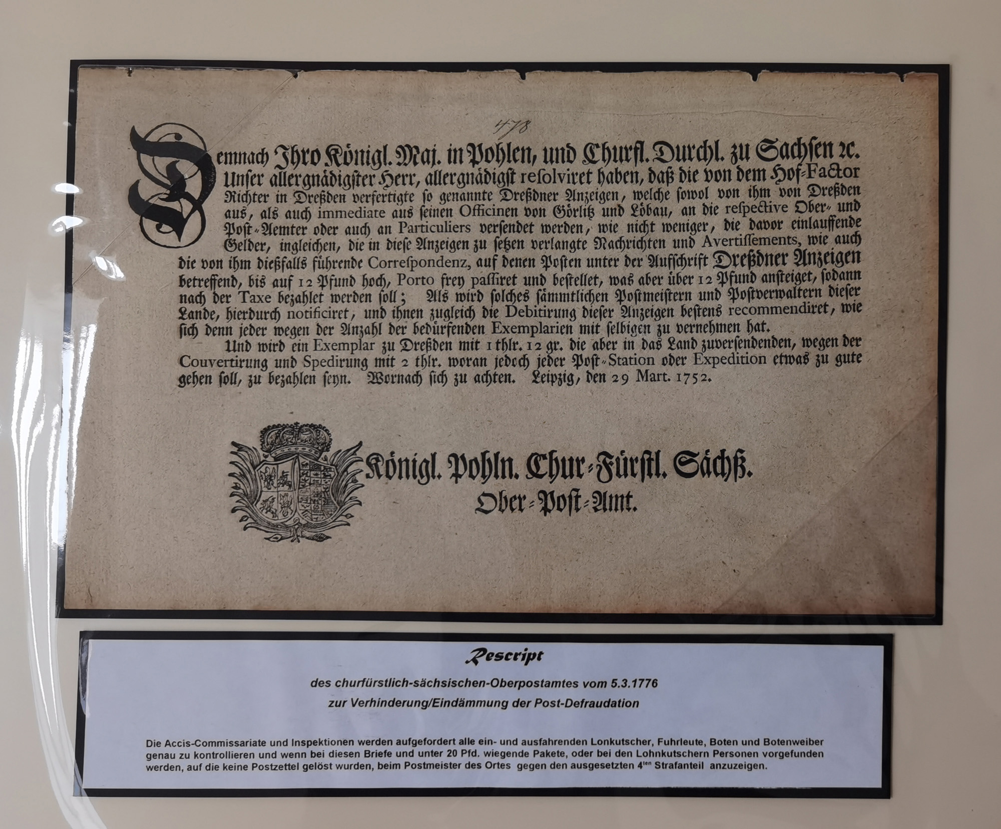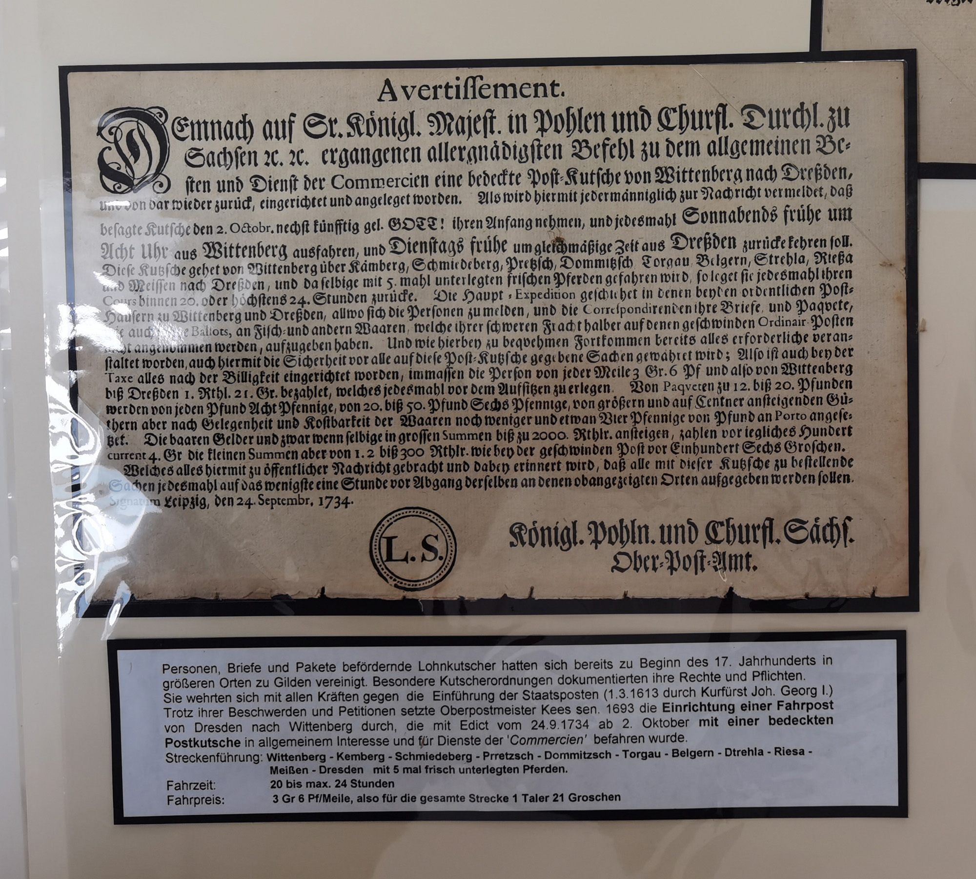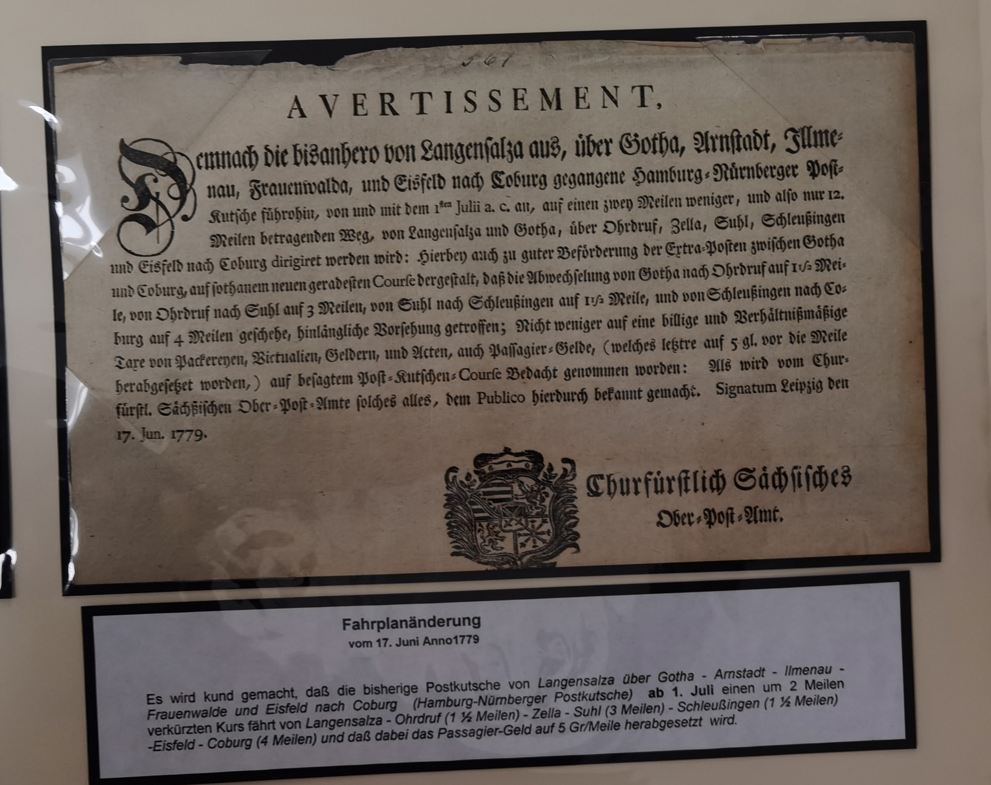 1638/1868, Ausstellungssammlung 'Vom Geleitsweg zur Poststraße', zu historischen Poststraßen in Sachsen, aufgezogen auf 7 großen Tafeln (ca. 1x 1 m), dabei Mandate und Dekrete, Staffetten-Pass von 1805, Reise- und Eilwagenscheine, Reisepass, Accise-Scheine, Extrapost-Quittungen, etc. Ein postgeschichtlich hochinteressantes Objekt.