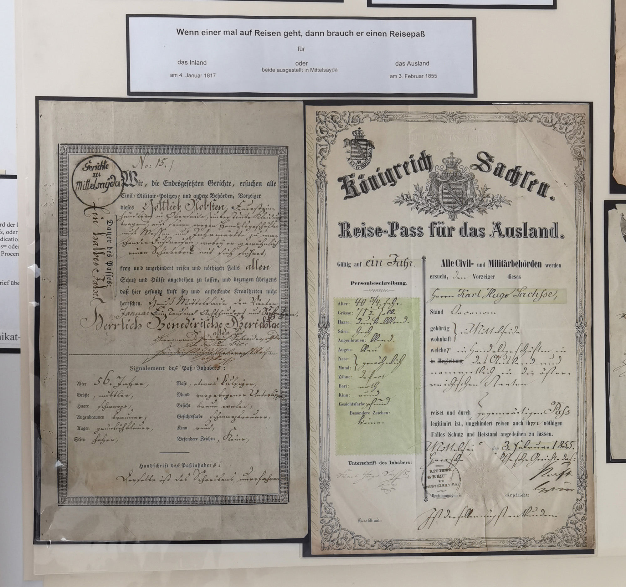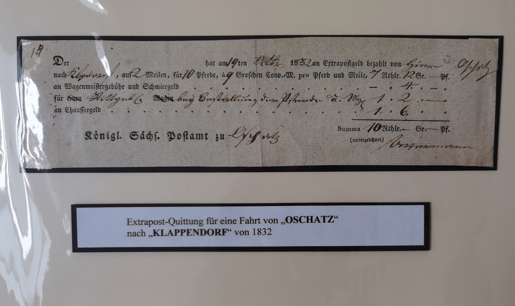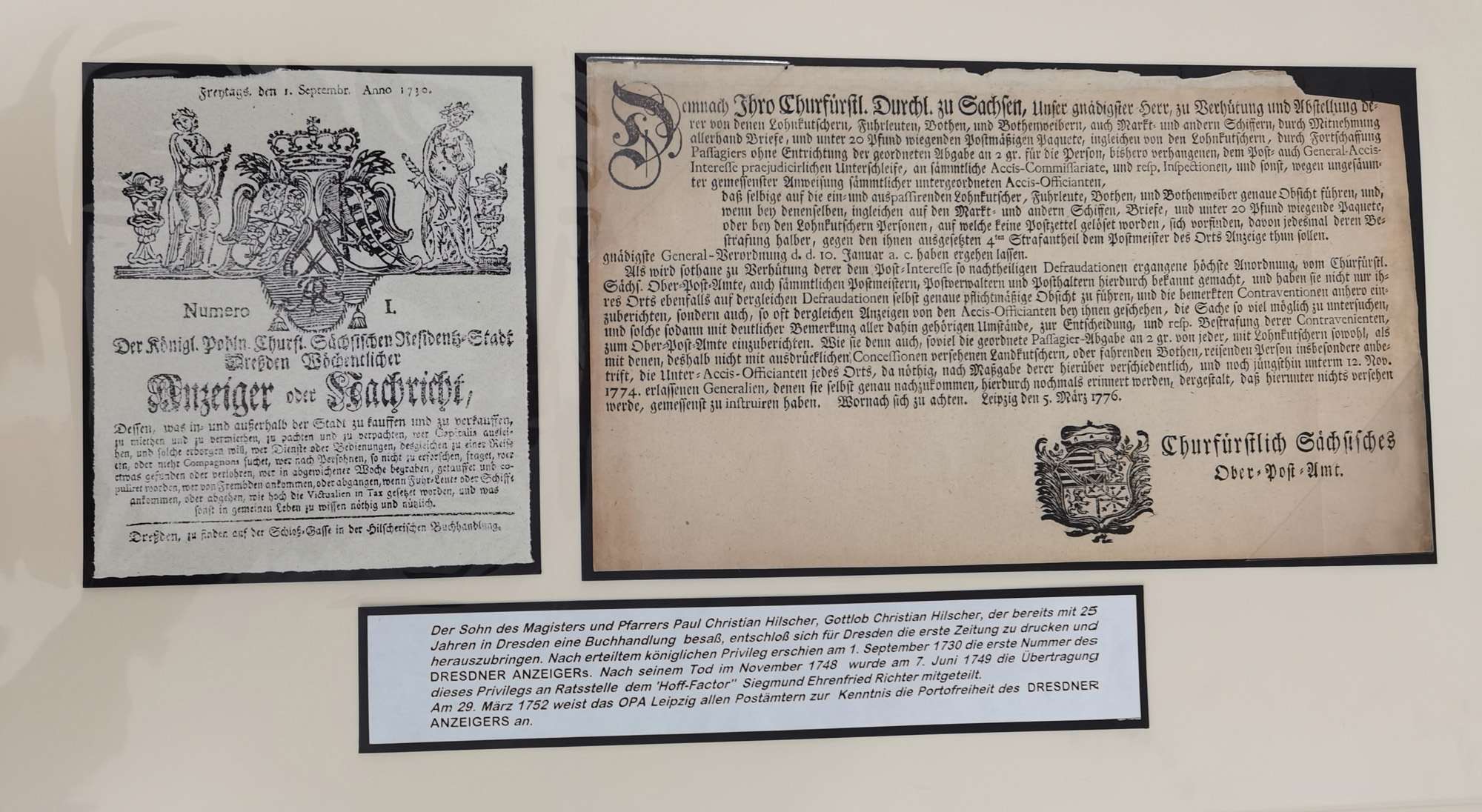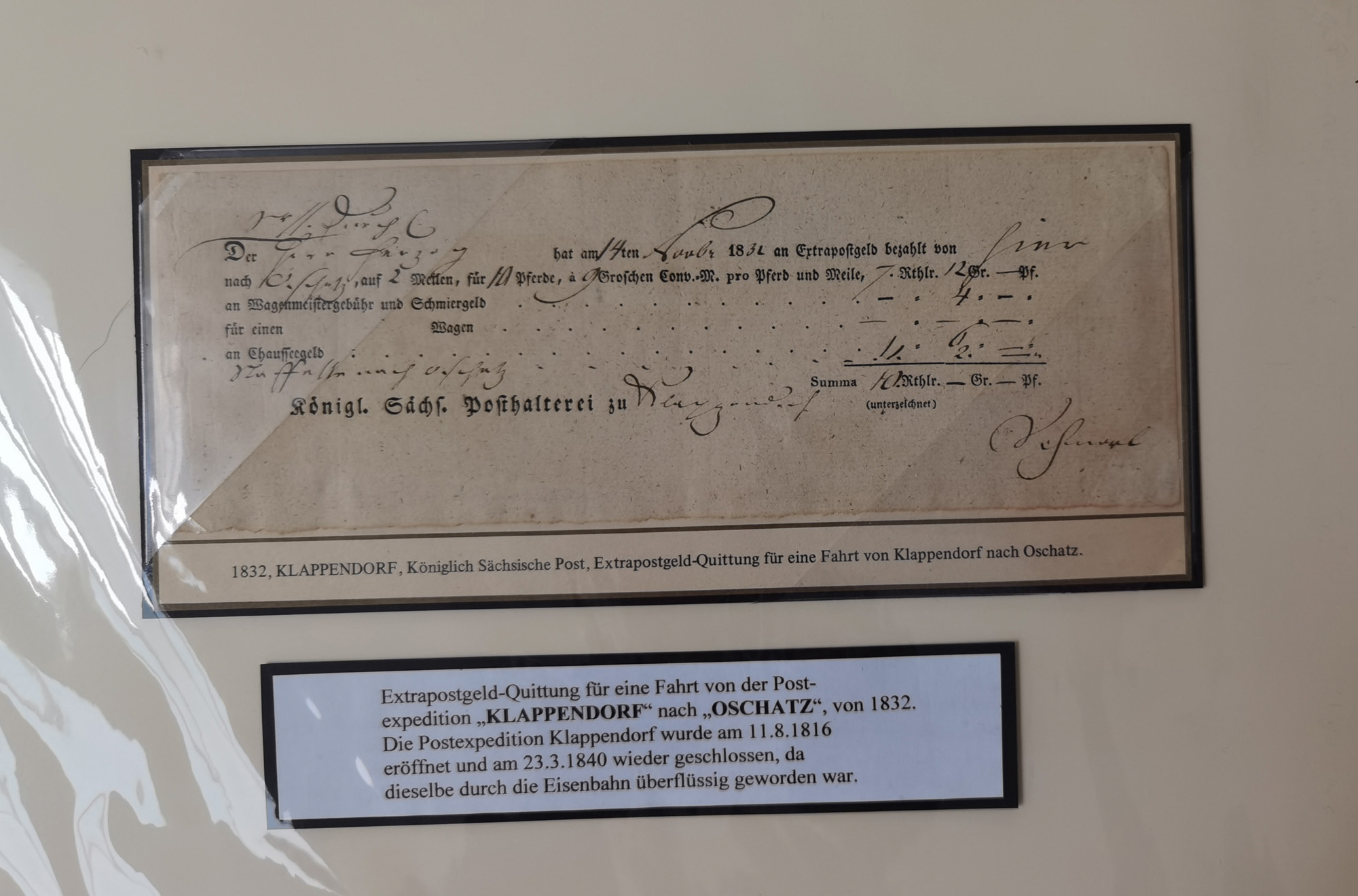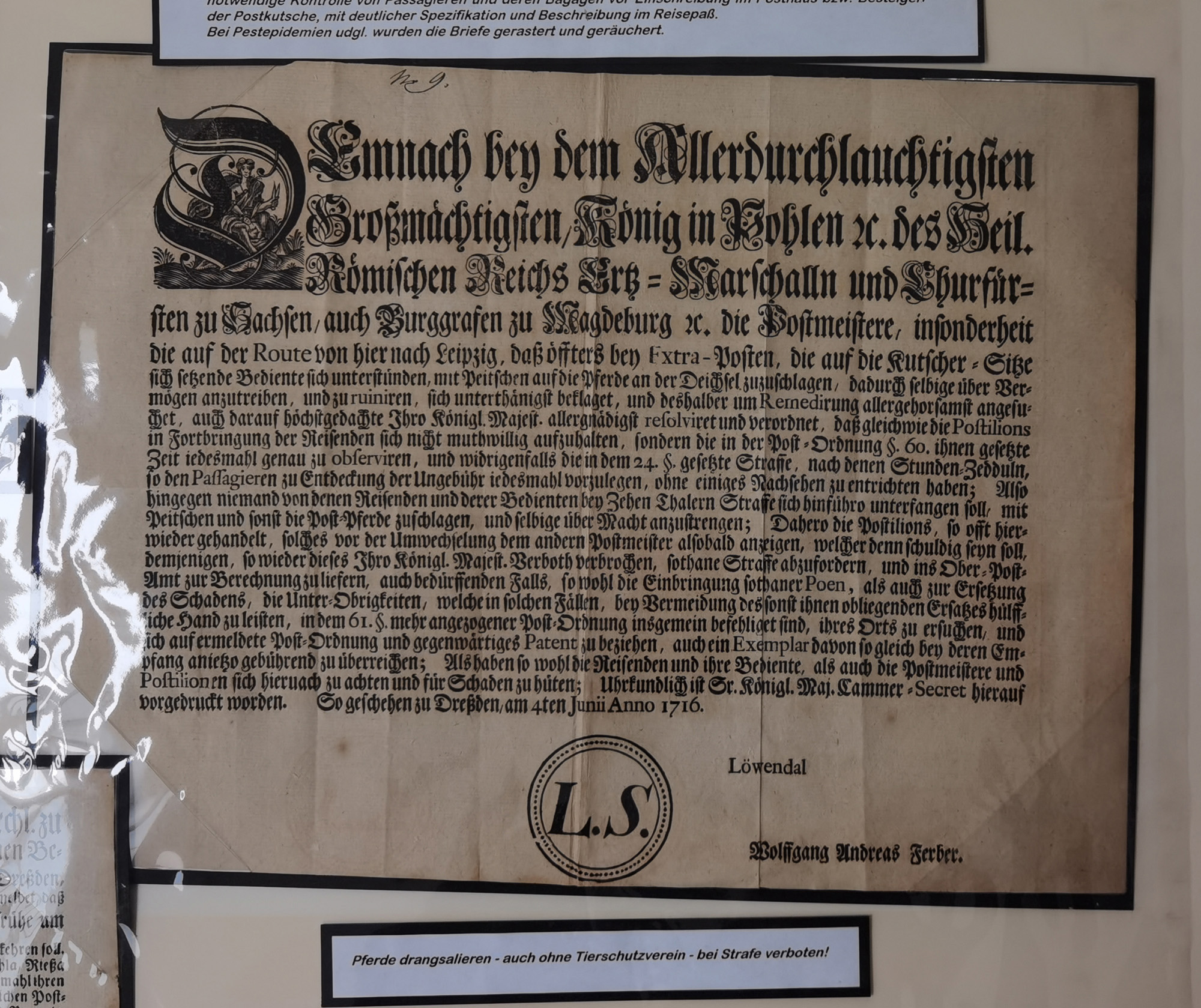 1638/1868, Ausstellungssammlung 'Vom Geleitsweg zur Poststraße', zu historischen Poststraßen in Sachsen, aufgezogen auf 7 großen Tafeln (ca. 1x 1 m), dabei Mandate und Dekrete, Staffetten-Pass von 1805, Reise- und Eilwagenscheine, Reisepass, Accise-Scheine, Extrapost-Quittungen, etc. Ein postgeschichtlich hochinteressantes Objekt.