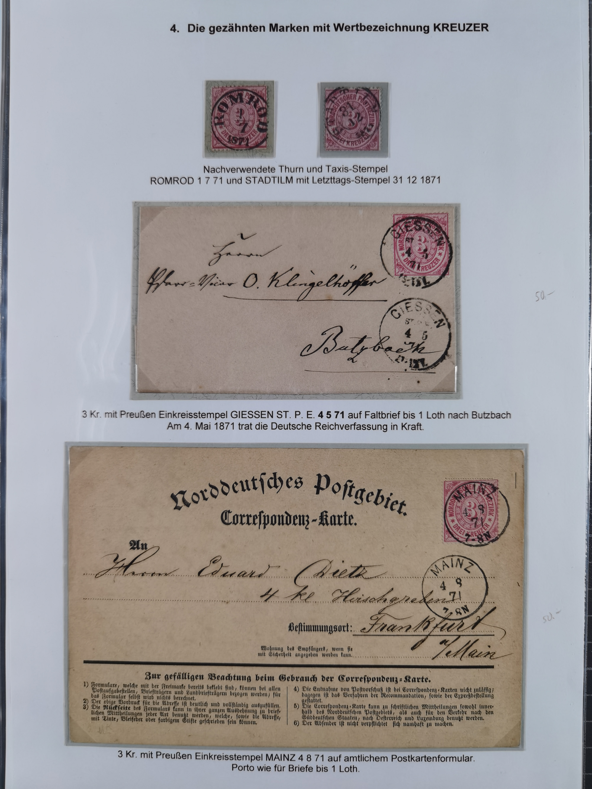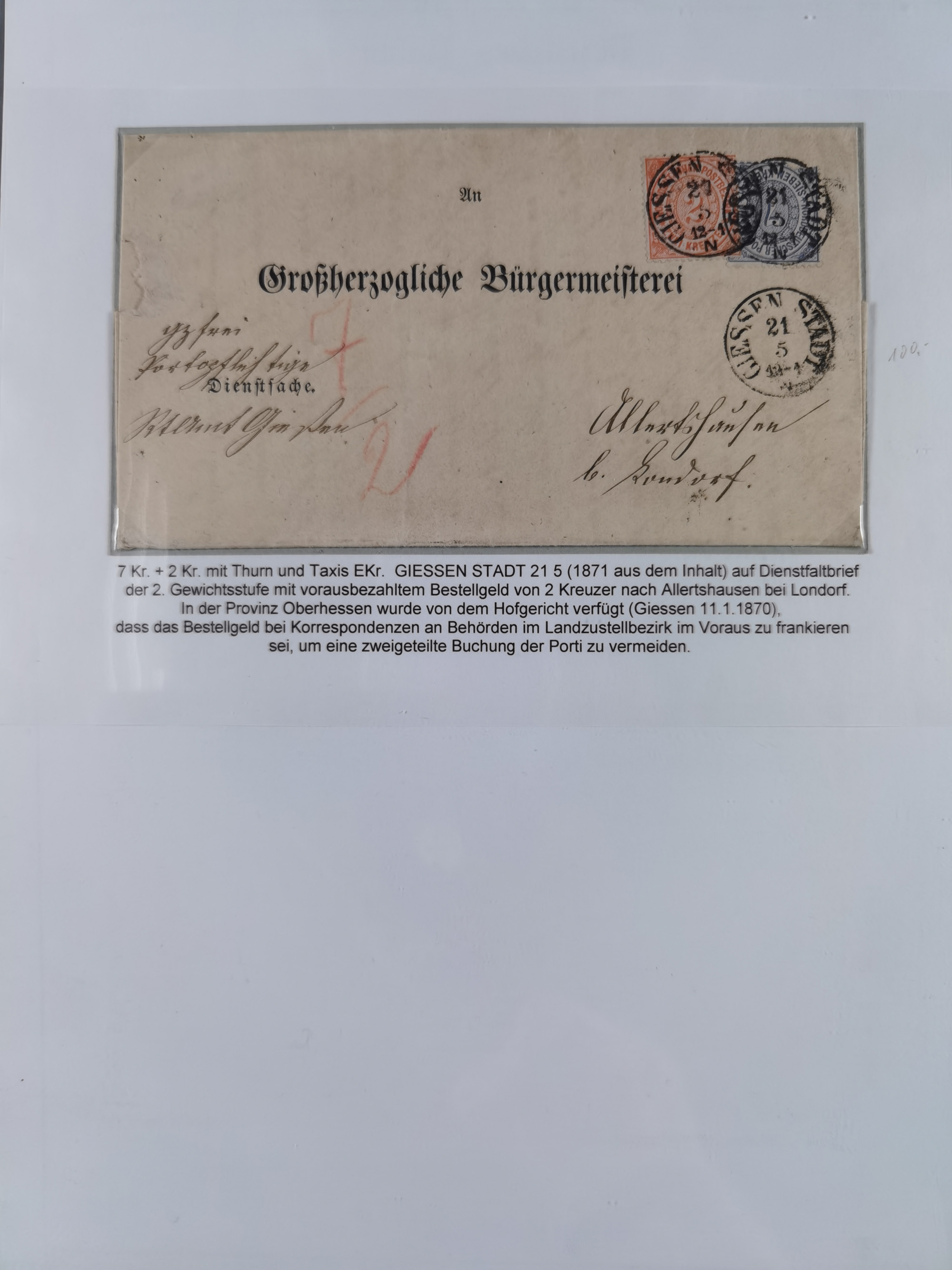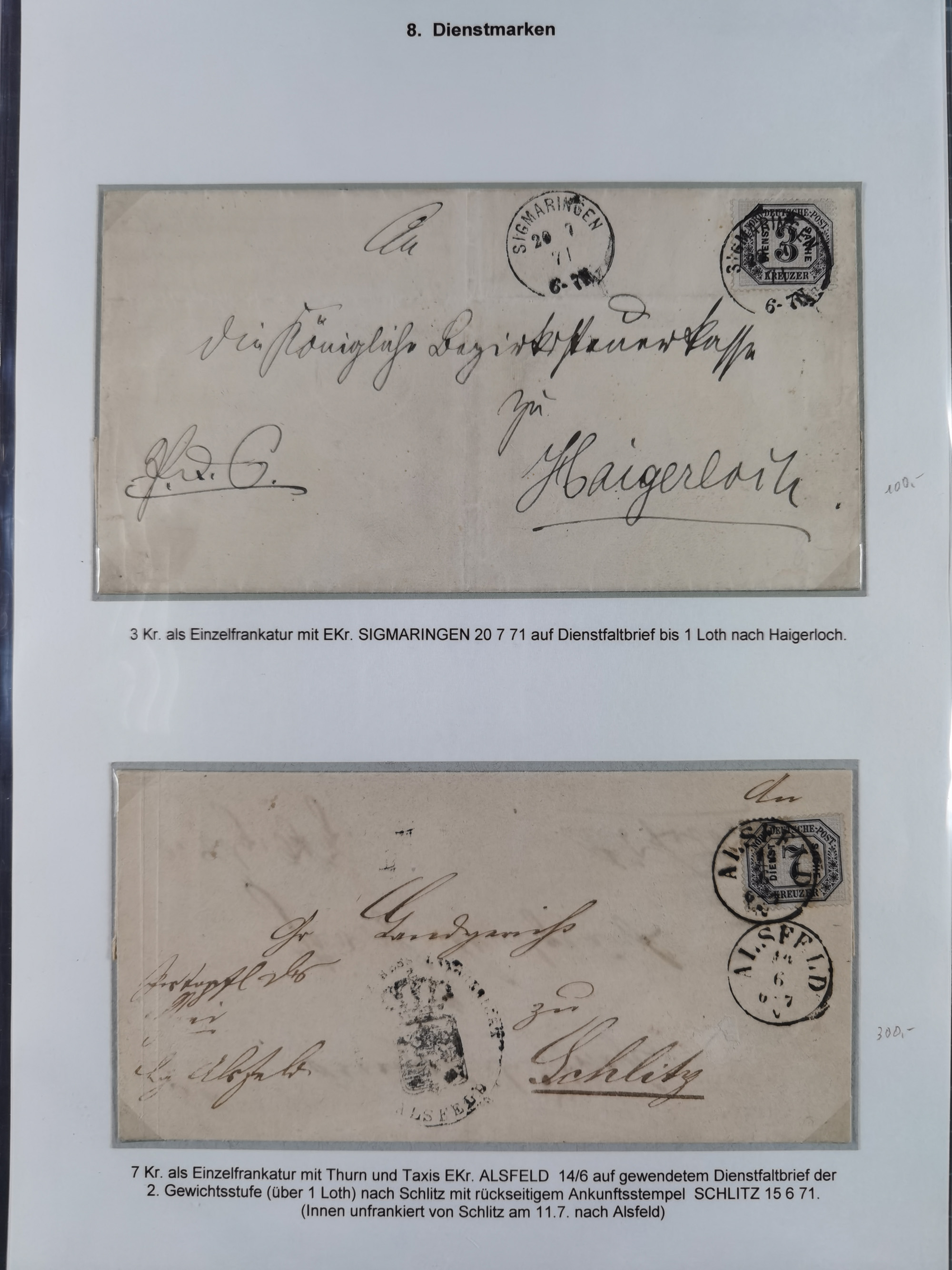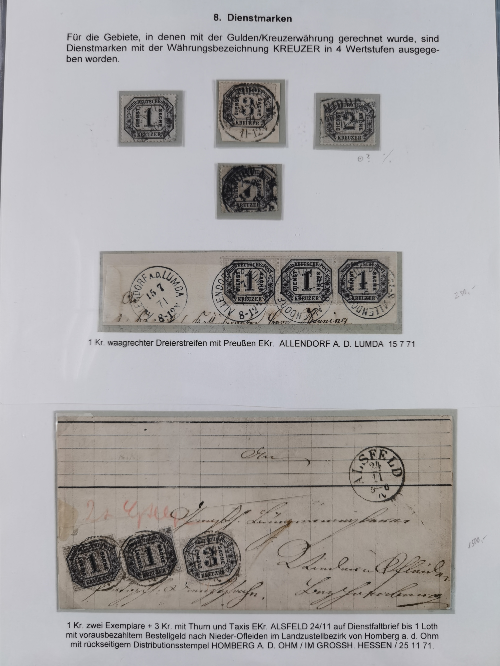 1871, DIENSTMARKEN-REICHSPOST-VORLÄUFER, ausstellungsmäßig aufgezogene kleine Spezialsammlung mit insgesamt 18 Belegen sowie einigen losen Marken und Briefstücken, dabei Mehrfachfrankaturen kleiner Groschenwerte, 2 Mischfrankaturen mit Freimarken, 1 Kr. im 3er-Streifen sowie 3 Briefe mit Kreuzer-Frankaturen, dabei 1 + 1+ 3 Kr.