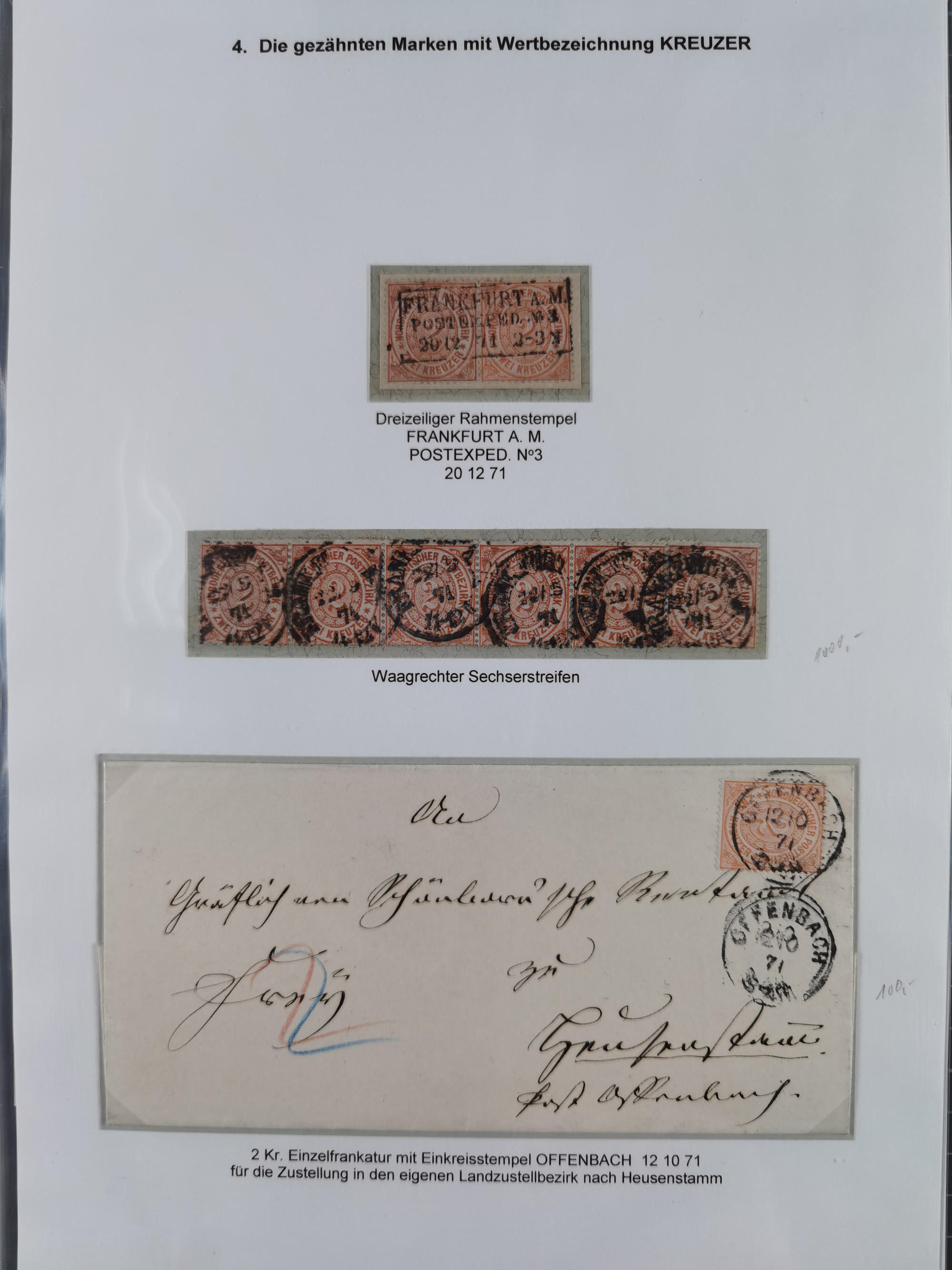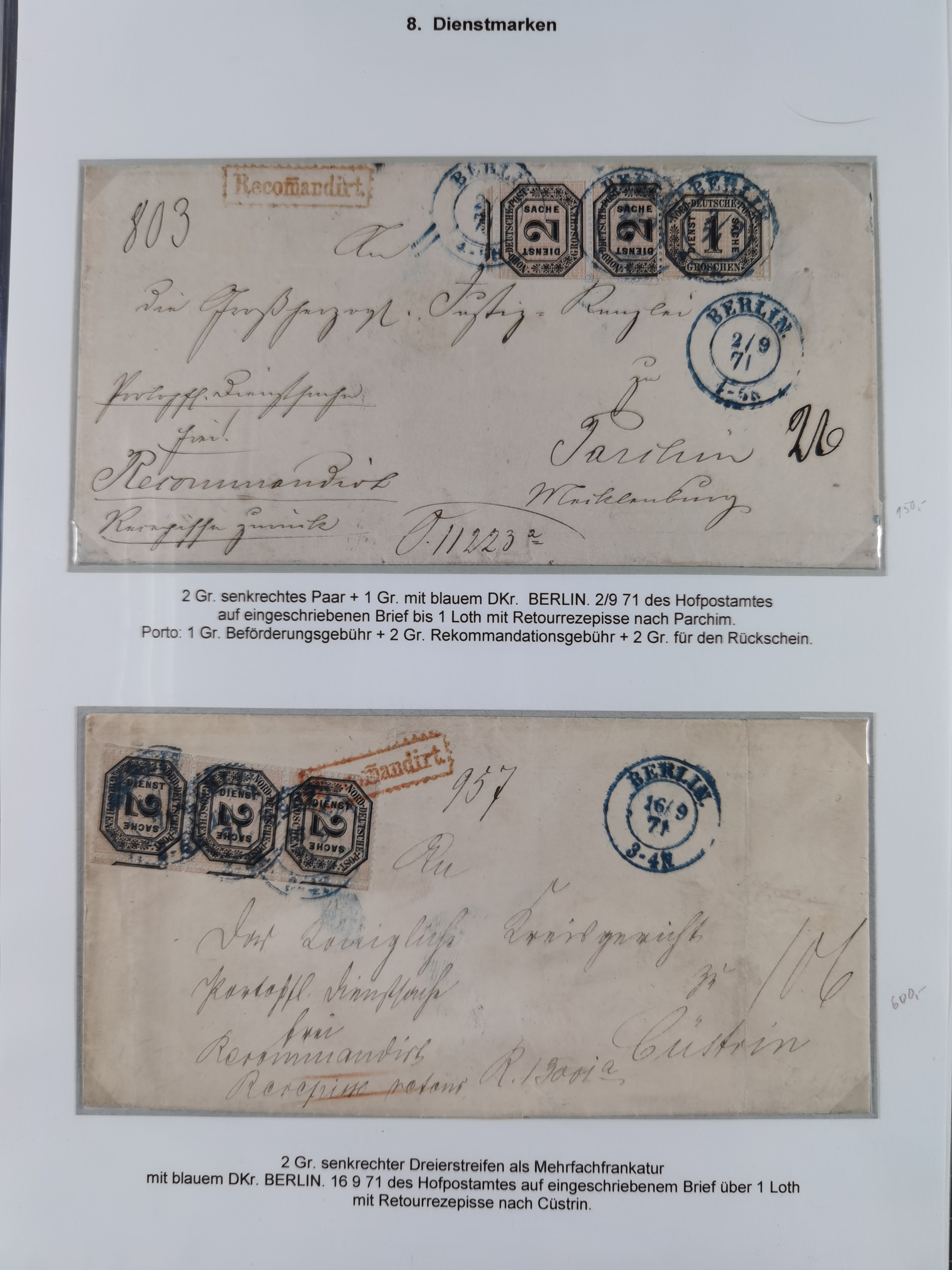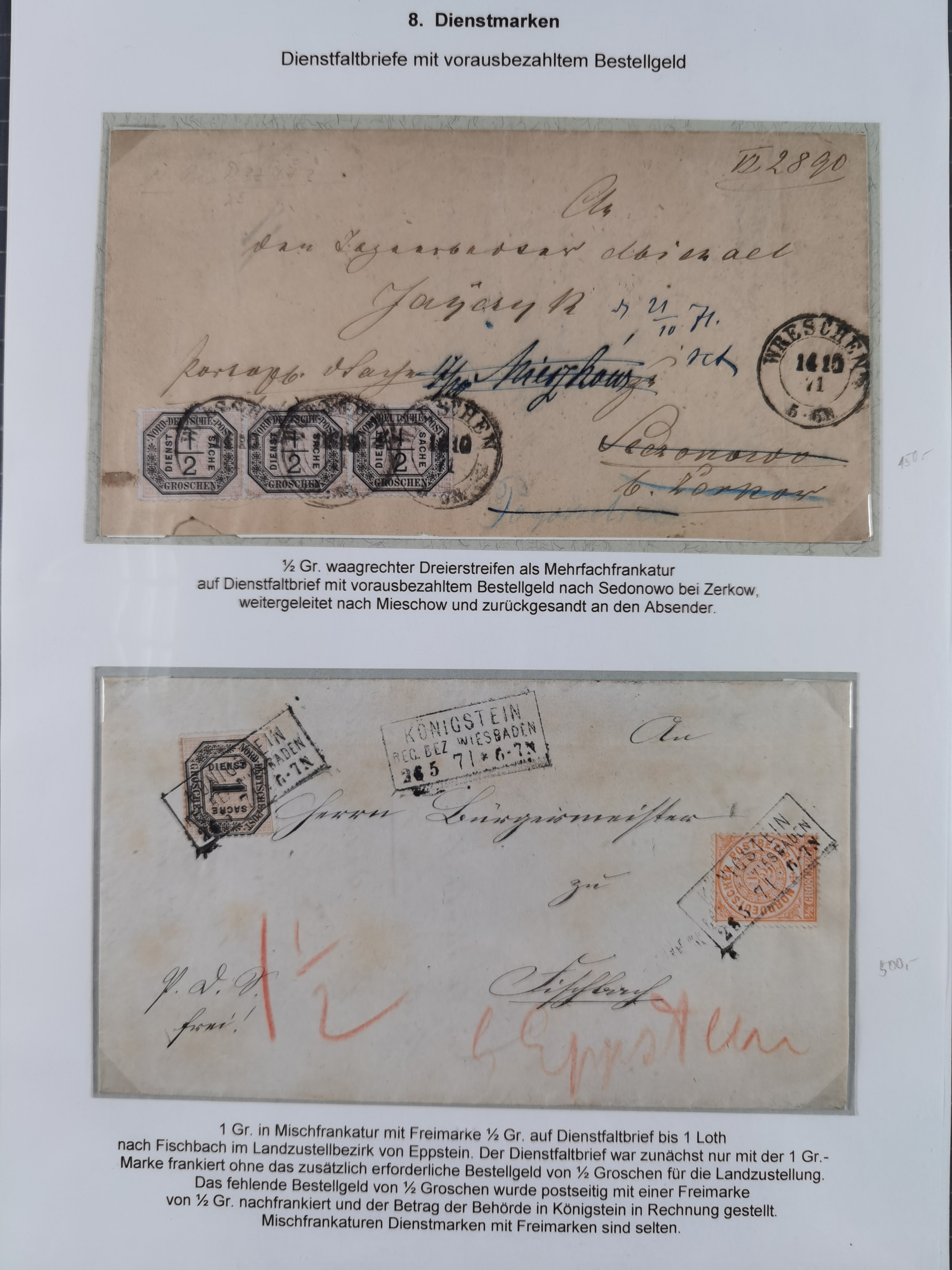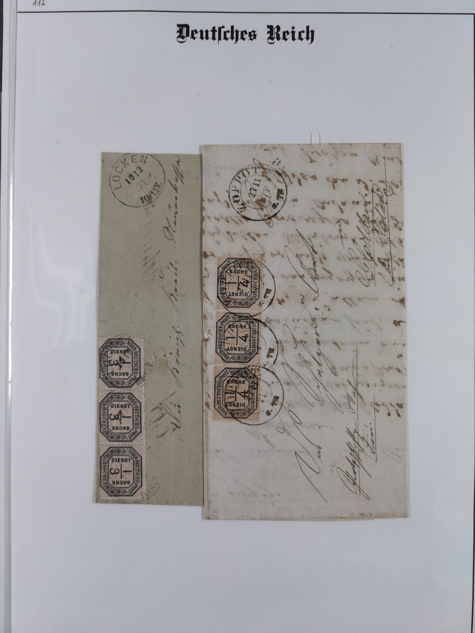 1871, DIENSTMARKEN-REICHSPOST-VORLÄUFER, ausstellungsmäßig aufgezogene kleine Spezialsammlung mit insgesamt 18 Belegen sowie einigen losen Marken und Briefstücken, dabei Mehrfachfrankaturen kleiner Groschenwerte, 2 Mischfrankaturen mit Freimarken, 1 Kr. im 3er-Streifen sowie 3 Briefe mit Kreuzer-Frankaturen, dabei 1 + 1+ 3 Kr.