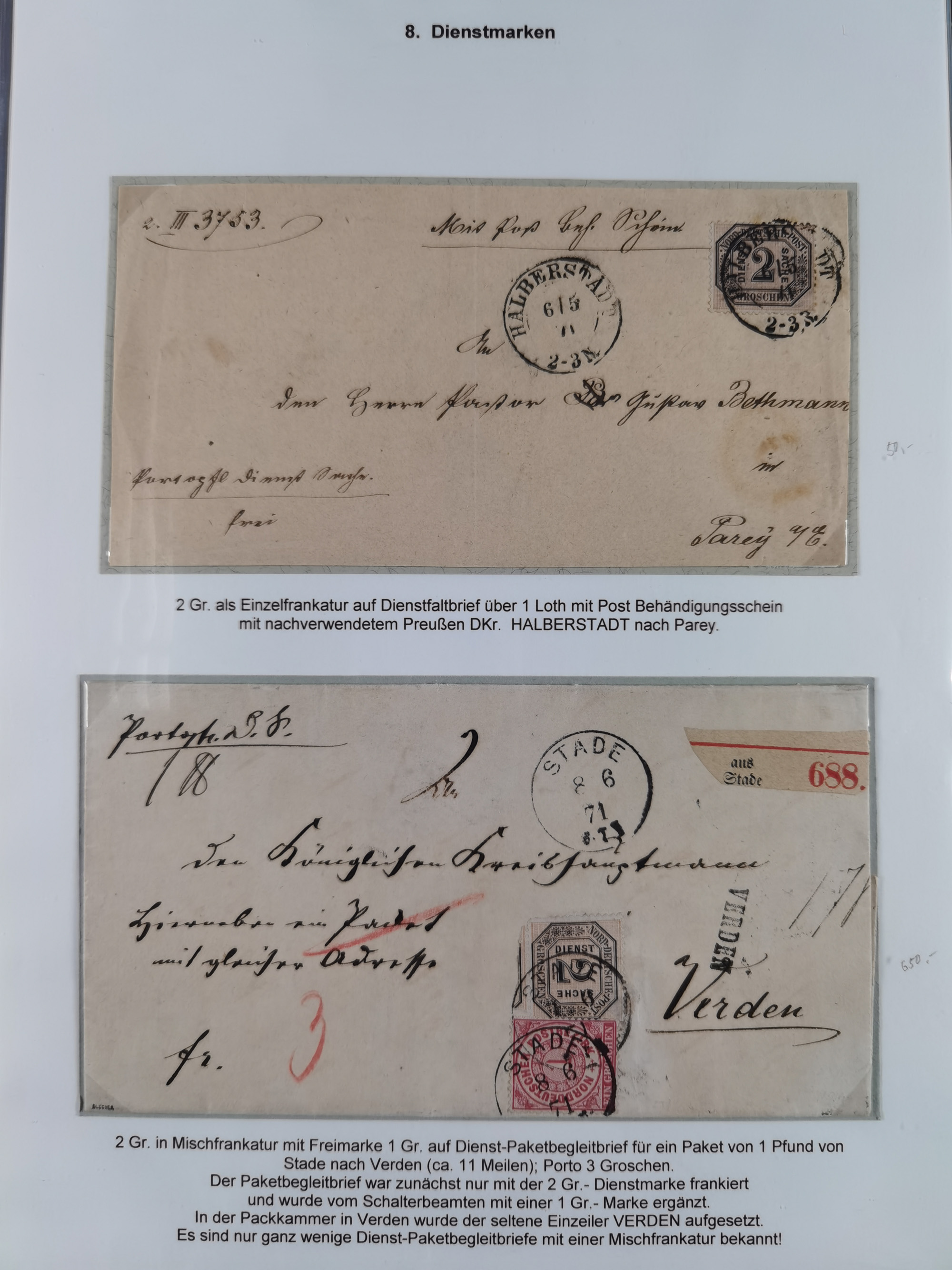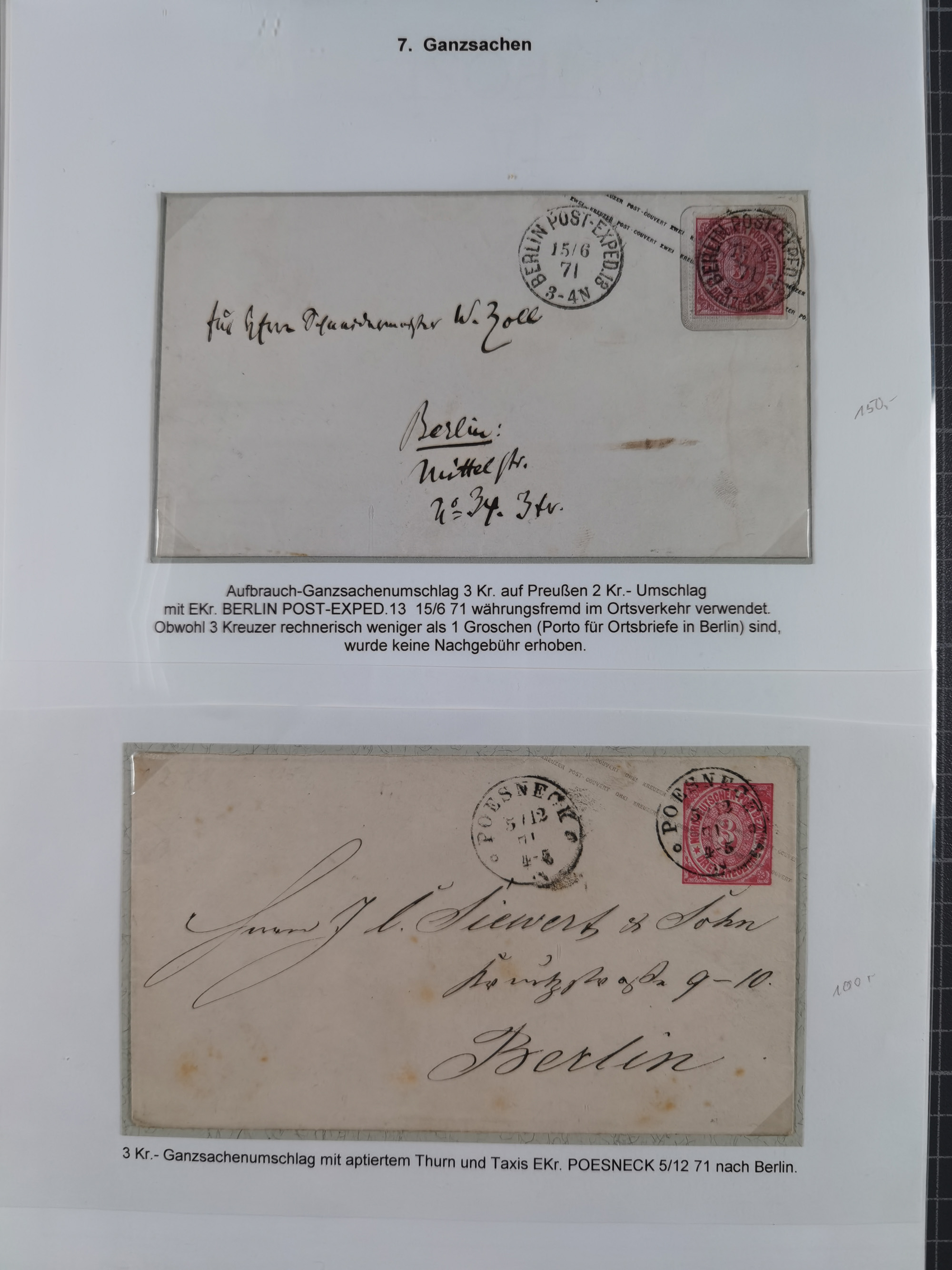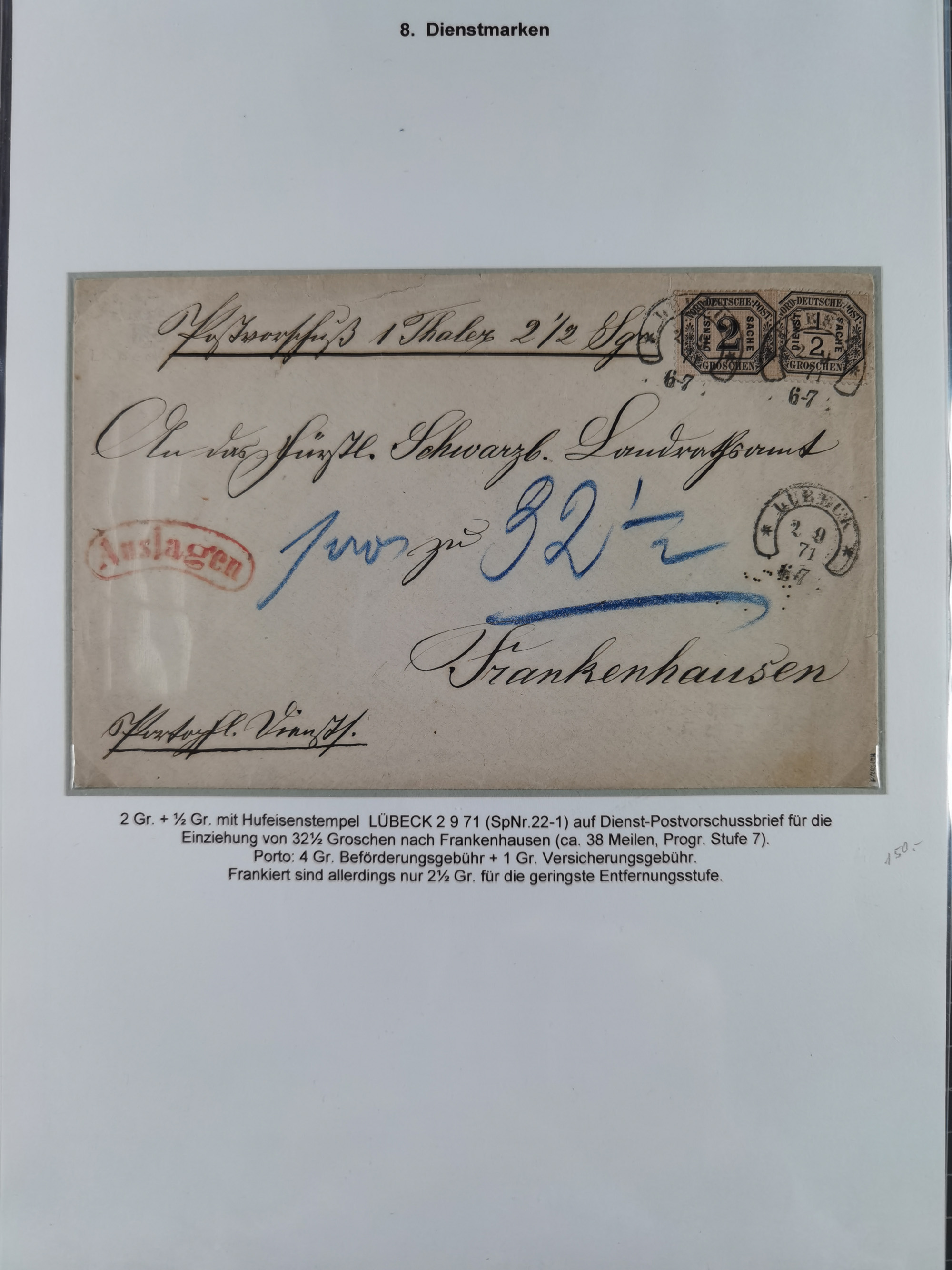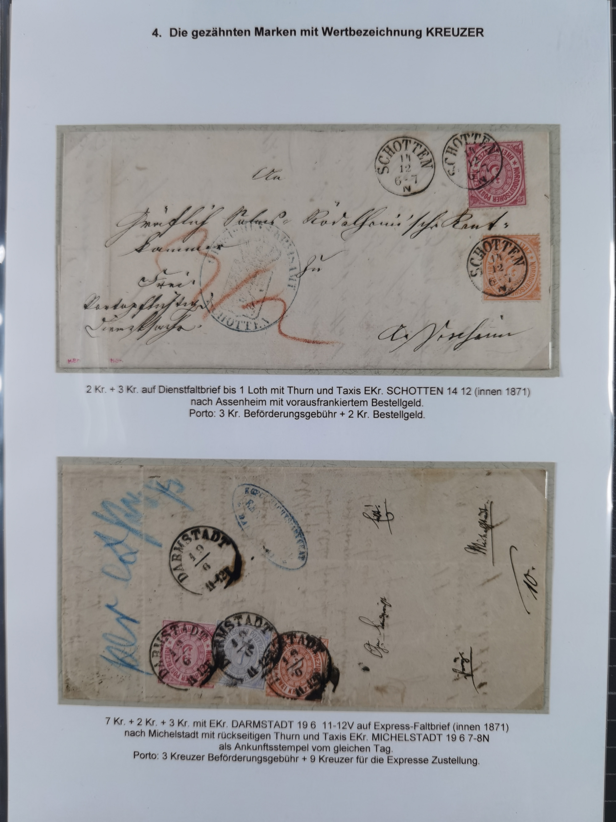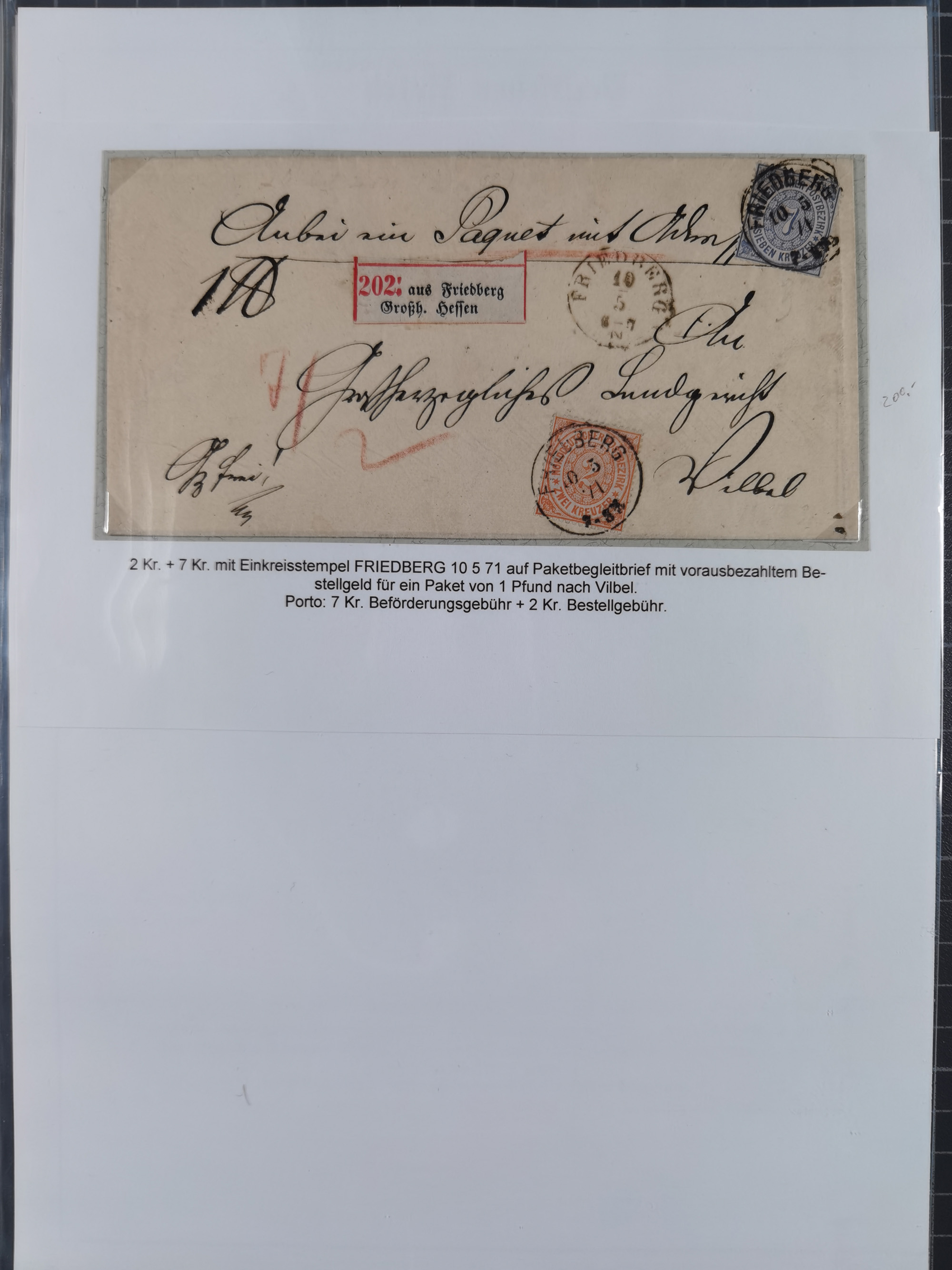 1871, DIENSTMARKEN-REICHSPOST-VORLÄUFER, ausstellungsmäßig aufgezogene kleine Spezialsammlung mit insgesamt 18 Belegen sowie einigen losen Marken und Briefstücken, dabei Mehrfachfrankaturen kleiner Groschenwerte, 2 Mischfrankaturen mit Freimarken, 1 Kr. im 3er-Streifen sowie 3 Briefe mit Kreuzer-Frankaturen, dabei 1 + 1+ 3 Kr.
