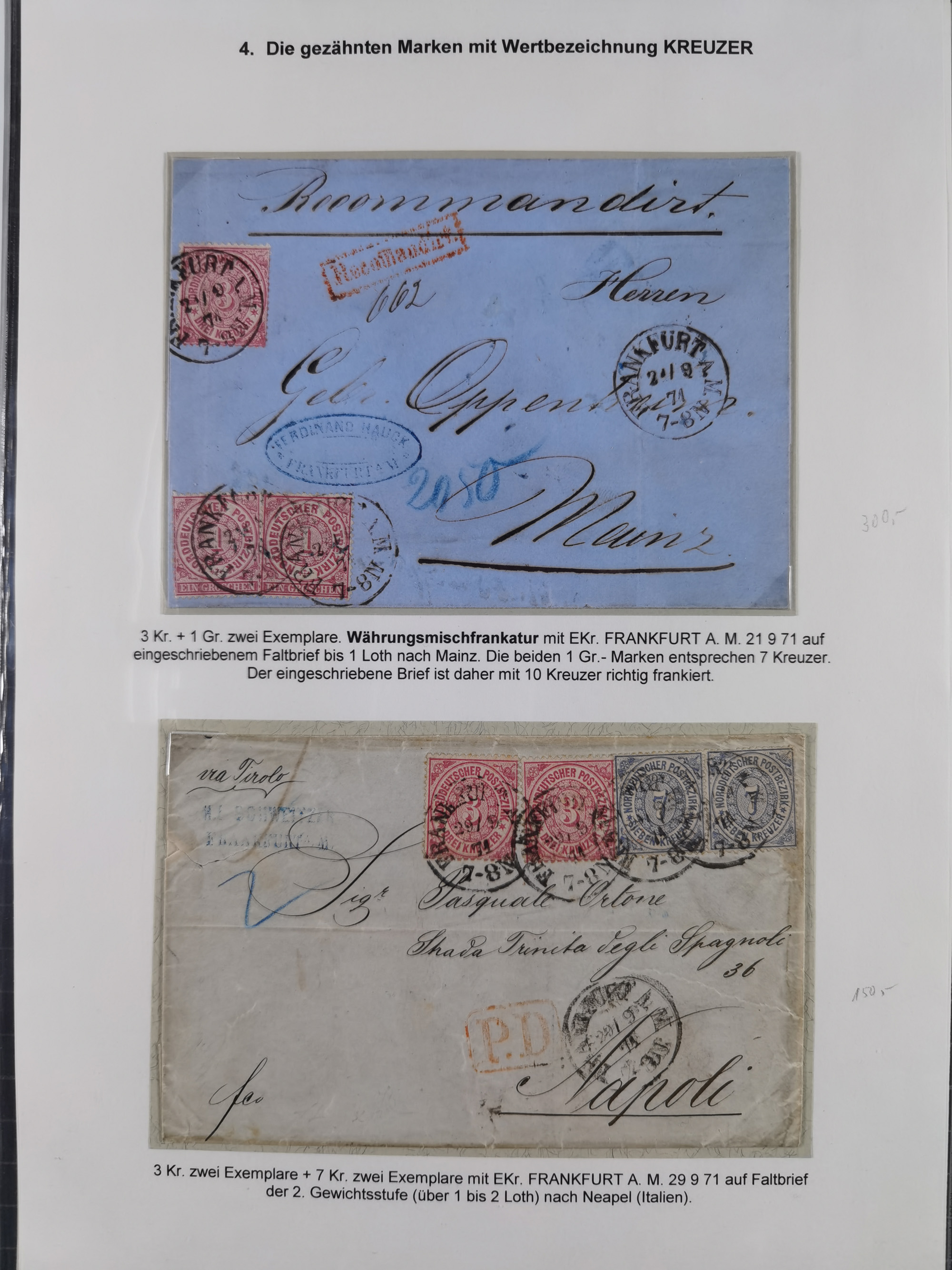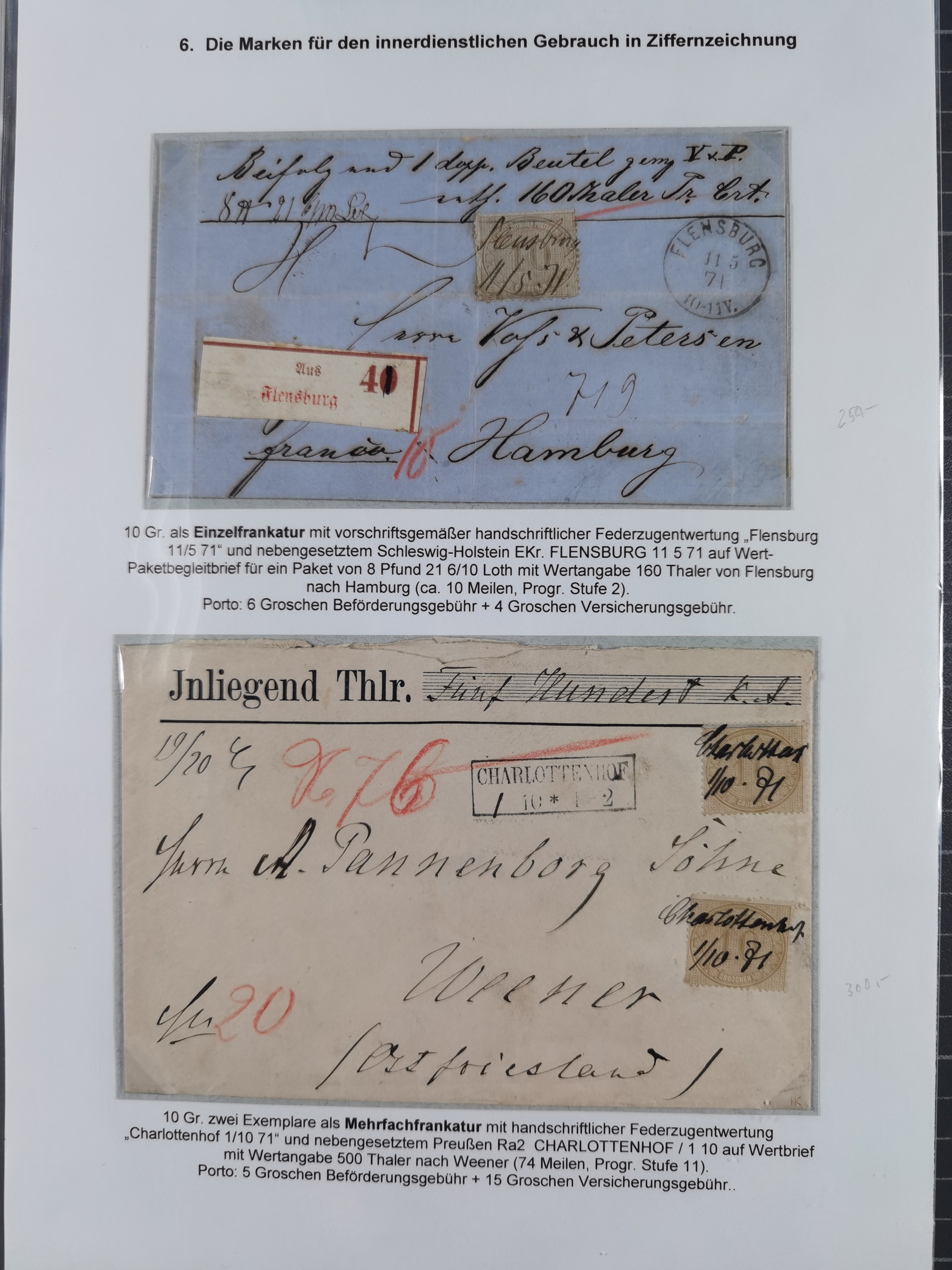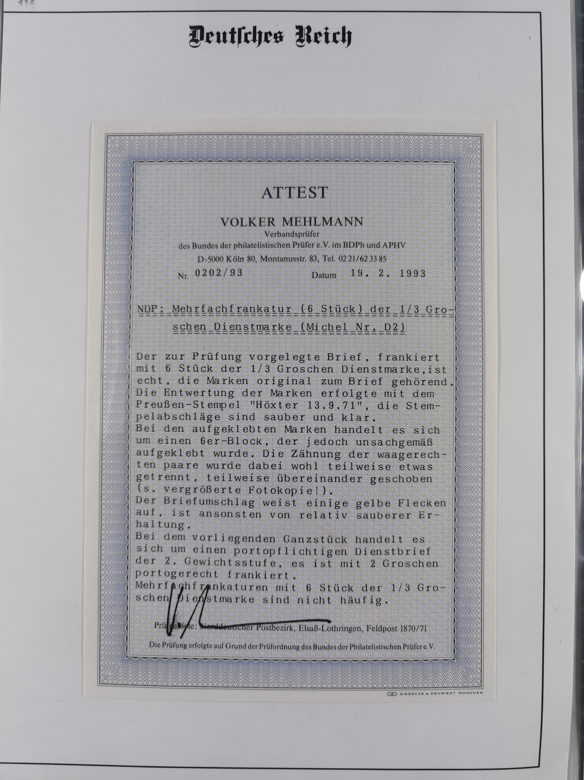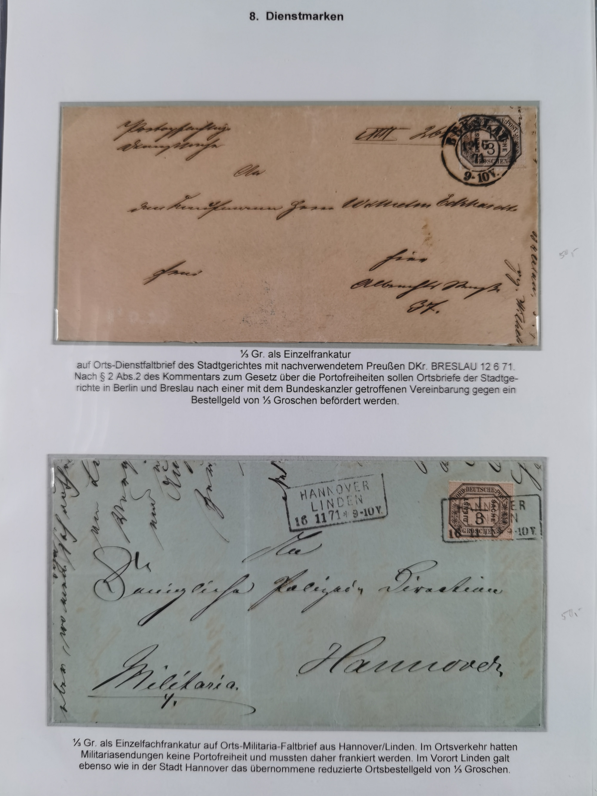 1871, DIENSTMARKEN-REICHSPOST-VORLÄUFER, ausstellungsmäßig aufgezogene kleine Spezialsammlung mit insgesamt 18 Belegen sowie einigen losen Marken und Briefstücken, dabei Mehrfachfrankaturen kleiner Groschenwerte, 2 Mischfrankaturen mit Freimarken, 1 Kr. im 3er-Streifen sowie 3 Briefe mit Kreuzer-Frankaturen, dabei 1 + 1+ 3 Kr.