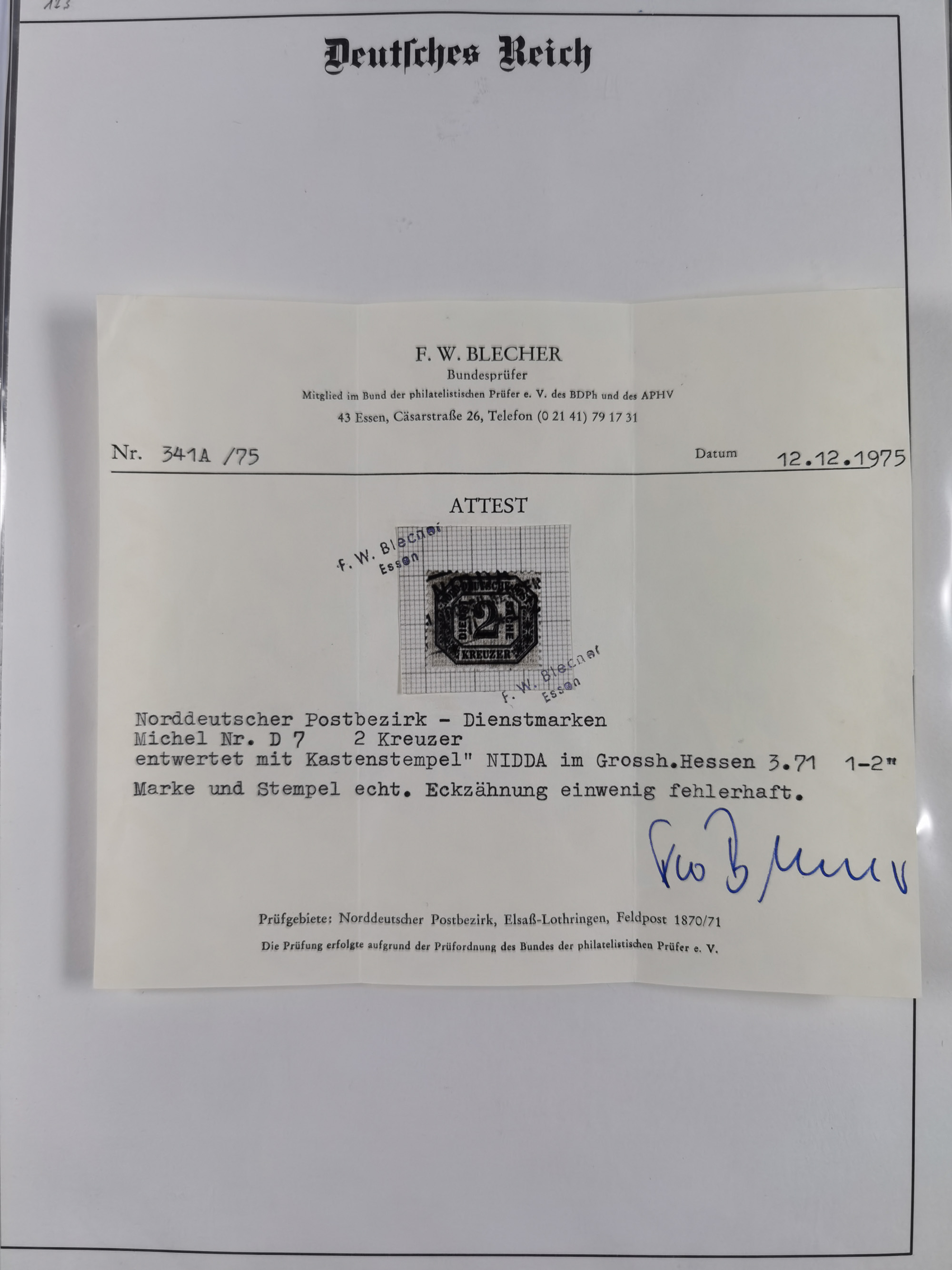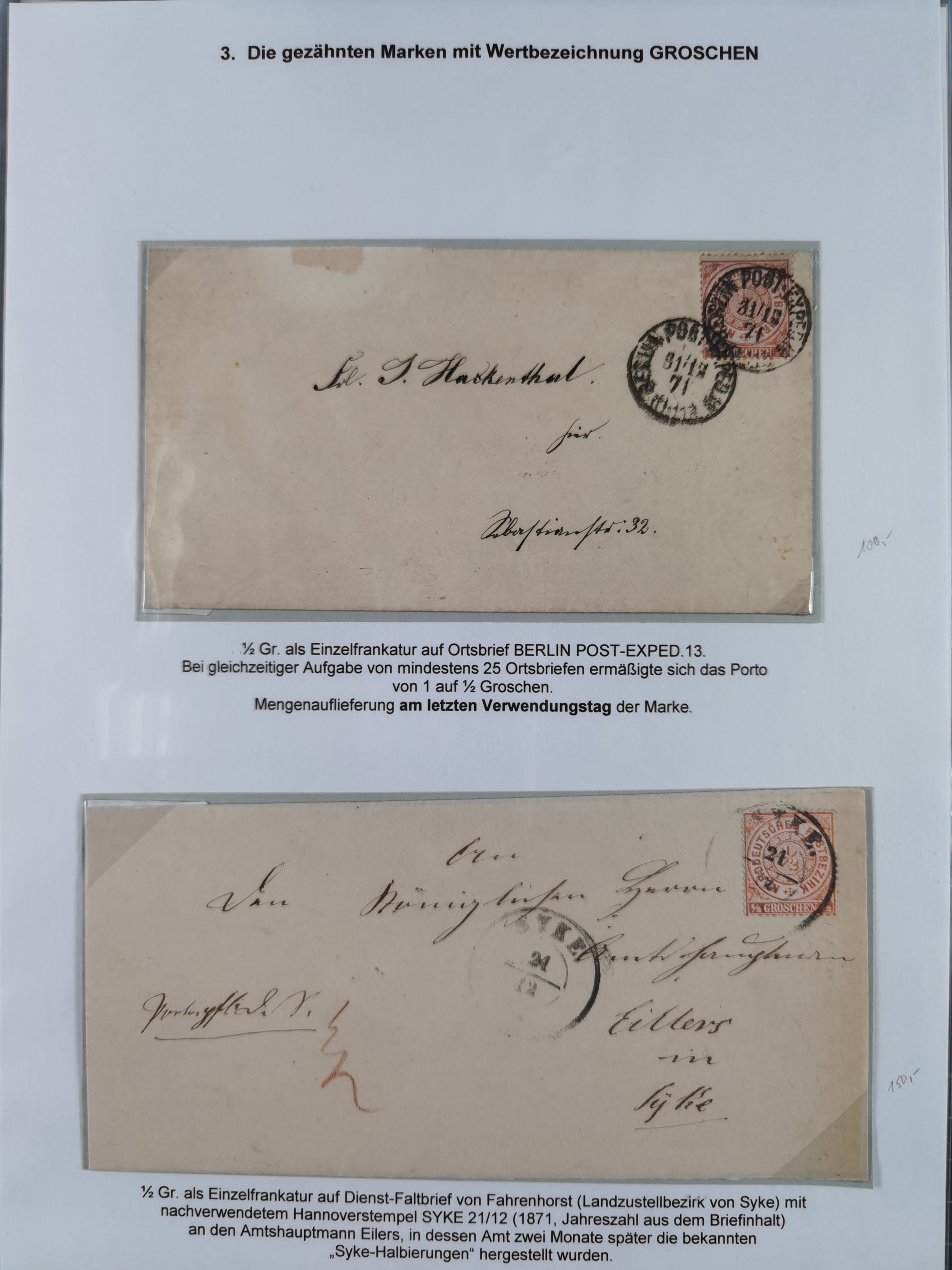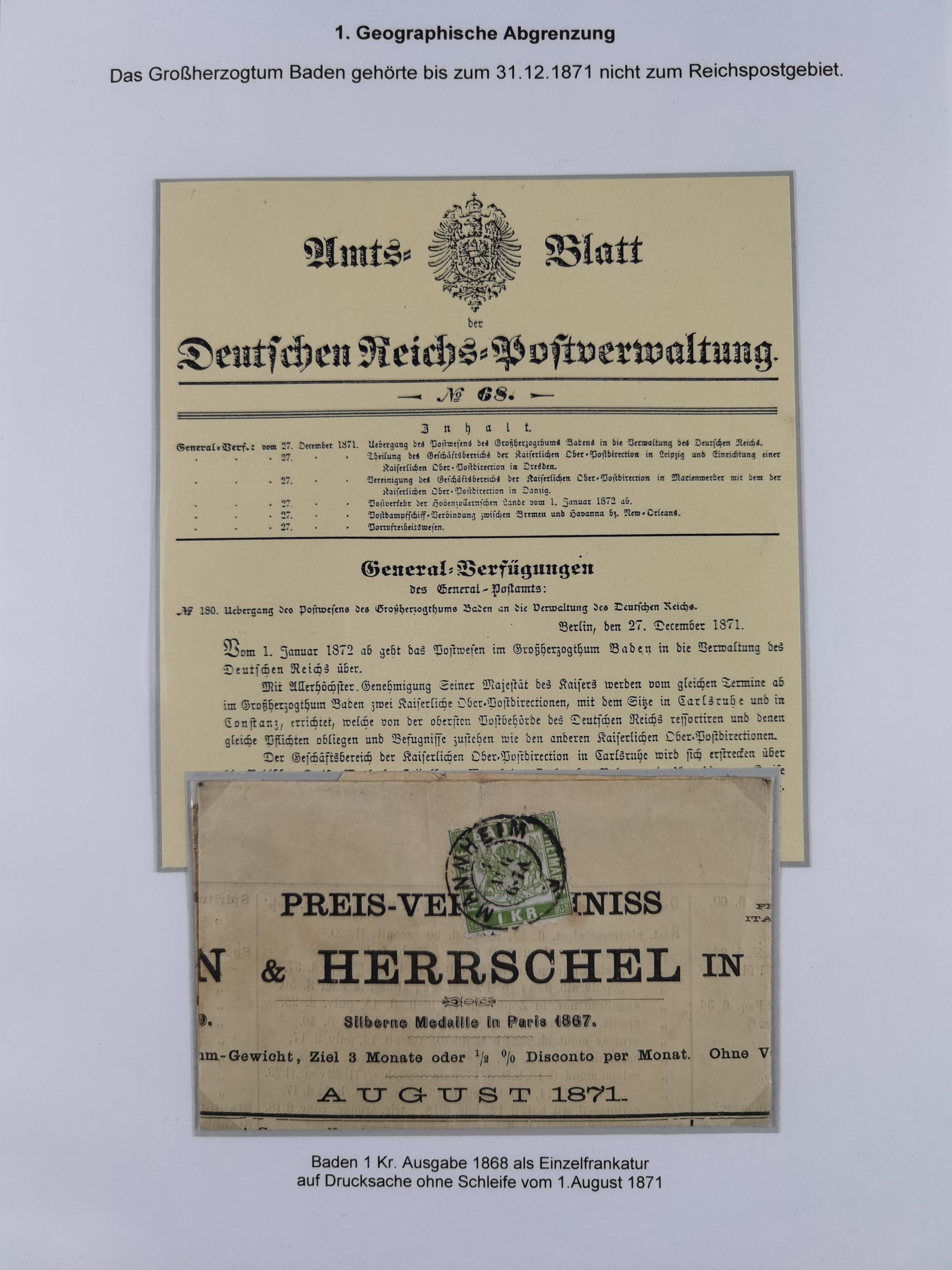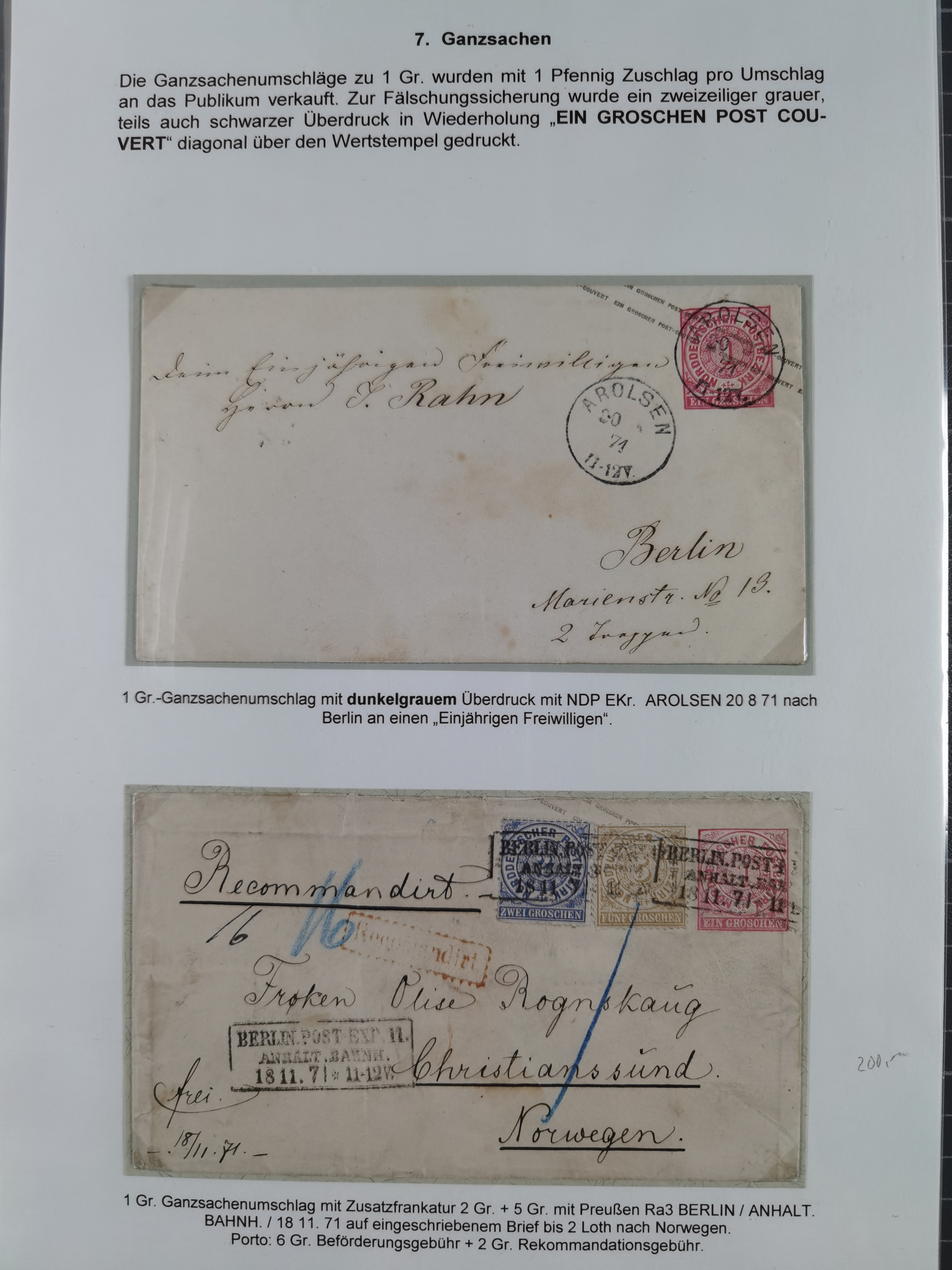 1871, DIENSTMARKEN-REICHSPOST-VORLÄUFER, ausstellungsmäßig aufgezogene kleine Spezialsammlung mit insgesamt 18 Belegen sowie einigen losen Marken und Briefstücken, dabei Mehrfachfrankaturen kleiner Groschenwerte, 2 Mischfrankaturen mit Freimarken, 1 Kr. im 3er-Streifen sowie 3 Briefe mit Kreuzer-Frankaturen, dabei 1 + 1+ 3 Kr.