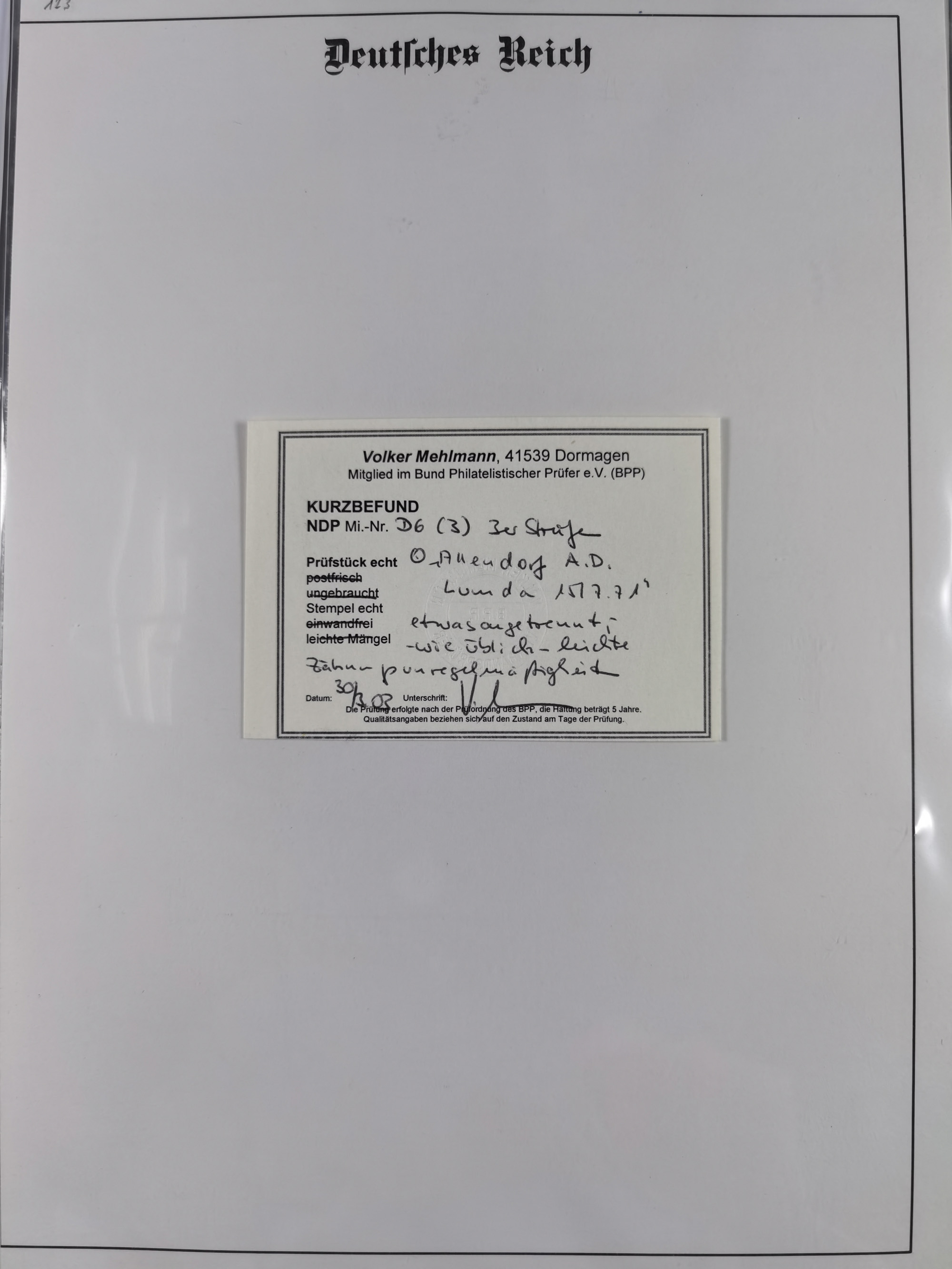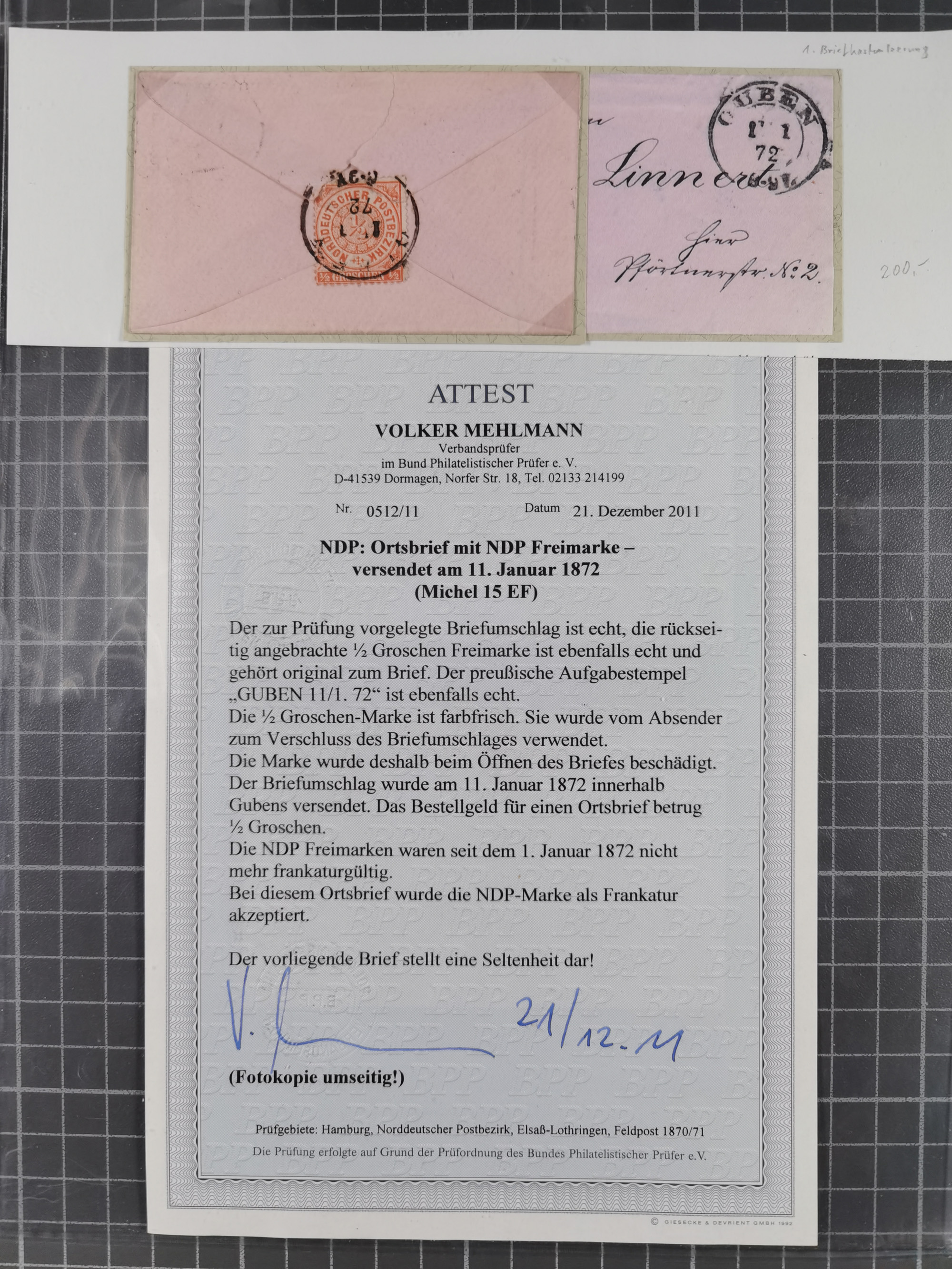 "MÜHLHEIM A.D. RUHR 3.DECBR.71 (Spalink 27) klar auf Norddeutscher Postbezirk 1 Gr. gezähnt auf komplettem Faltbrief nach Duisburg mit Ausgabestempel. Die farbfrische Marke hat einen kurzen Zahn, ansonsten wie der Faltbrief in einwandfreier Erhaltung, Fotoattest Mehlmann BPP (2019)