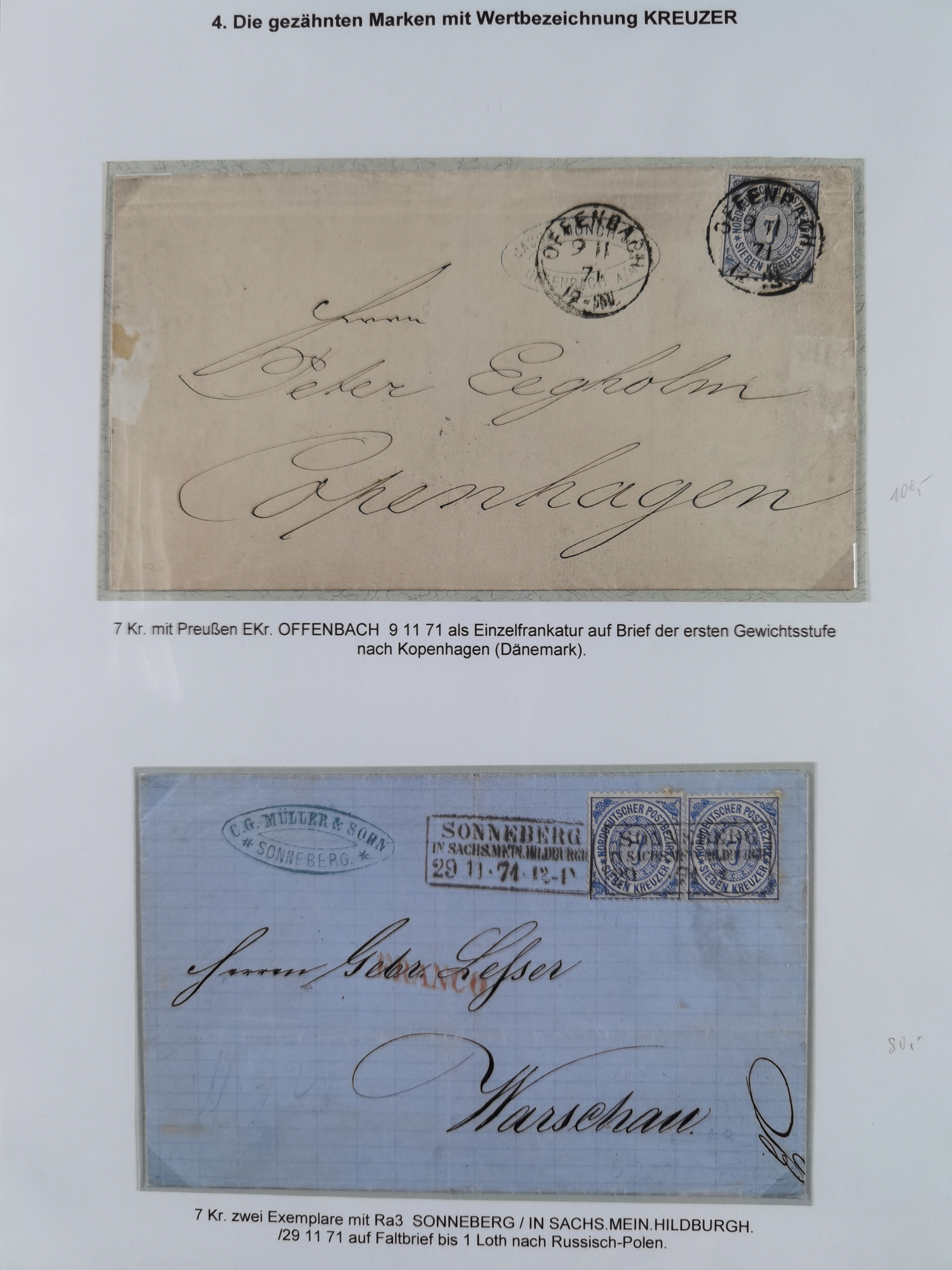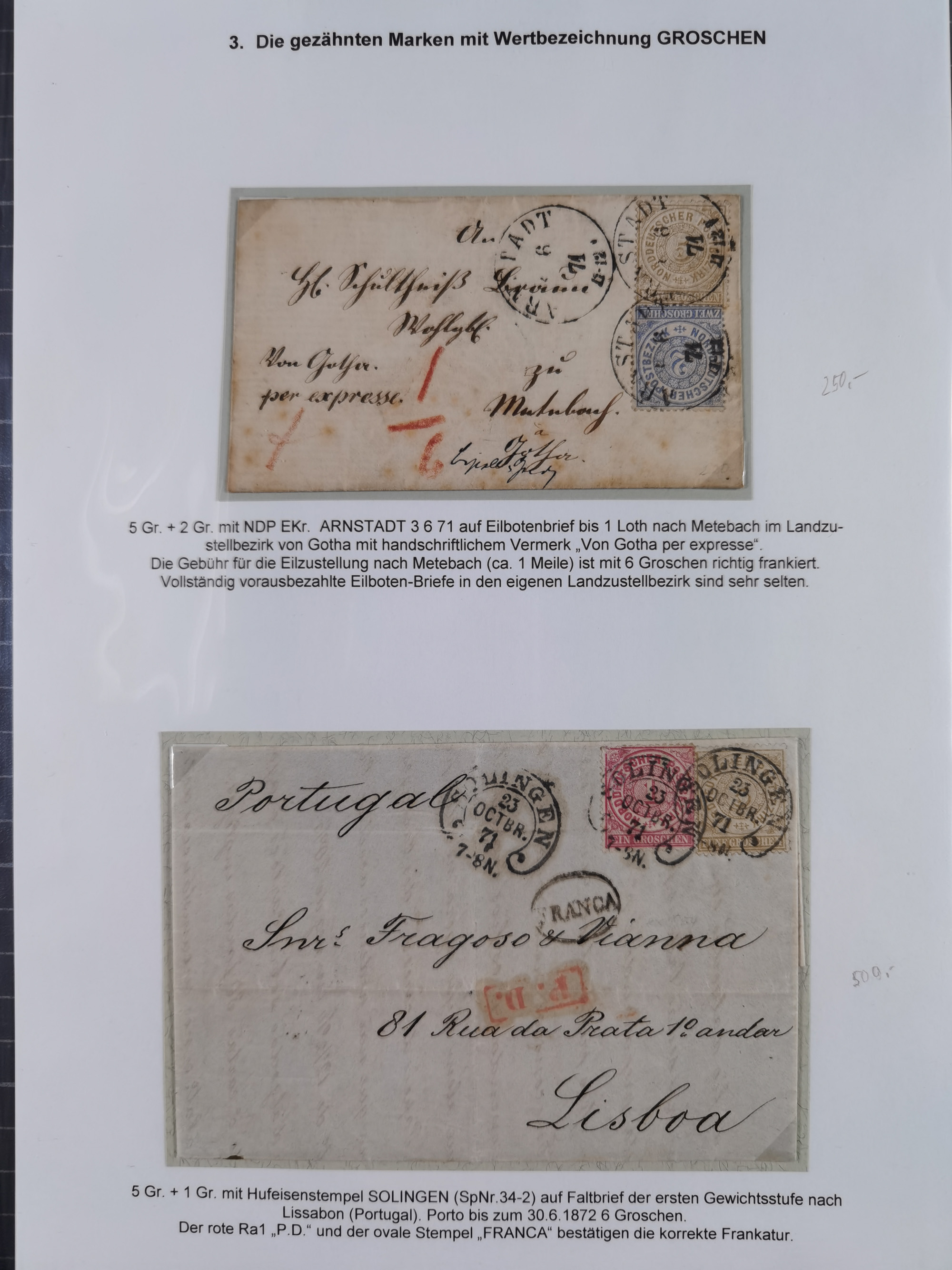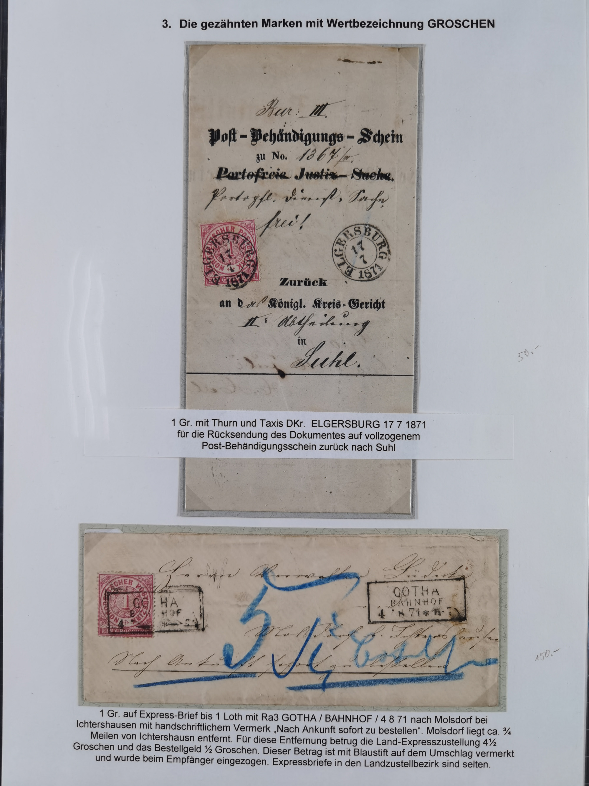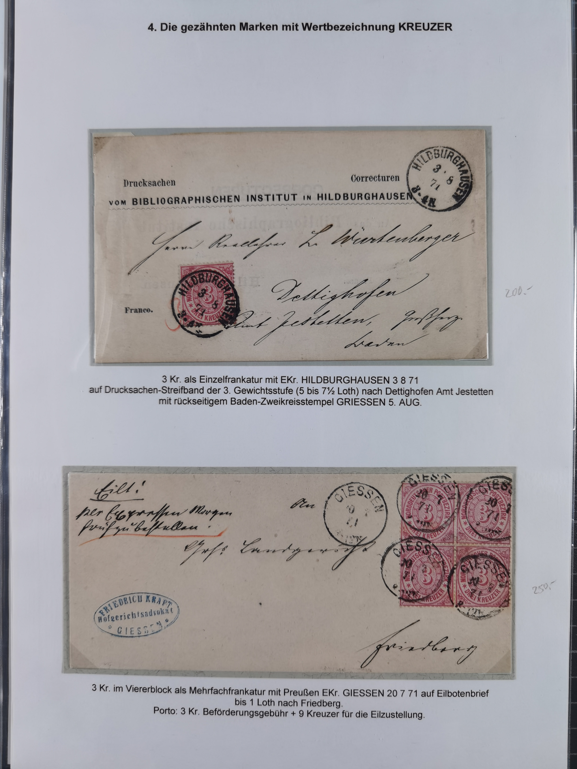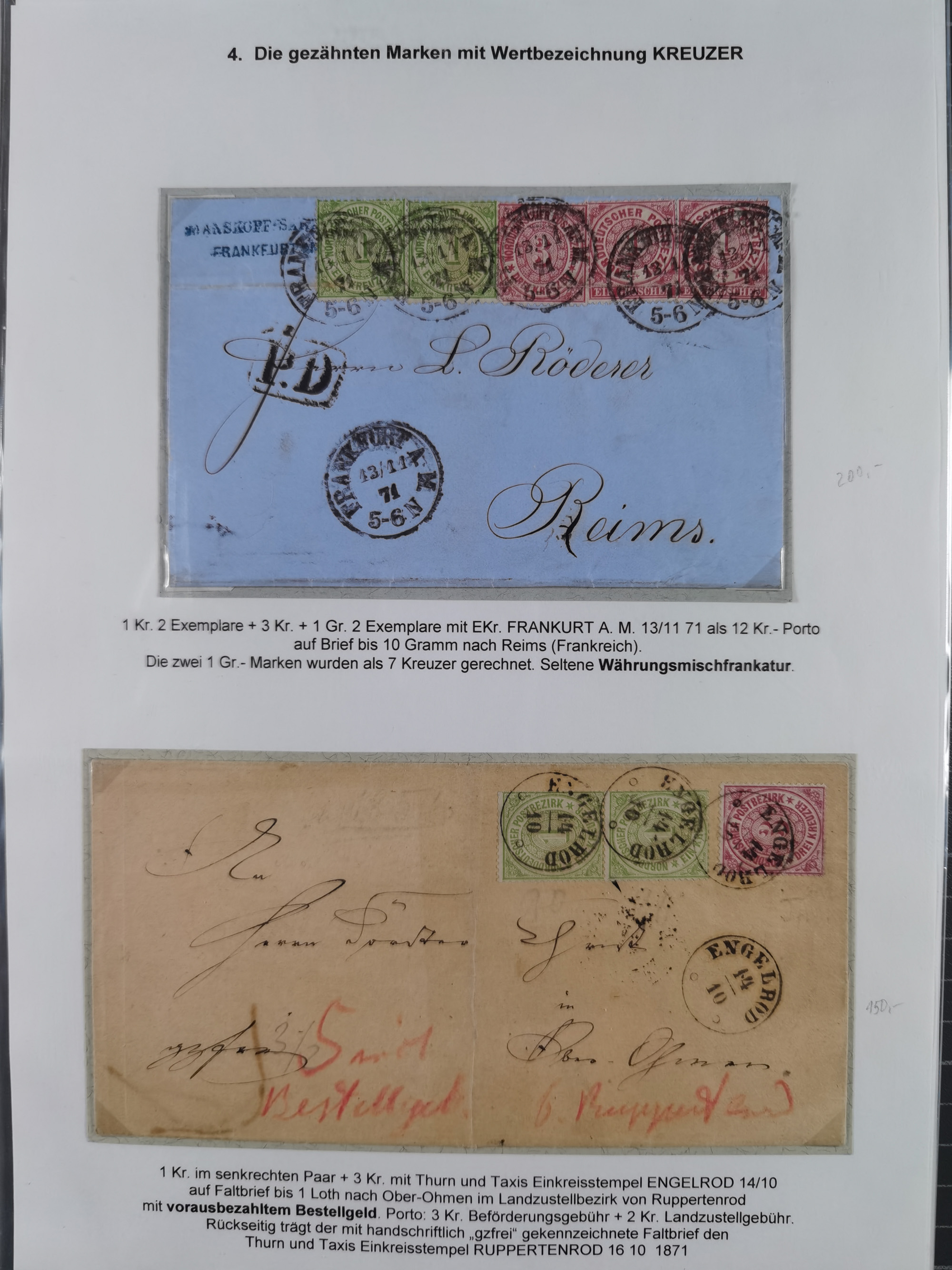 REICHSPOST-VORLÄUFER, ausstellungsmäßig aufgezogene Spezialsammlung von rund 120 Belegen und einigen losen Marken, Einheiten und Briefstücken, dabei eine Vielzahl von seltenen und besonderen Stücken, u.a. Frankaturen der durchstochenen Marken Mi. 2-4,9 und 11 (letztere u.a. MeF), Ortsbriefe und -Karten, Auslandsbriefe (dabei Drucksachen, Reco und Grenzrayon), 'Muster ohne Wert', Bücherzettel, Letzttagsbrief, Ganzsachenausschnitte auf Briefen, Eilboten, Währungsmischfrankatur, Mi. 25 als Mehrfachfrankatur und in Farbfrankatur auf Reco-Brief nach Frankreich, etc. etc. ein sehr interessantes und reichhaltiges Objekt.