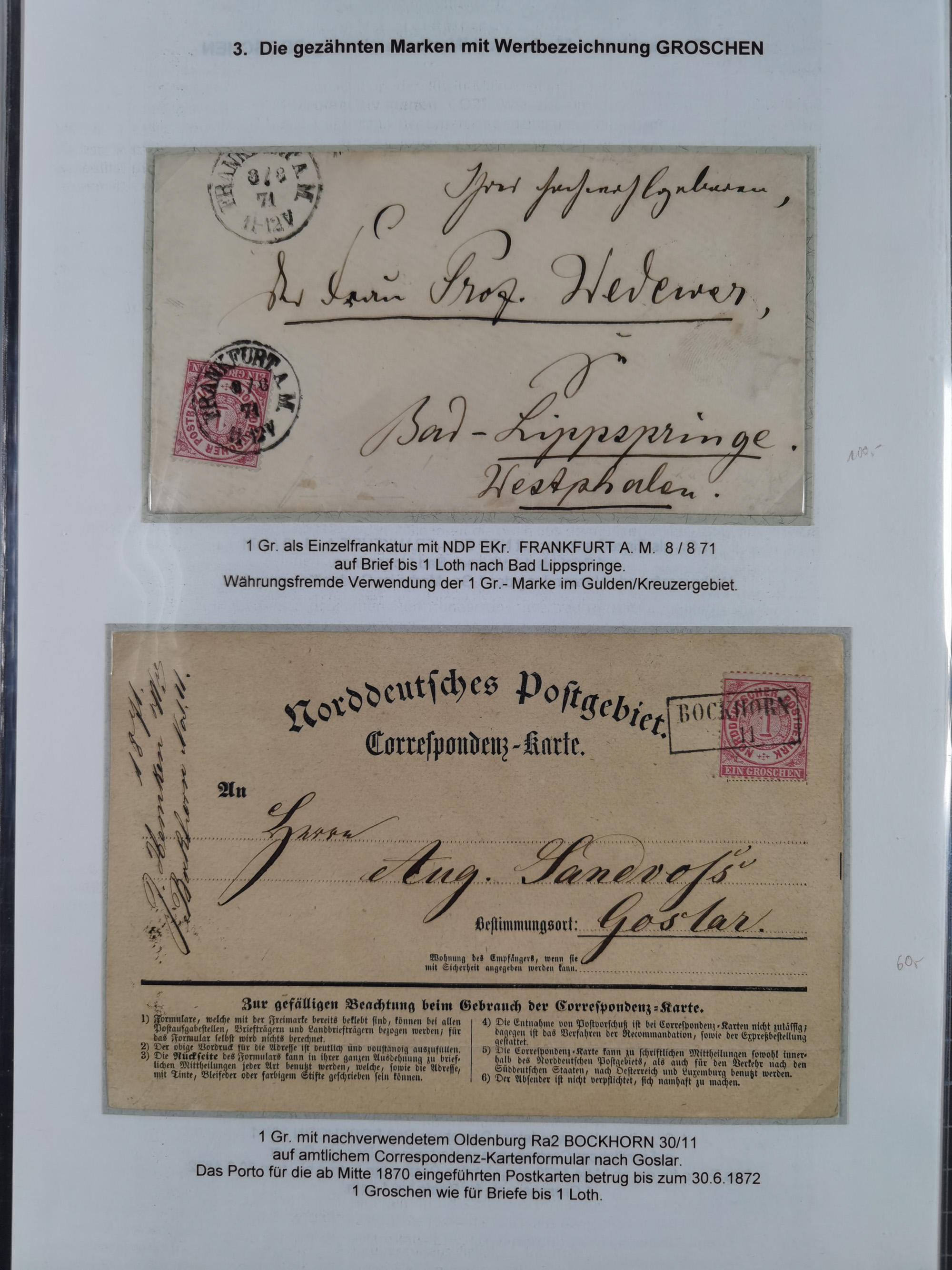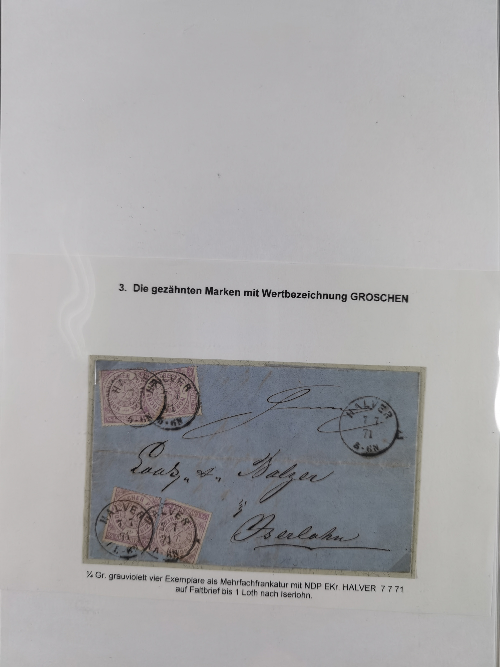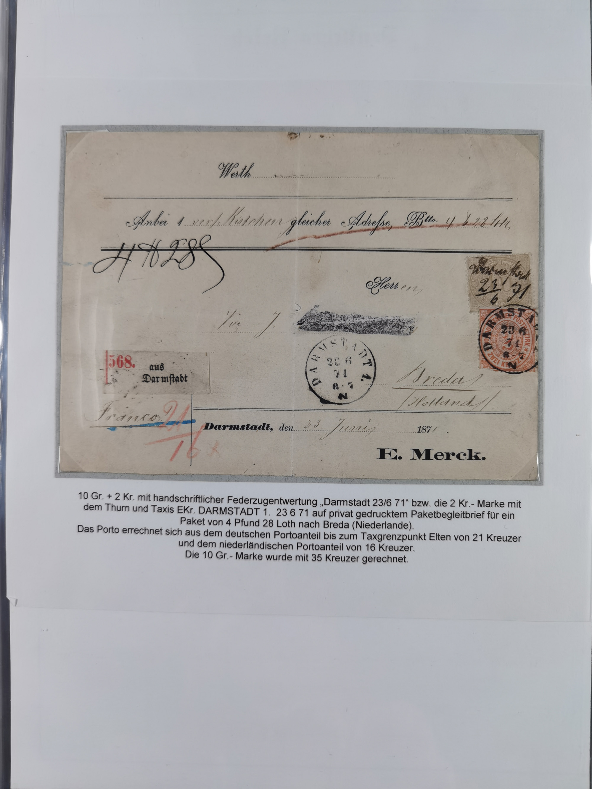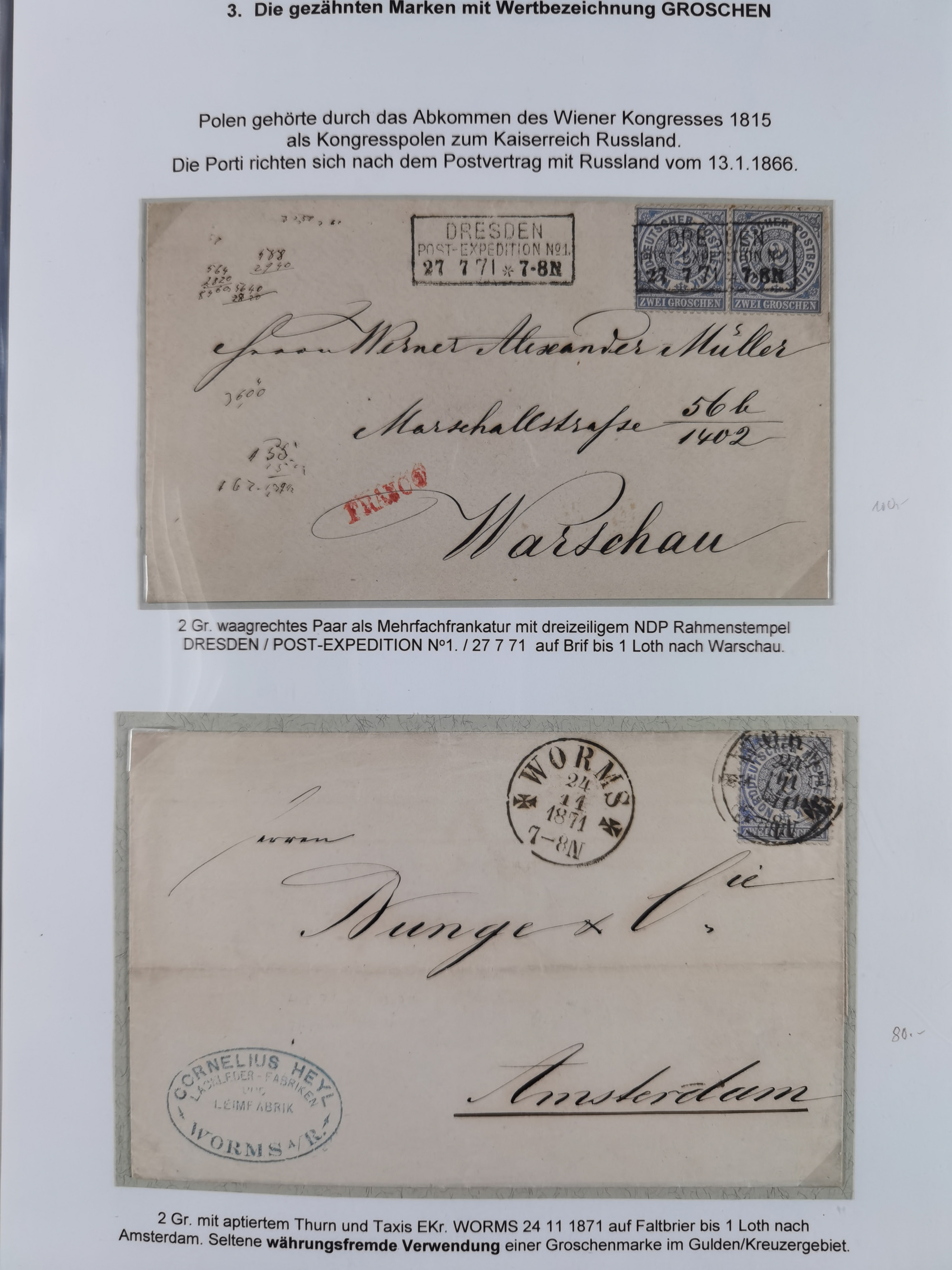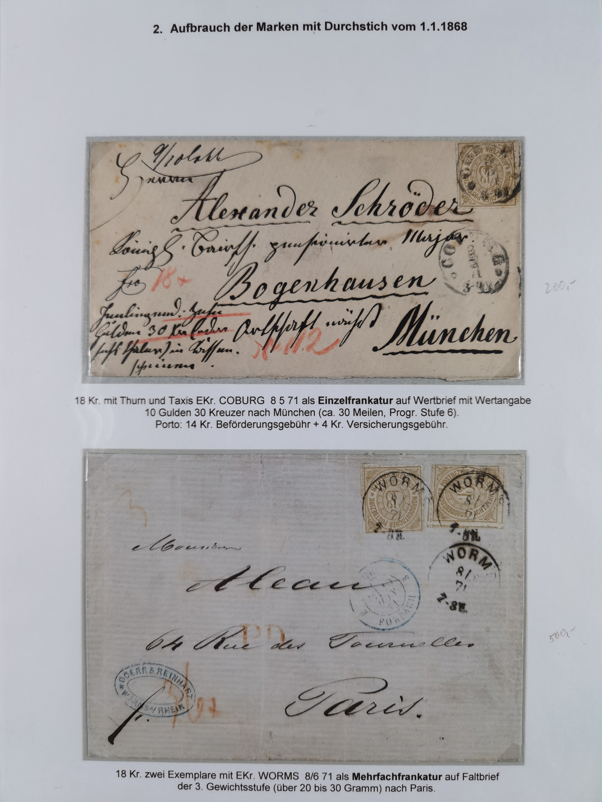 REICHSPOST-VORLÄUFER, ausstellungsmäßig aufgezogene Spezialsammlung von rund 120 Belegen und einigen losen Marken, Einheiten und Briefstücken, dabei eine Vielzahl von seltenen und besonderen Stücken, u.a. Frankaturen der durchstochenen Marken Mi. 2-4,9 und 11 (letztere u.a. MeF), Ortsbriefe und -Karten, Auslandsbriefe (dabei Drucksachen, Reco und Grenzrayon), 'Muster ohne Wert', Bücherzettel, Letzttagsbrief, Ganzsachenausschnitte auf Briefen, Eilboten, Währungsmischfrankatur, Mi. 25 als Mehrfachfrankatur und in Farbfrankatur auf Reco-Brief nach Frankreich, etc. etc. ein sehr interessantes und reichhaltiges Objekt.