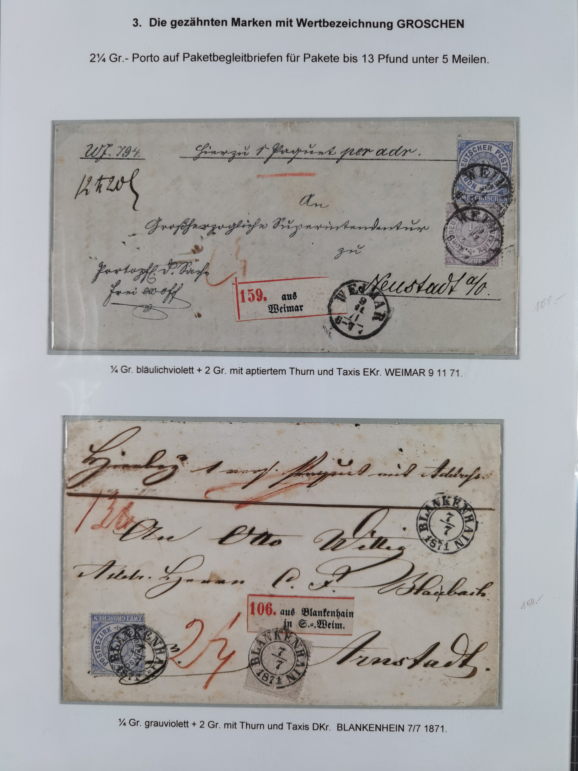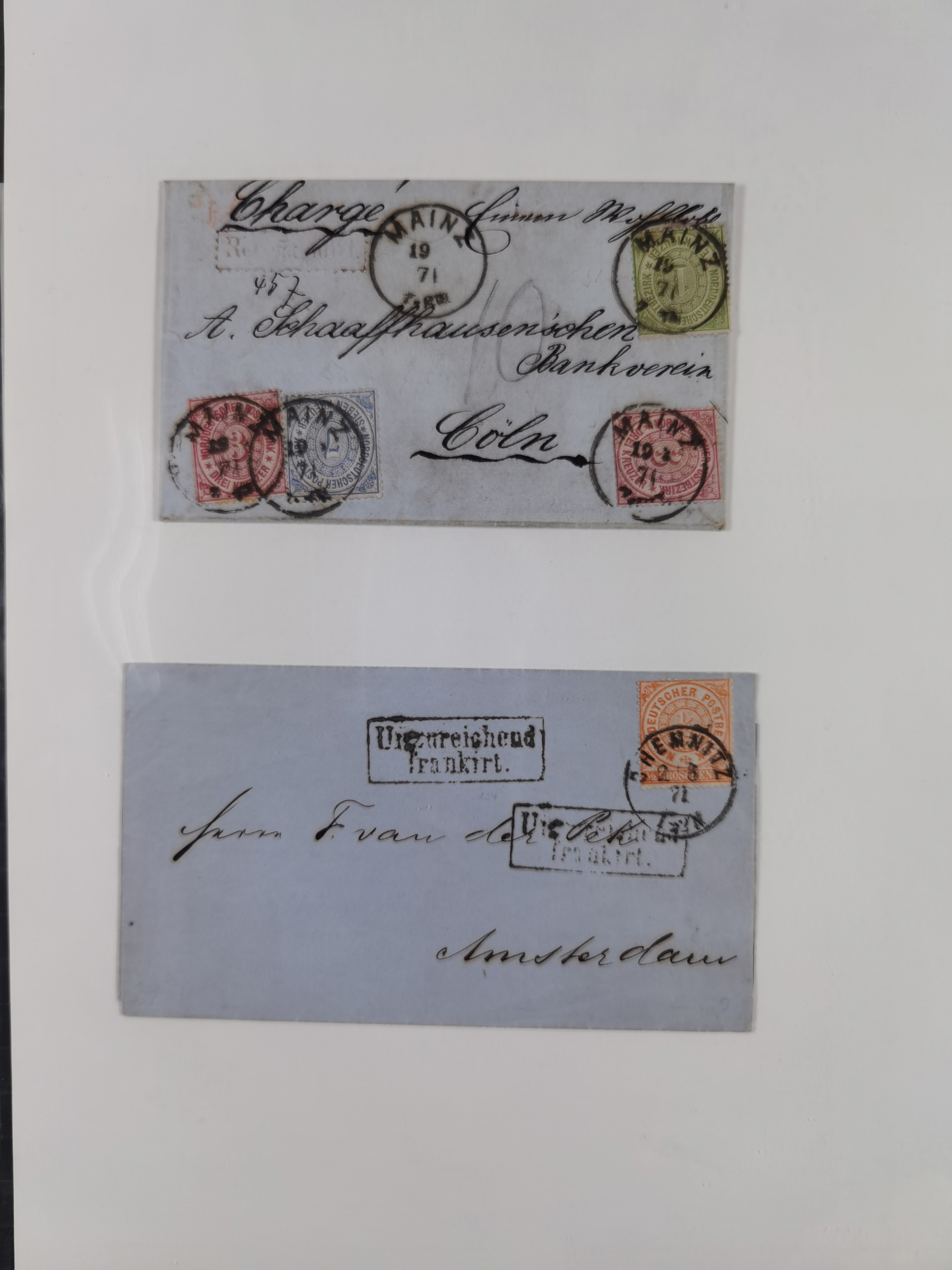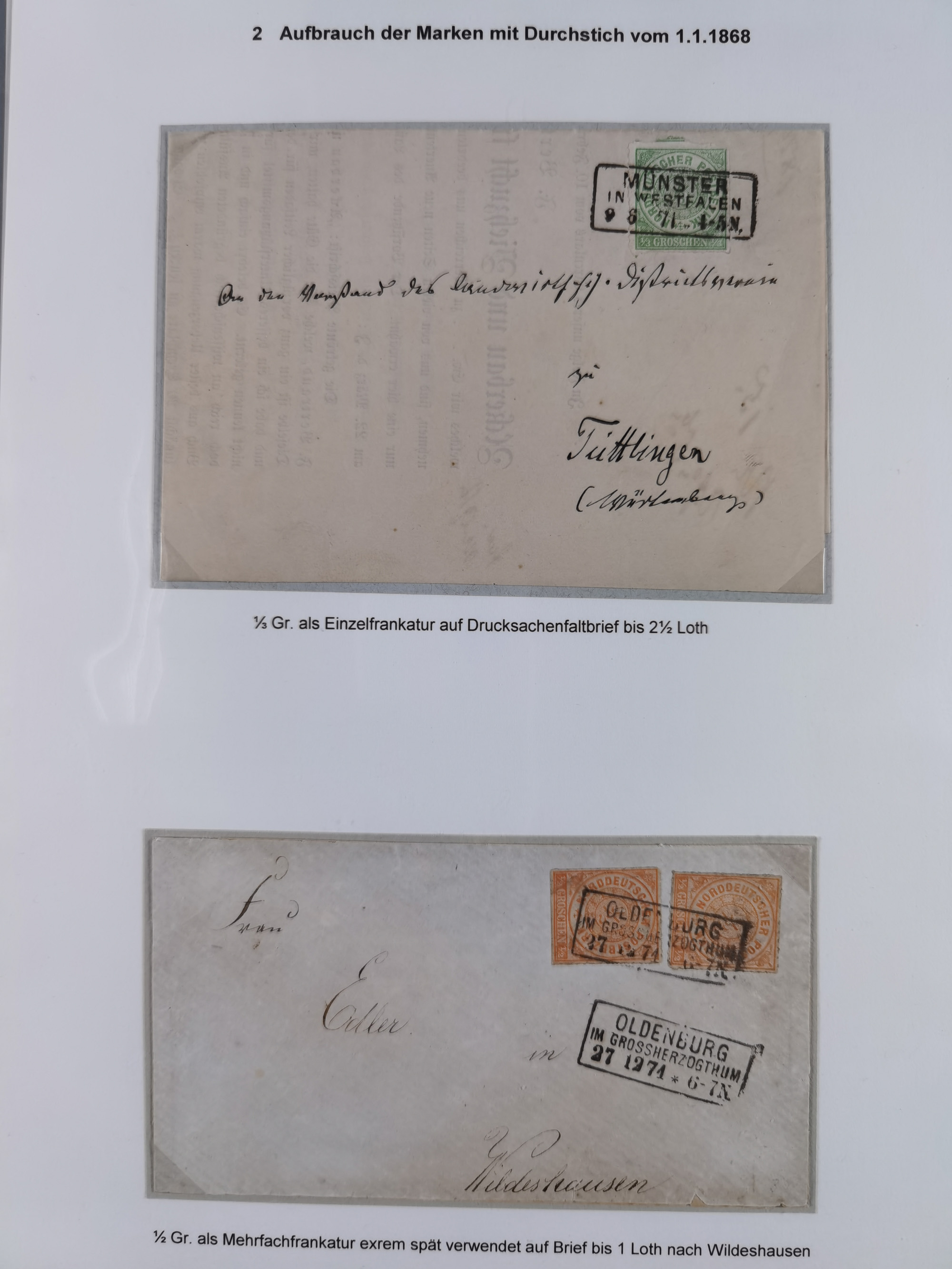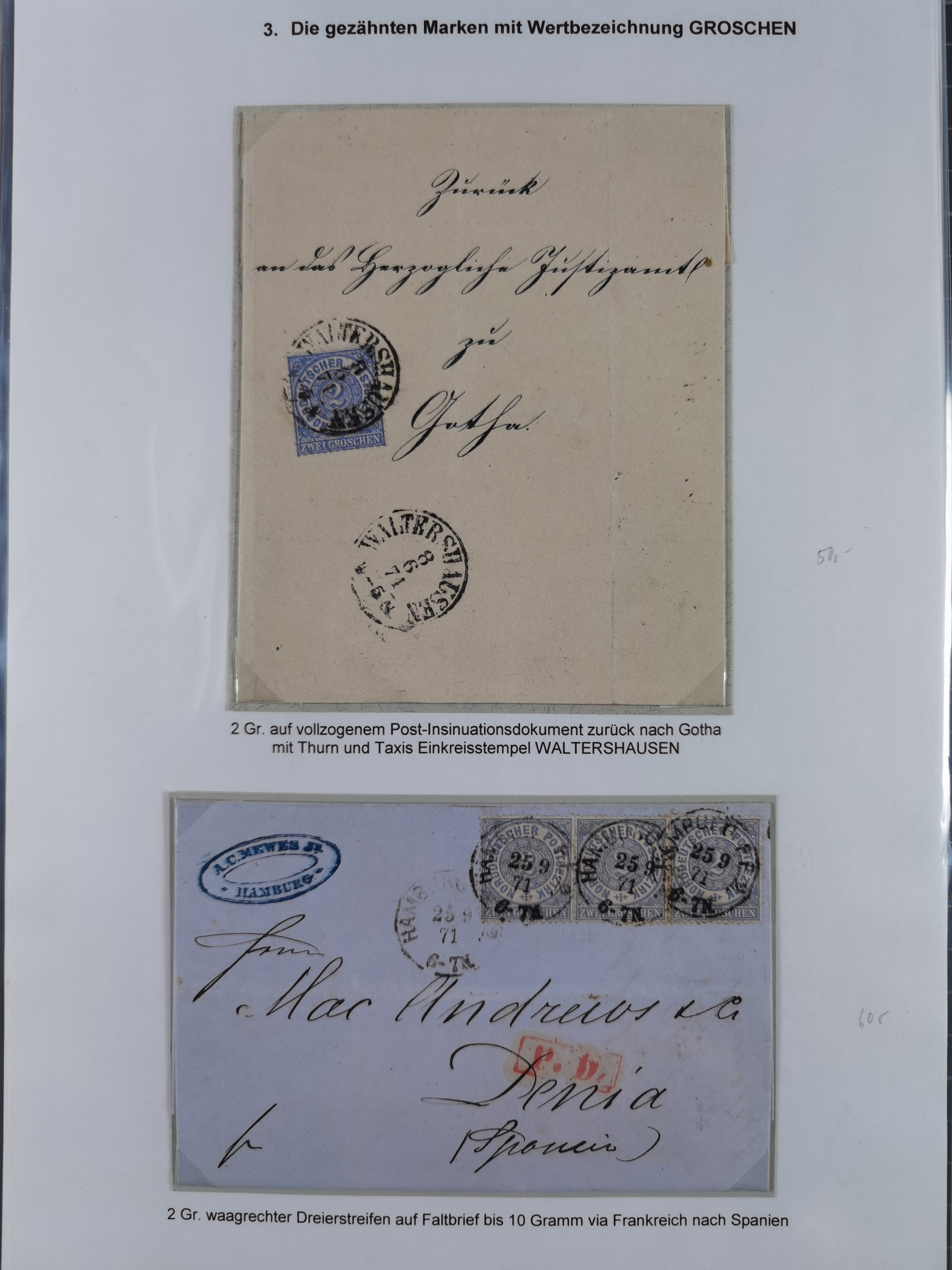 REICHSPOST-VORLÄUFER, ausstellungsmäßig aufgezogene Spezialsammlung von rund 120 Belegen und einigen losen Marken, Einheiten und Briefstücken, dabei eine Vielzahl von seltenen und besonderen Stücken, u.a. Frankaturen der durchstochenen Marken Mi. 2-4,9 und 11 (letztere u.a. MeF), Ortsbriefe und -Karten, Auslandsbriefe (dabei Drucksachen, Reco und Grenzrayon), 'Muster ohne Wert', Bücherzettel, Letzttagsbrief, Ganzsachenausschnitte auf Briefen, Eilboten, Währungsmischfrankatur, Mi. 25 als Mehrfachfrankatur und in Farbfrankatur auf Reco-Brief nach Frankreich, etc. etc. ein sehr interessantes und reichhaltiges Objekt.