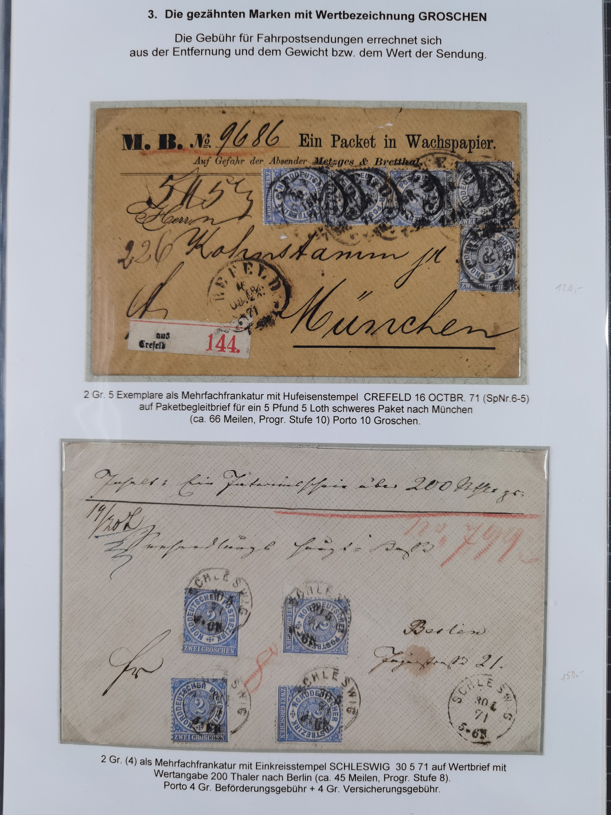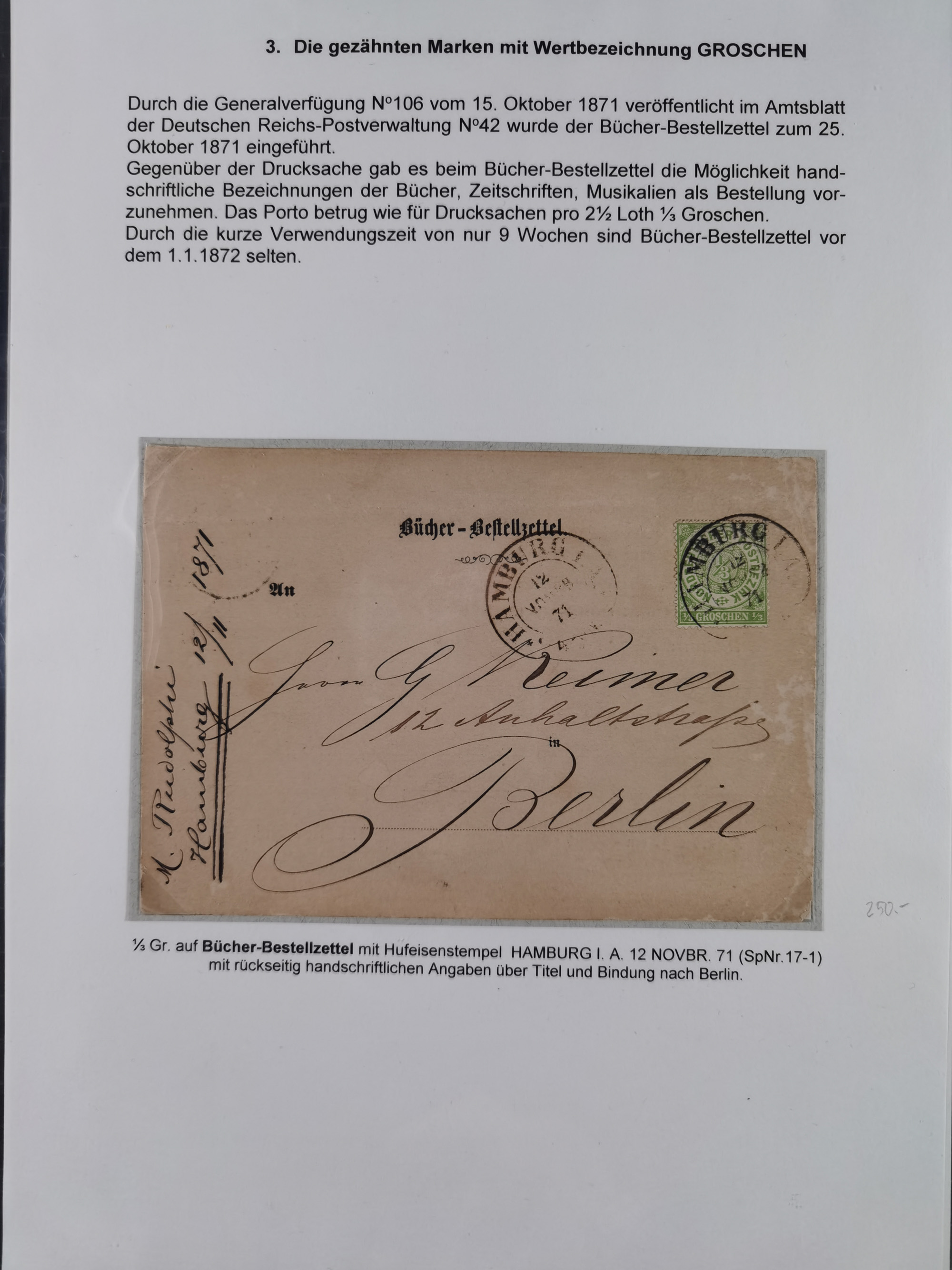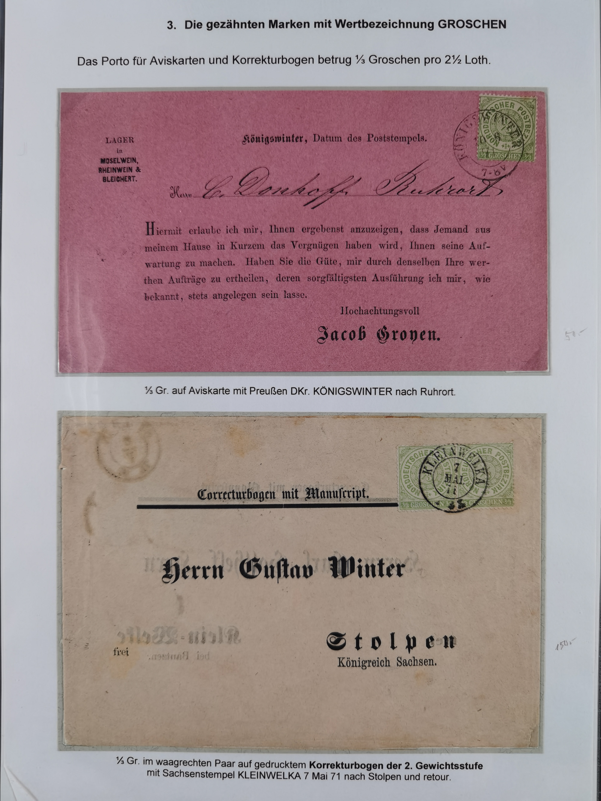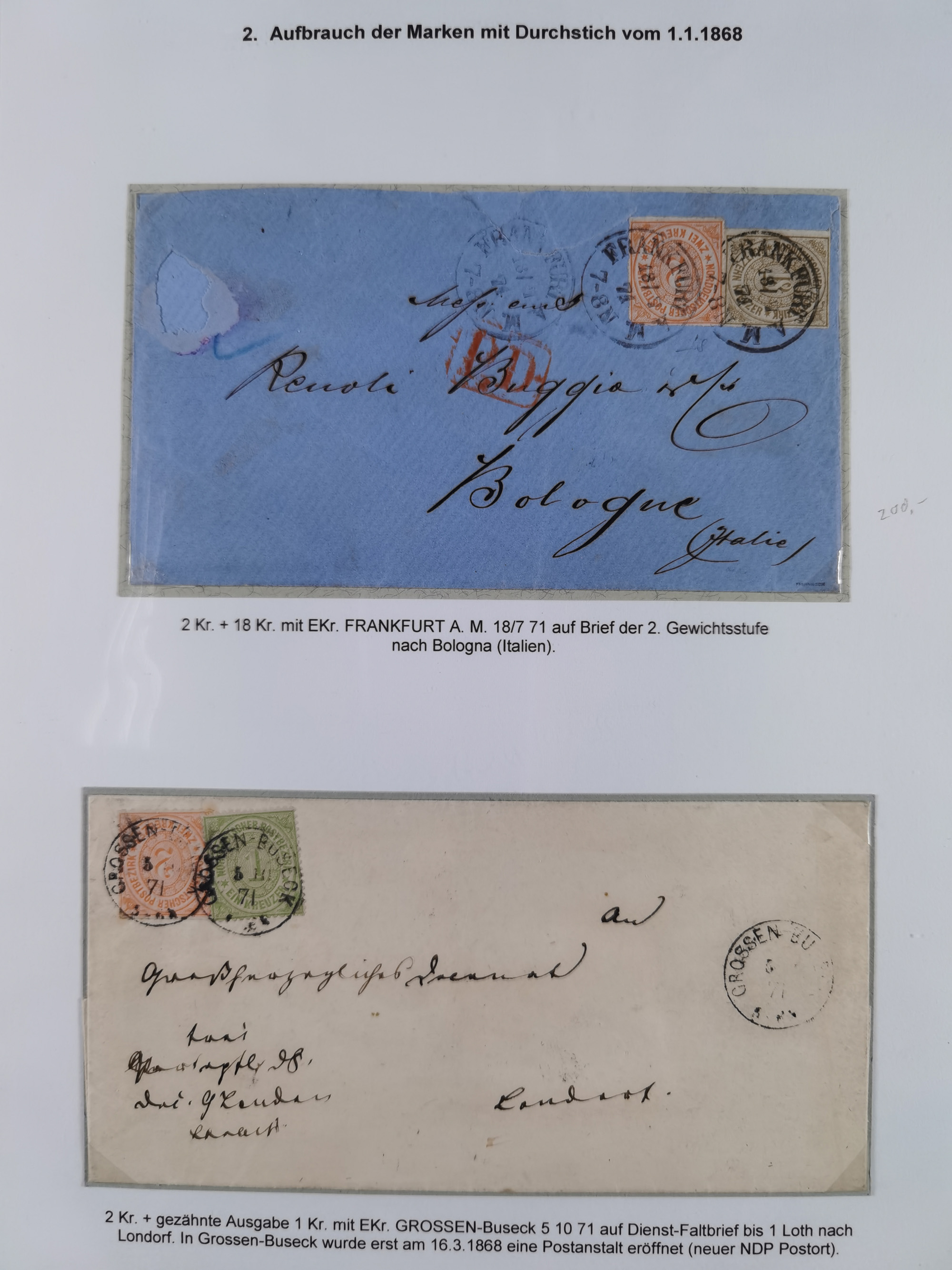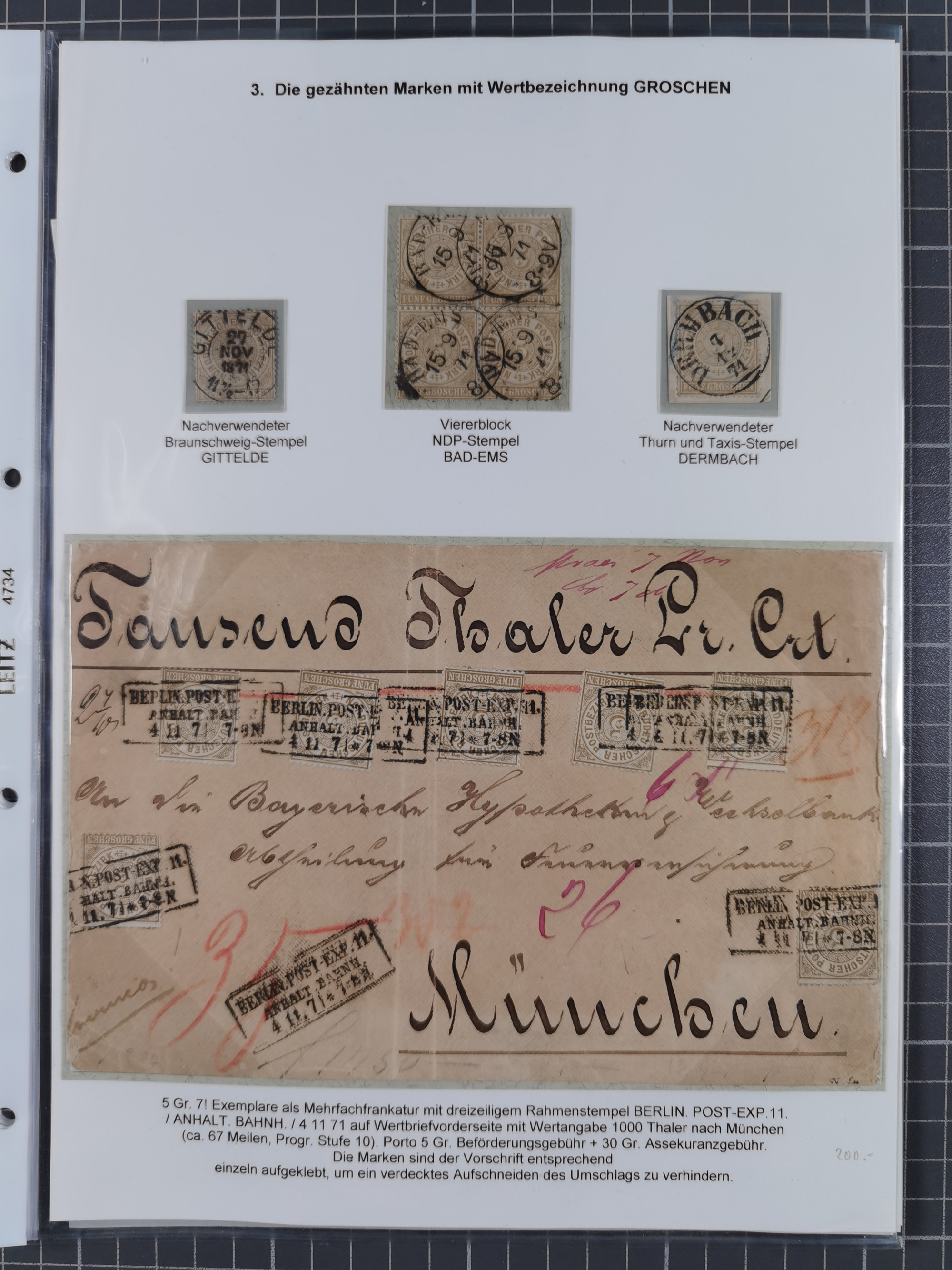 REICHSPOST-VORLÄUFER, ausstellungsmäßig aufgezogene Spezialsammlung von rund 120 Belegen und einigen losen Marken, Einheiten und Briefstücken, dabei eine Vielzahl von seltenen und besonderen Stücken, u.a. Frankaturen der durchstochenen Marken Mi. 2-4,9 und 11 (letztere u.a. MeF), Ortsbriefe und -Karten, Auslandsbriefe (dabei Drucksachen, Reco und Grenzrayon), 'Muster ohne Wert', Bücherzettel, Letzttagsbrief, Ganzsachenausschnitte auf Briefen, Eilboten, Währungsmischfrankatur, Mi. 25 als Mehrfachfrankatur und in Farbfrankatur auf Reco-Brief nach Frankreich, etc. etc. ein sehr interessantes und reichhaltiges Objekt.