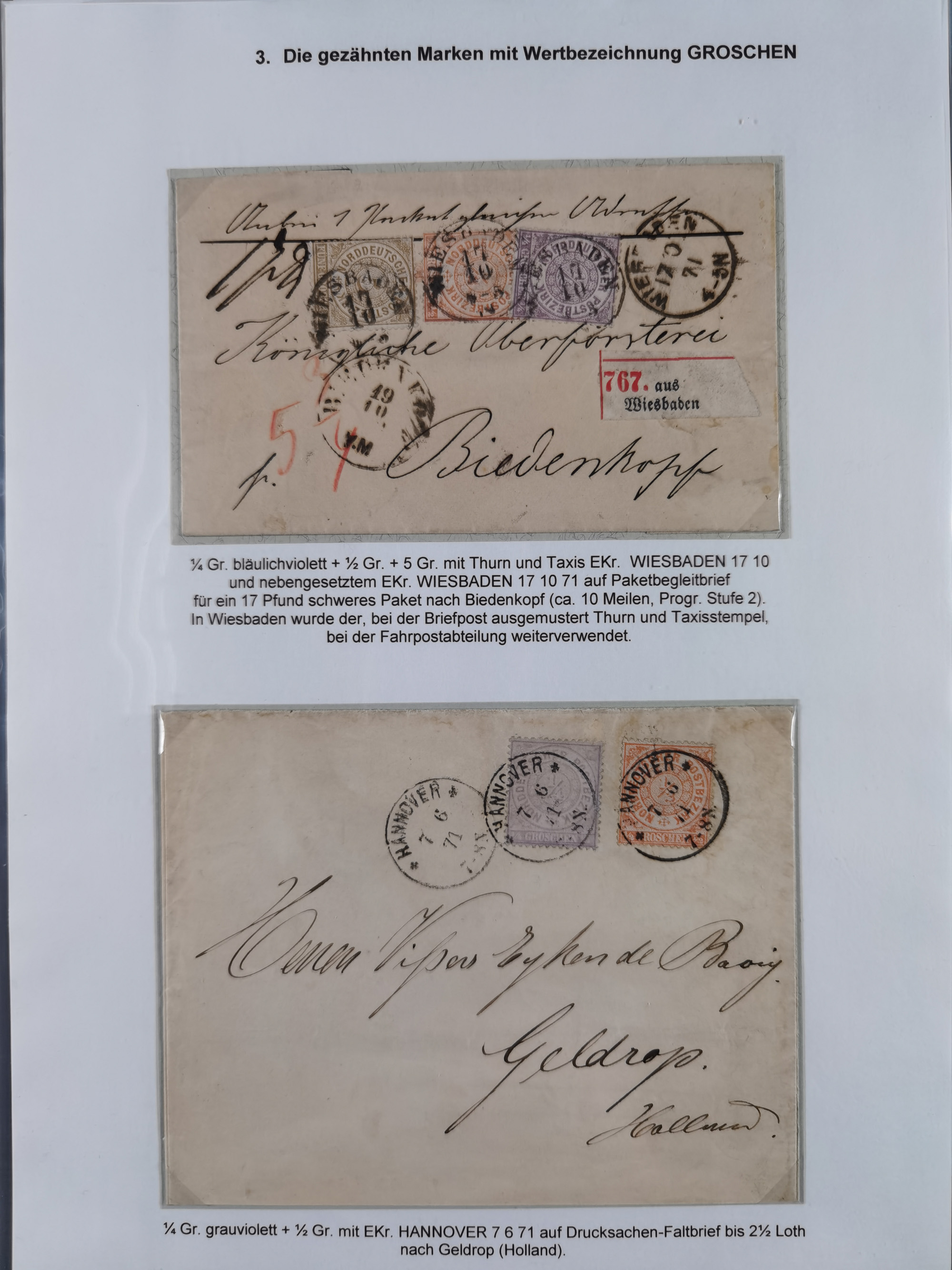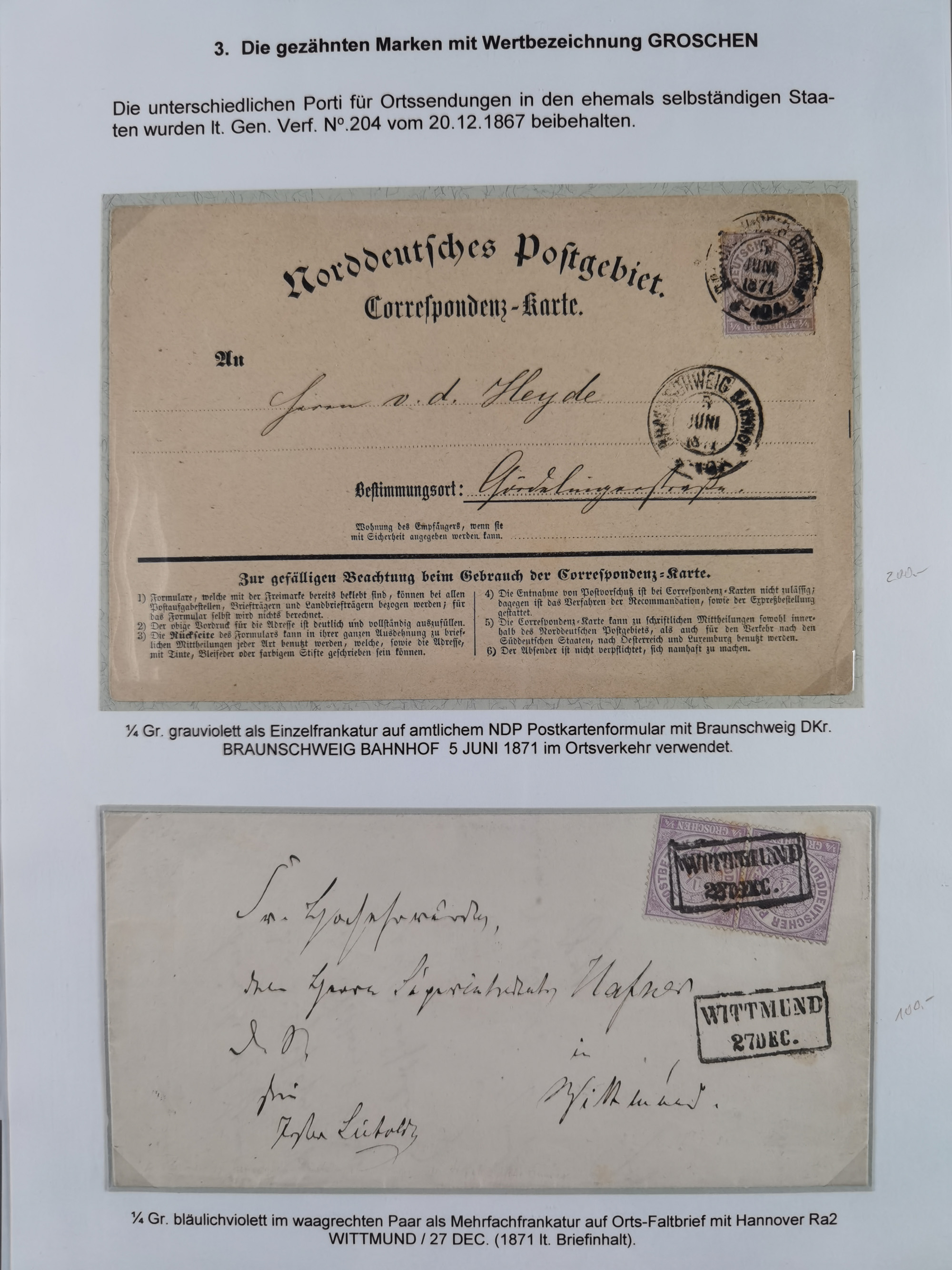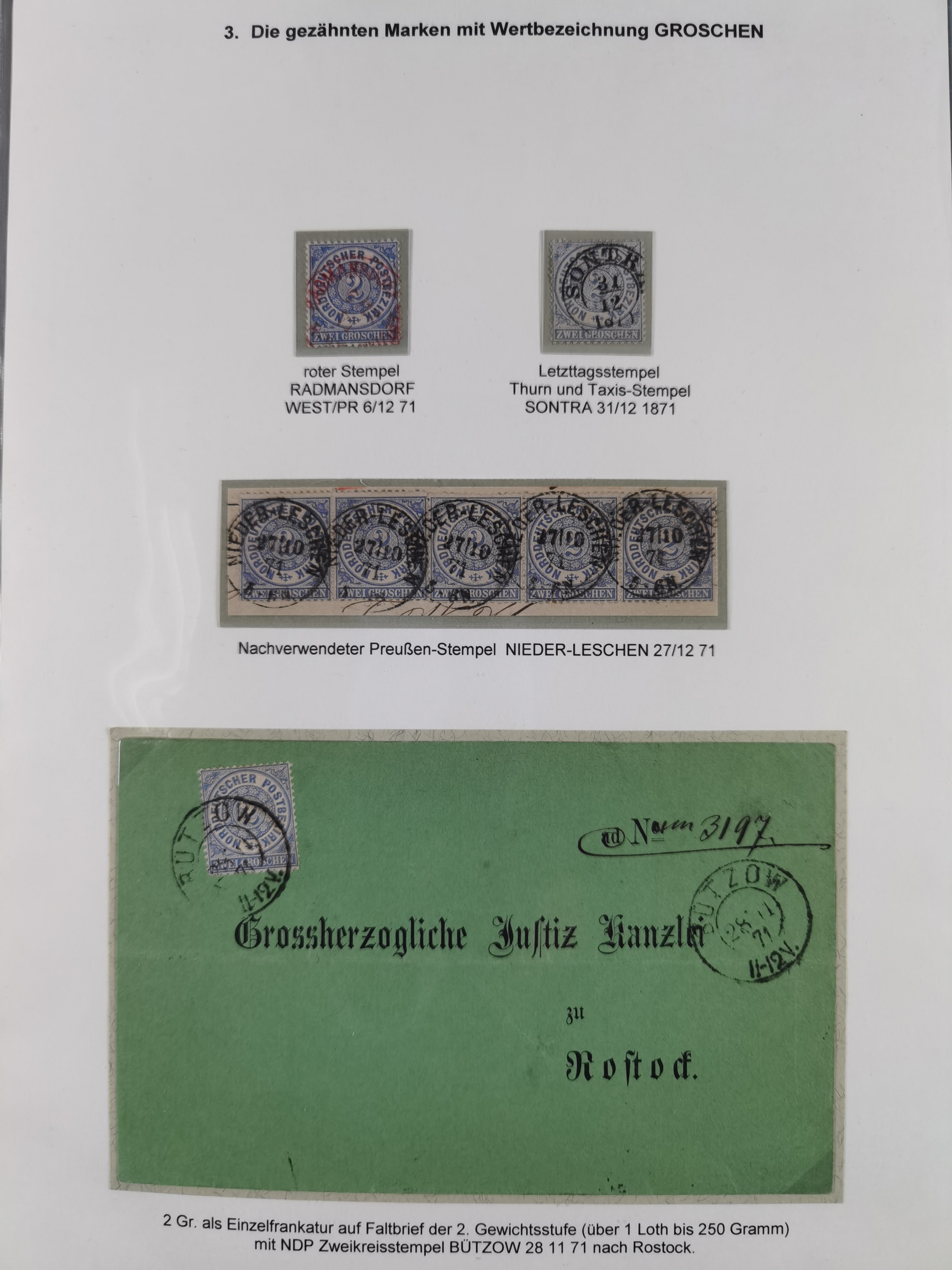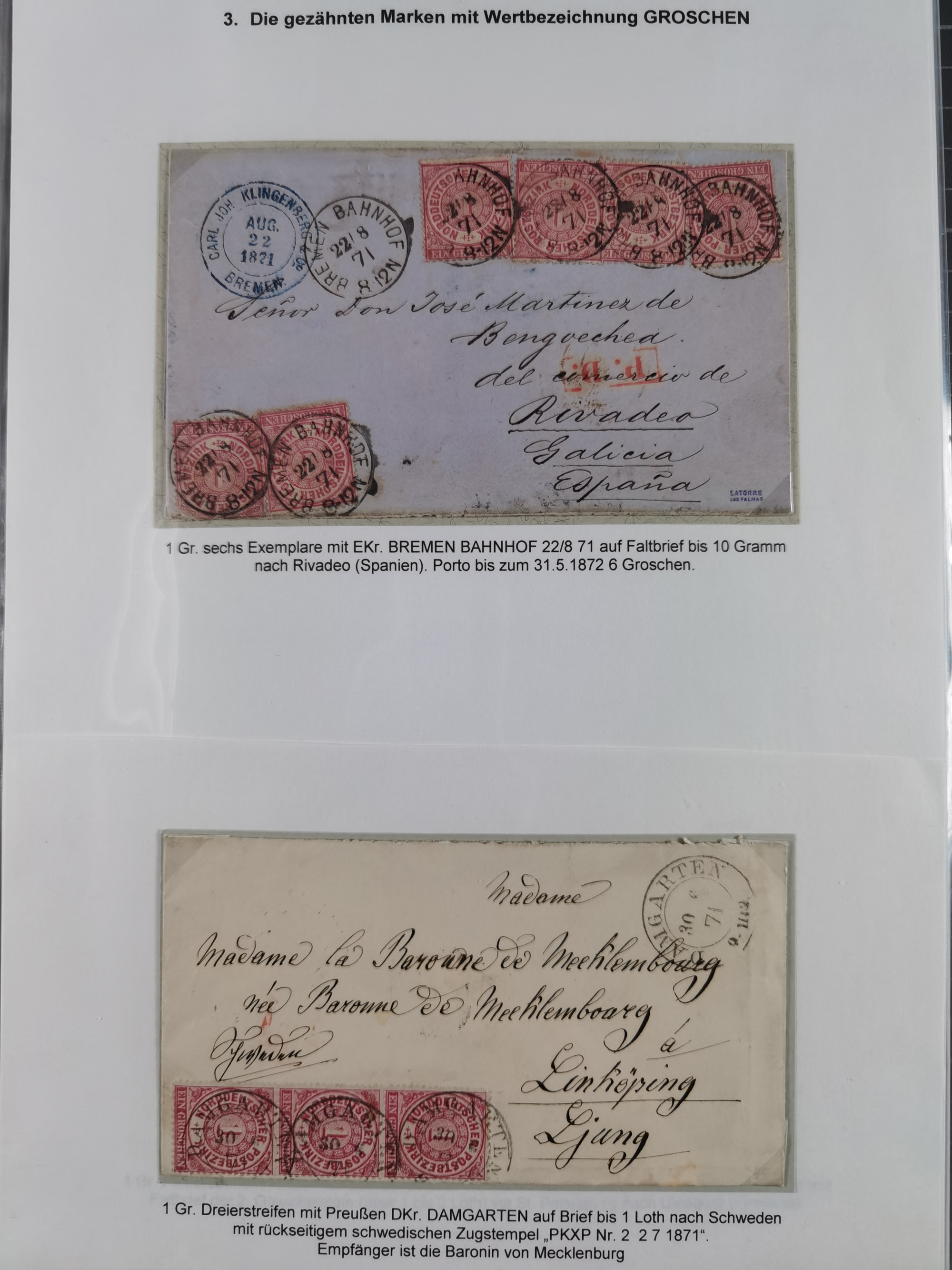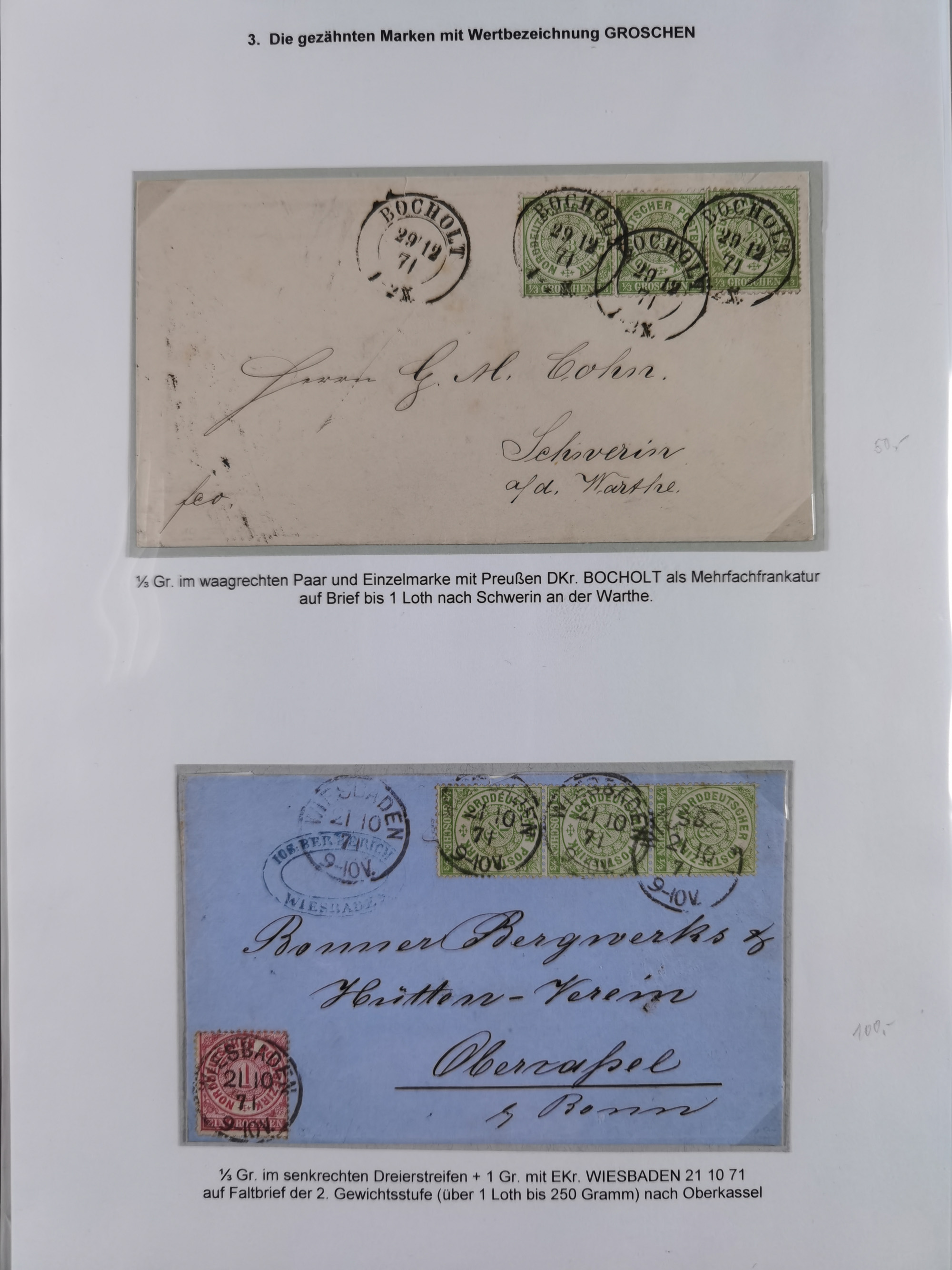 REICHSPOST-VORLÄUFER, ausstellungsmäßig aufgezogene Spezialsammlung von rund 120 Belegen und einigen losen Marken, Einheiten und Briefstücken, dabei eine Vielzahl von seltenen und besonderen Stücken, u.a. Frankaturen der durchstochenen Marken Mi. 2-4,9 und 11 (letztere u.a. MeF), Ortsbriefe und -Karten, Auslandsbriefe (dabei Drucksachen, Reco und Grenzrayon), 'Muster ohne Wert', Bücherzettel, Letzttagsbrief, Ganzsachenausschnitte auf Briefen, Eilboten, Währungsmischfrankatur, Mi. 25 als Mehrfachfrankatur und in Farbfrankatur auf Reco-Brief nach Frankreich, etc. etc. ein sehr interessantes und reichhaltiges Objekt.