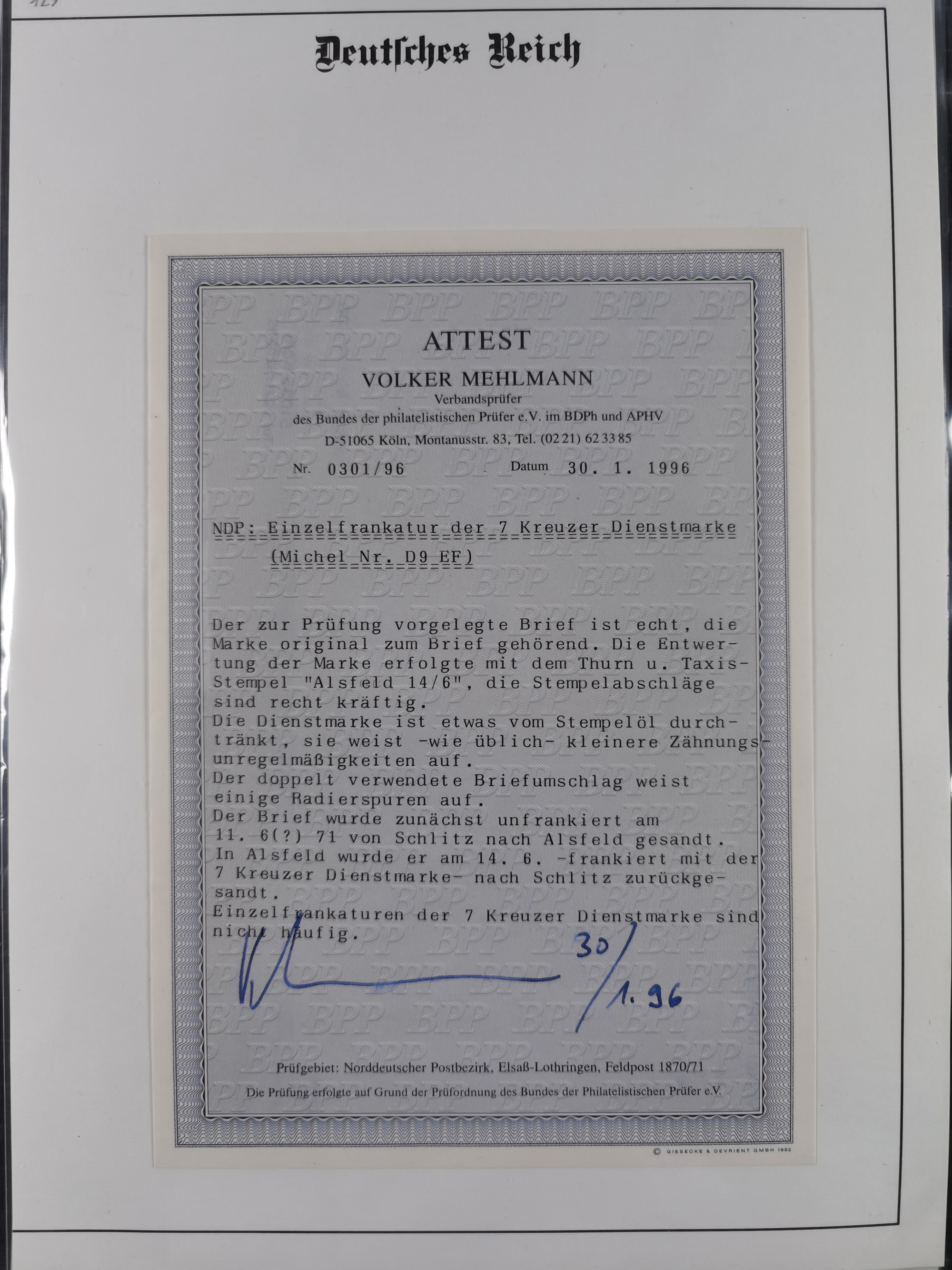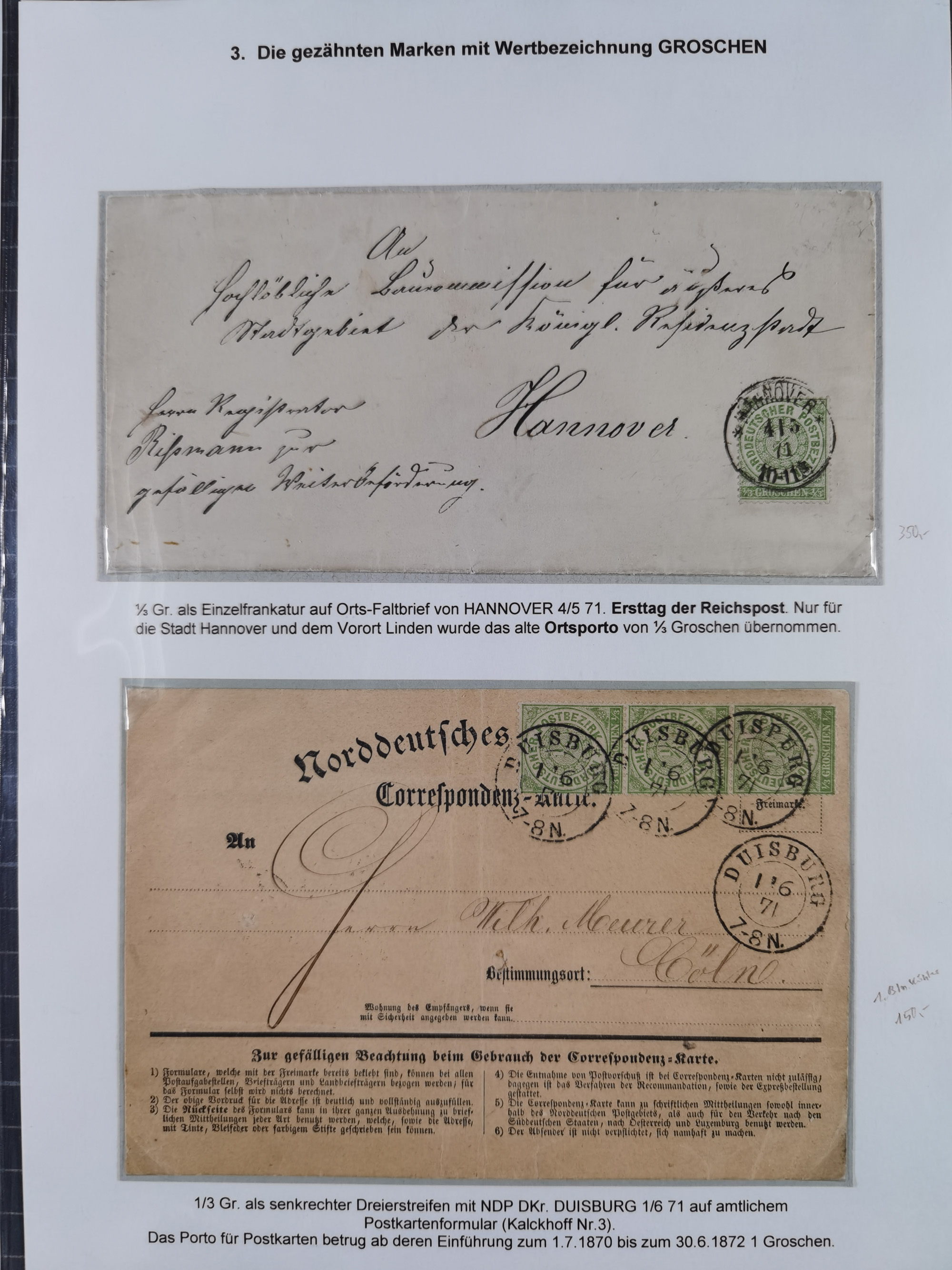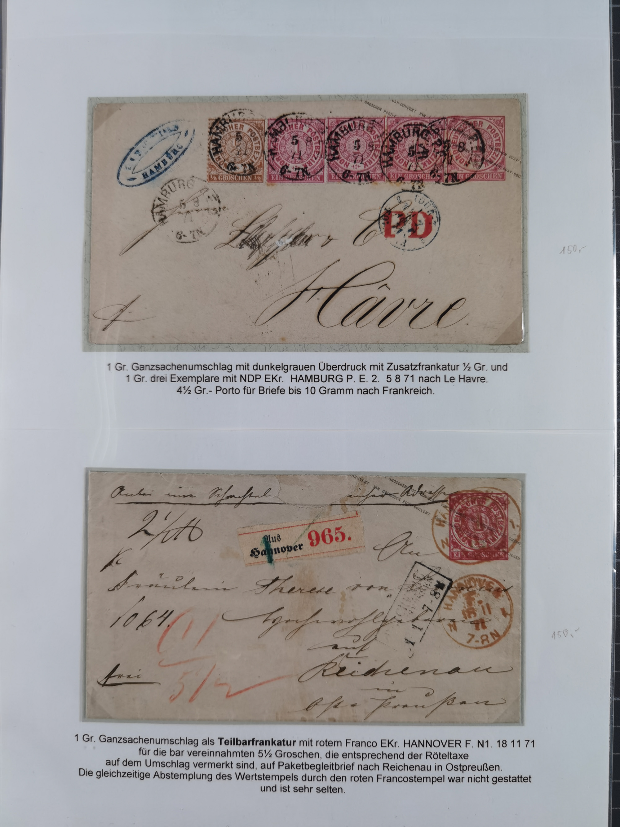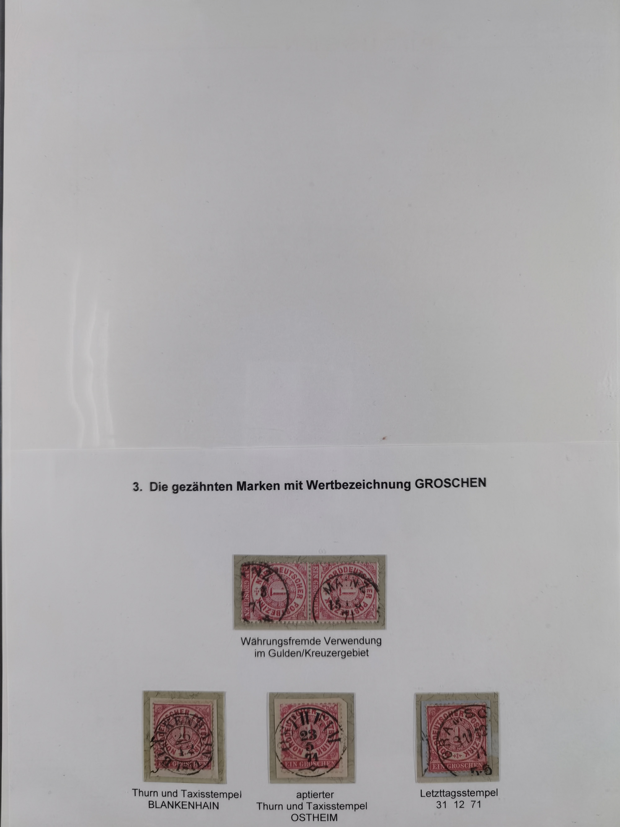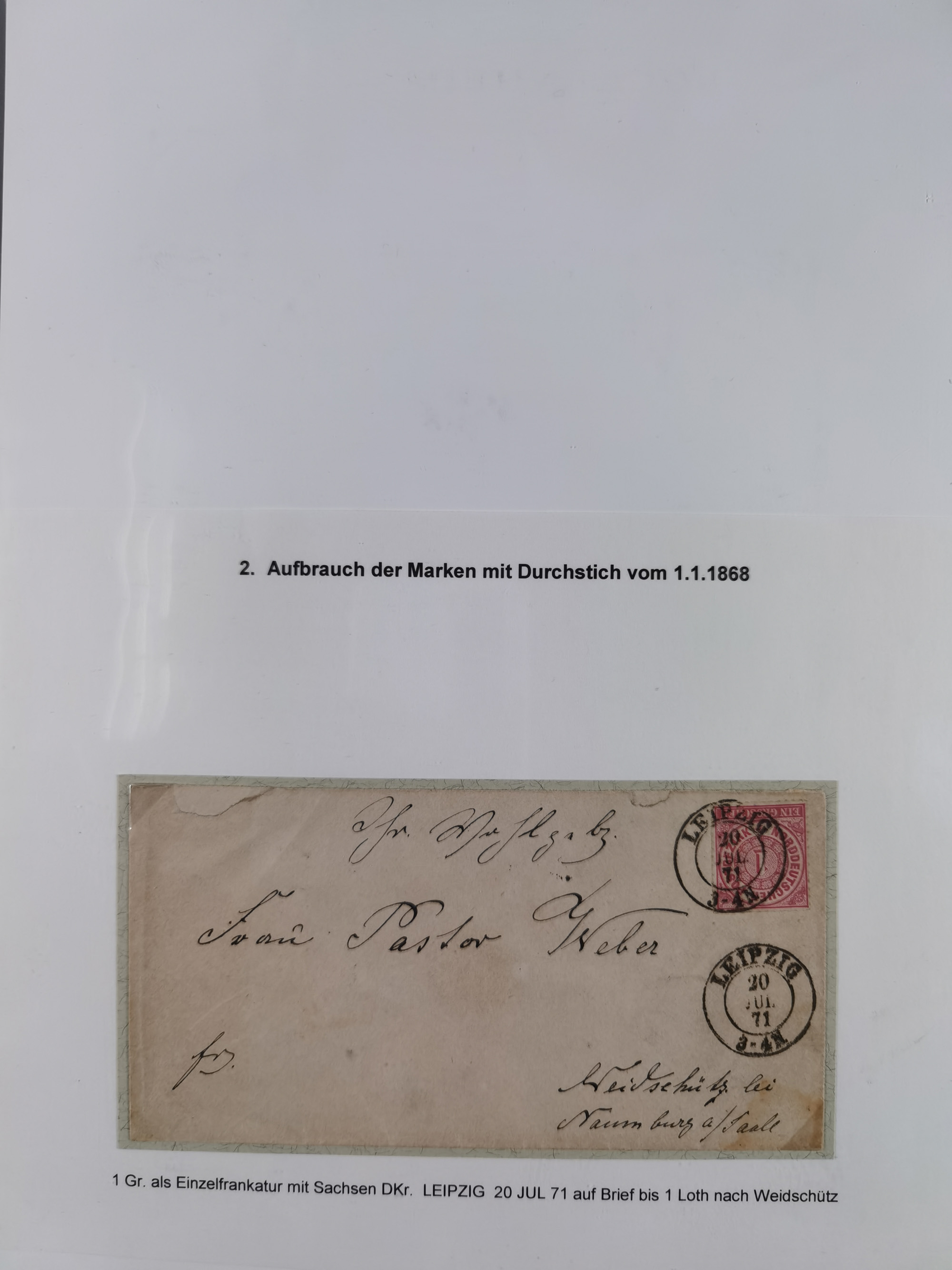 REICHSPOST-VORLÄUFER, ausstellungsmäßig aufgezogene Spezialsammlung von rund 120 Belegen und einigen losen Marken, Einheiten und Briefstücken, dabei eine Vielzahl von seltenen und besonderen Stücken, u.a. Frankaturen der durchstochenen Marken Mi. 2-4,9 und 11 (letztere u.a. MeF), Ortsbriefe und -Karten, Auslandsbriefe (dabei Drucksachen, Reco und Grenzrayon), 'Muster ohne Wert', Bücherzettel, Letzttagsbrief, Ganzsachenausschnitte auf Briefen, Eilboten, Währungsmischfrankatur, Mi. 25 als Mehrfachfrankatur und in Farbfrankatur auf Reco-Brief nach Frankreich, etc. etc. ein sehr interessantes und reichhaltiges Objekt.