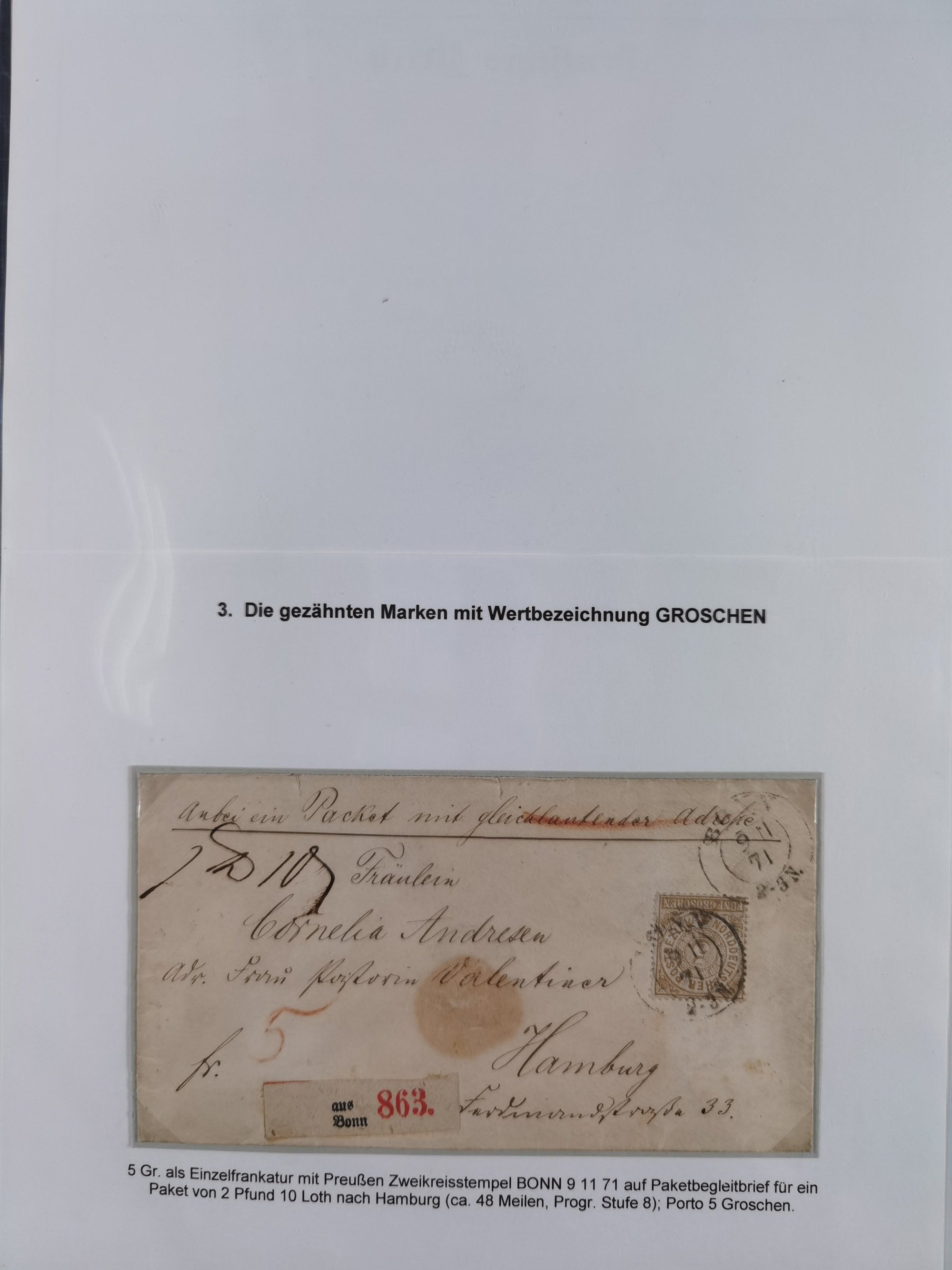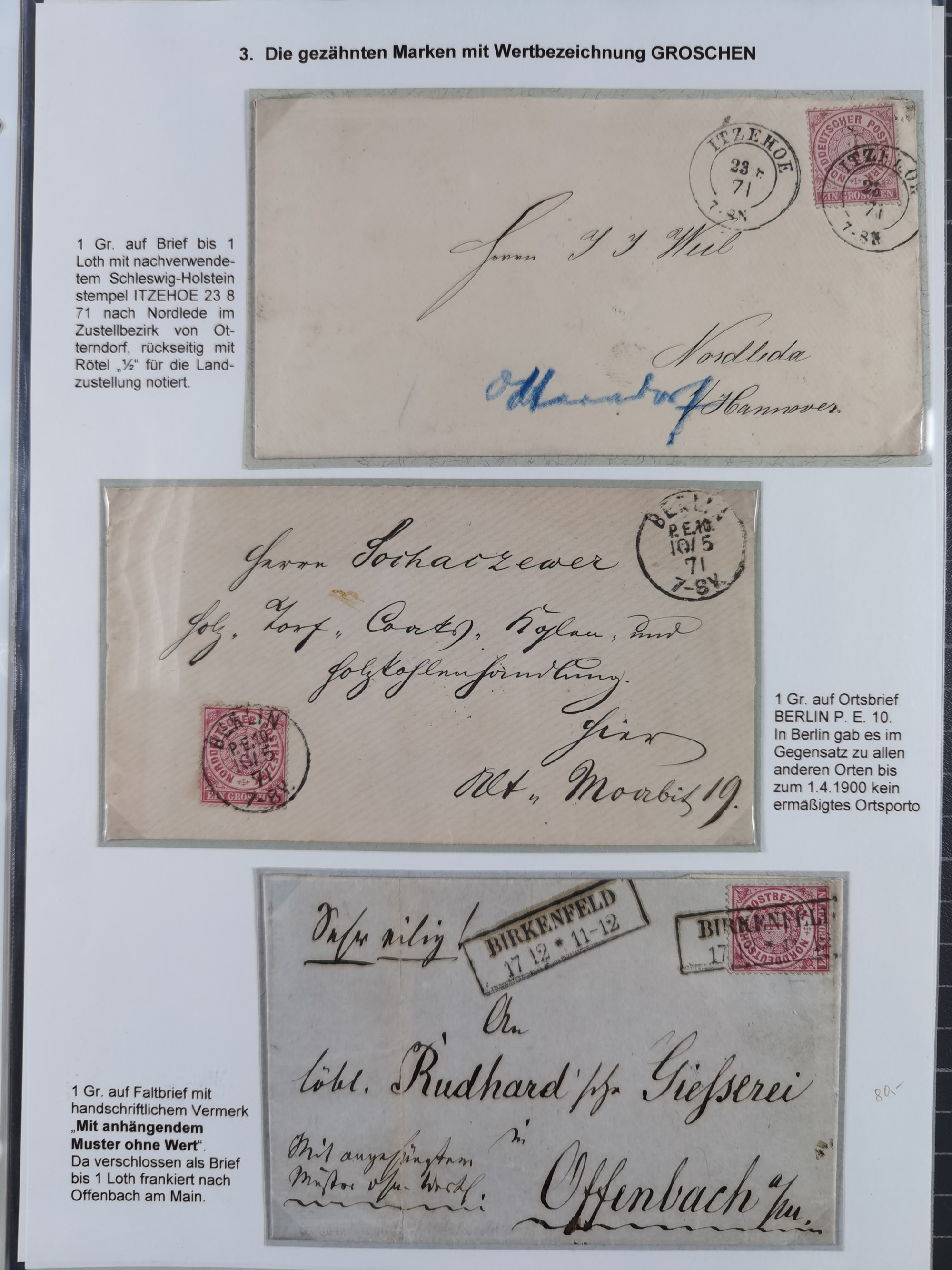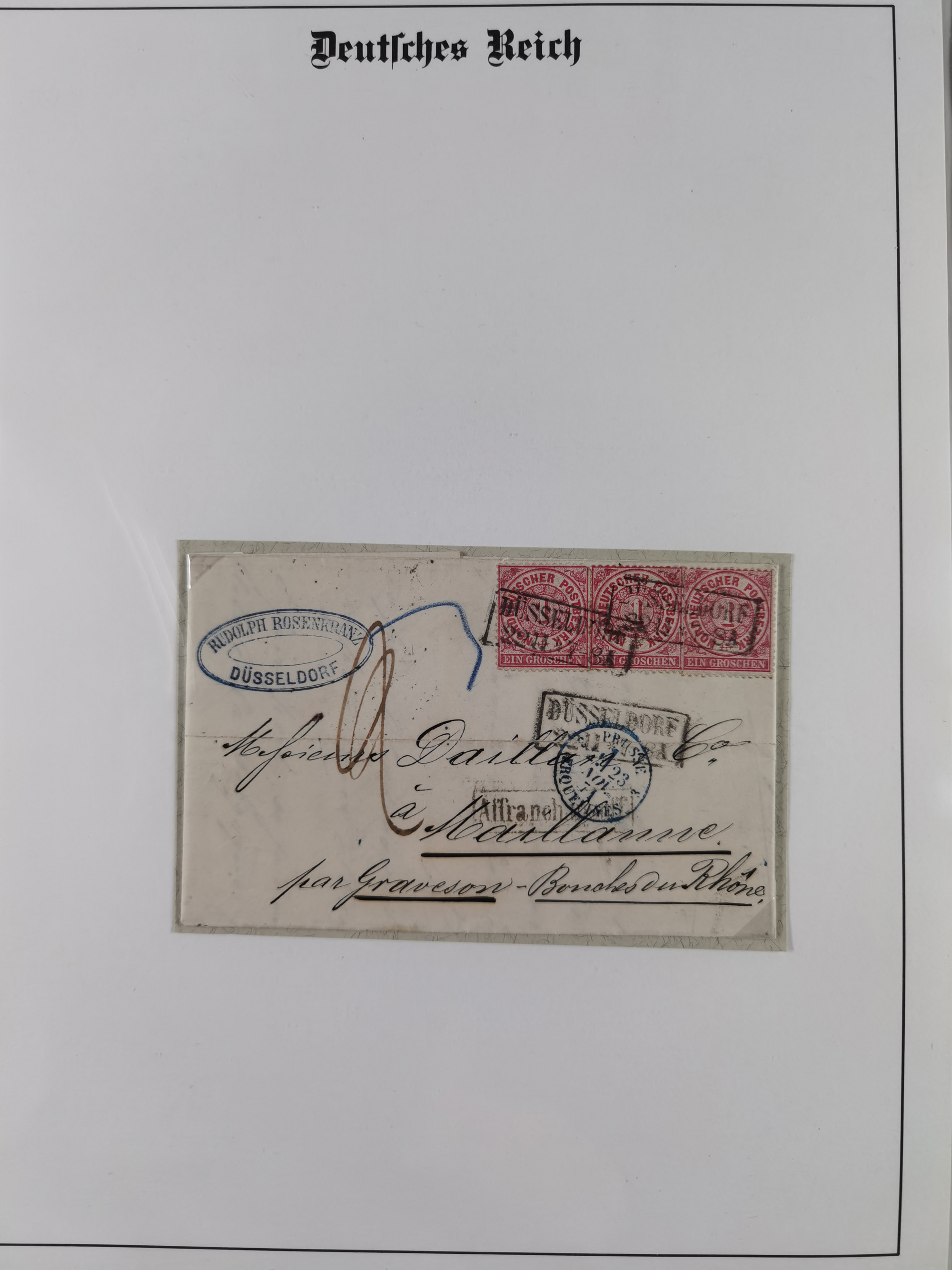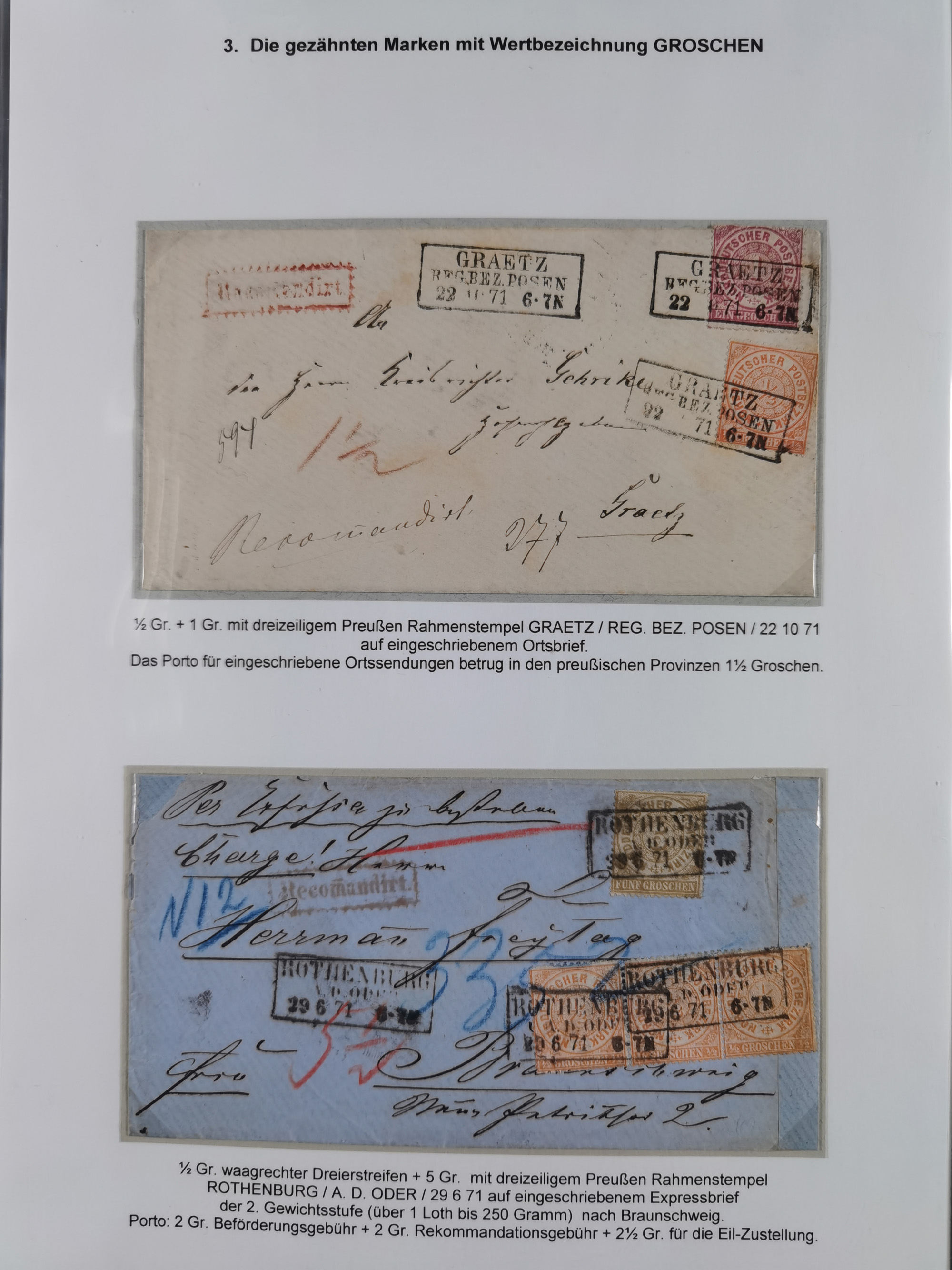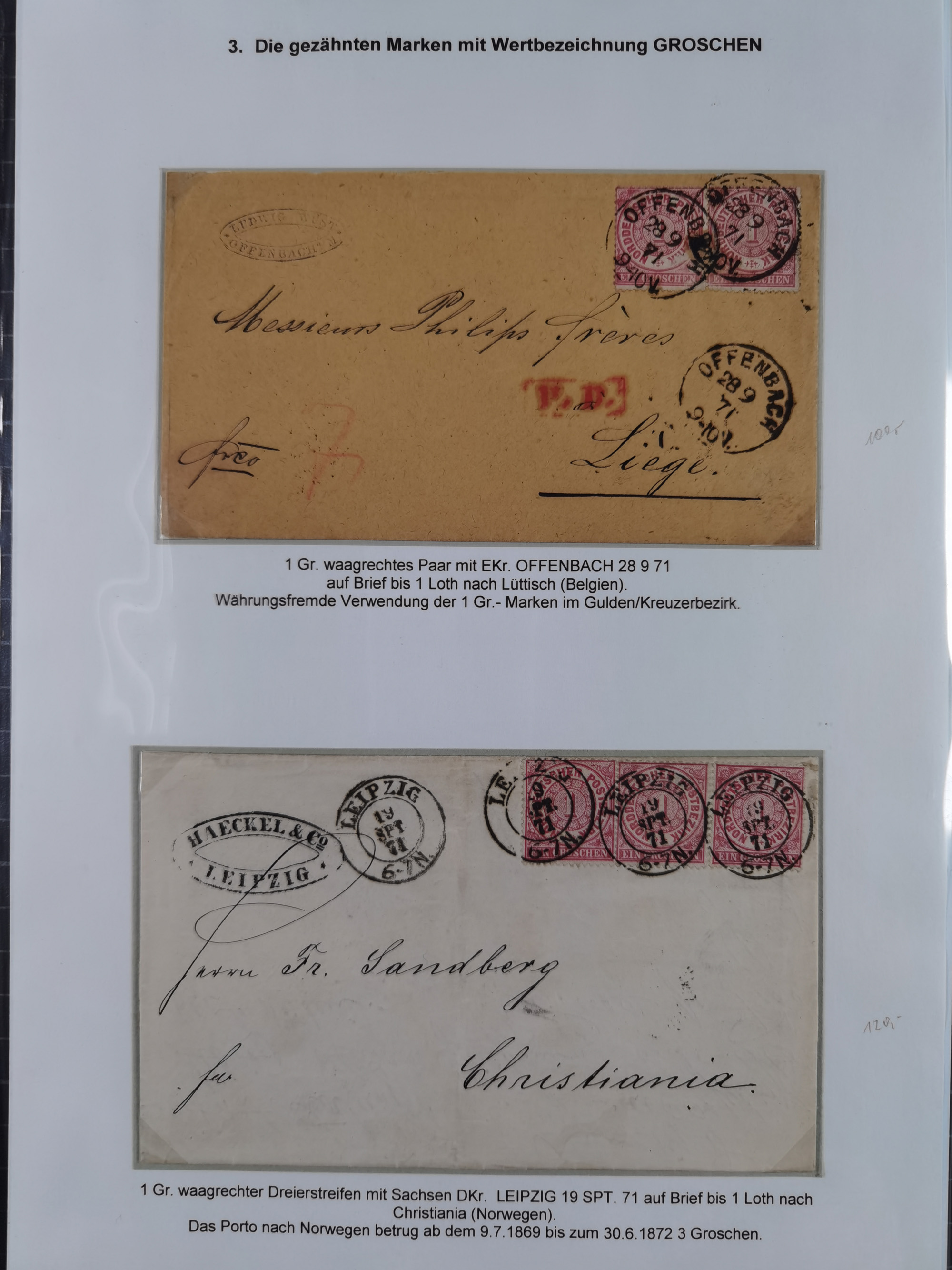 REICHSPOST-VORLÄUFER, ausstellungsmäßig aufgezogene Spezialsammlung von rund 120 Belegen und einigen losen Marken, Einheiten und Briefstücken, dabei eine Vielzahl von seltenen und besonderen Stücken, u.a. Frankaturen der durchstochenen Marken Mi. 2-4,9 und 11 (letztere u.a. MeF), Ortsbriefe und -Karten, Auslandsbriefe (dabei Drucksachen, Reco und Grenzrayon), 'Muster ohne Wert', Bücherzettel, Letzttagsbrief, Ganzsachenausschnitte auf Briefen, Eilboten, Währungsmischfrankatur, Mi. 25 als Mehrfachfrankatur und in Farbfrankatur auf Reco-Brief nach Frankreich, etc. etc. ein sehr interessantes und reichhaltiges Objekt.