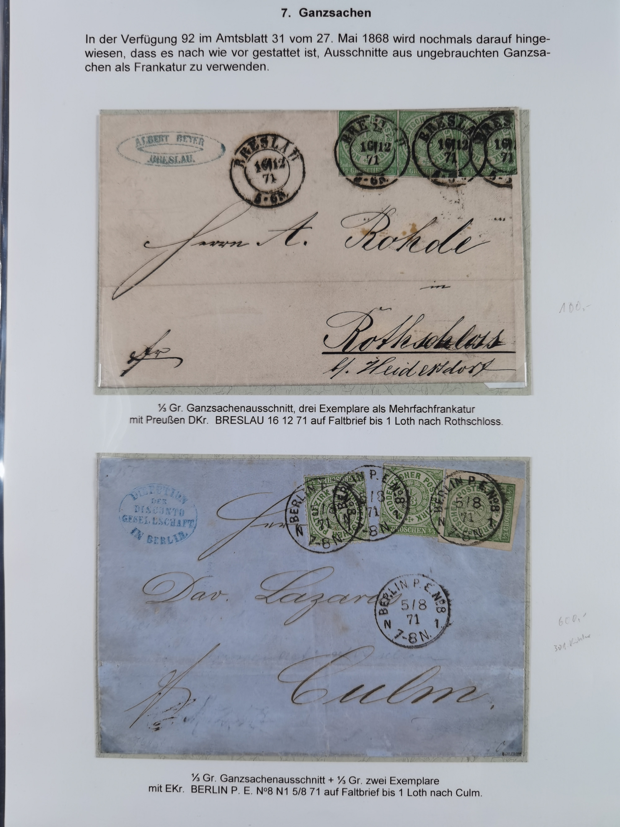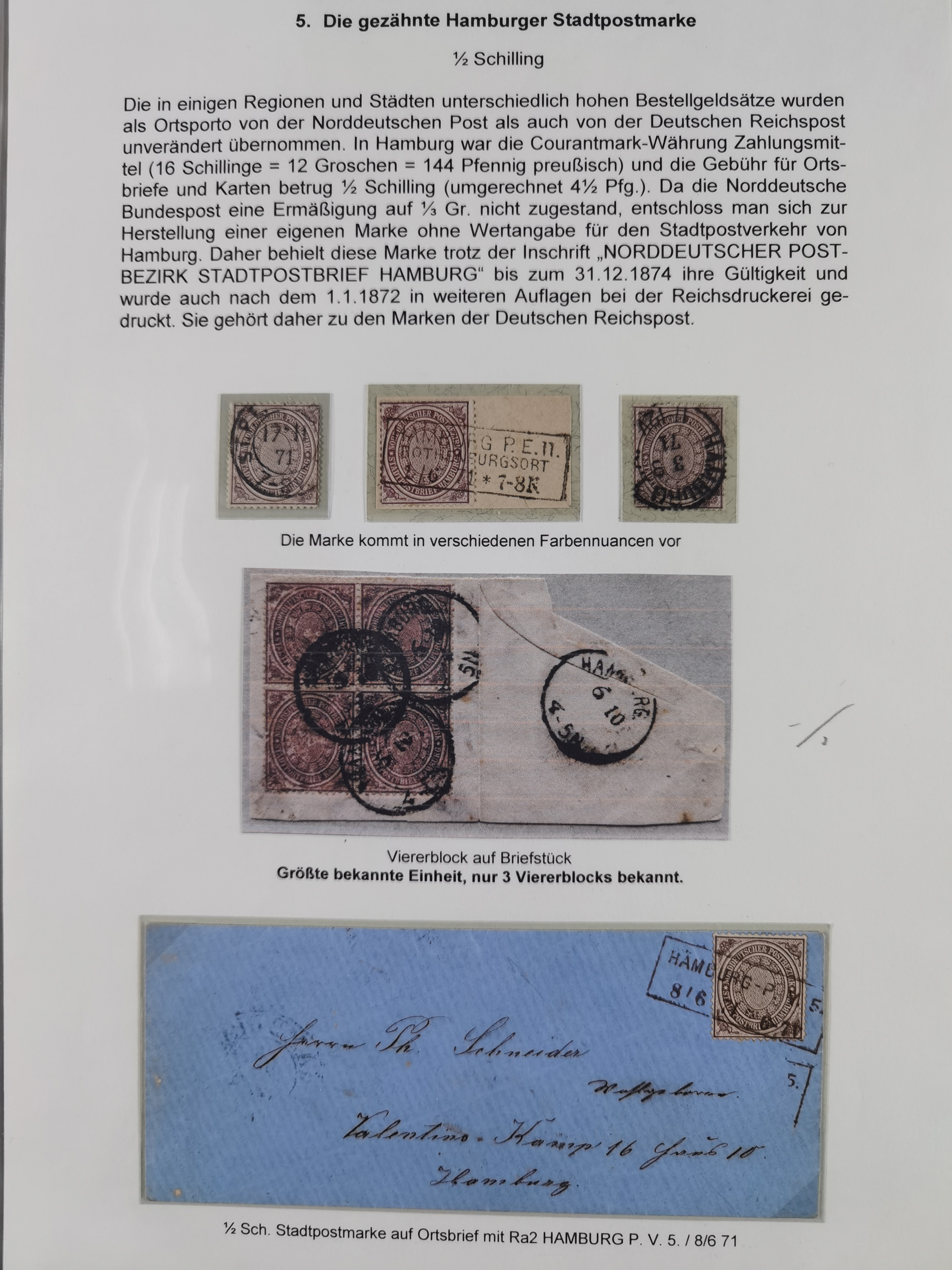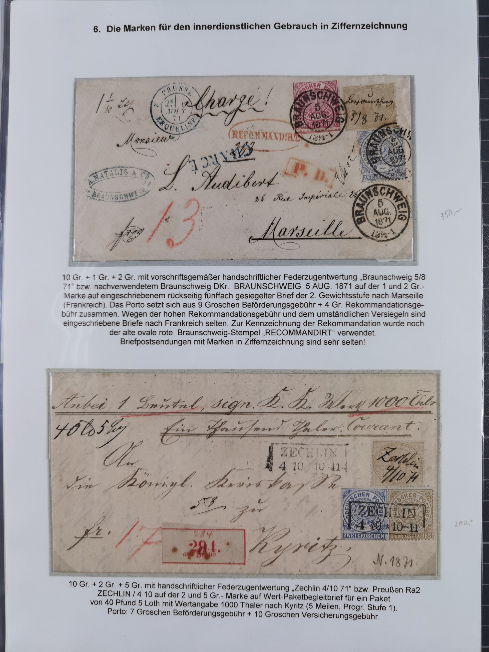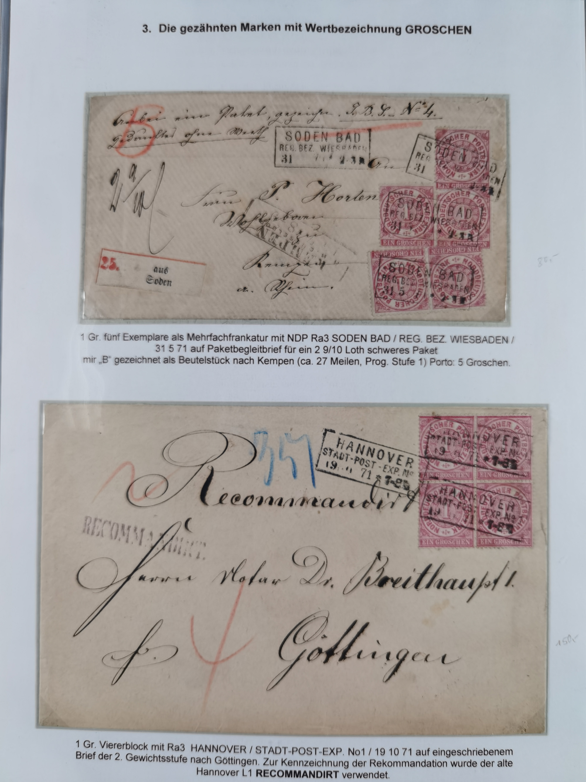 REICHSPOST-VORLÄUFER, ausstellungsmäßig aufgezogene Spezialsammlung von rund 120 Belegen und einigen losen Marken, Einheiten und Briefstücken, dabei eine Vielzahl von seltenen und besonderen Stücken, u.a. Frankaturen der durchstochenen Marken Mi. 2-4,9 und 11 (letztere u.a. MeF), Ortsbriefe und -Karten, Auslandsbriefe (dabei Drucksachen, Reco und Grenzrayon), 'Muster ohne Wert', Bücherzettel, Letzttagsbrief, Ganzsachenausschnitte auf Briefen, Eilboten, Währungsmischfrankatur, Mi. 25 als Mehrfachfrankatur und in Farbfrankatur auf Reco-Brief nach Frankreich, etc. etc. ein sehr interessantes und reichhaltiges Objekt.