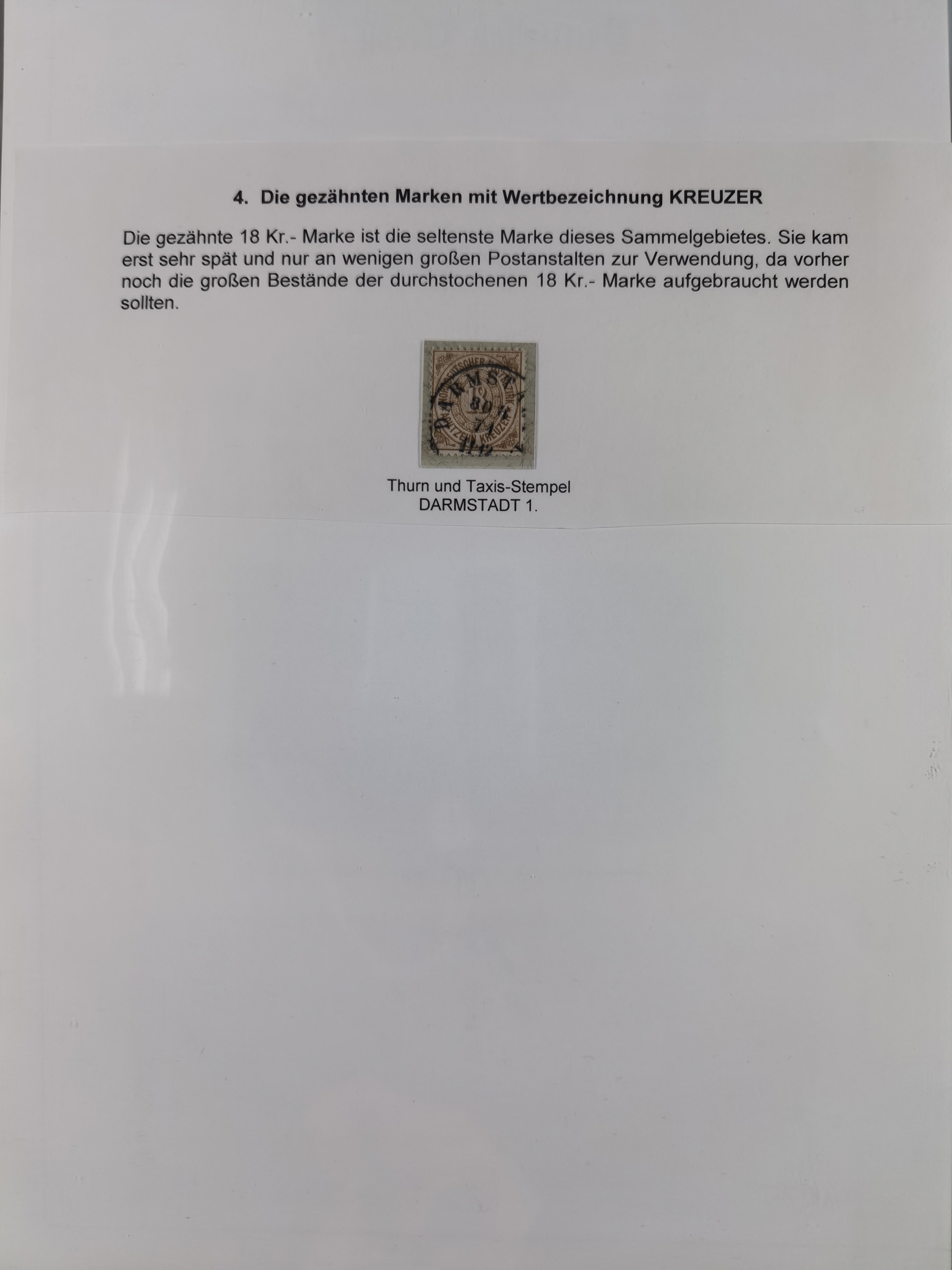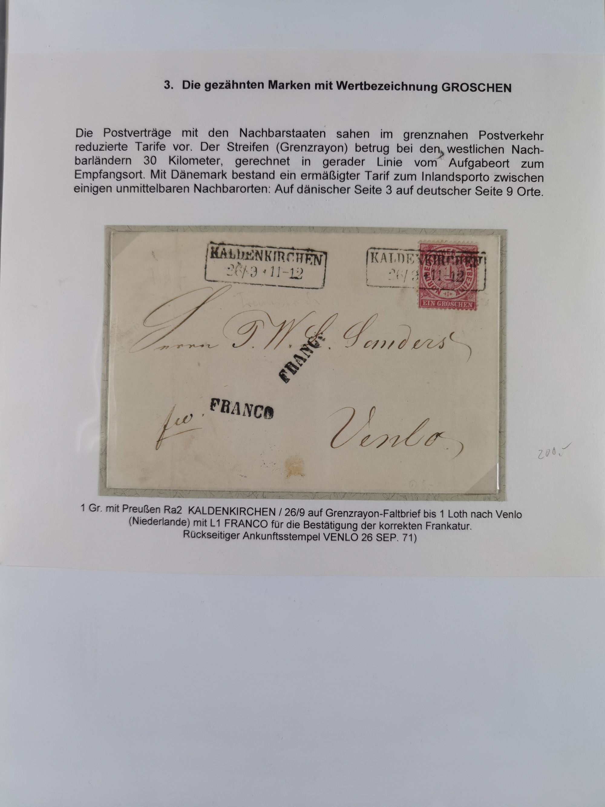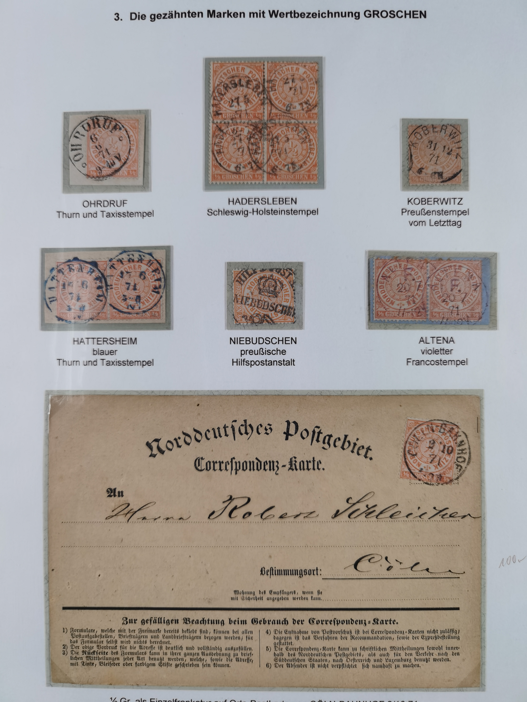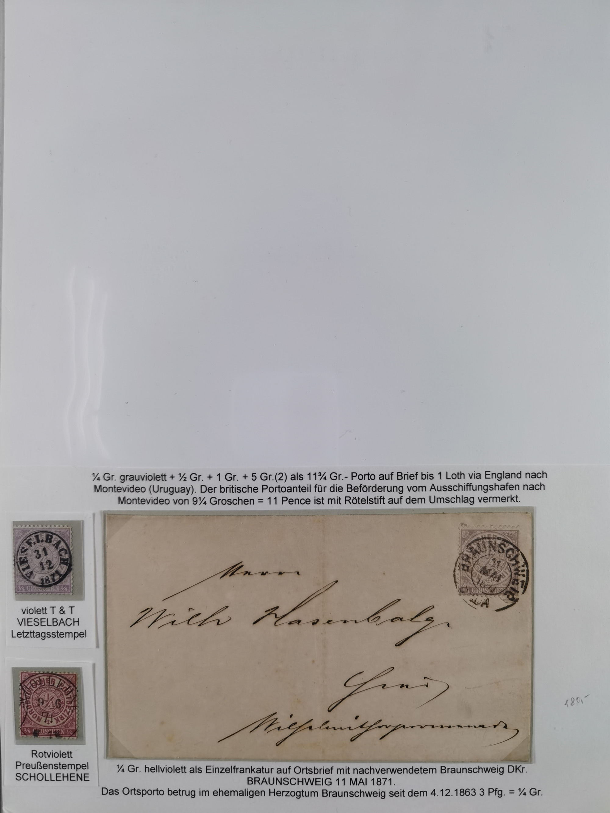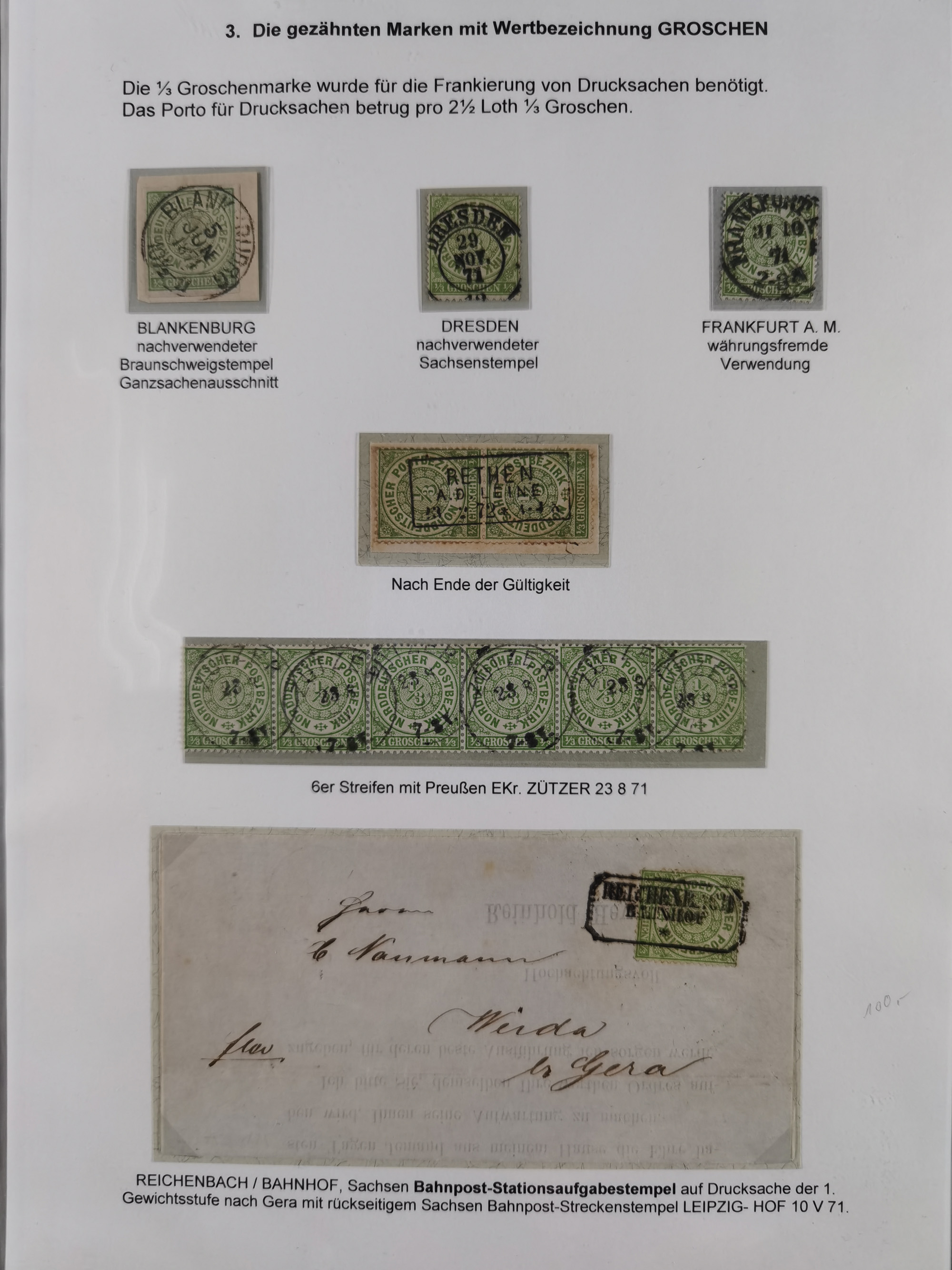 REICHSPOST-VORLÄUFER, ausstellungsmäßig aufgezogene Spezialsammlung von rund 120 Belegen und einigen losen Marken, Einheiten und Briefstücken, dabei eine Vielzahl von seltenen und besonderen Stücken, u.a. Frankaturen der durchstochenen Marken Mi. 2-4,9 und 11 (letztere u.a. MeF), Ortsbriefe und -Karten, Auslandsbriefe (dabei Drucksachen, Reco und Grenzrayon), 'Muster ohne Wert', Bücherzettel, Letzttagsbrief, Ganzsachenausschnitte auf Briefen, Eilboten, Währungsmischfrankatur, Mi. 25 als Mehrfachfrankatur und in Farbfrankatur auf Reco-Brief nach Frankreich, etc. etc. ein sehr interessantes und reichhaltiges Objekt.