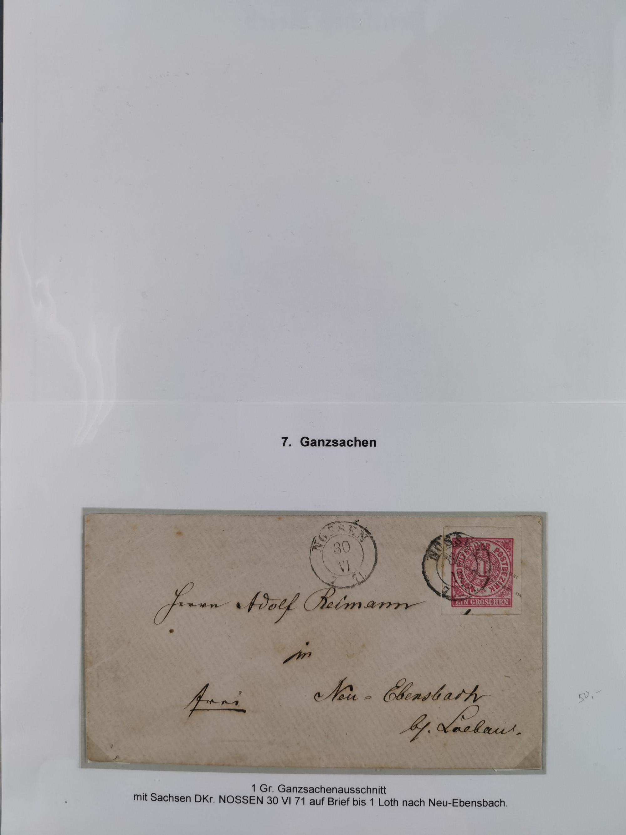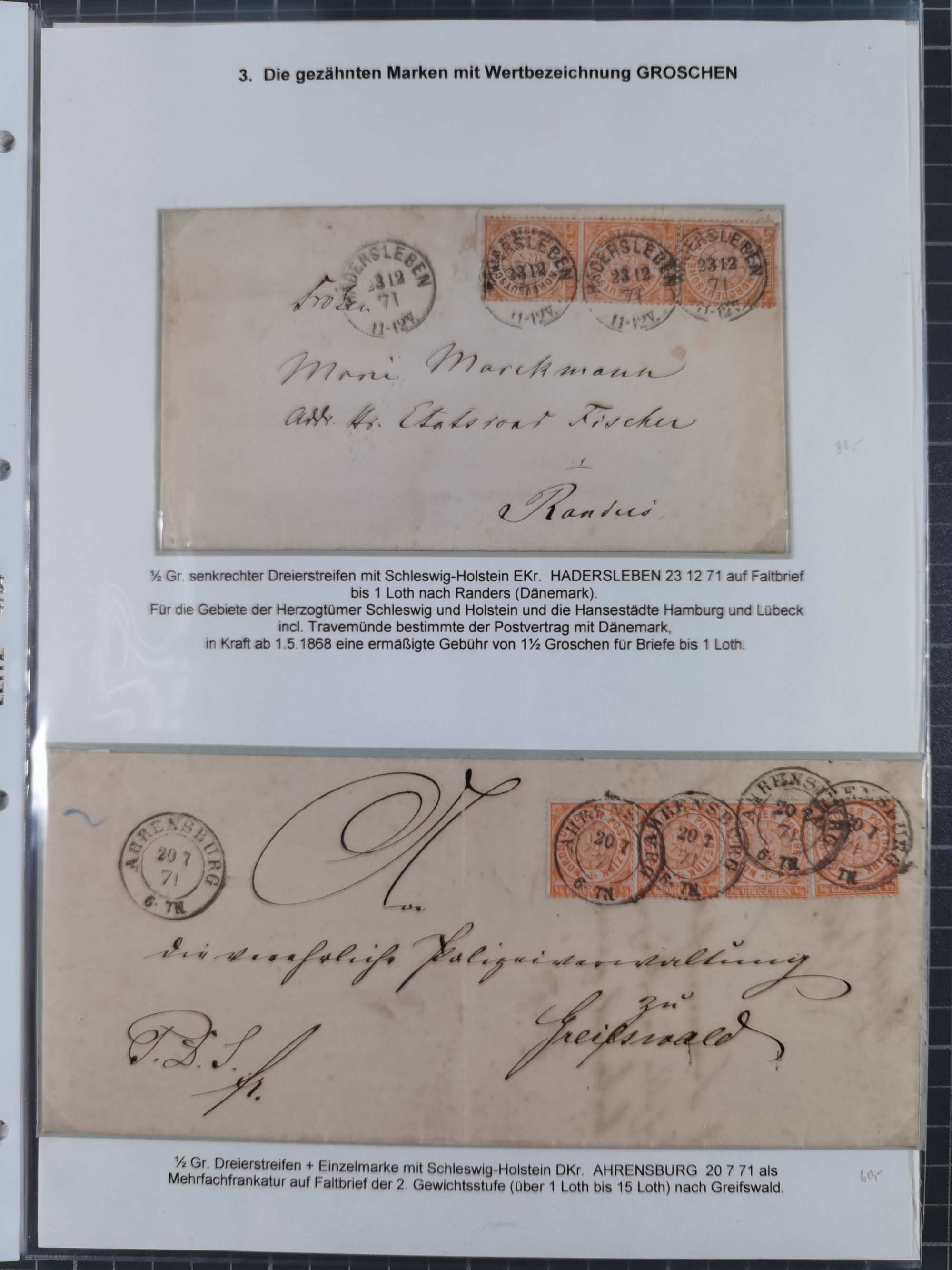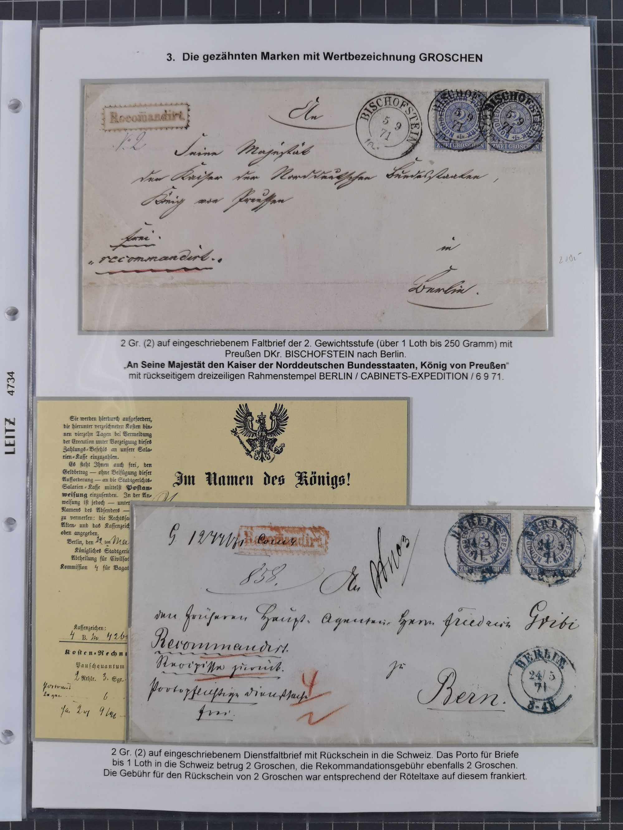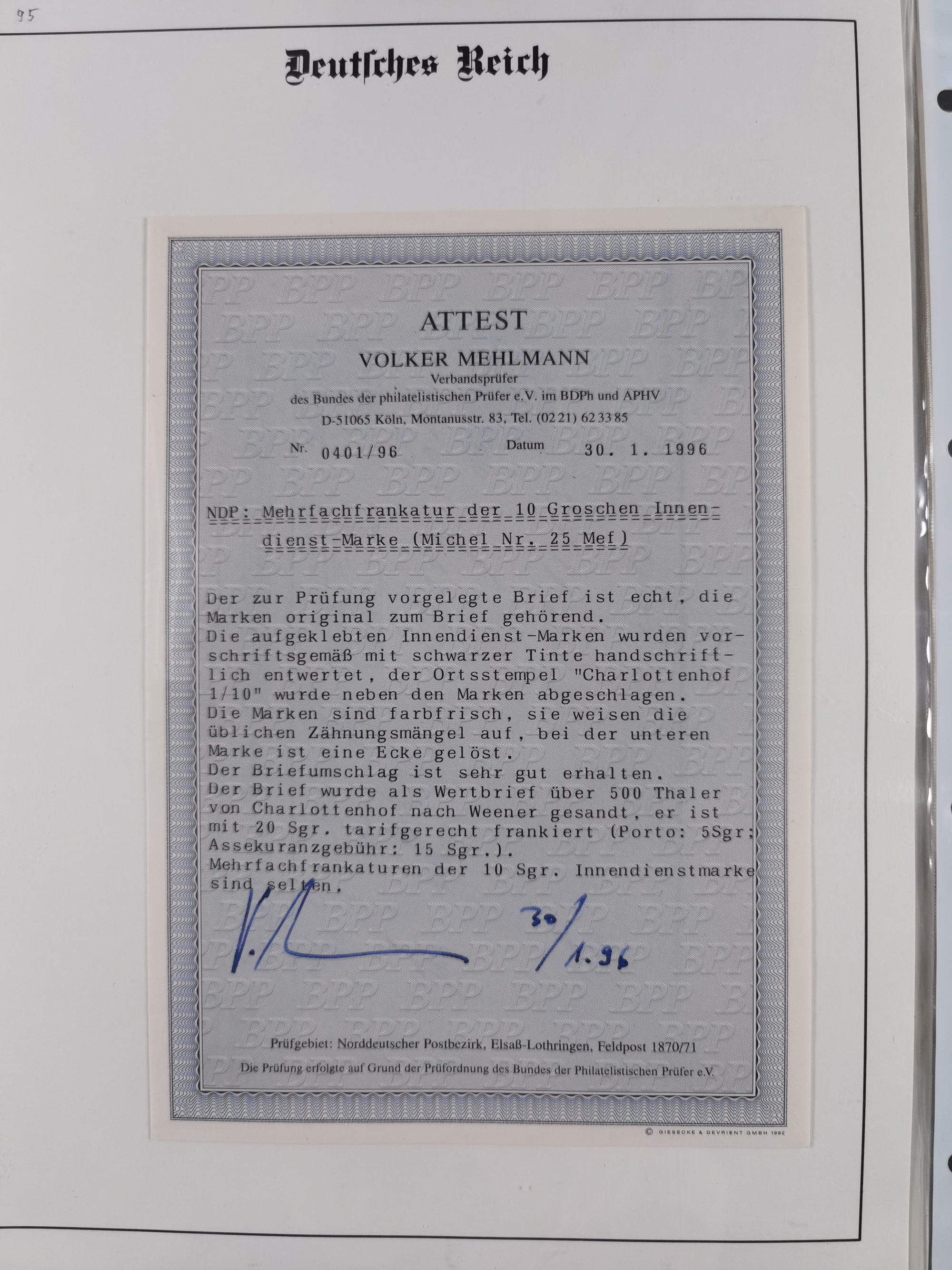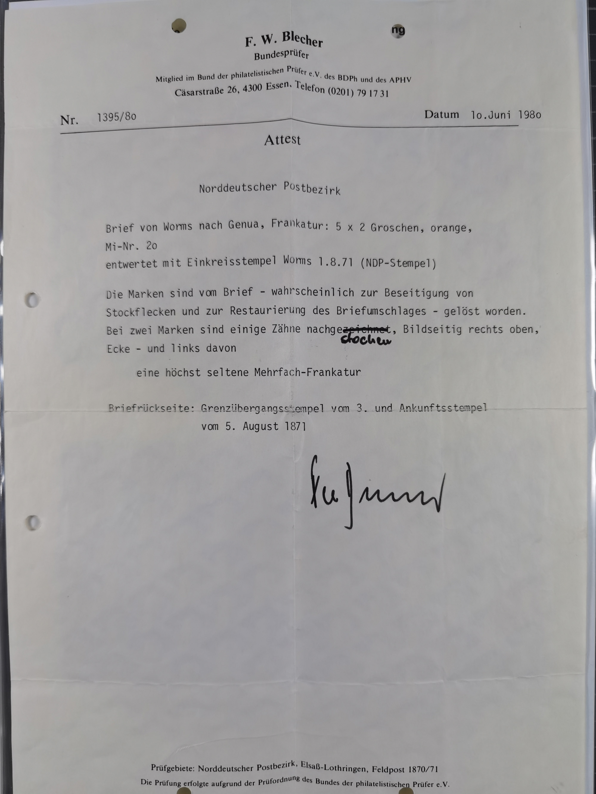 REICHSPOST-VORLÄUFER, ausstellungsmäßig aufgezogene Spezialsammlung von rund 120 Belegen und einigen losen Marken, Einheiten und Briefstücken, dabei eine Vielzahl von seltenen und besonderen Stücken, u.a. Frankaturen der durchstochenen Marken Mi. 2-4,9 und 11 (letztere u.a. MeF), Ortsbriefe und -Karten, Auslandsbriefe (dabei Drucksachen, Reco und Grenzrayon), 'Muster ohne Wert', Bücherzettel, Letzttagsbrief, Ganzsachenausschnitte auf Briefen, Eilboten, Währungsmischfrankatur, Mi. 25 als Mehrfachfrankatur und in Farbfrankatur auf Reco-Brief nach Frankreich, etc. etc. ein sehr interessantes und reichhaltiges Objekt.