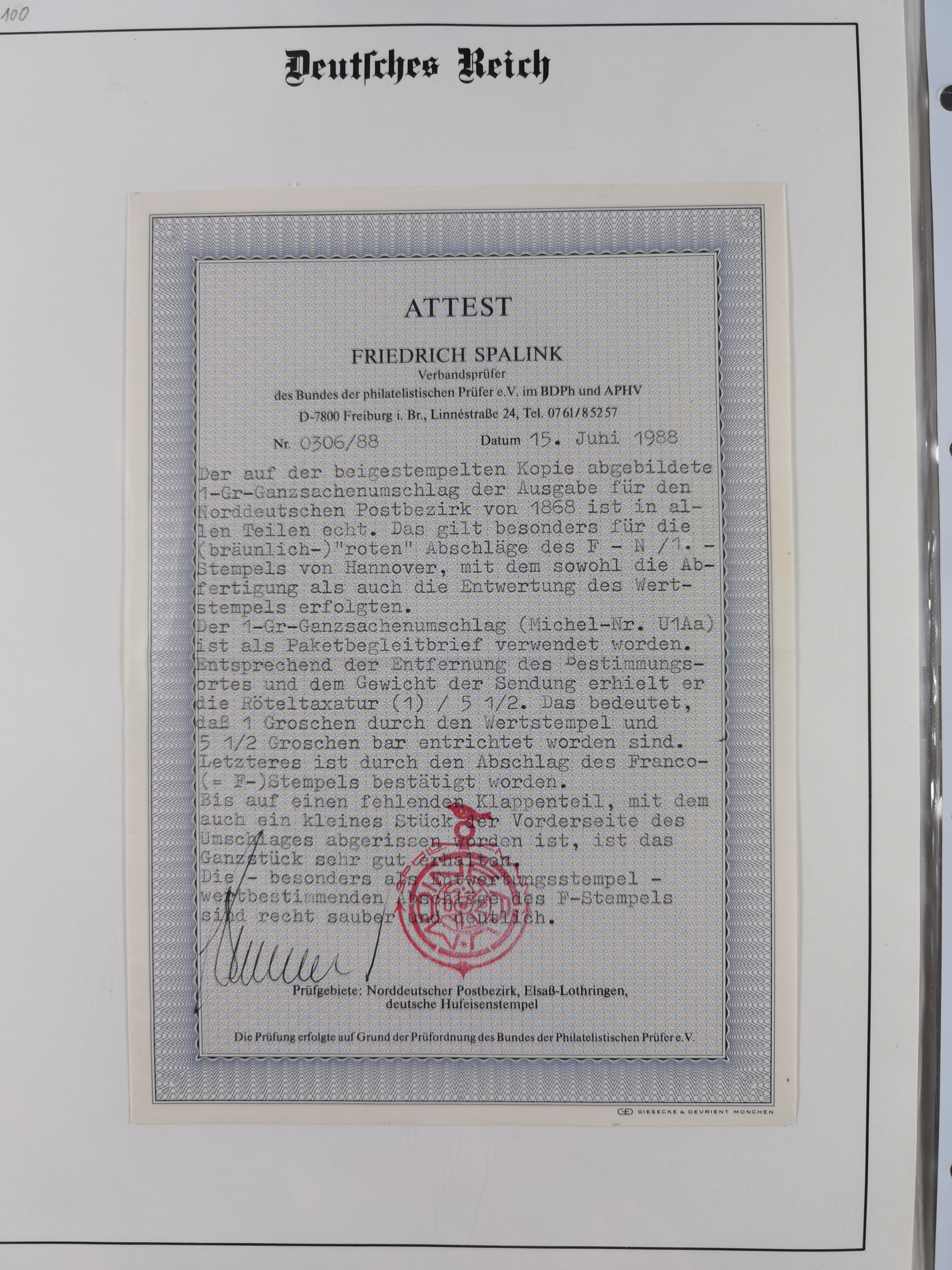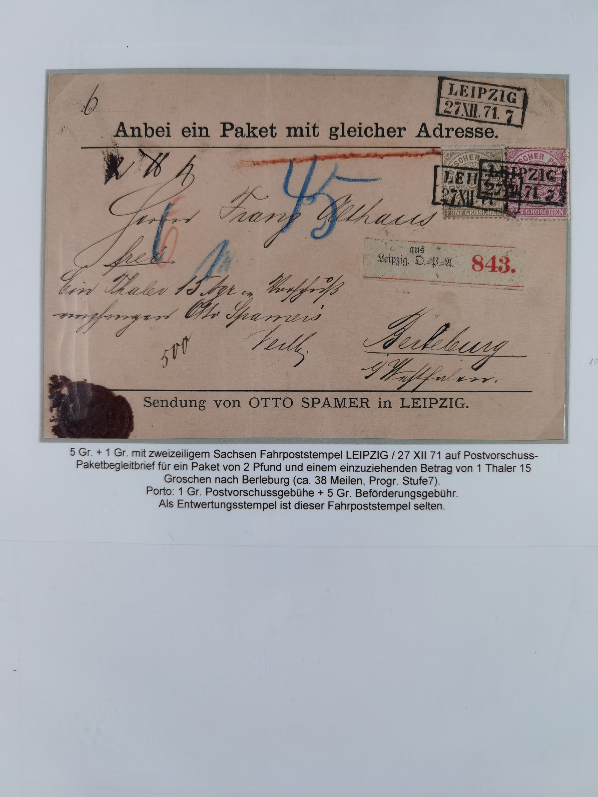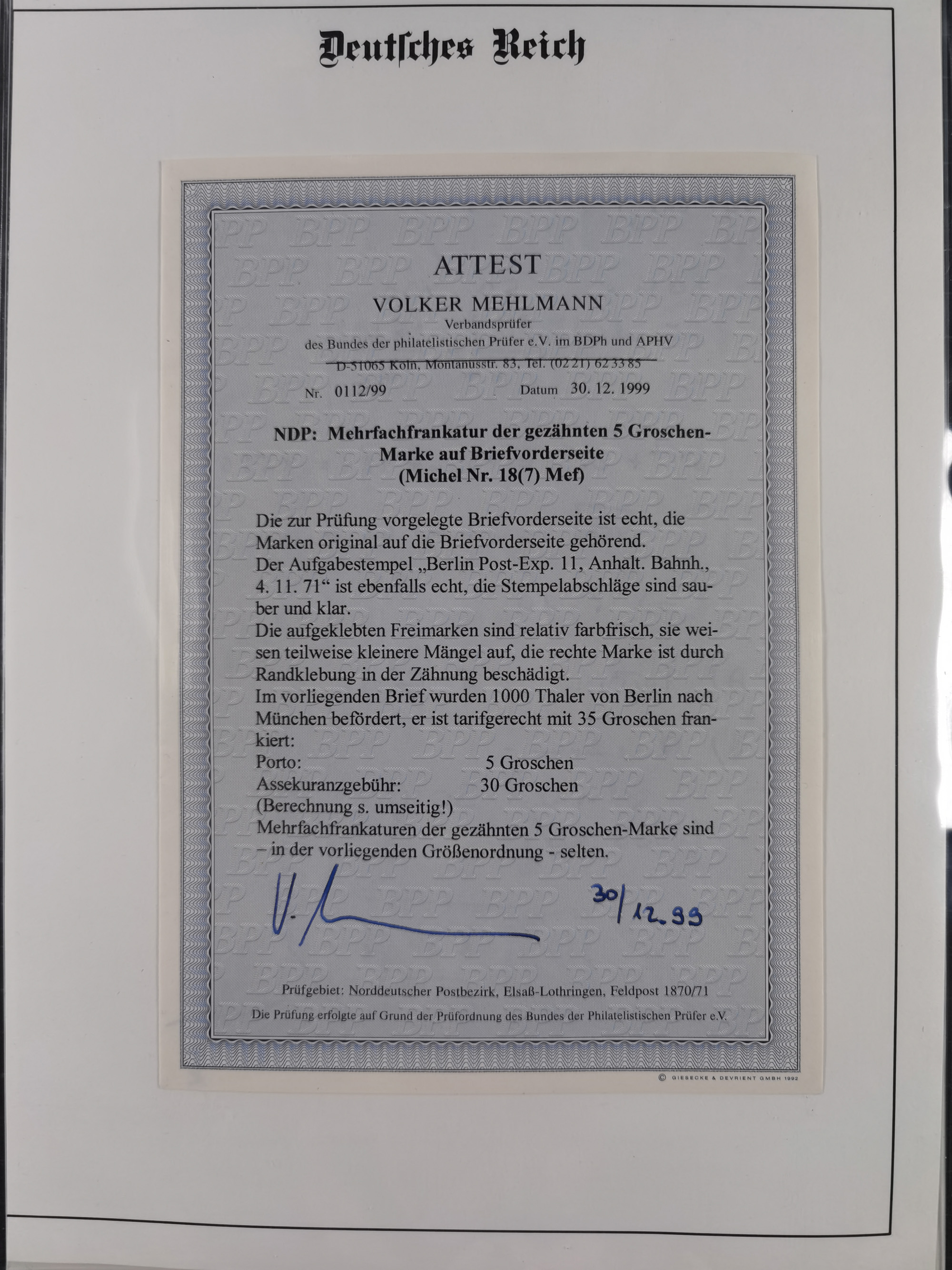 1 Gr. karmin, 2 Einzelwerte in unterschiedlichen Nuancen, davon eine fehlerhaft aufgeklebt (Portmonee-Marke), mit 3 Werten 5 Gr. ocker, mit sauber auf- und nebengesetztem Letzttags-Hannover-DKr. "HANKENSBÜTTEL 31 12" auf Paketbegleitbrief für 2 Pakete nach Uelzen, mit vorder- und rückseitigen Ankunftsstempel vom Ersttag der Reichspostausgaben. Ein ganz außergewöhnliches Belegstück für den Übergang der NDP- in die Reichs-Post. Fotoattest Mehlmann BPP (1993)