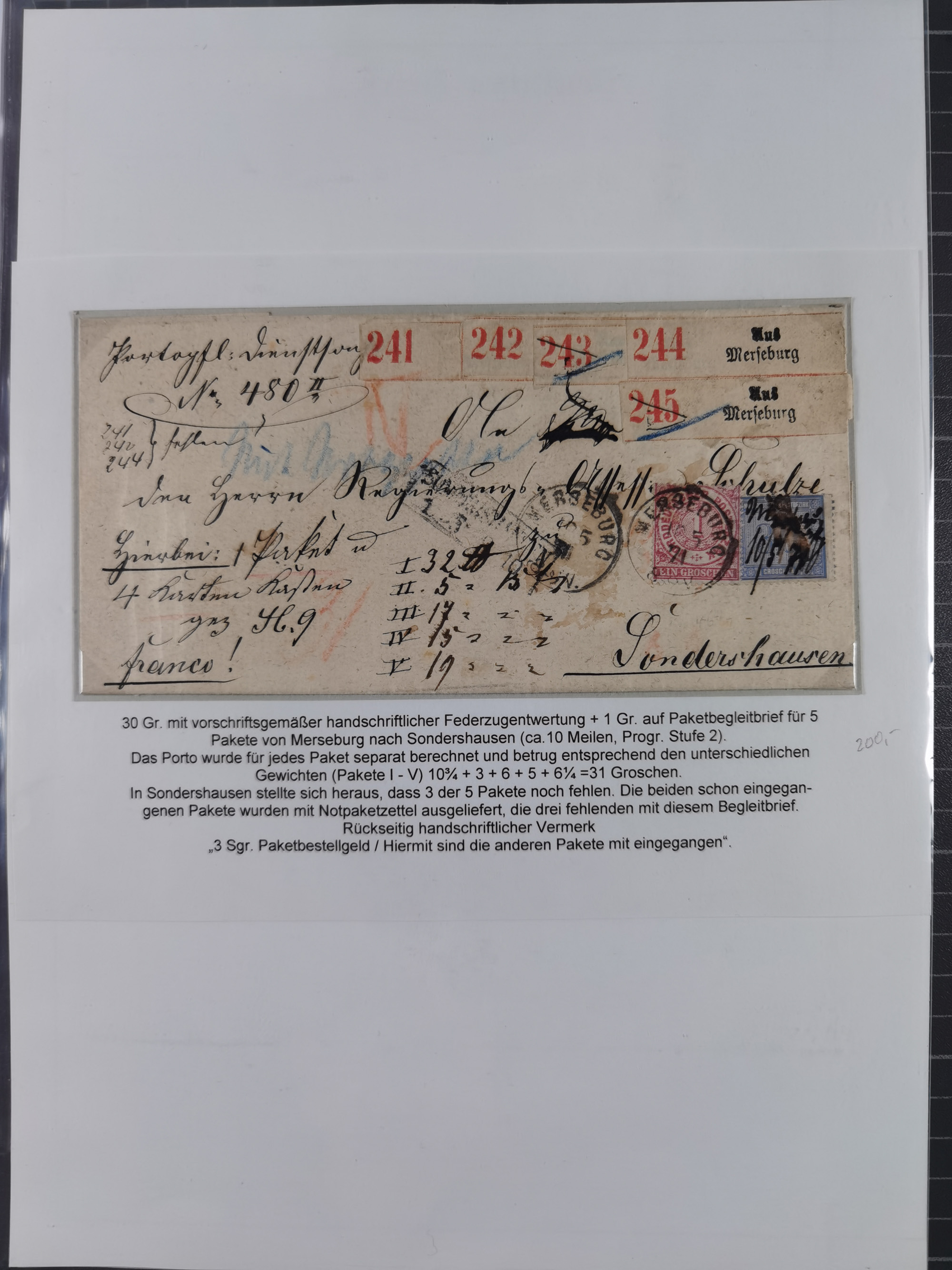 “MAGDEBURG 13.MÄRZ.68” (Spalink 23) mehrfach klar auf drei Einzelmarken Norddeutscher Postbezirk 1 Gr. durchstochen als tarifgerechte Mehrfachfrankatur auf Paketbegleit-Briefkuvert für ein 3 Pfund ⅔ Loth schweres Paket nach Nordhausen mit Ausgabestempel. Die farbfrischen Marken sind bis auf die linke untere Marke in einwandfreier Erhaltung, der Umschlag ist rückseitig nicht ganz komplett. Trotz dieser Einschränkungen eine außergewöhnliche Verwendung mit diesem auf frankierter Post äußerst seltenen Hufeisenstempel, signiert Spalink BPP mit Fotoattest (1987)