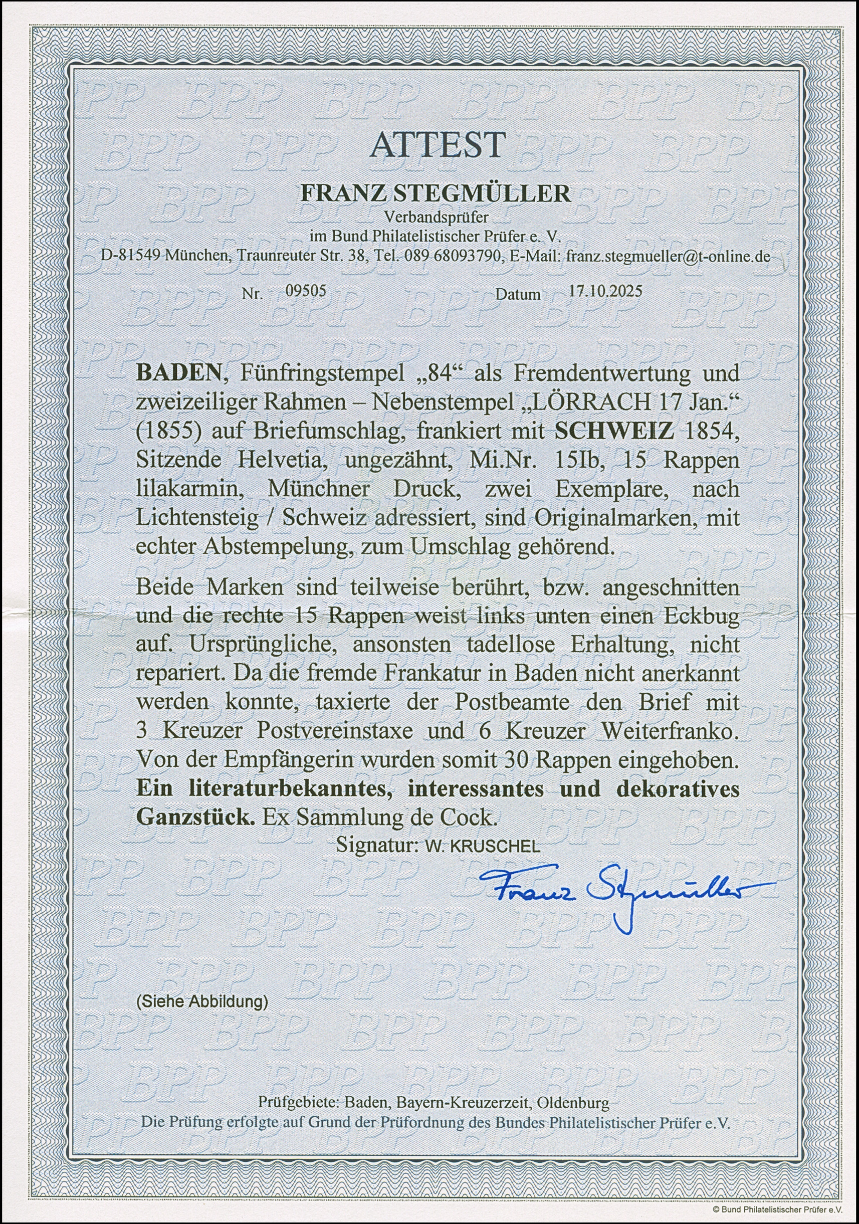 "84" LÖRRACH als Fremdentwertung auf zwei Einzelwerten Schweiz Strubel, Münchener Druck, 15 Rp. Lilakarmin, auf Briefkuvert nach Lichtensteig im Schweizer Kanton St. Gallen. Obwohl die Frankatur entwertet wurde, wurde sie im Transit nicht anerkannt und mit 9 Kreuzern bzw. 30 Rappen taxiert. Die Frankatur kleine Beanstandungen, sonst bis auf leichte Patina einwandfrei. Ein attraktiver und interessanter Brief. Signiert Kruschel und A. de Cock, Fotoattest Stegmüller BPP (2025)