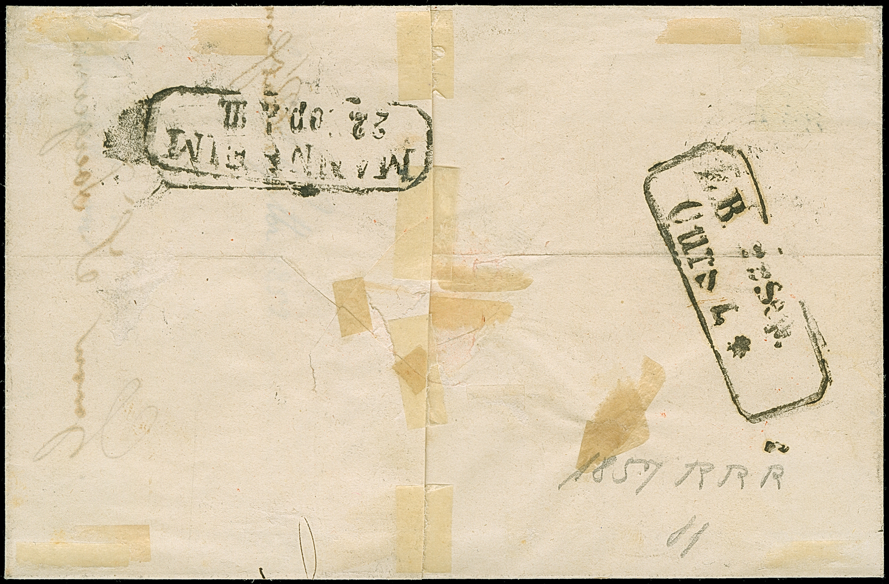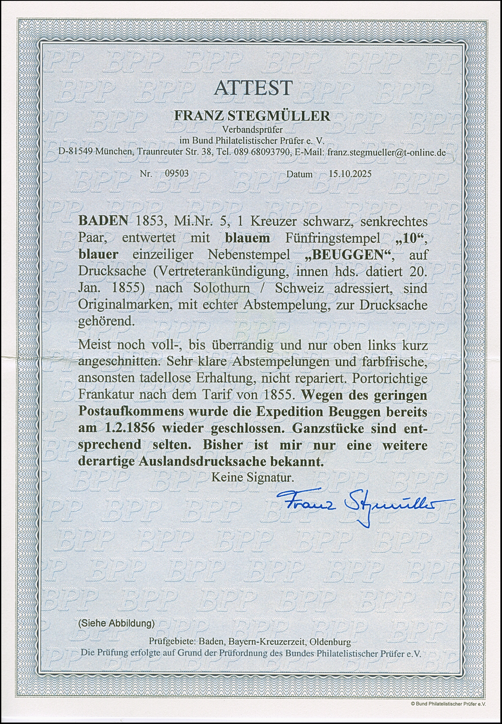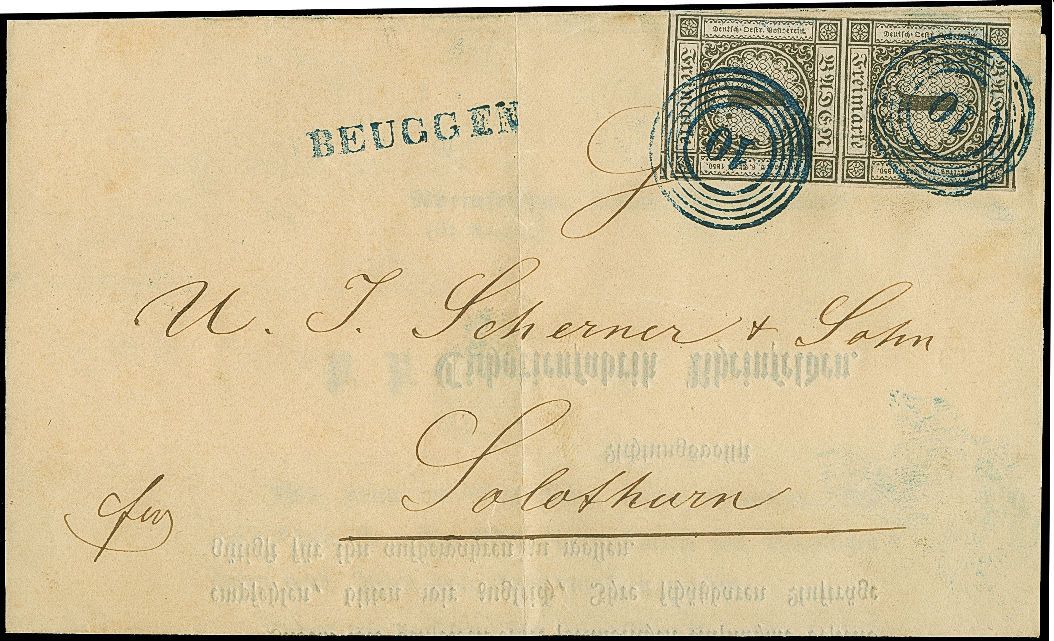 "10" in blau, zweimal klar abgeschlagen auf 1853, 1Kr. schwarz im senkrechten Paar, mit nebengesetztem blauem L1 "BEUGGEN" auf kompletter Drucksache nach Solothurn in der Schweiz, mit Ankunftsstempel vom 23.1.1855. Es sind nur wenige Belege von Beuggen registriert; es ist nur eine ähnliche Auslands-Drucksache (ex Sammlung Brodbeck) bekannt. Fotoattest Stegmüller BPP (2025)