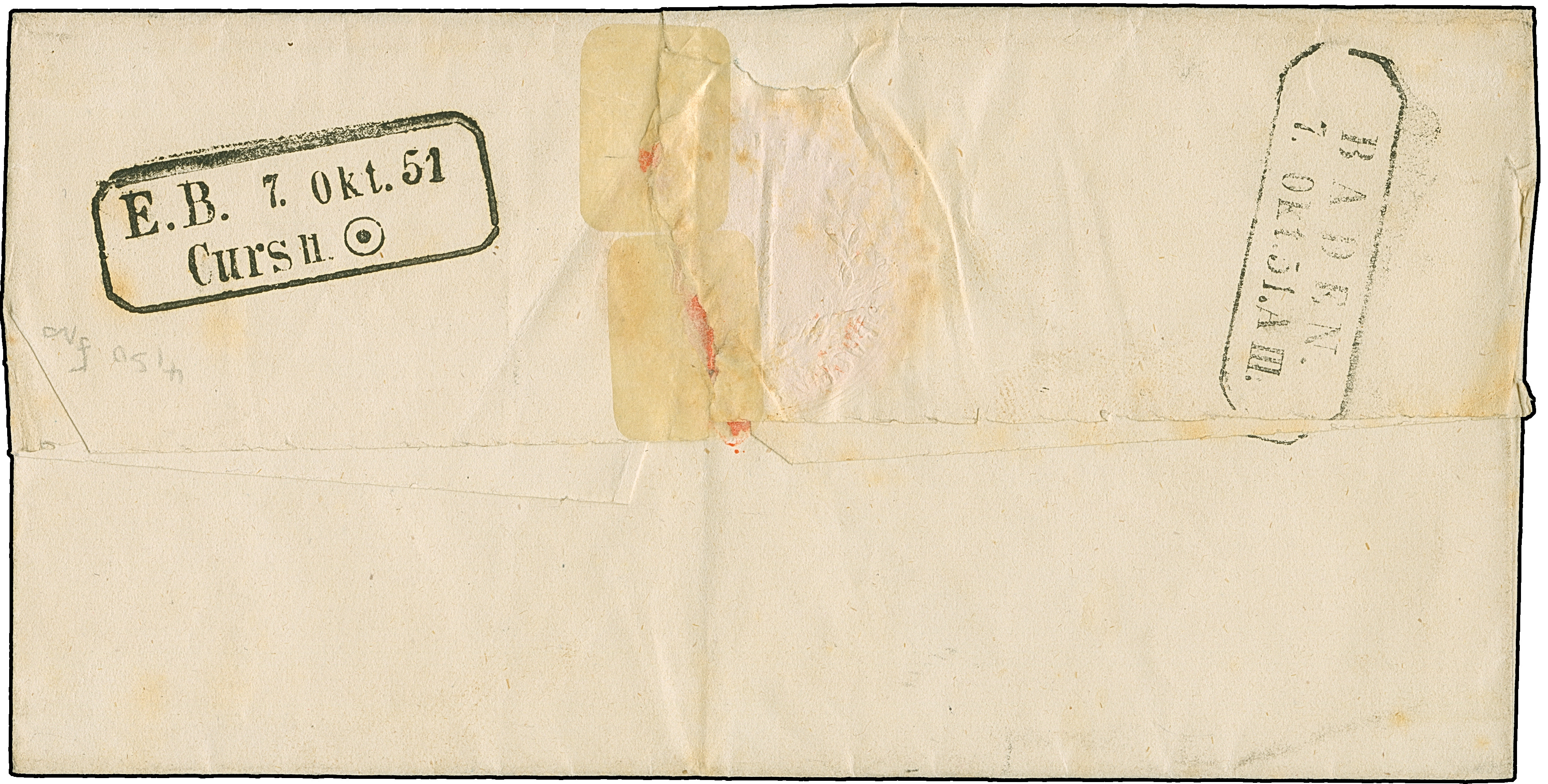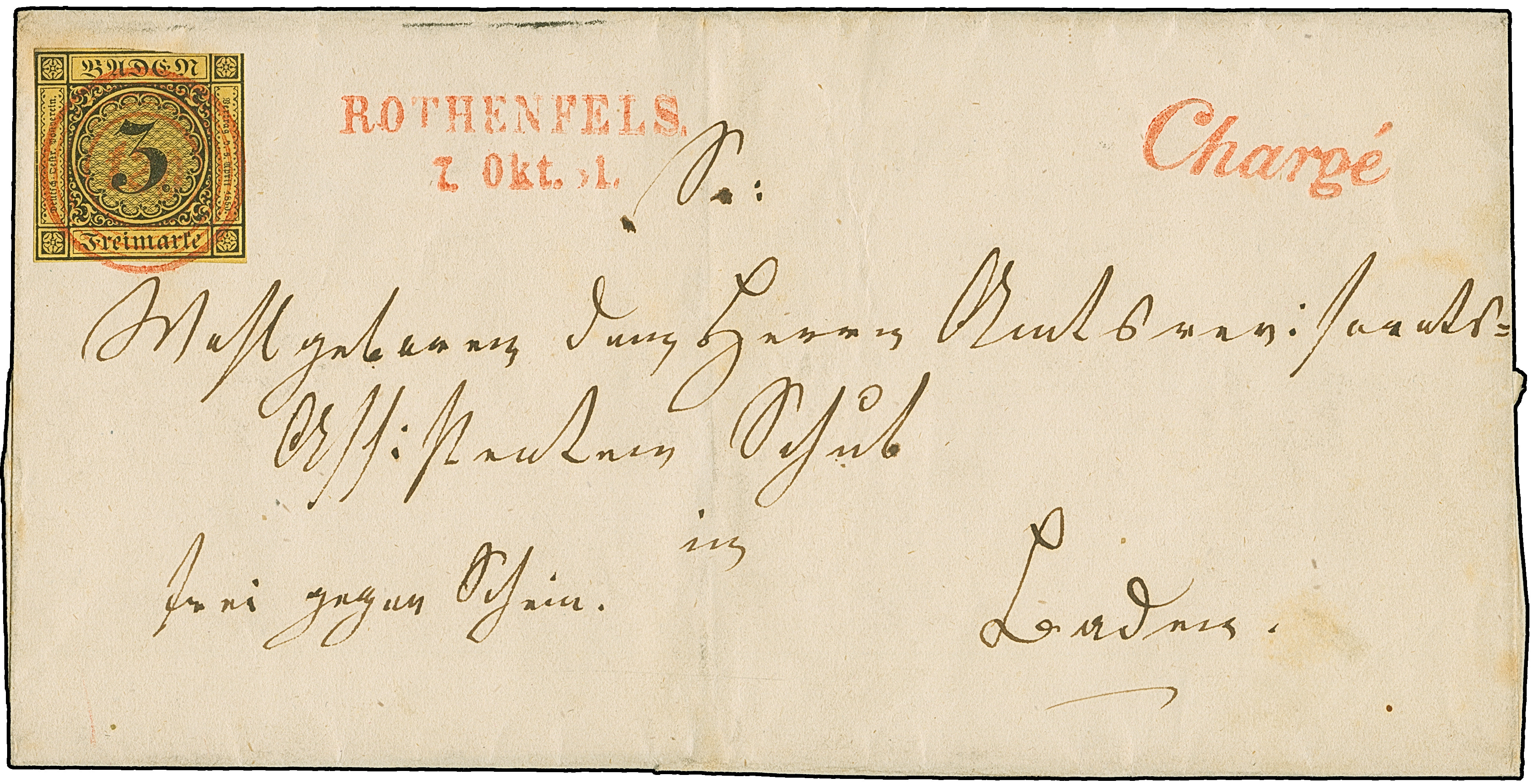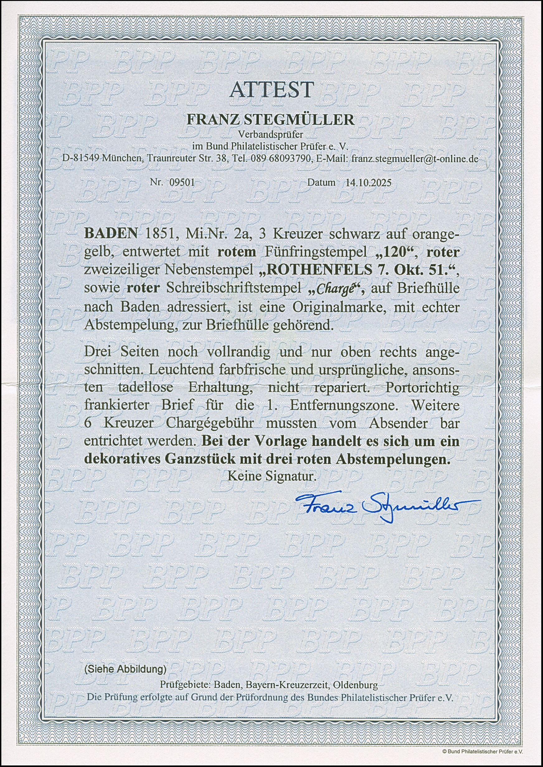 "120" in rot, klar und gerade auf 3 Kr. auf orangegelb, mit klar in rot nebengesetztem L2 "ROTHENFELS 7. Okt. 51" und Schreibschrift-L1 "Chargé" auf recommandirter Briefhülle nach Baden. Ein sehr attraktiver und seltener Brief; mit dem roten Stempel hat PROFI keinen weiteren Chargé-Brief registriert. Fotoattest Stegmüller BPP (2025)