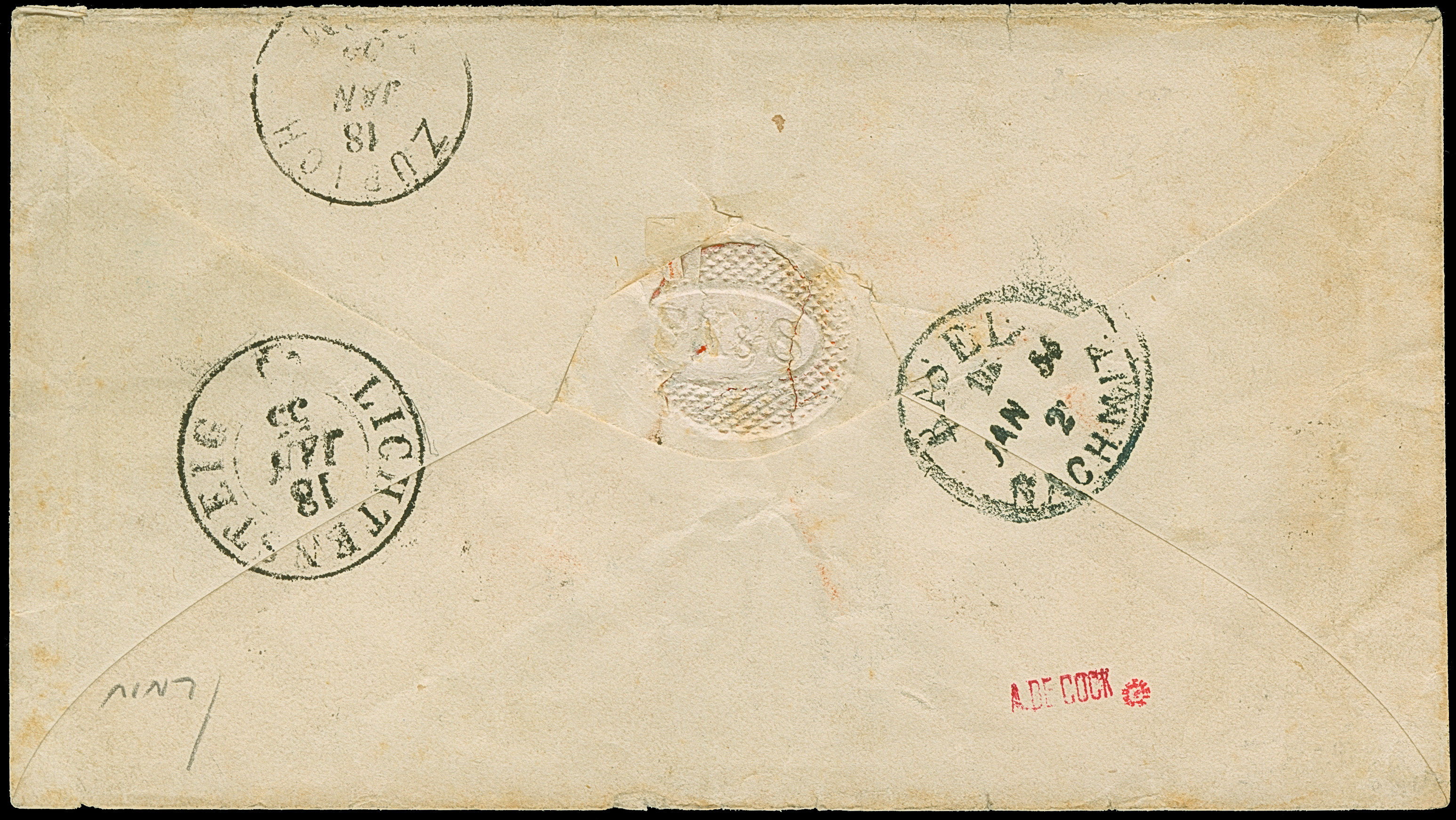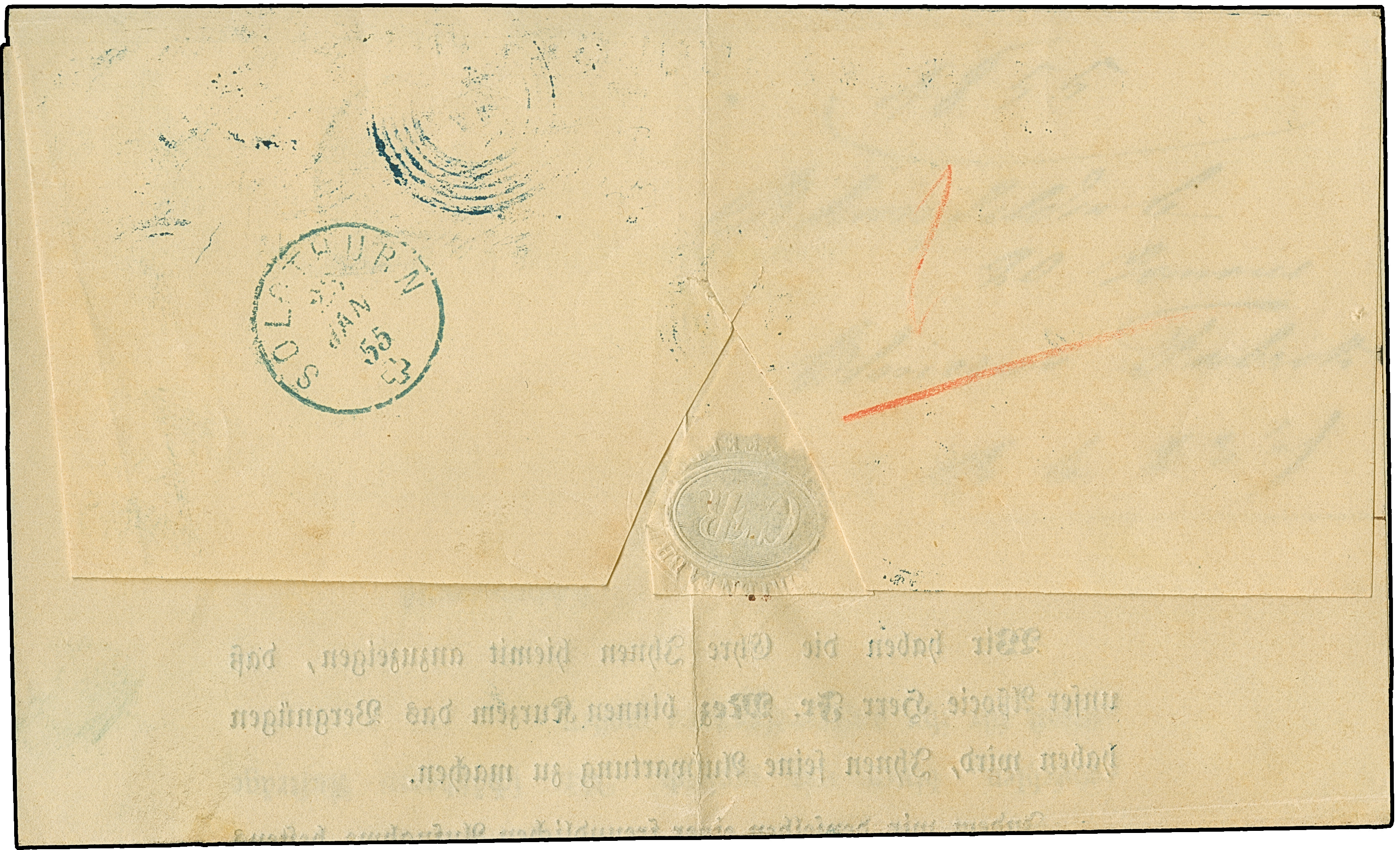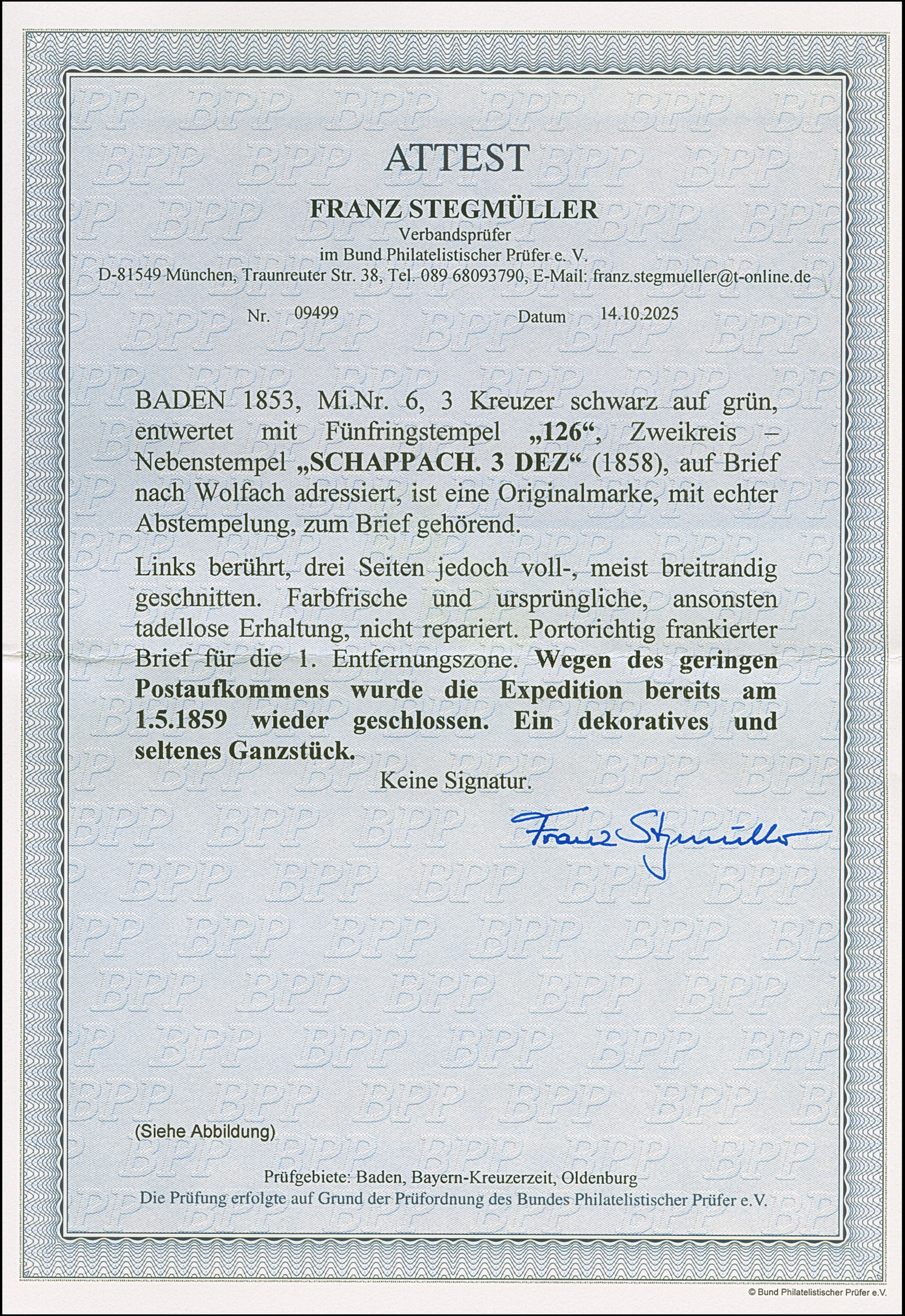 "126" in schwarz, sauber auf 3 Kr. auf grün, links leicht berührt, sonst voll- bis überrandig, mit klar nebengesetztem kleinen DKr. "SCHAPPACH 3 DEZ" (1858) auf komplettem Faltbrief nach Wolffach. Ein schöner Brief in ursprünglicher Erhaltung. PROFI hat nur 5 Briefe mit dem schwarzen Nummernstempel von Schappach registriert, davon nur einen weiteren mit schwarzem Aufgabestempel. Fotoattest Stegmüller BPP (2025)