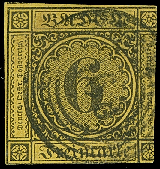 1862, 30 Kr. orangegelb, farbfrisch und einwandfrei gezähnt mit sehr klarem, zentrisch und gerade aufgesetztem EKr. “PFORZHEIM 22.AUG.”. Ein außergewöhnlich dekoratives Ausnahmestück dieser schwierigen Marke in tadelloser Erhaltung, Fotoatteste Brettl BPP (1995) und Stegmüller BPP (2008)