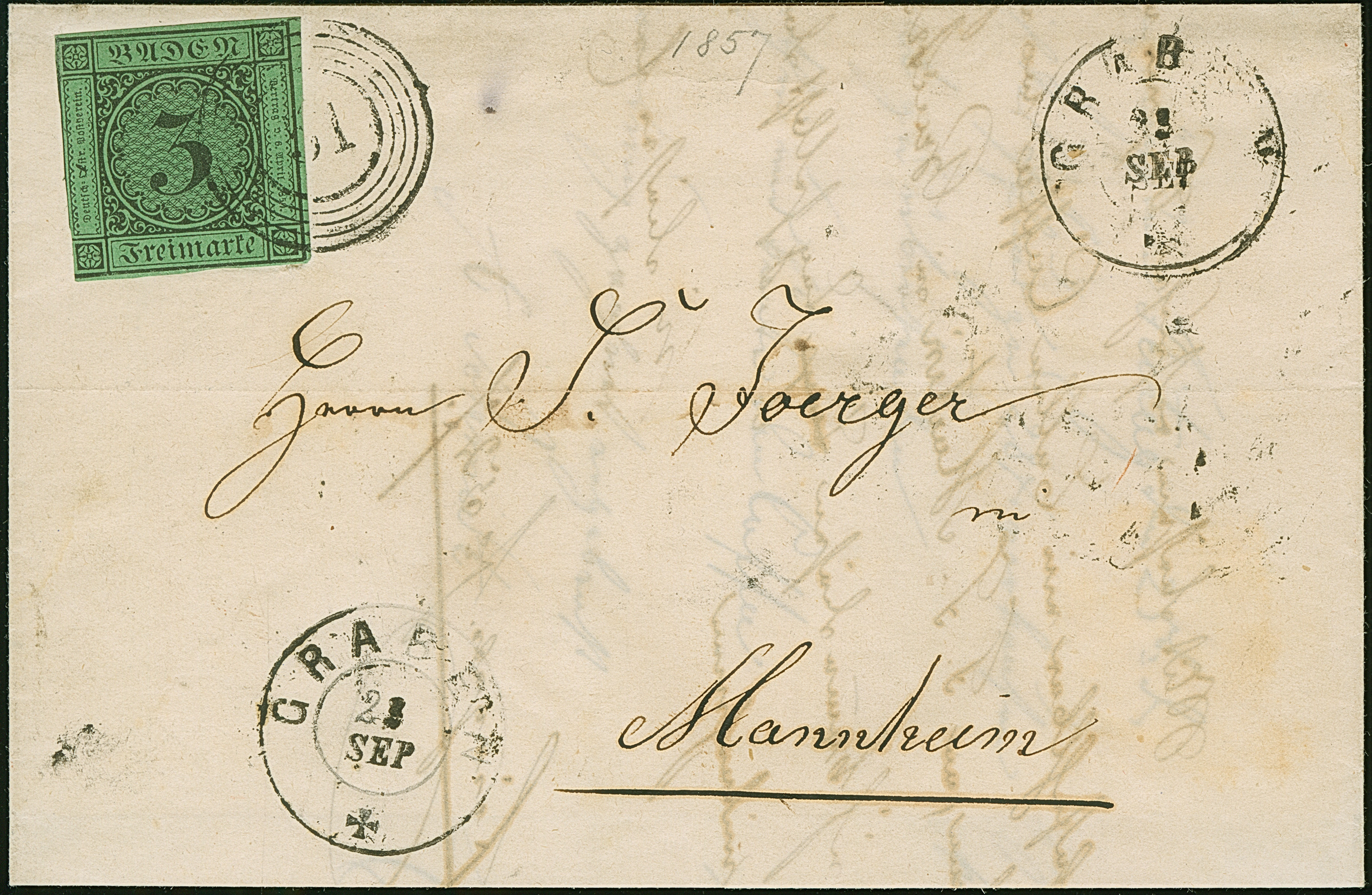 "51" GRABEN sauber auf 3 Kr. auf grün, teils berührt, mit zweimal nebengesetztem DKr. auf komplettem Faltbrief 1857 nach Mannheim.