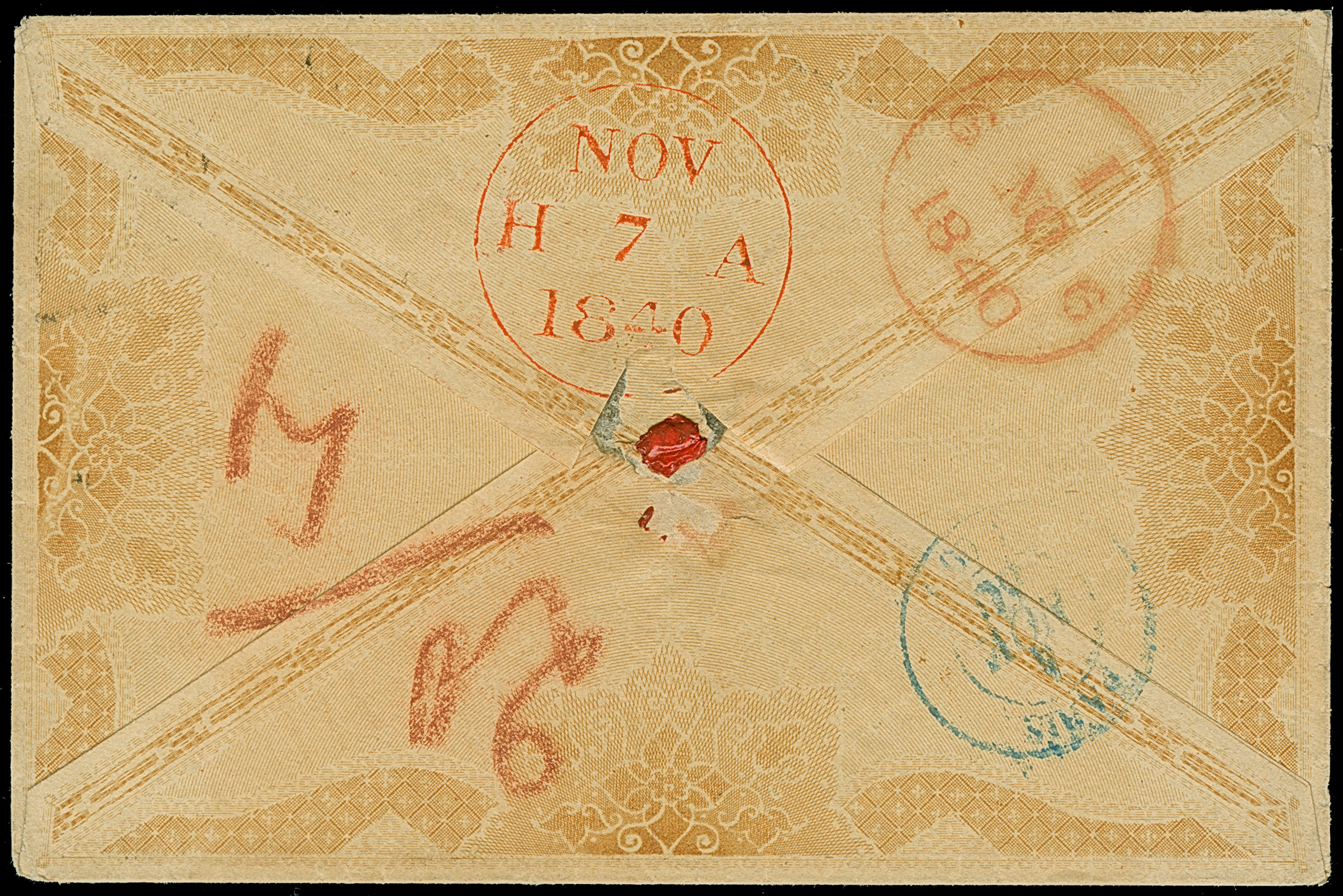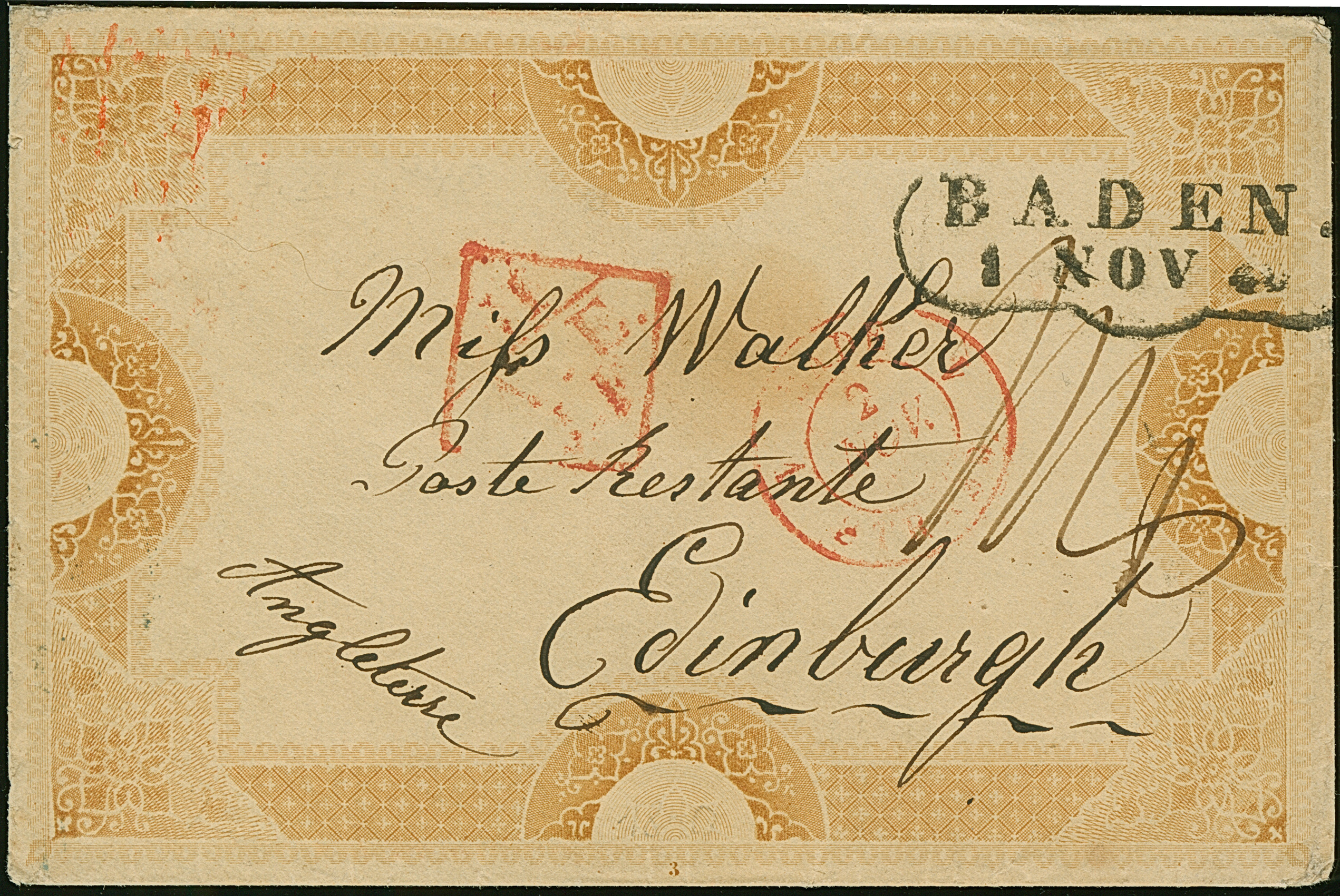 1840, "BADEN 1 NOV.", Zierstempel, sauber auf vorder- und rückseitig in Brauntönen bedruckten Zierbrief nach Edinburgh. Ein sehr dekoratives Stück in schöner Erhaltung.