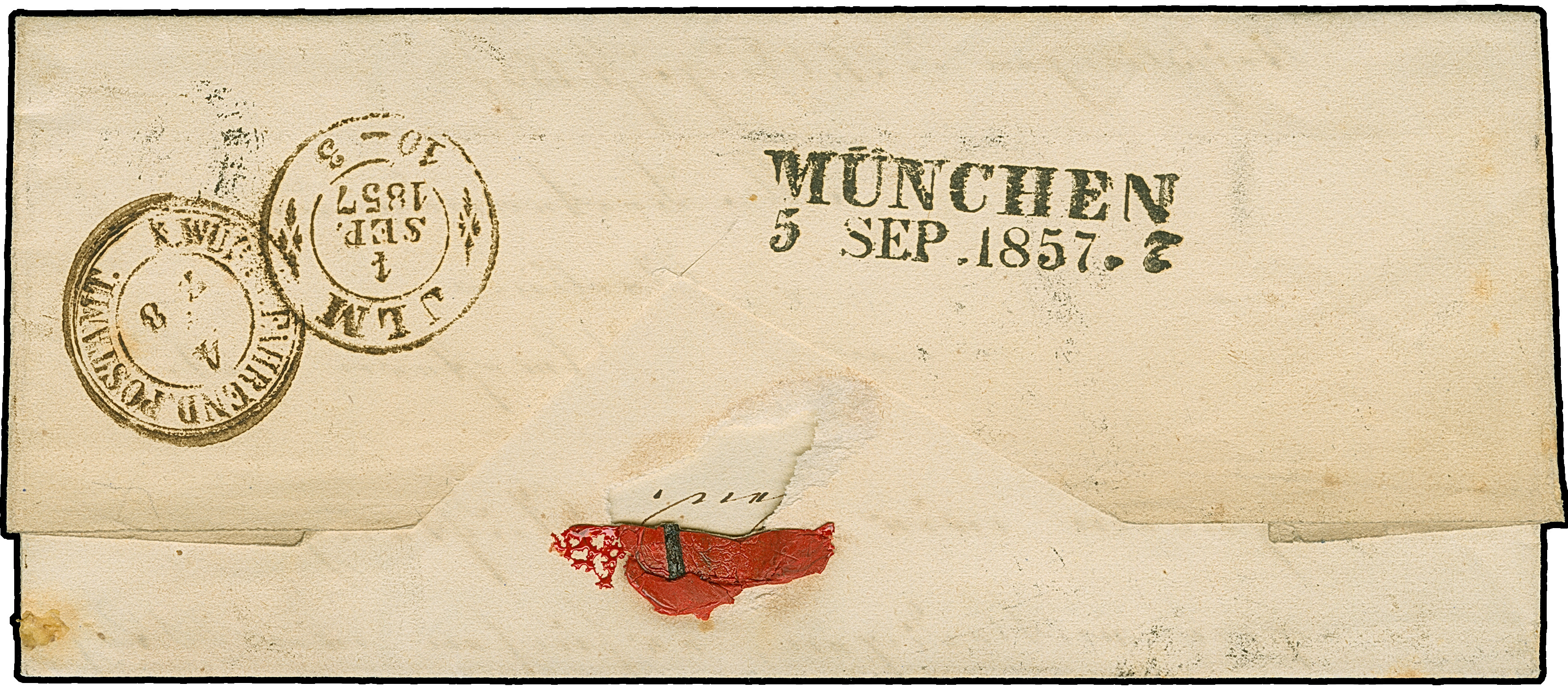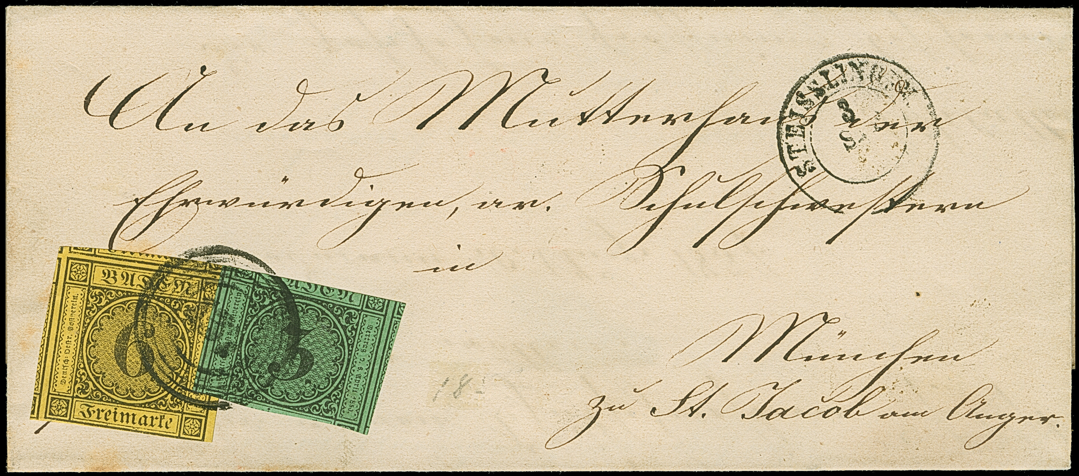 "137" auf 6 Kr. auf gelb, unten leicht berührt, sonst bereit- bis überrandig, mit Teilen von 4 Nachbarmarken, zusammen mit 3 Kr. auf grün im Zwergschnitt, auf Briefhülle mit nebengesetztem DKr. "STEISSLINGEN 3 SEP." (1857) nach München, mit Transit- und Ankunftsstempeln. PROFI hat nur wenige Briefe von Steißlingen registriert; dies ist der einzige mit einer Farbfrankatur. Fotoattest Stegmüller BPP (2025)